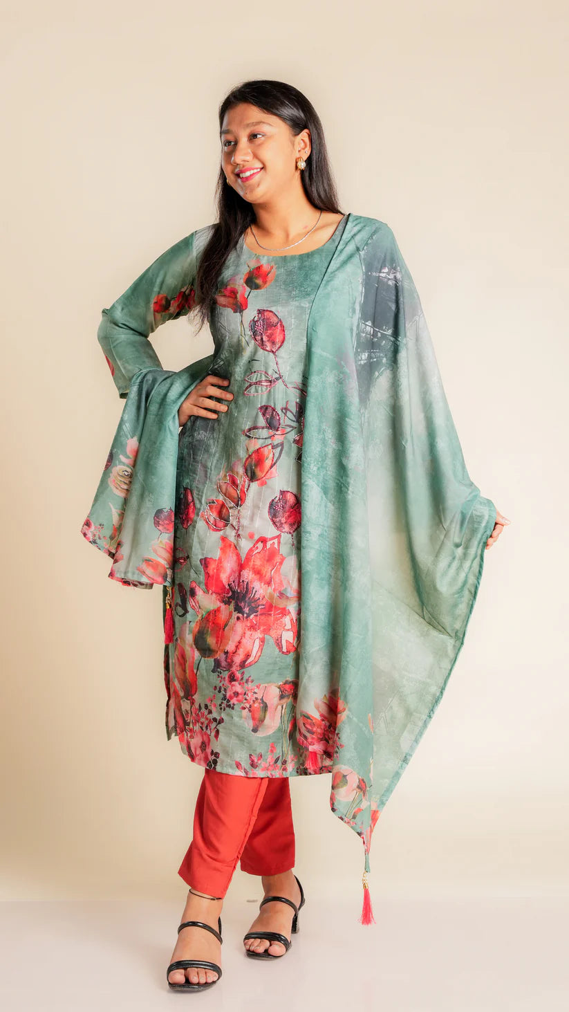 Elevate your wardrobe with our Digital Print Suit Set, featuring a stunning printed dupatta. Made...