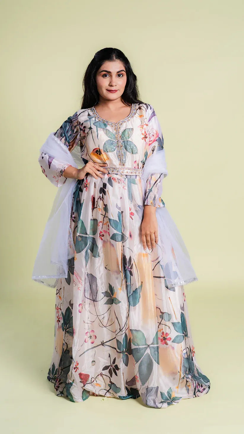 Floral Print Heavy Gown with Net Dupatta
