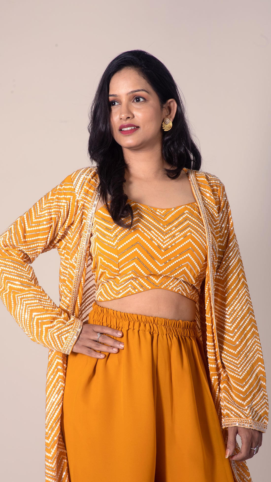 Combining elegance with comfort, this Floral Print Beaded Crop Top with Palazzo and Jacket set...
