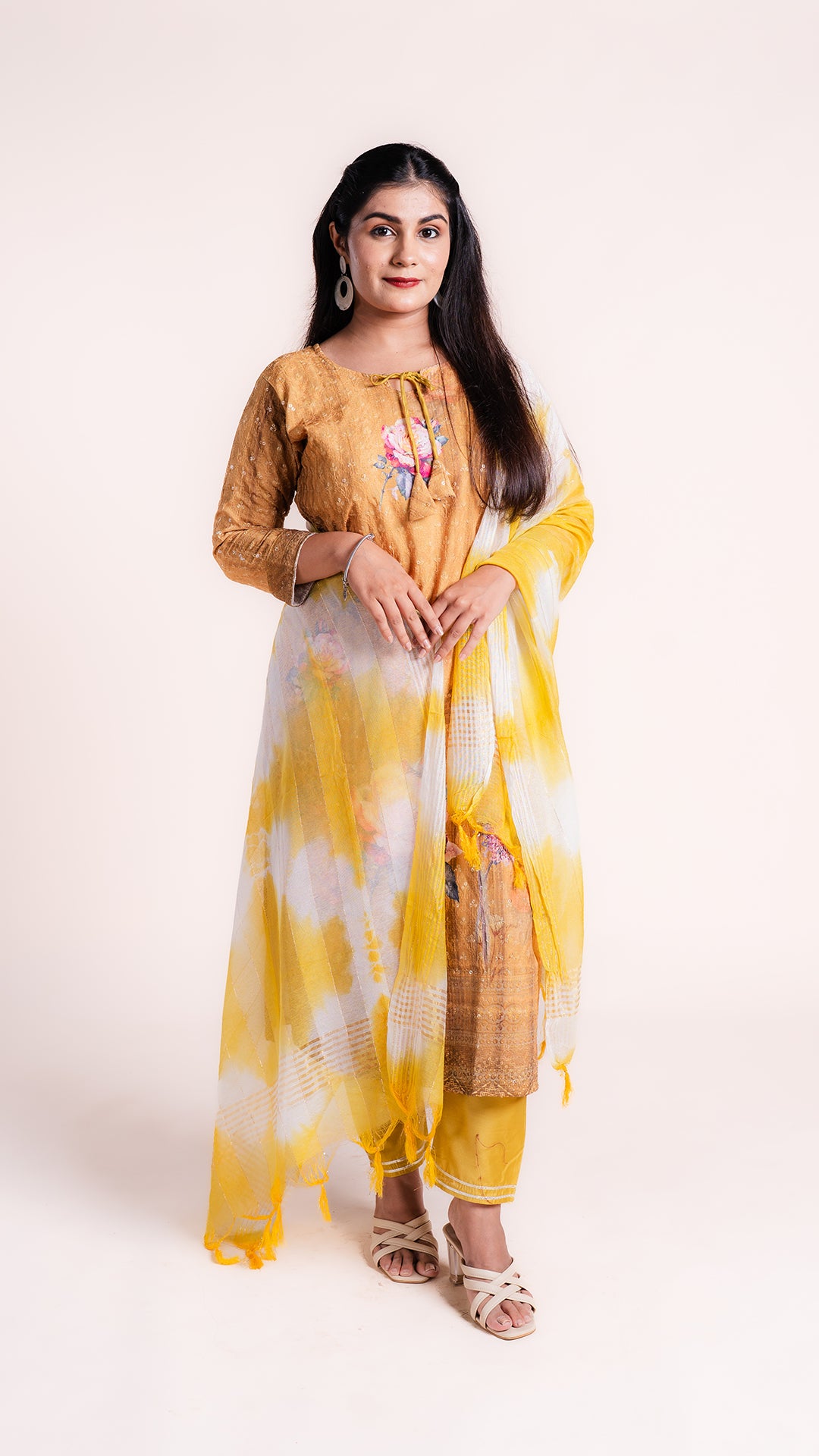 Introducing our 100% cotton blend suit set with a luxurious shinon dupatta. This suit set...