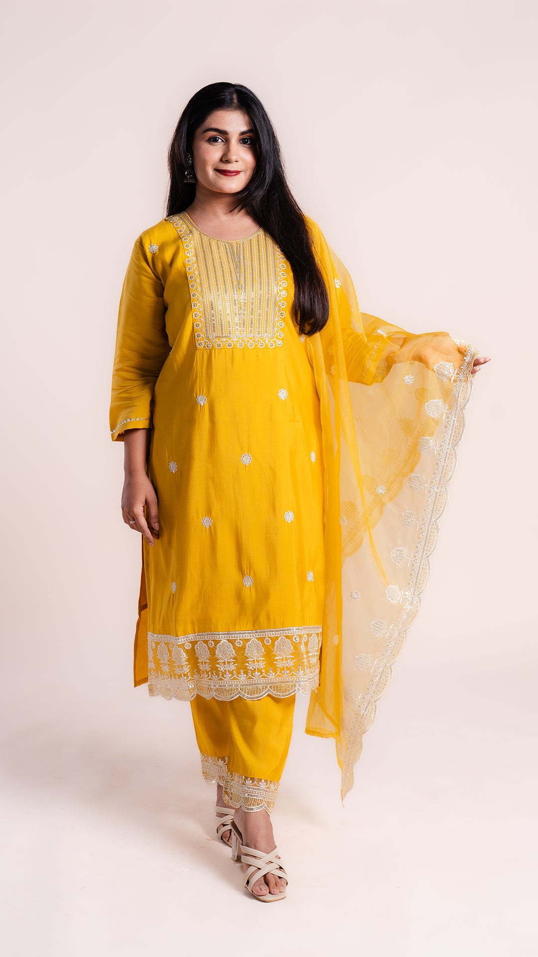 Elevate your ethnic wardrobe with our Chandani Suit Set, featuring a stylish Front Slit Kurta....