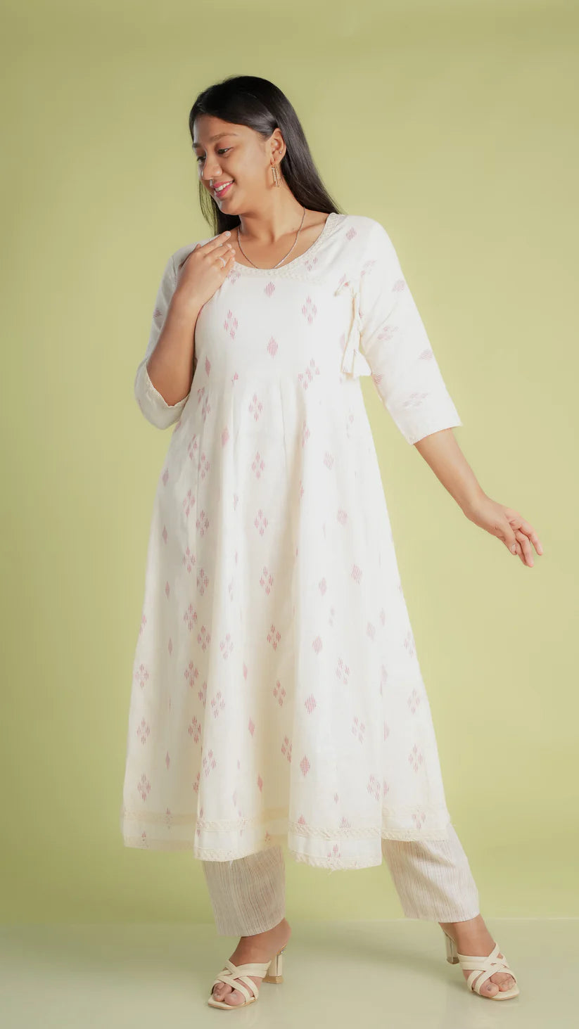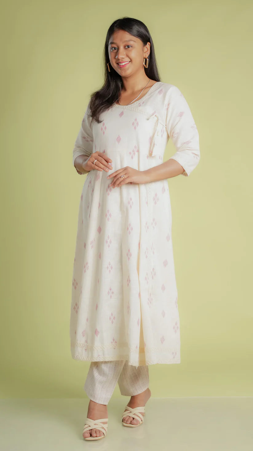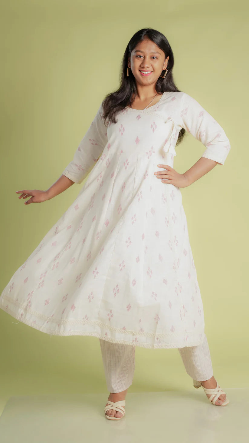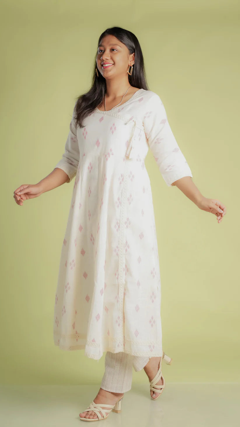 Introducing our Angrakhaa Set! Traditional yet modern design featuring an overlapping front with adjustable ties, paired with straight pants for a chic look. Made with premium quality fabric, this outfit is perfect for any formal or semi-formal occasion. Upgrade your wardrobe today!