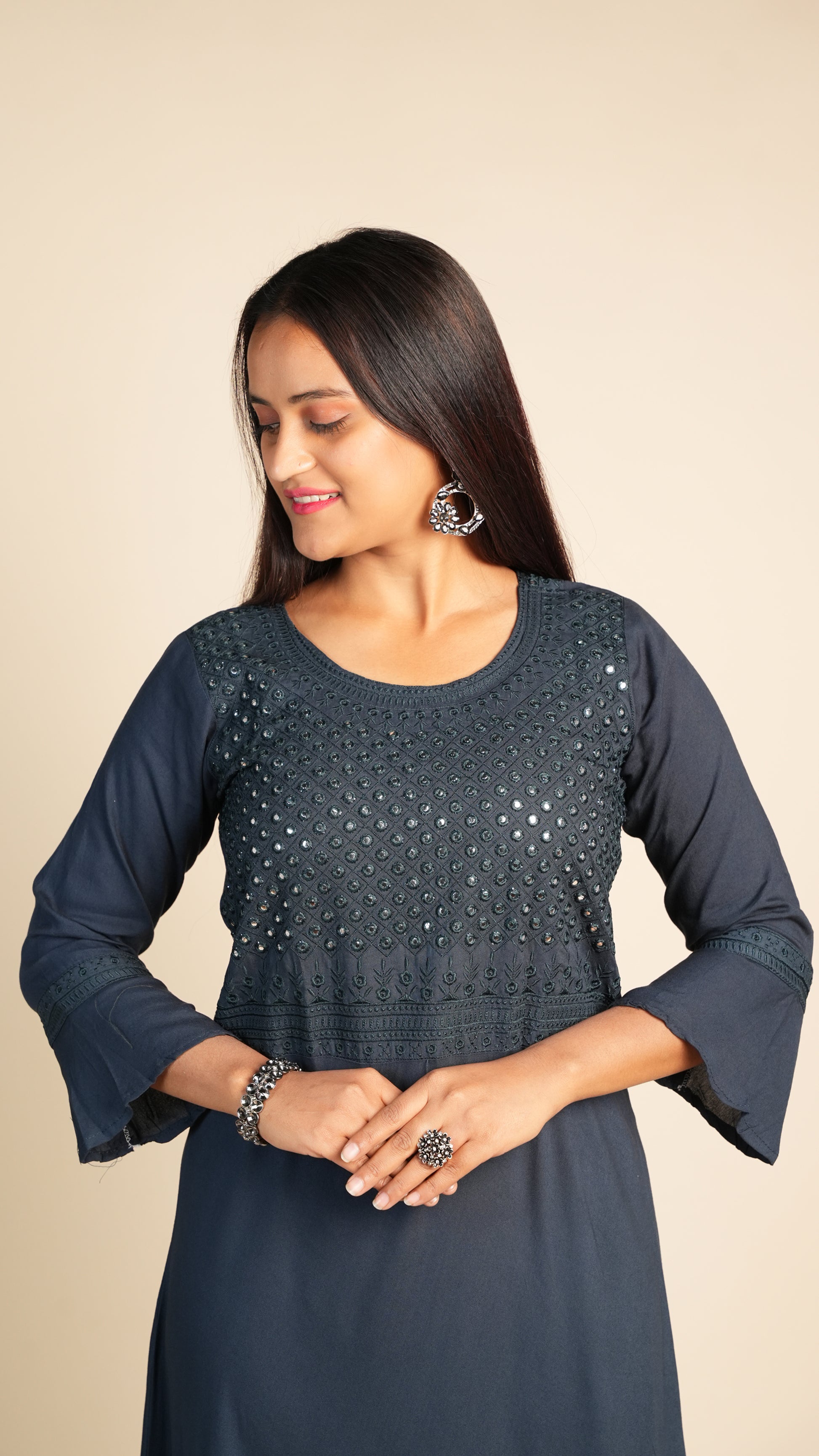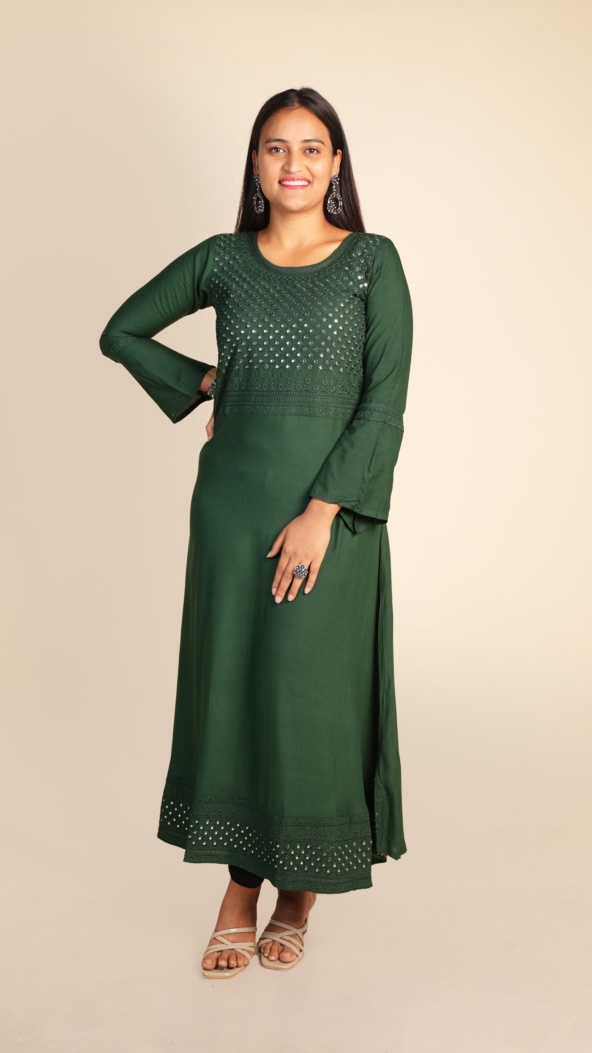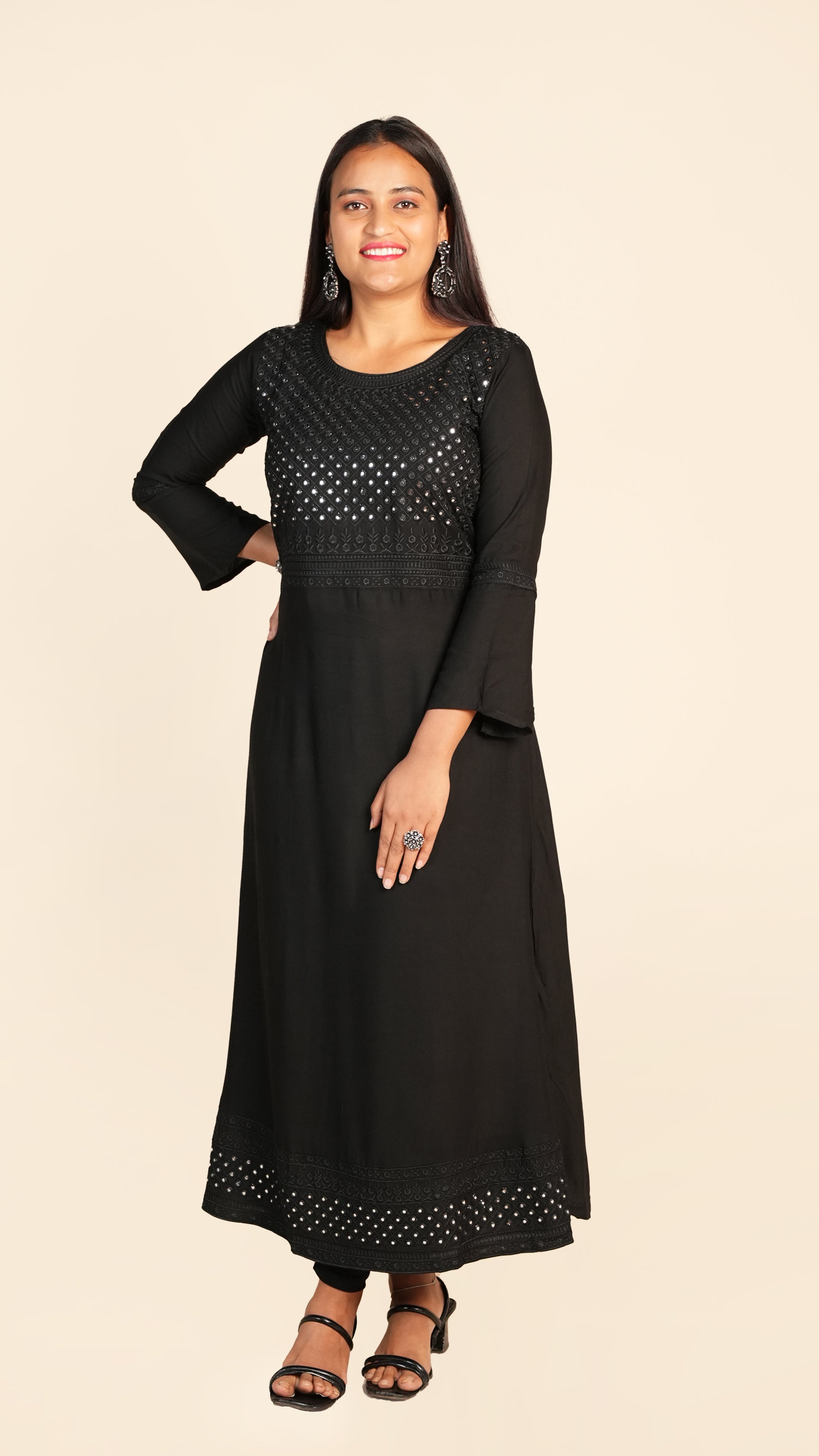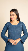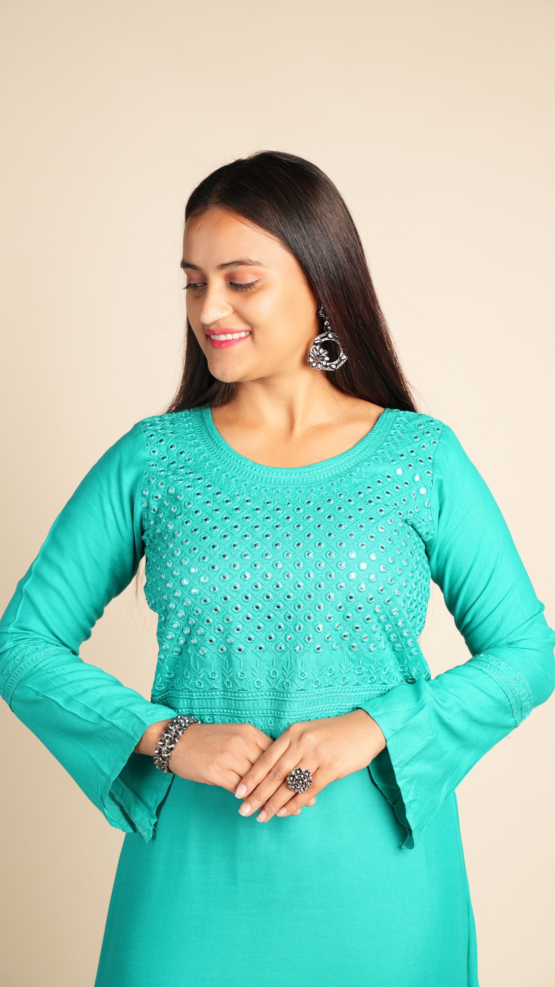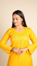 This kurta features bell sleeves and a flared design, adding a touch of elegance and femininity to any outfit. The wide sleeves allow for comfortable movement and the flared silhouette accentuates the natural curves of the body. Perfect for any occasion, this kurta is a must-have in any wardrobe.