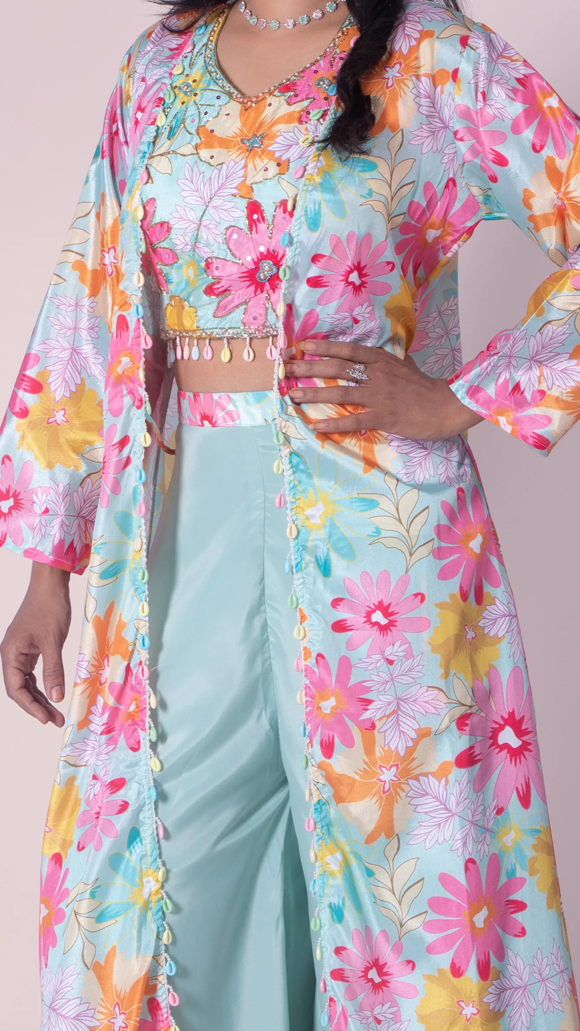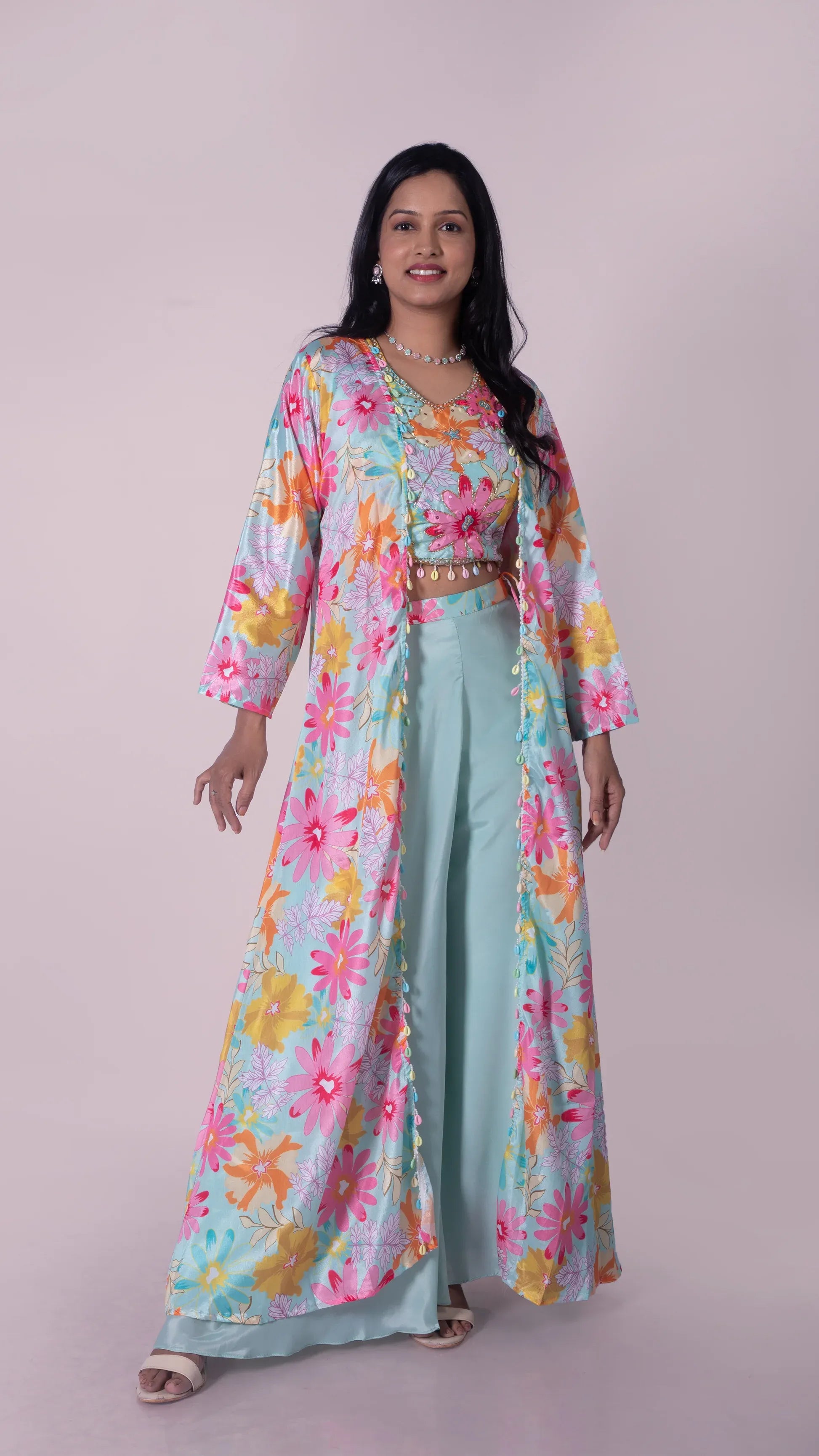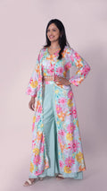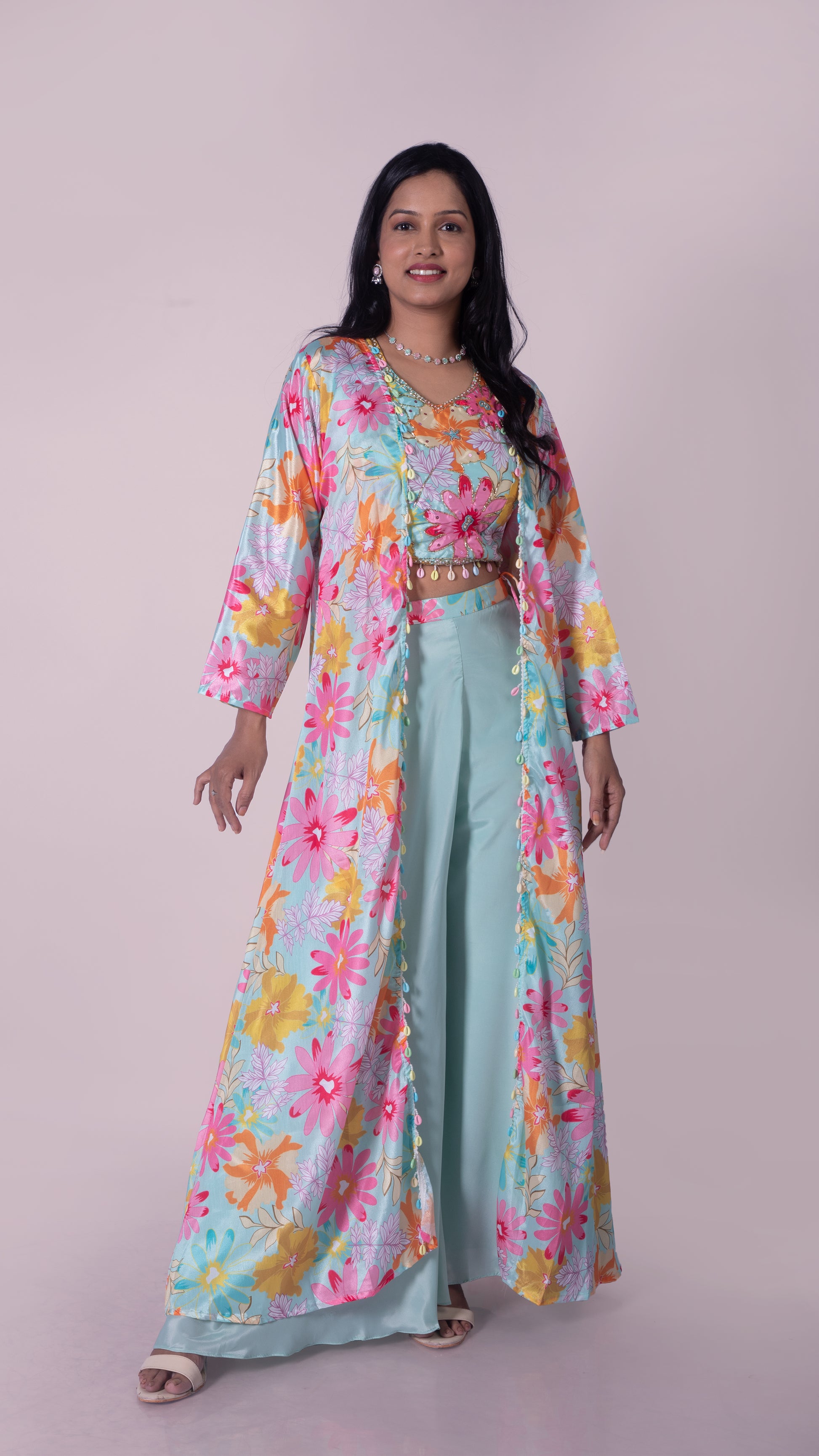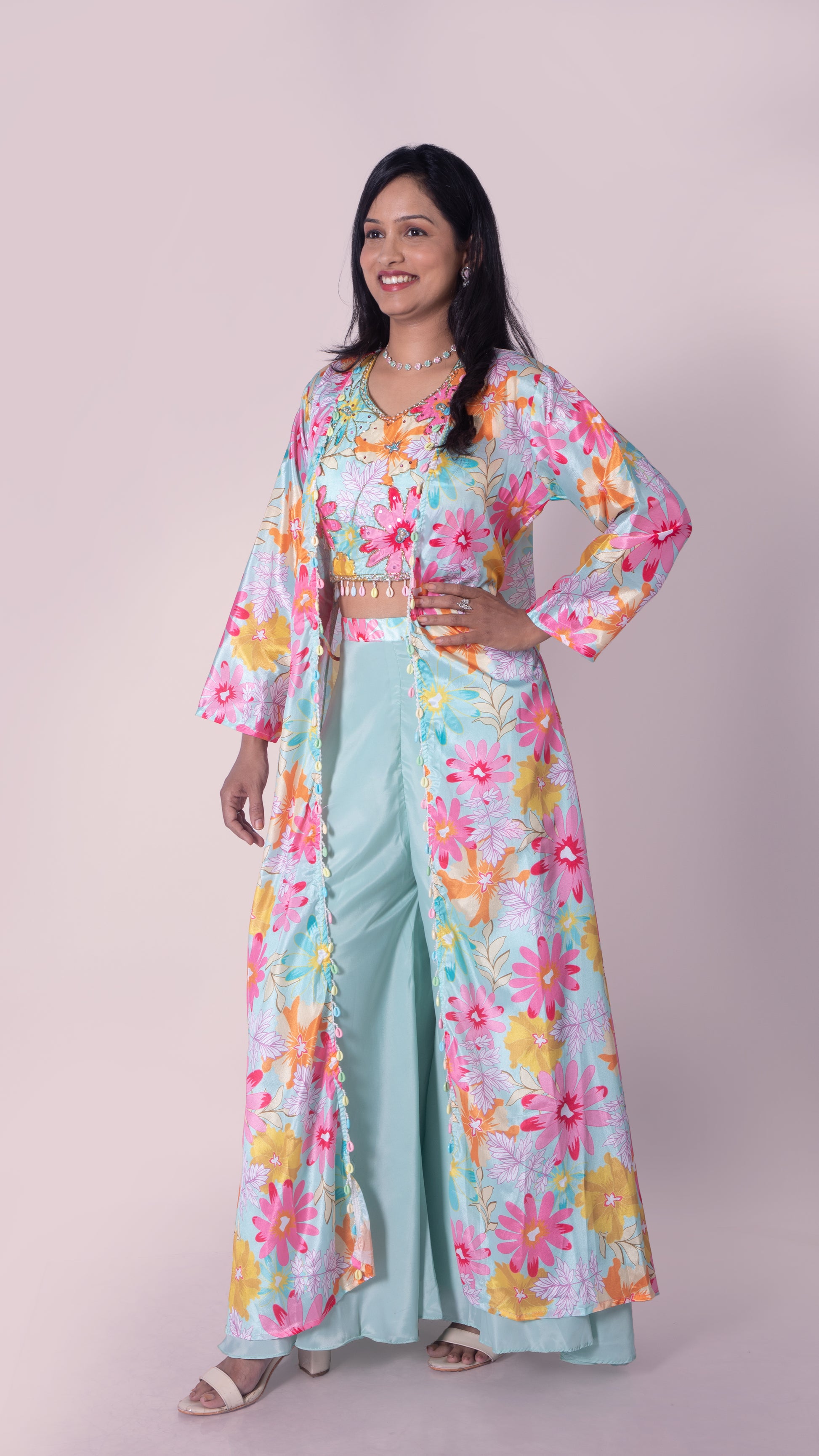 Wide Legged Palazzo with Floral Print Crop Top and Long Jacket