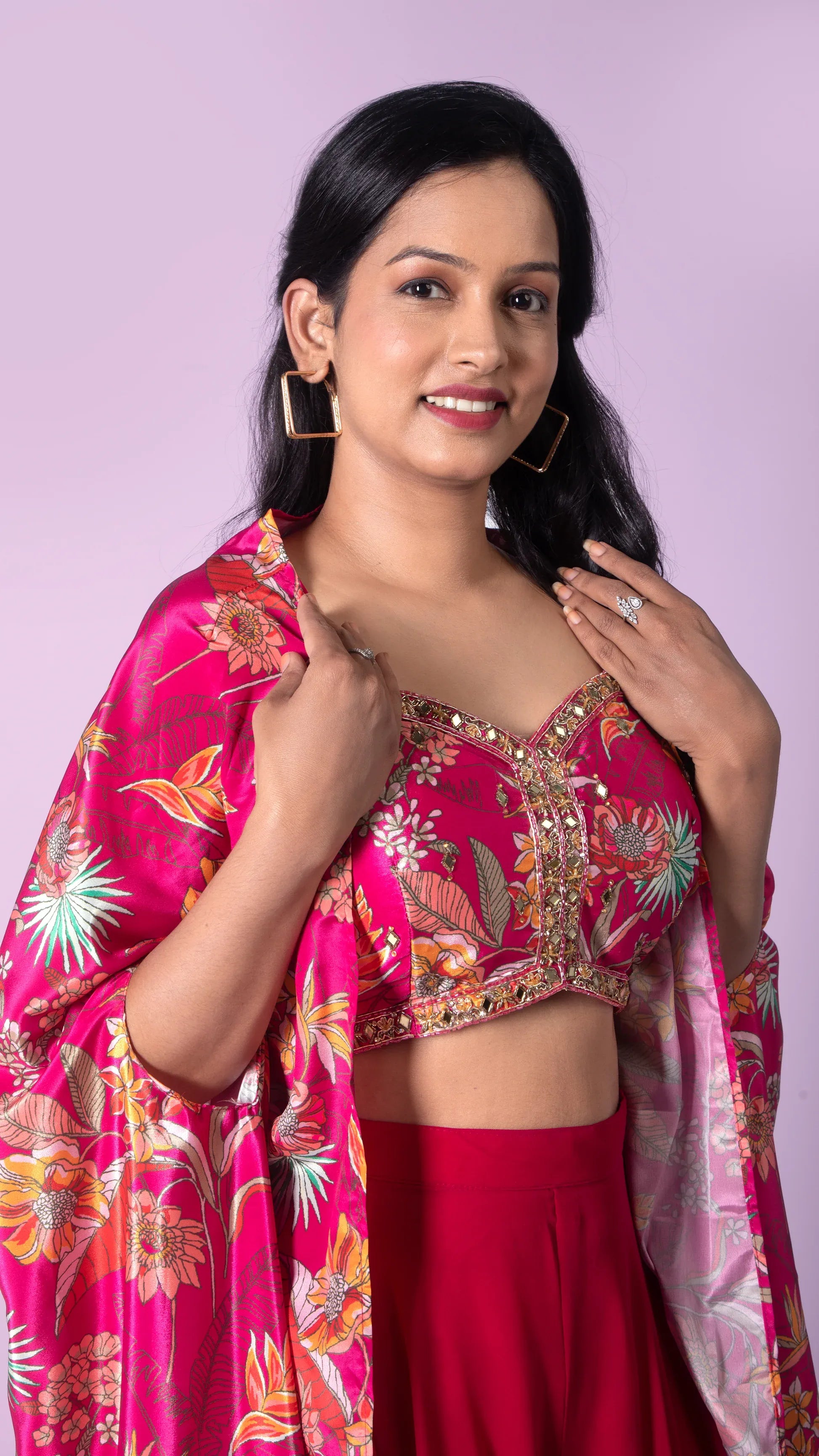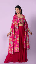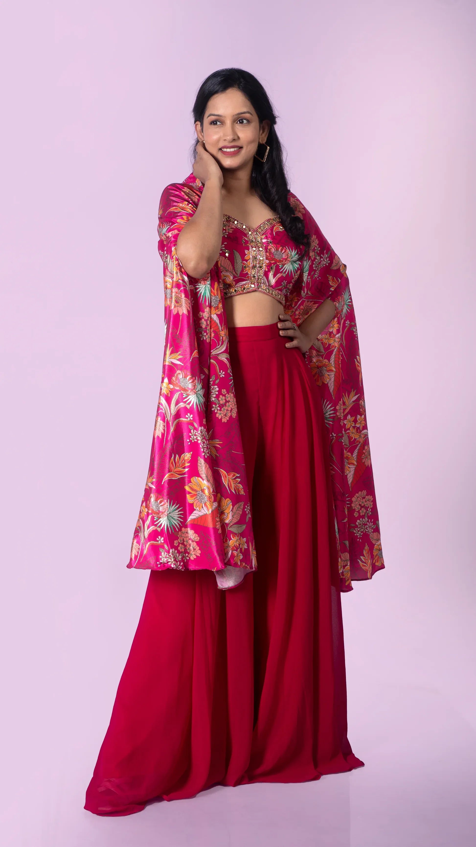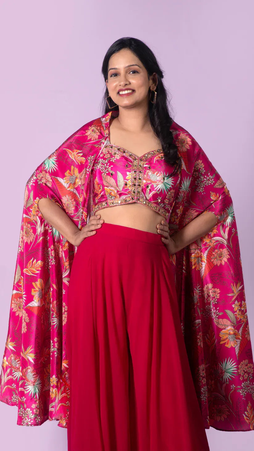 Combining elegance with comfort, this Floral Print Beaded Crop Top with Palazzo and Jacket set is perfect for any occasion. The intricate beading adds a touch of glamour to the classic floral print, while the comfortable palazzo and jacket provide a stylish yet relaxed fit. Elevate your wardrobe with this versatile set.