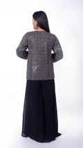 This stylish flared palazzo and crop top set comes with a heavily worked jacket and additional jutti. Perfect for a special occasion or event, the intricate embroidery and comfortable fit of this outfit will make you stand out in any crowd. Complete your look with the matching jutti for a stylish and traditional touch.