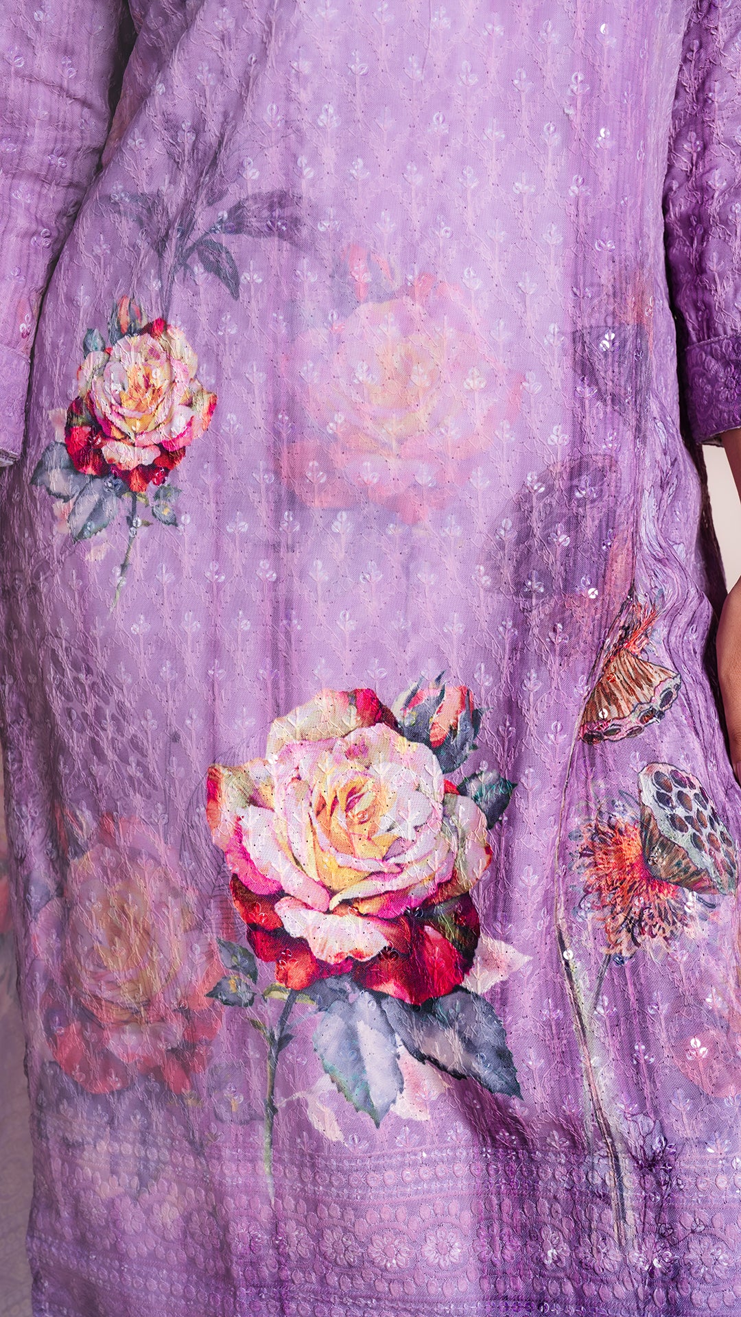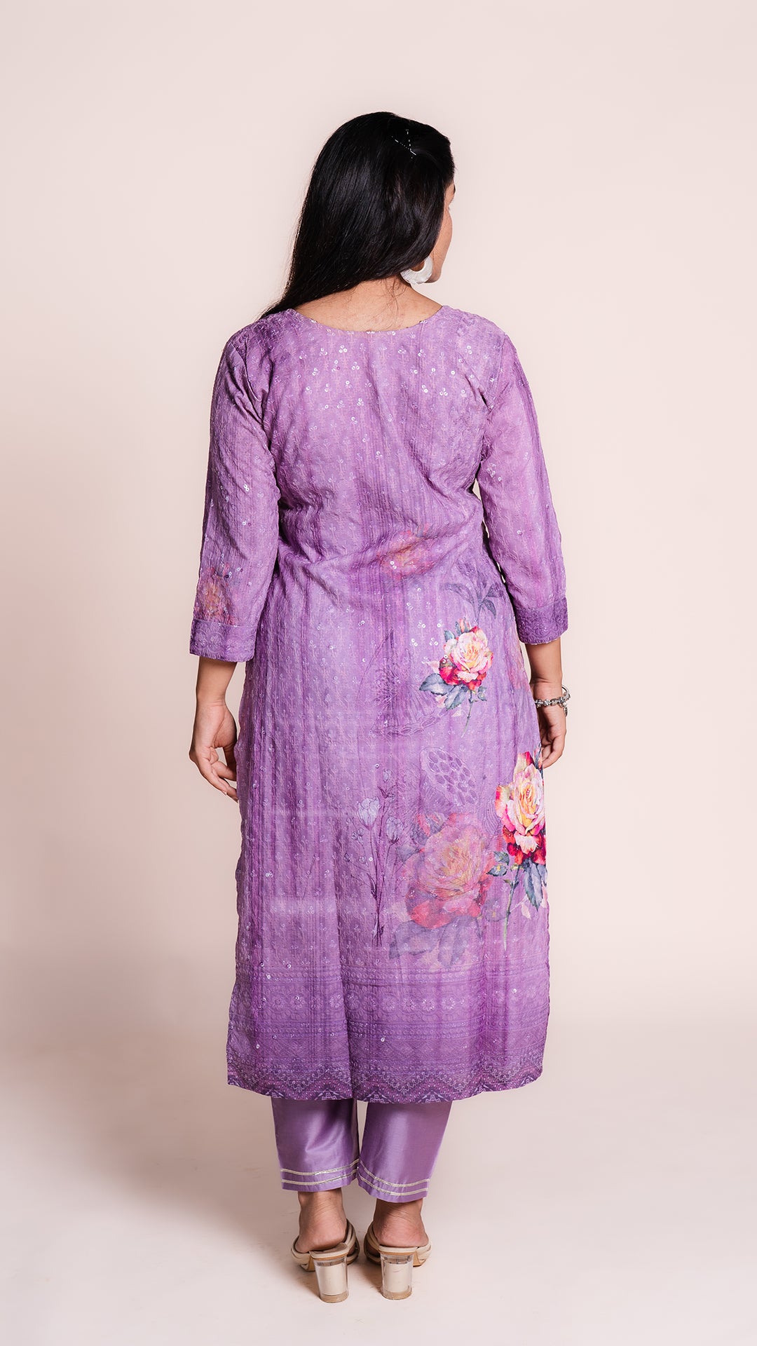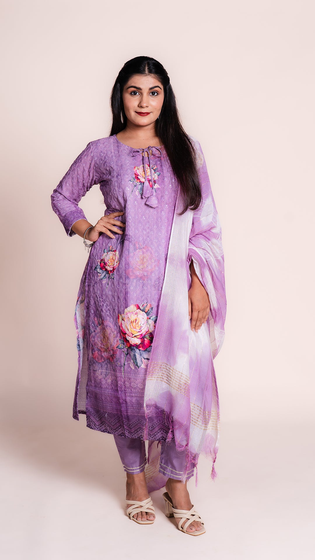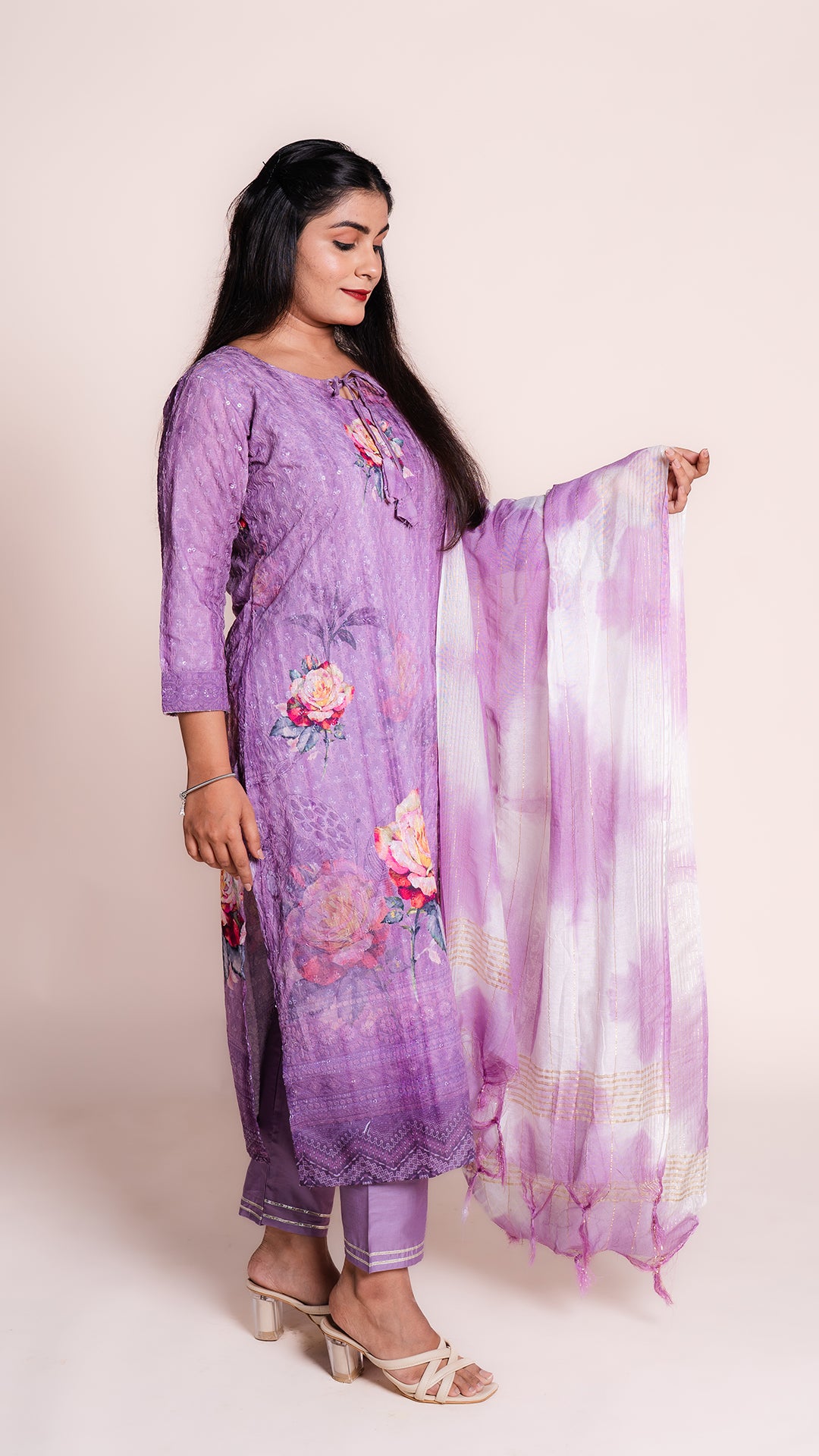 This Chikankari Suit Set features a beautiful Digital Print Kurti, showcasing the perfect blend of tradition and modernity. Made with high-quality materials, this set is lightweight and comfortable, making it perfect for both casual and formal occasions. Elevate your wardrobe with this statement piece.