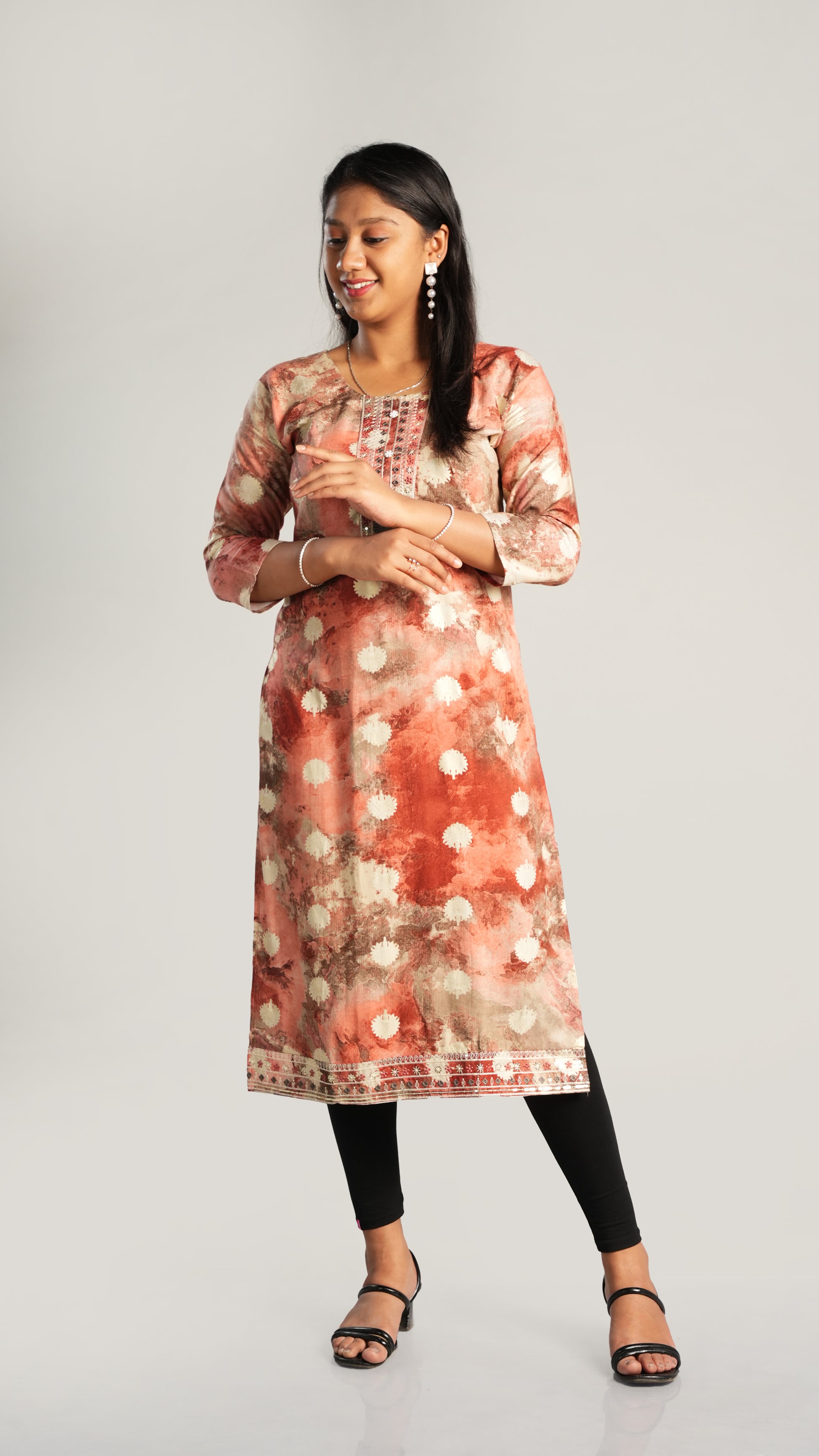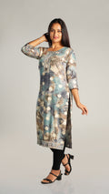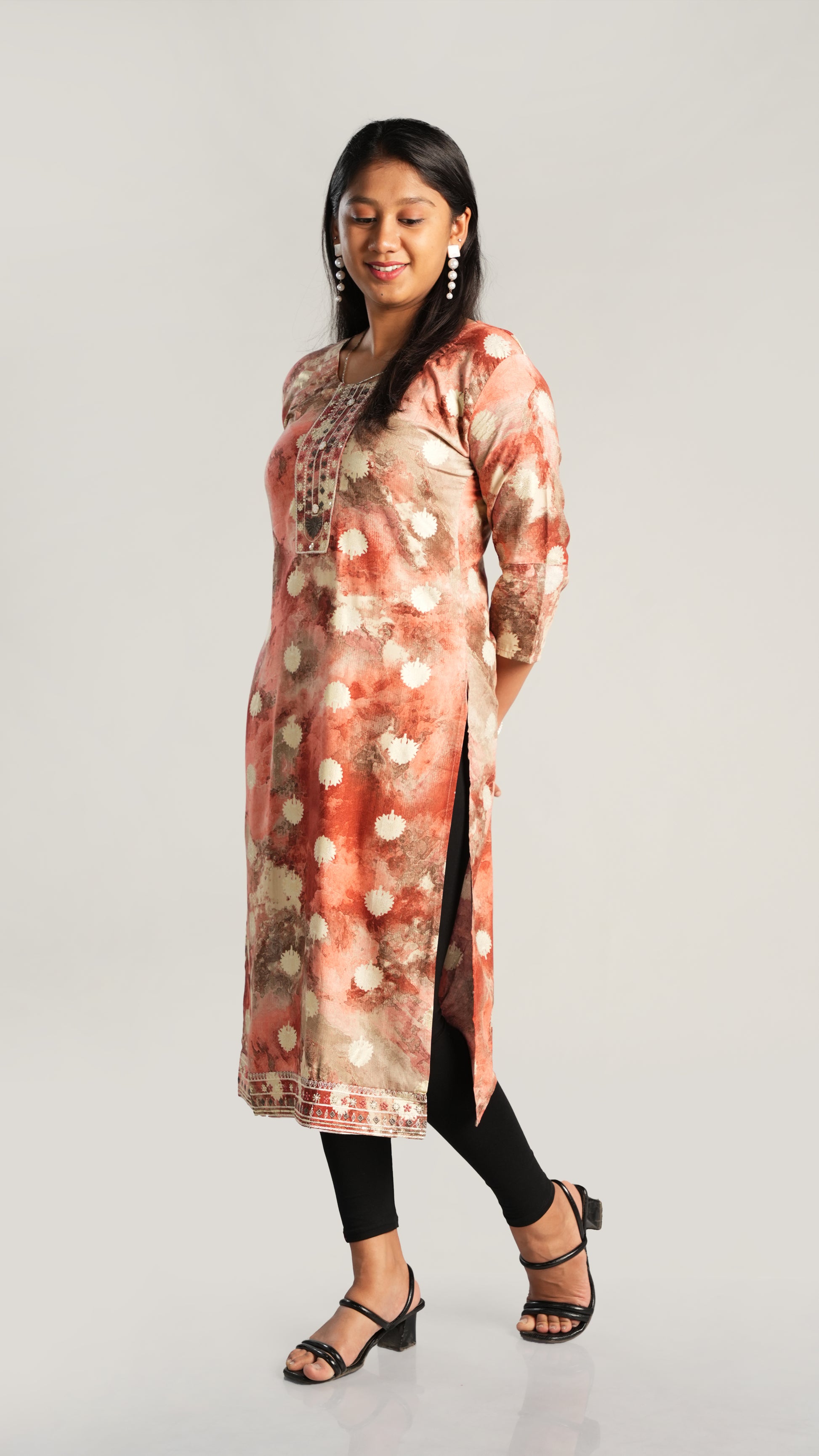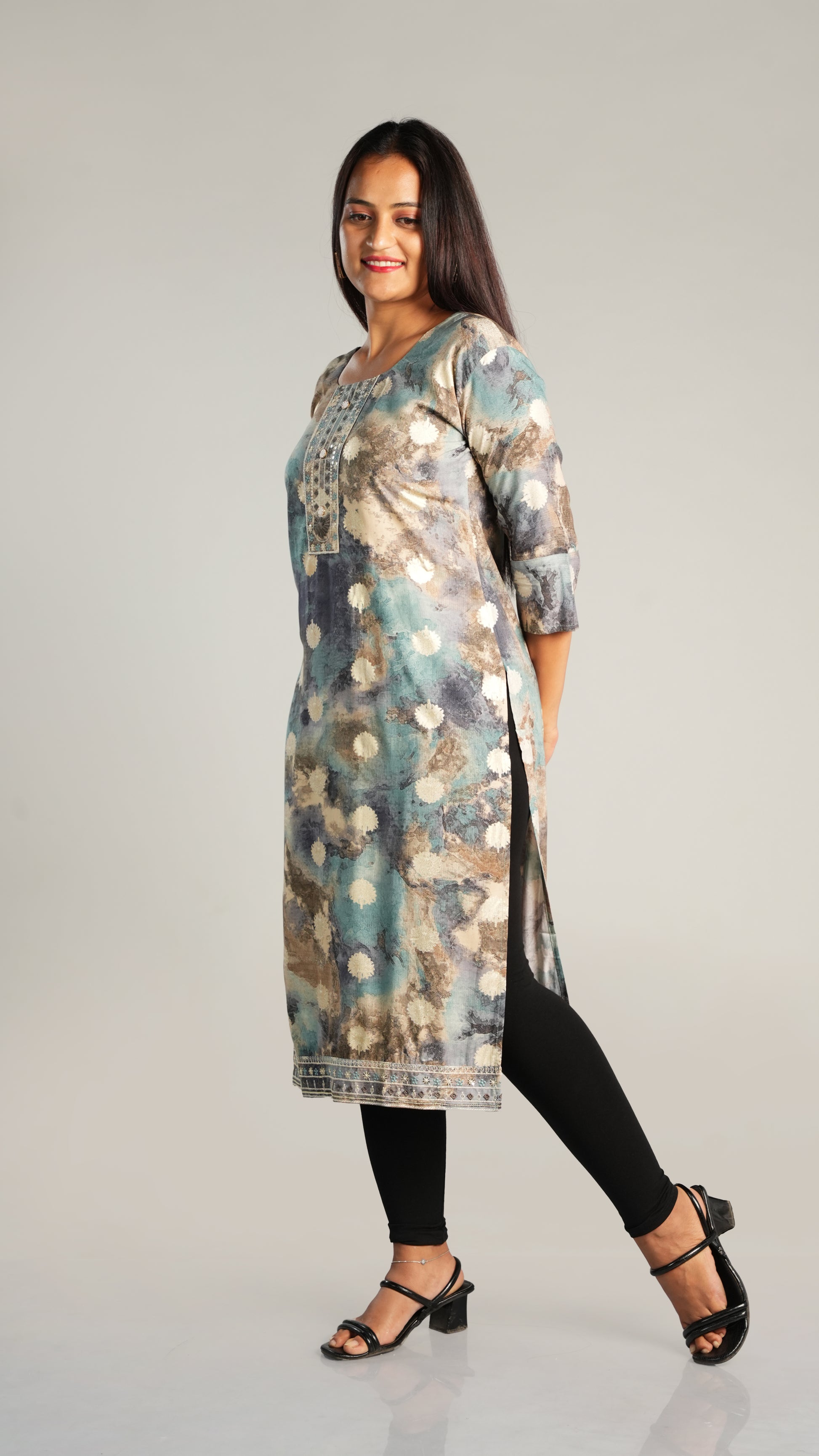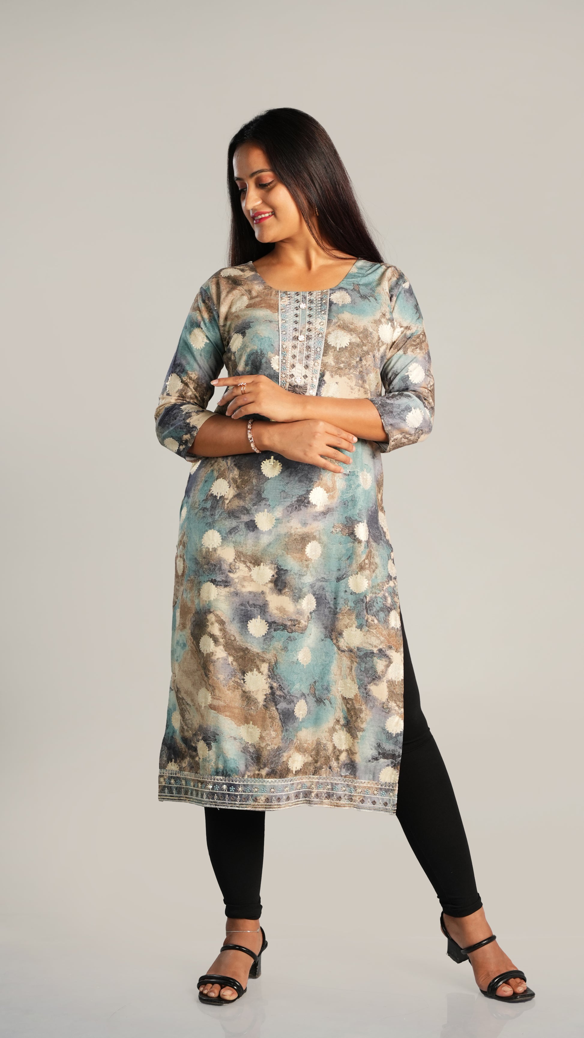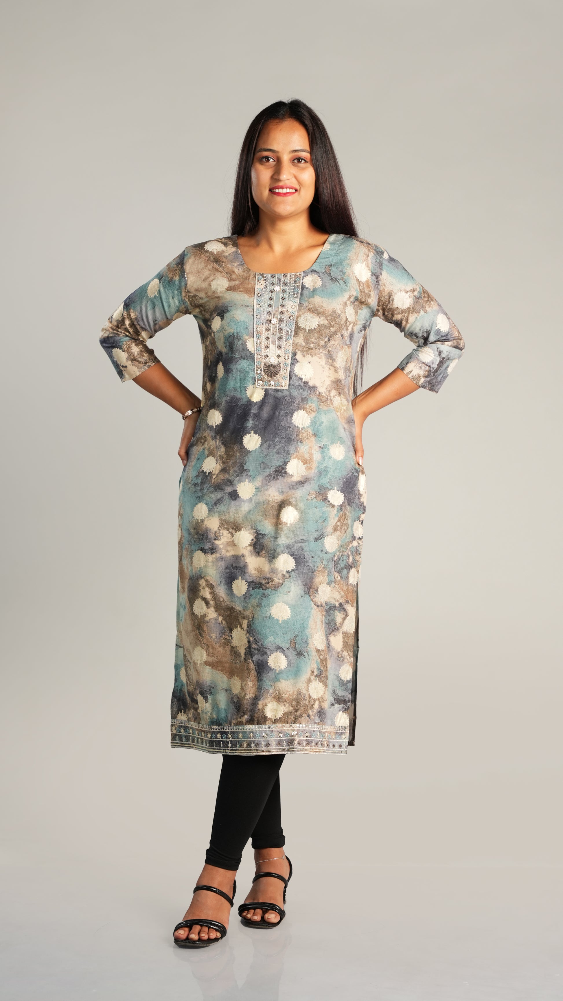 This kurta features a beautifully embroidered neck and a unique printed design. Made with high-quality materials, it offers a comfortable fit and stunning visual appeal. Elevate your wardrobe with this versatile and stylish kurta that is perfect for any occasion.