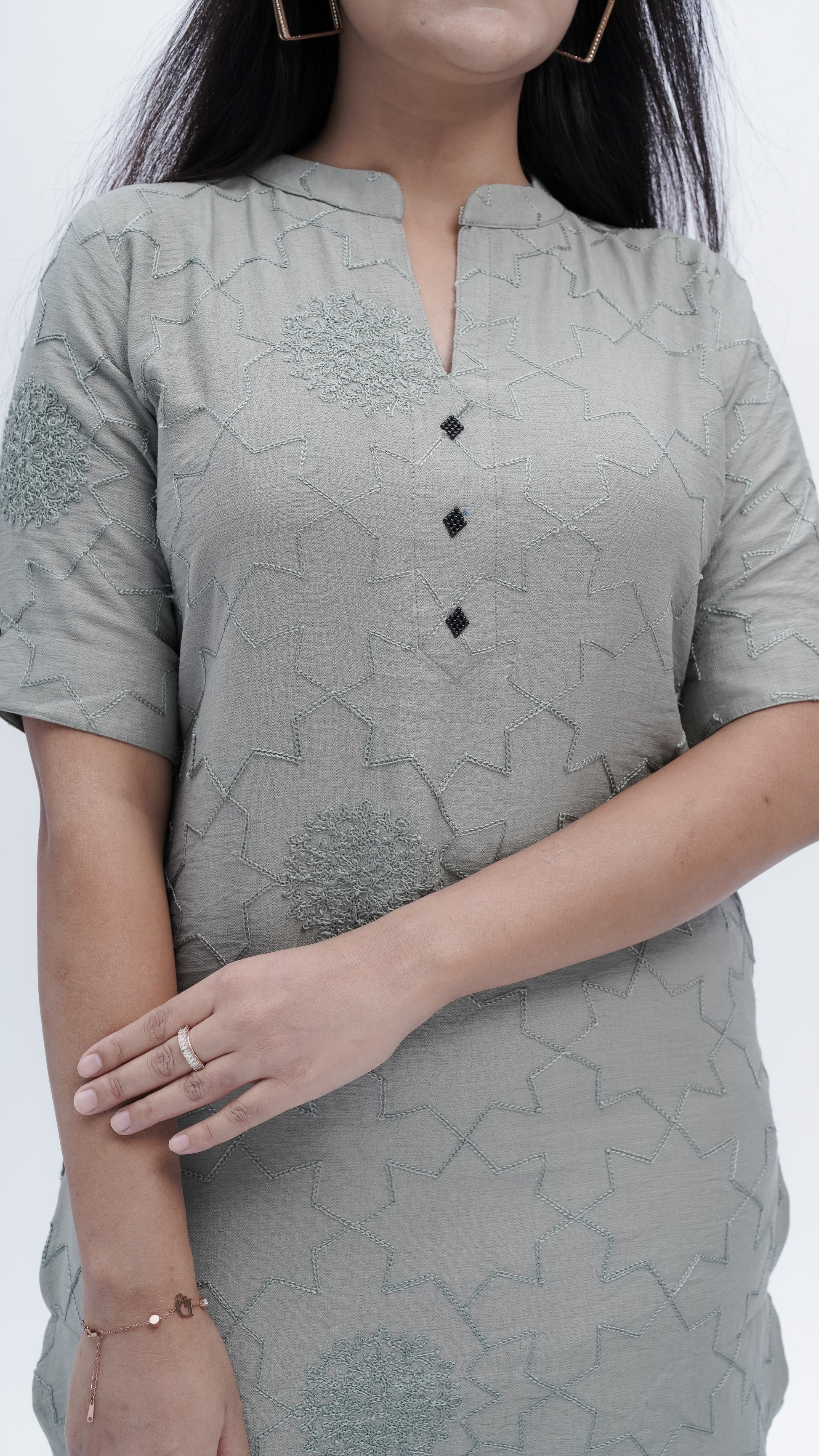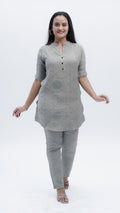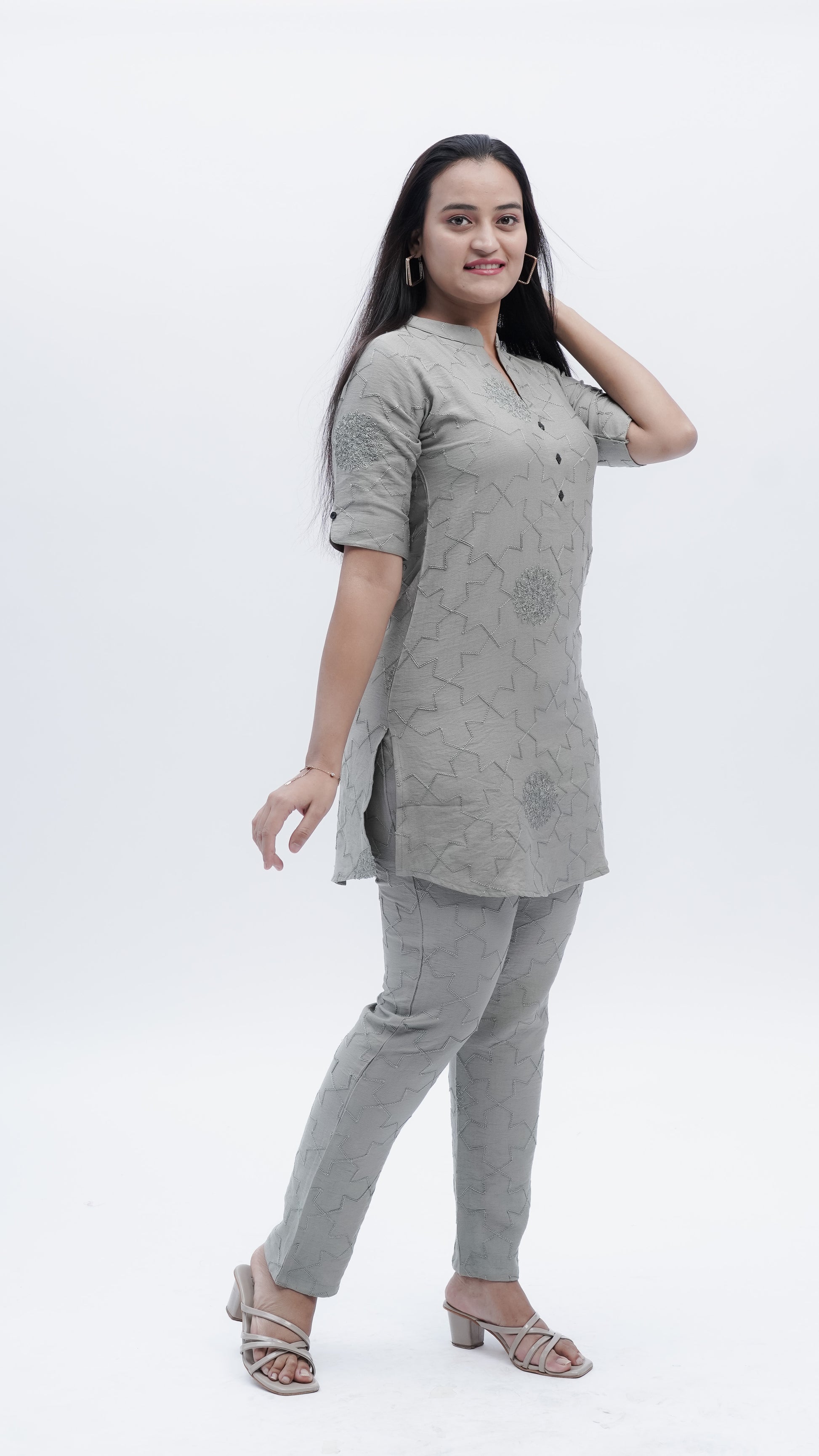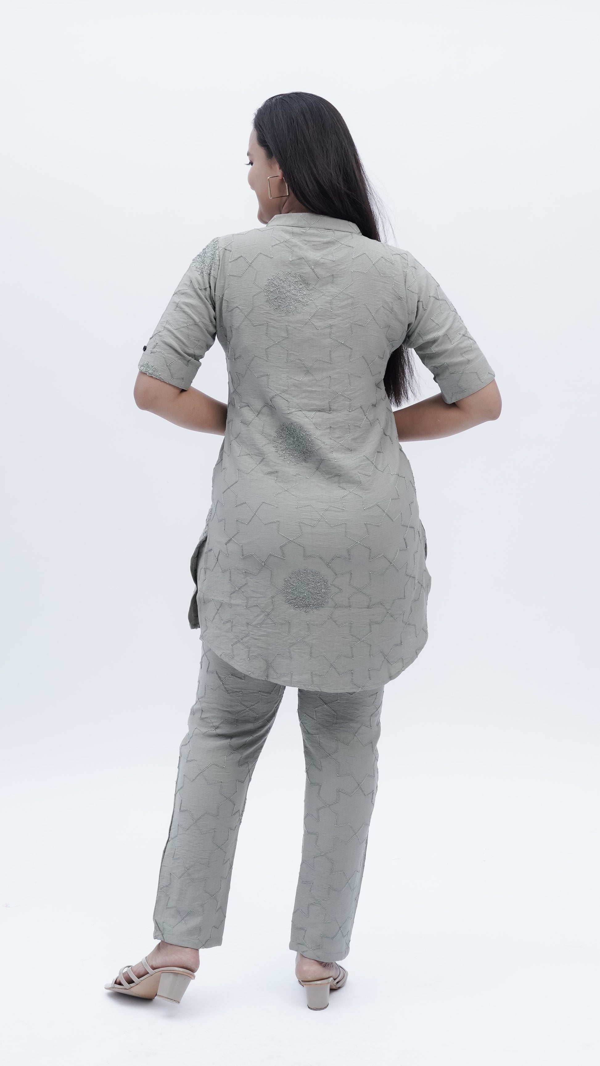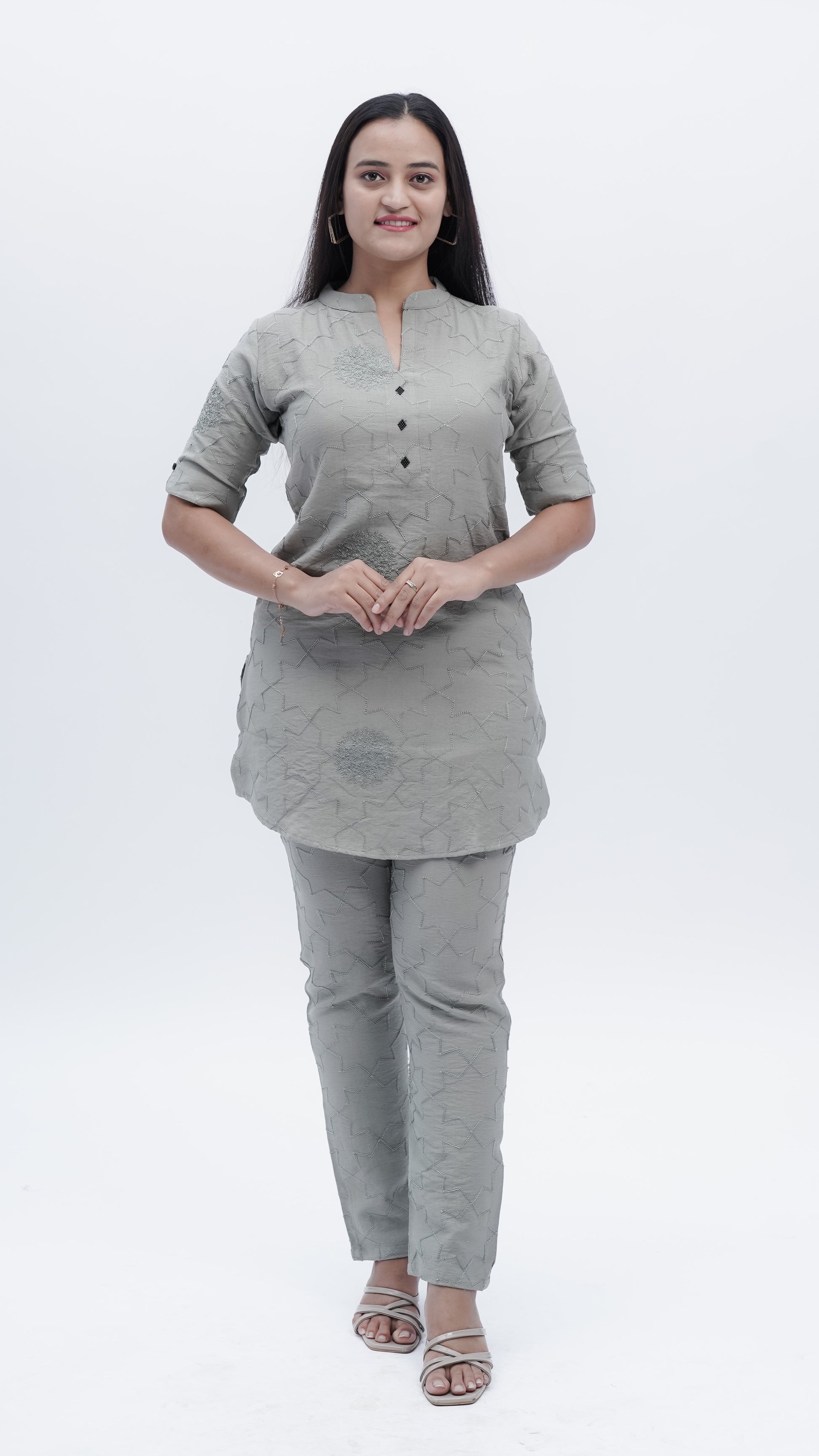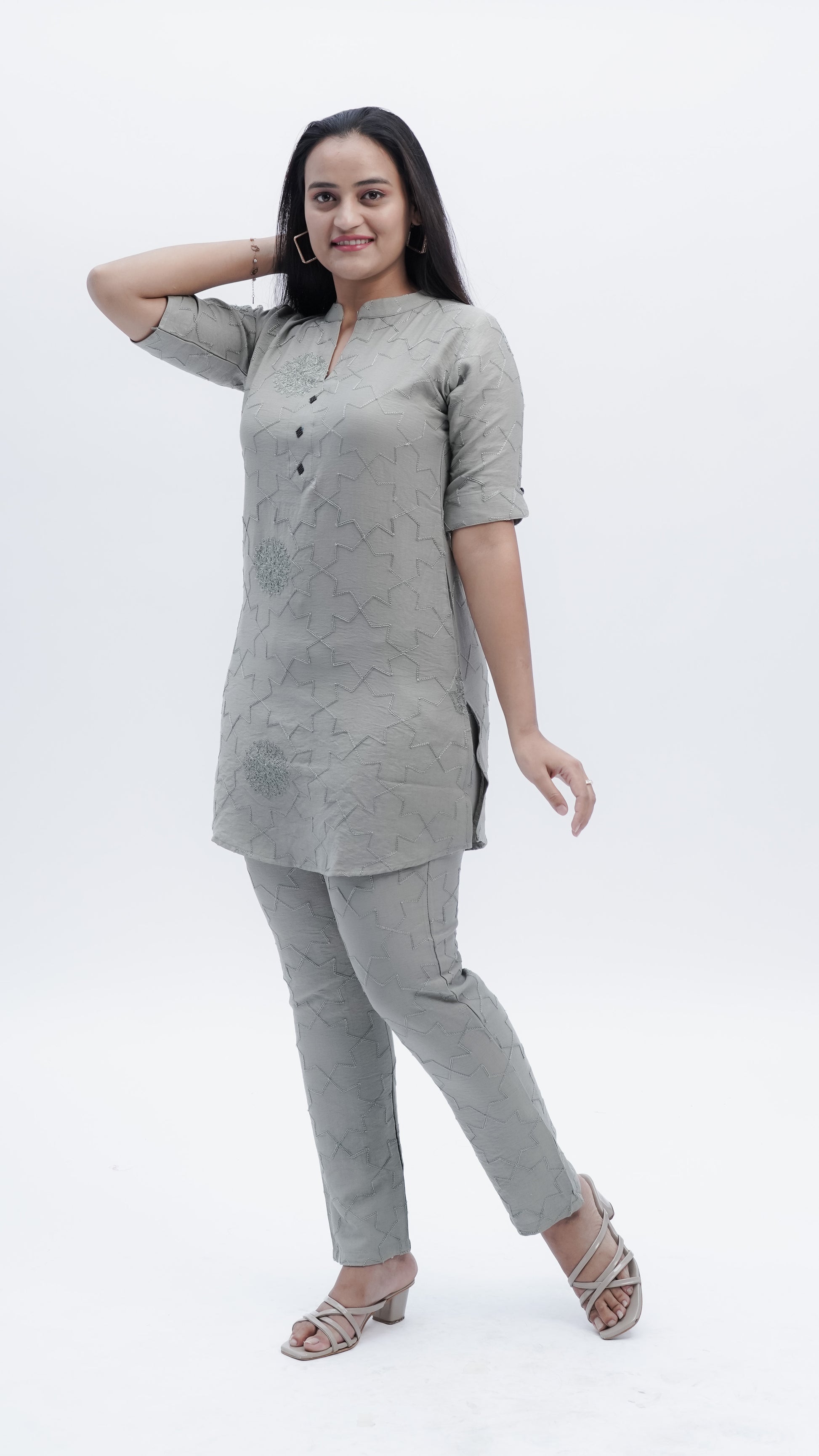 Elevate your wardrobe with this sophisticated Fusion Co-ord Set in elegant grey. Featuring intricate threadwork that showcases exceptional craftsmanship, this versatile ensemble seamlessly blends contemporary styling with traditional artistry. The coordinated pieces work together to create a polished, put-together look suitable for both casual outings and semi-formal occasions. The detailed embroidery adds visual depth and texture, making this set a standout choice for those who appreciate quality construction and refined aesthetics.