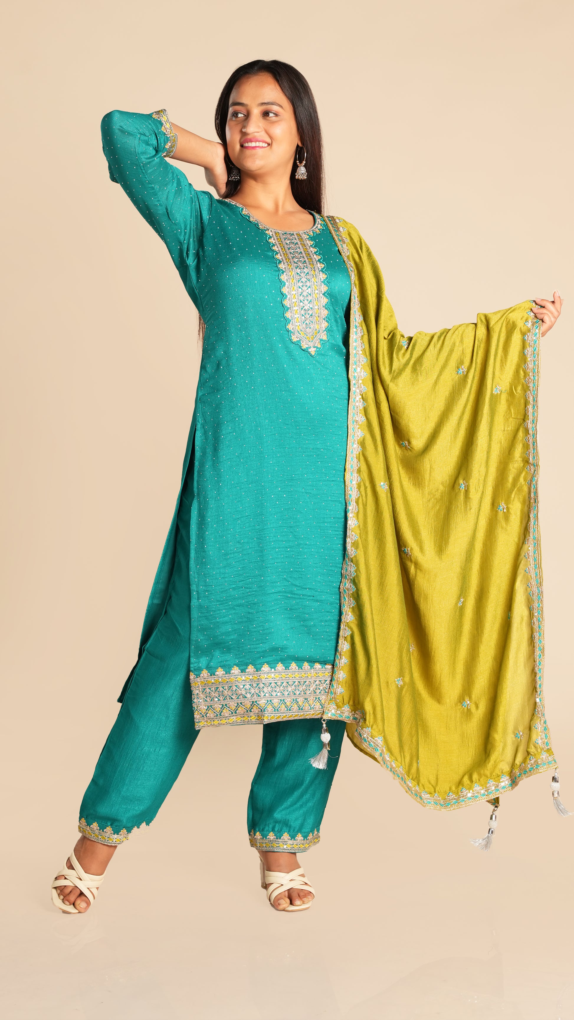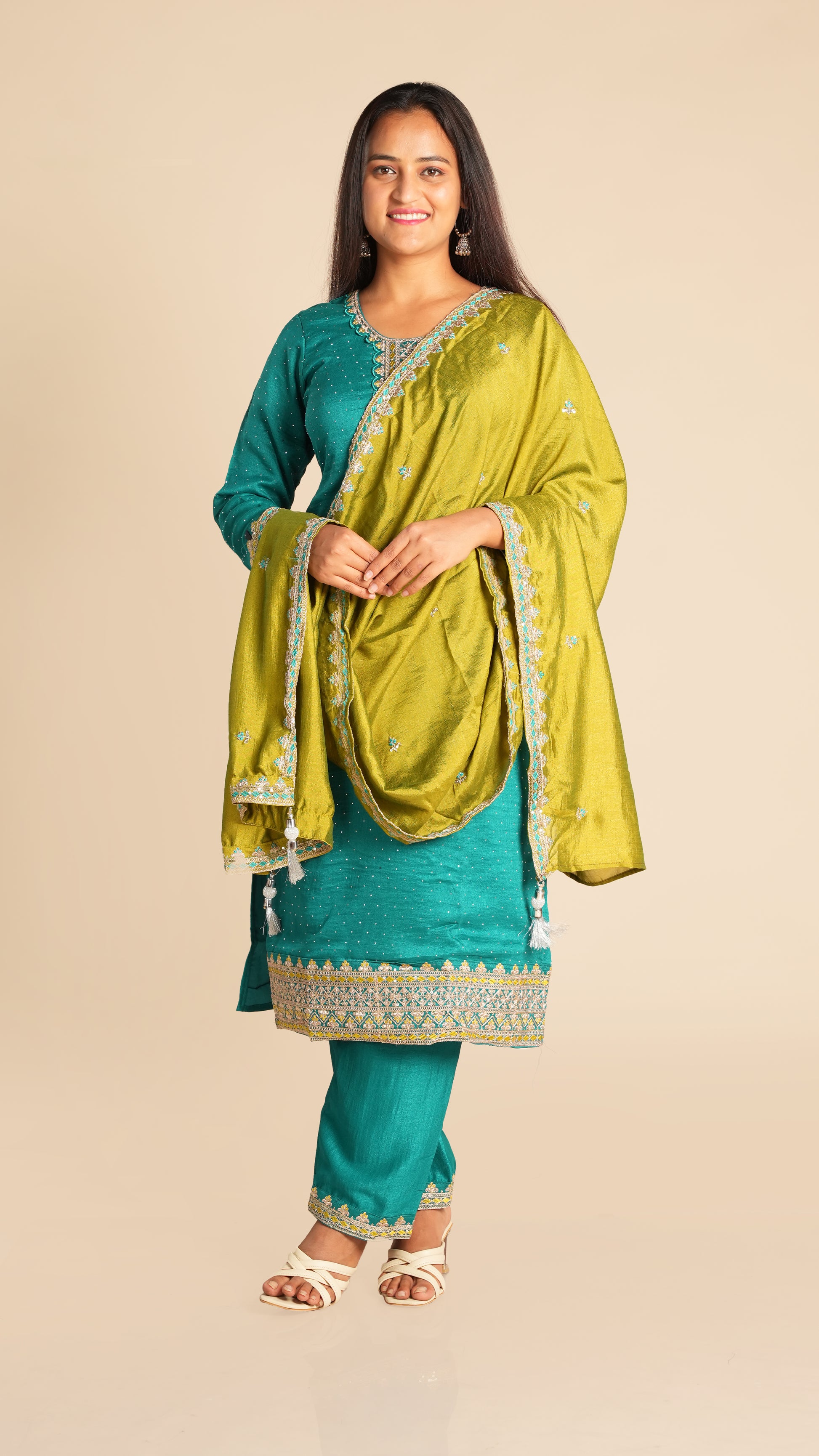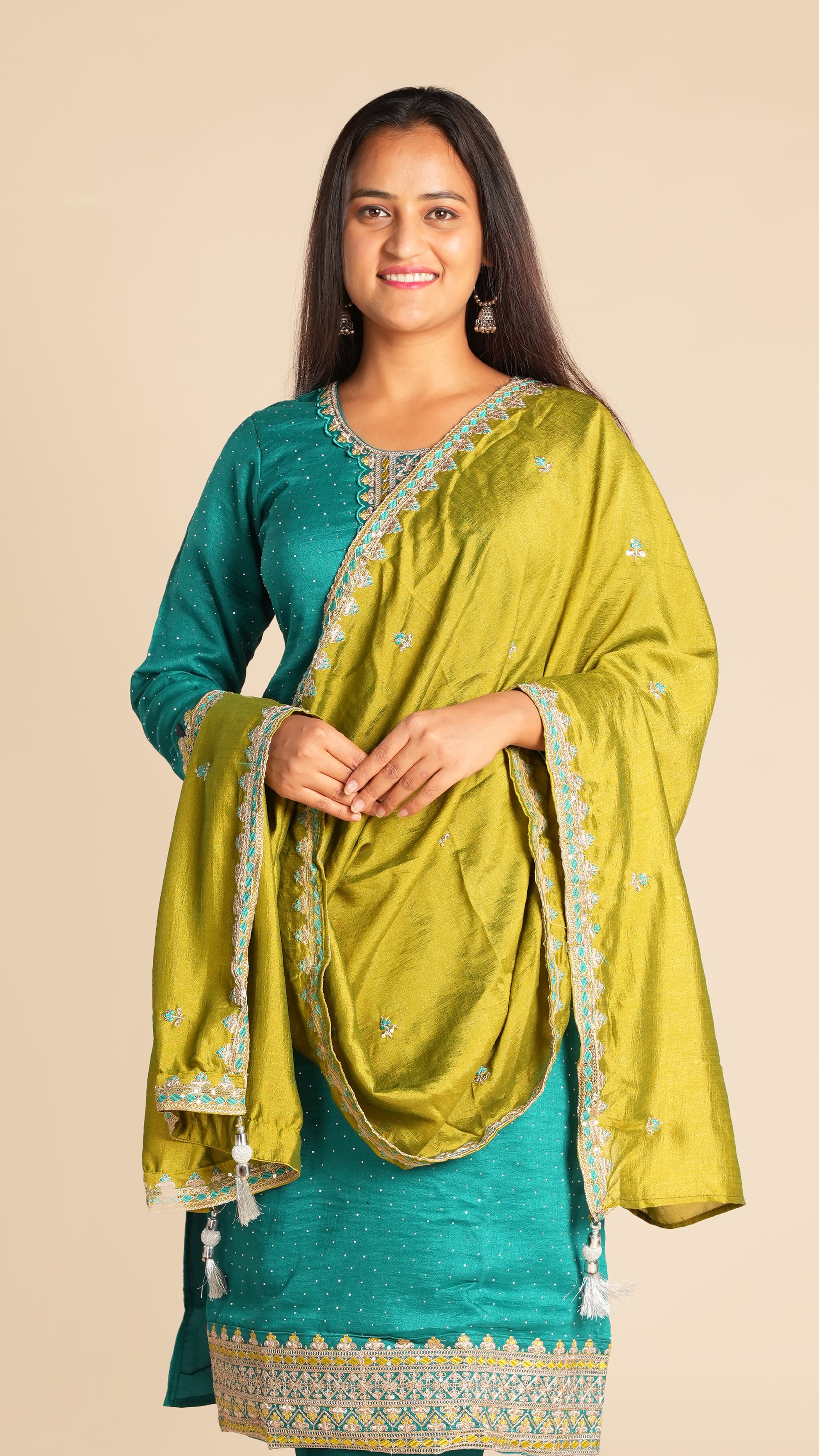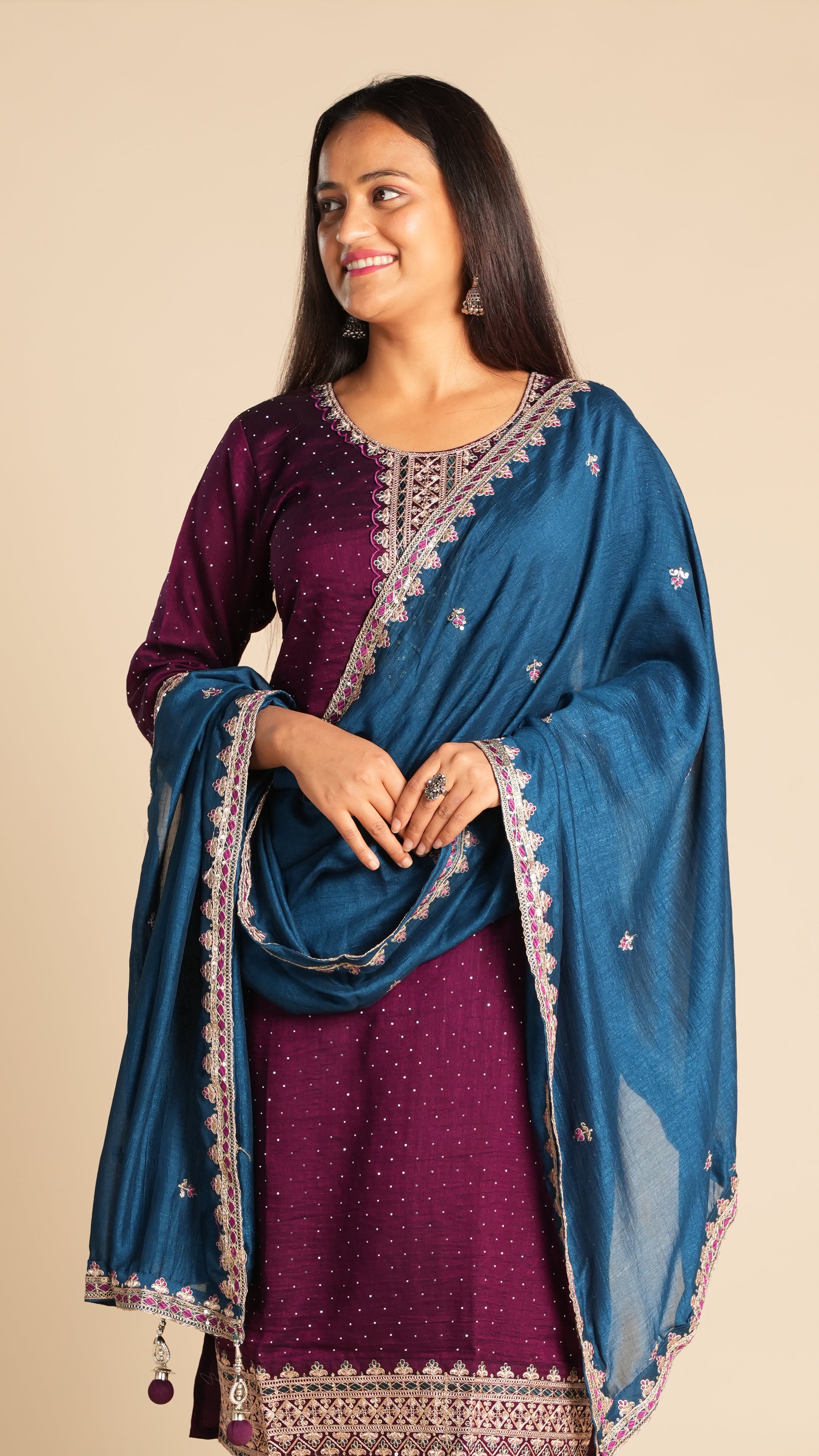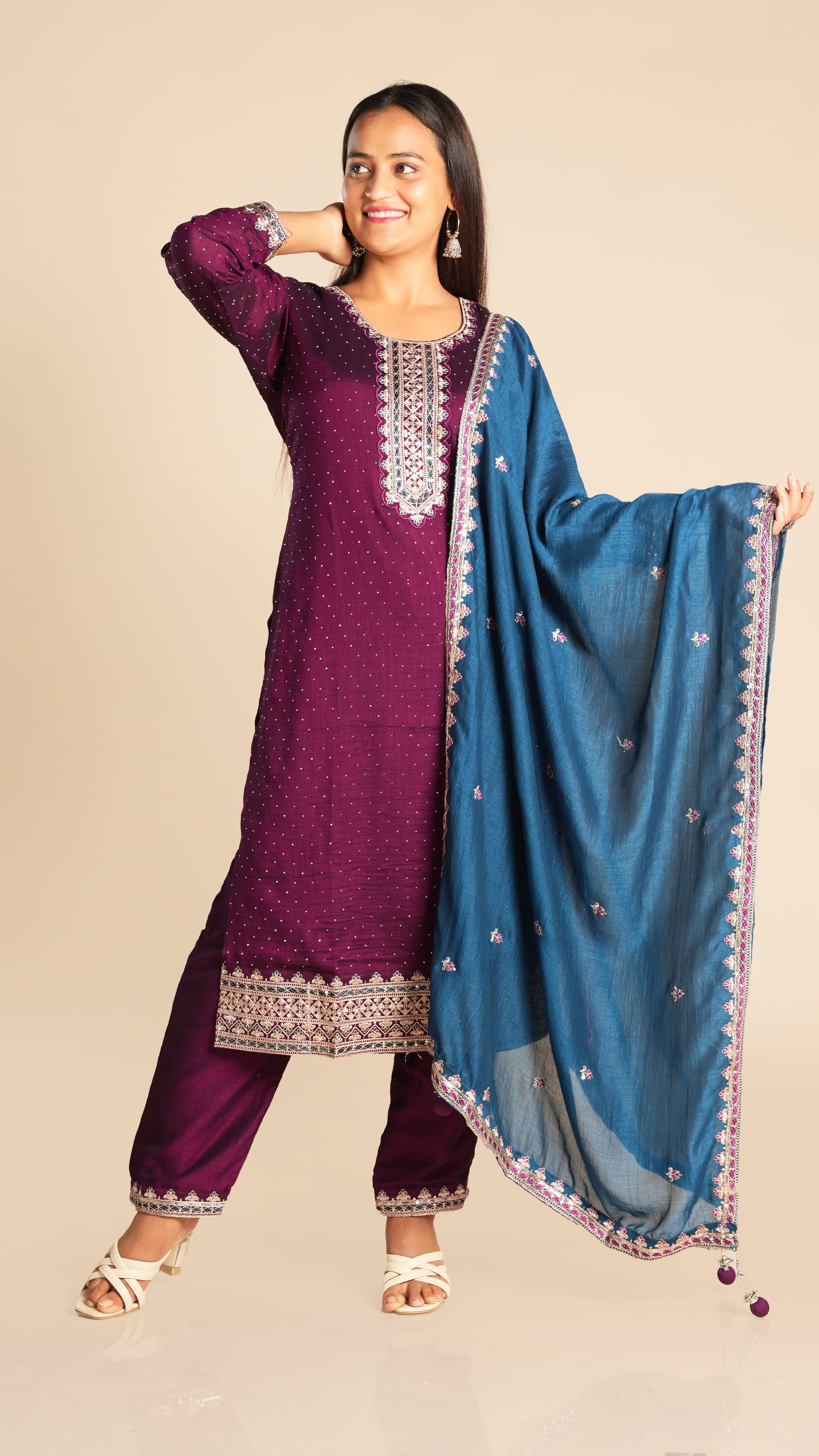 Heavy Embroidered Suit Set with Contrast Dupatta
