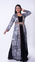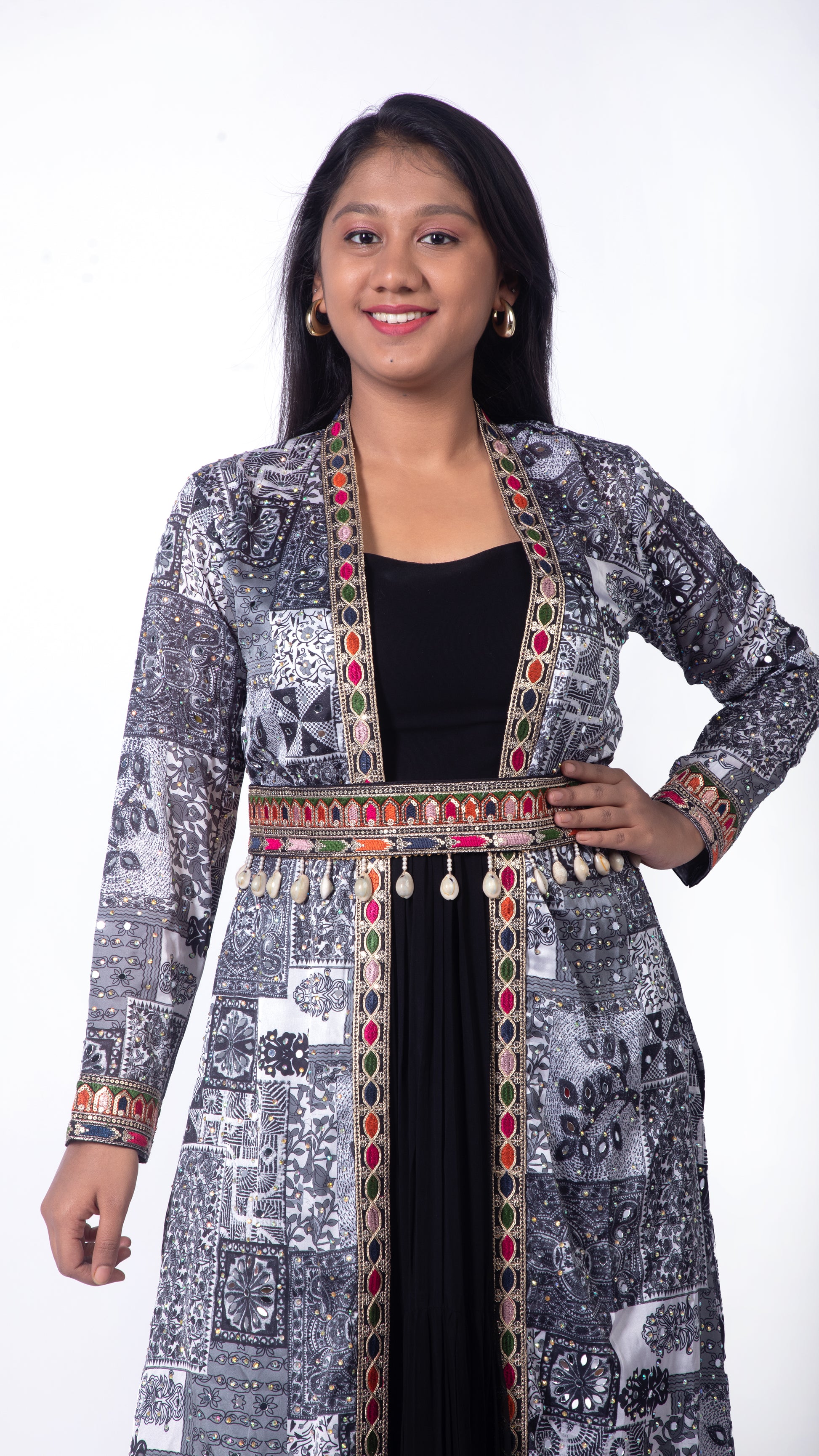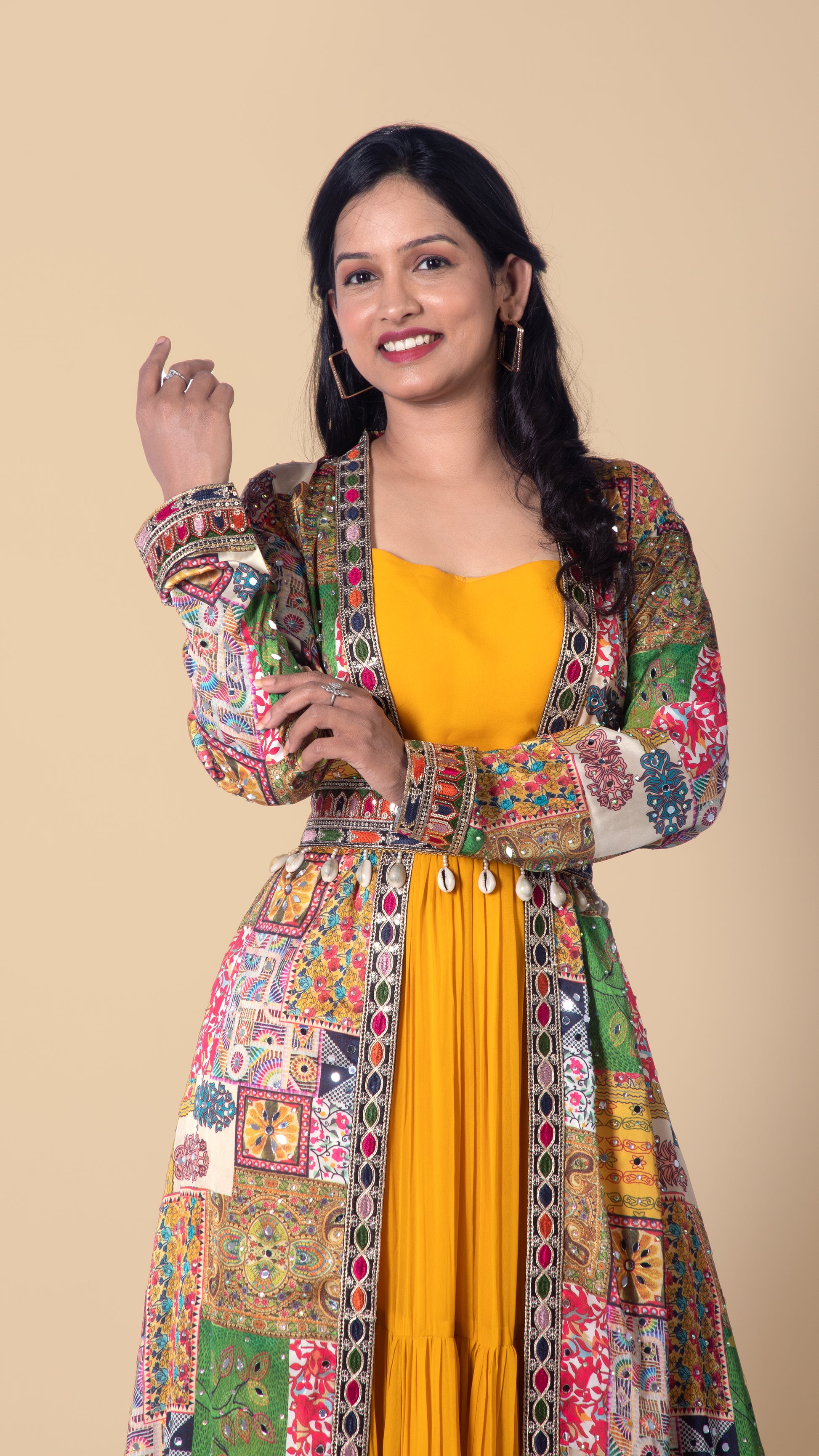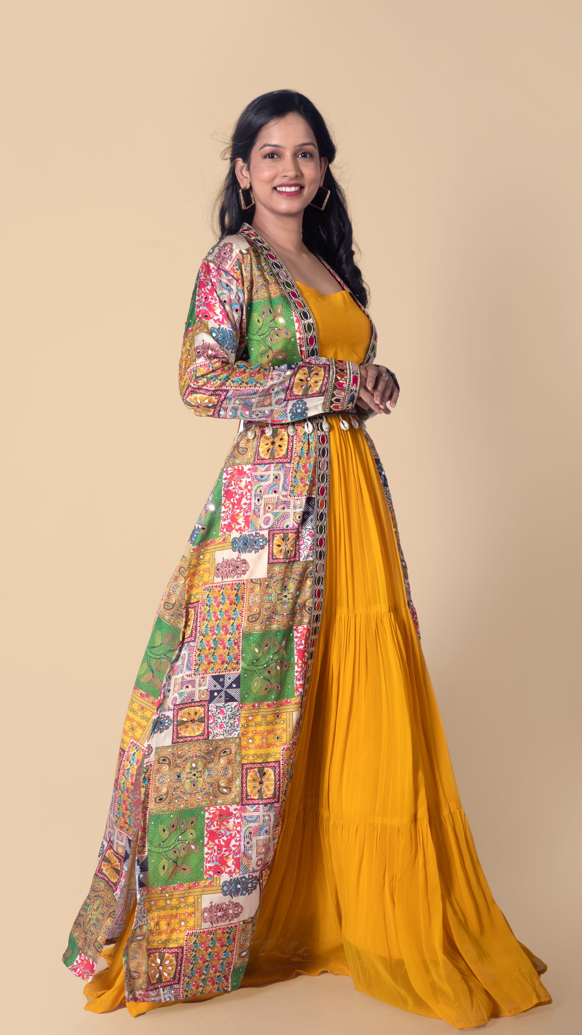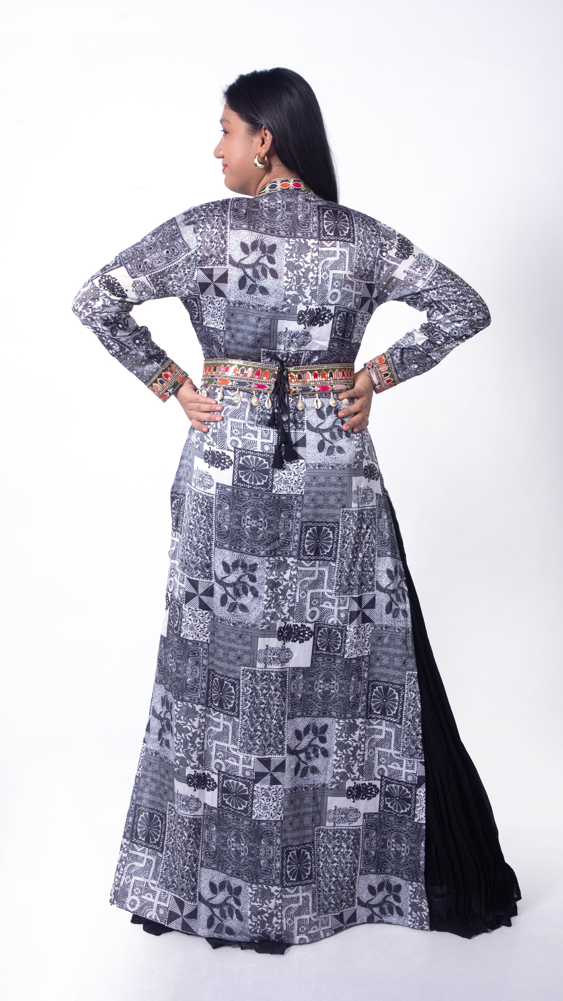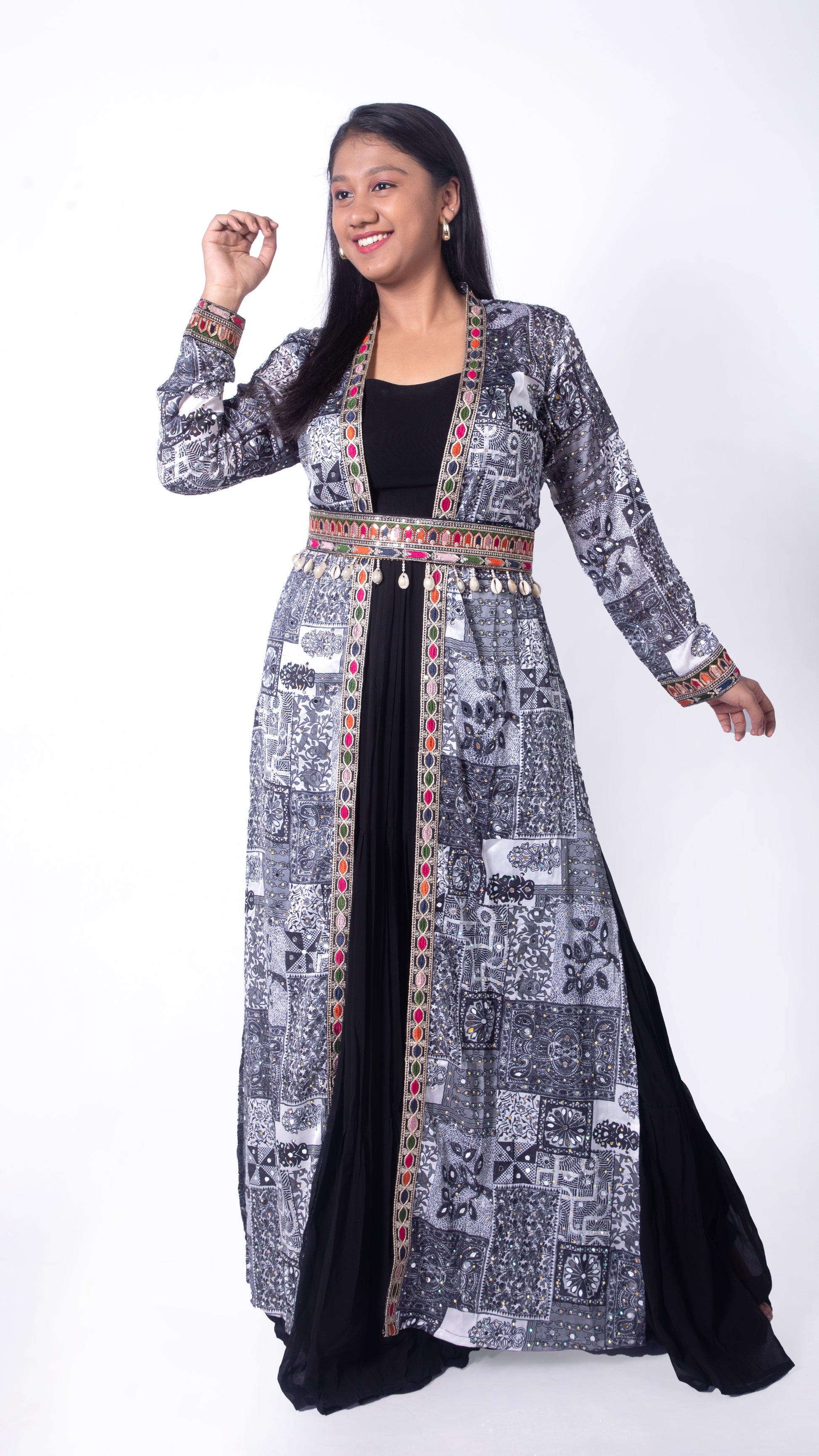 Indo Western Flared Gown with Printed Long Jacket and Detachable Belt