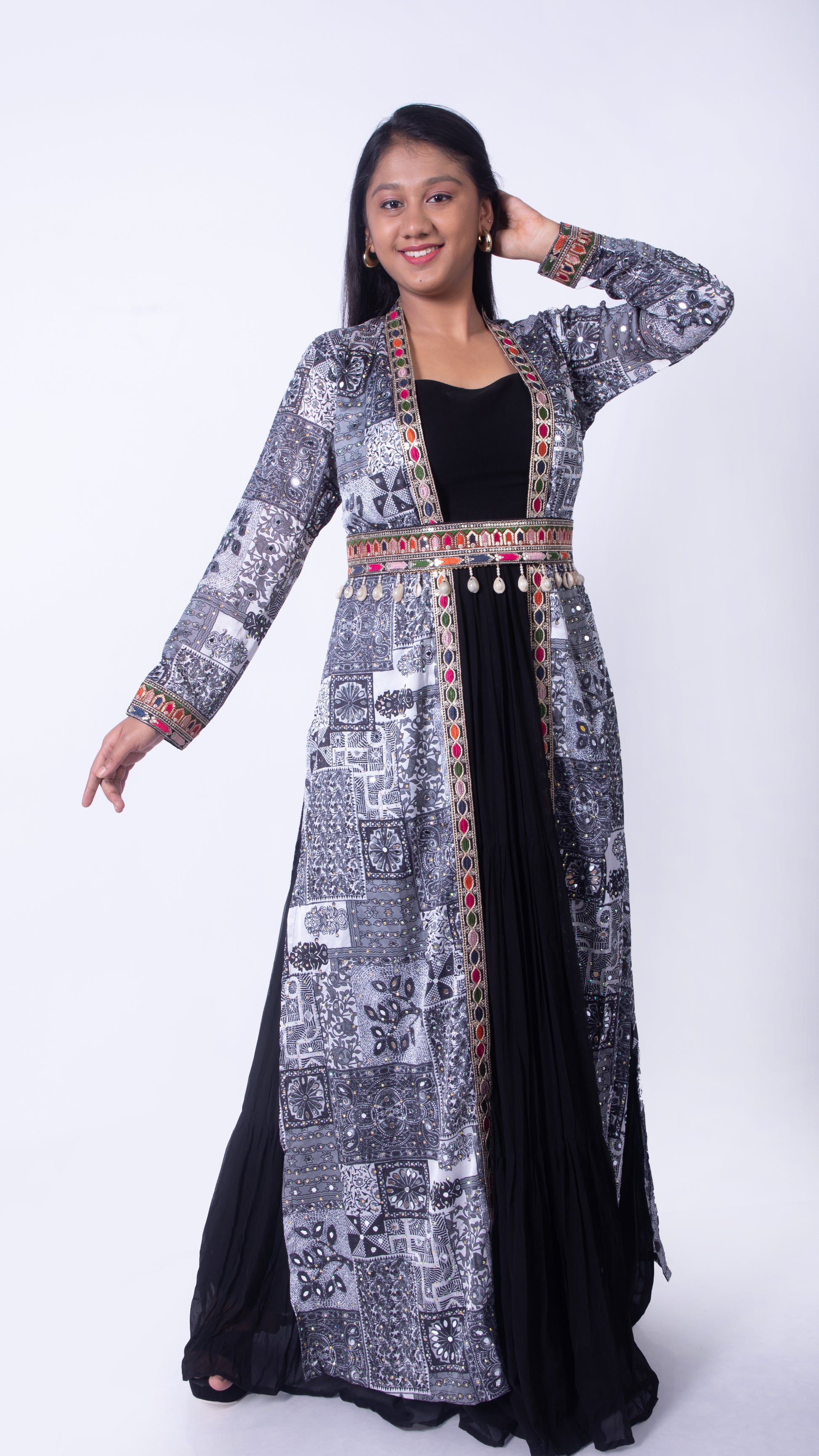 Experience the perfect blend of traditional and modern with our Indo Western Flared Gown. The printed long jacket adds a unique touch while the detachable belt allows for versatile styling. Elevate your look with this elegant and fashionable outfit.