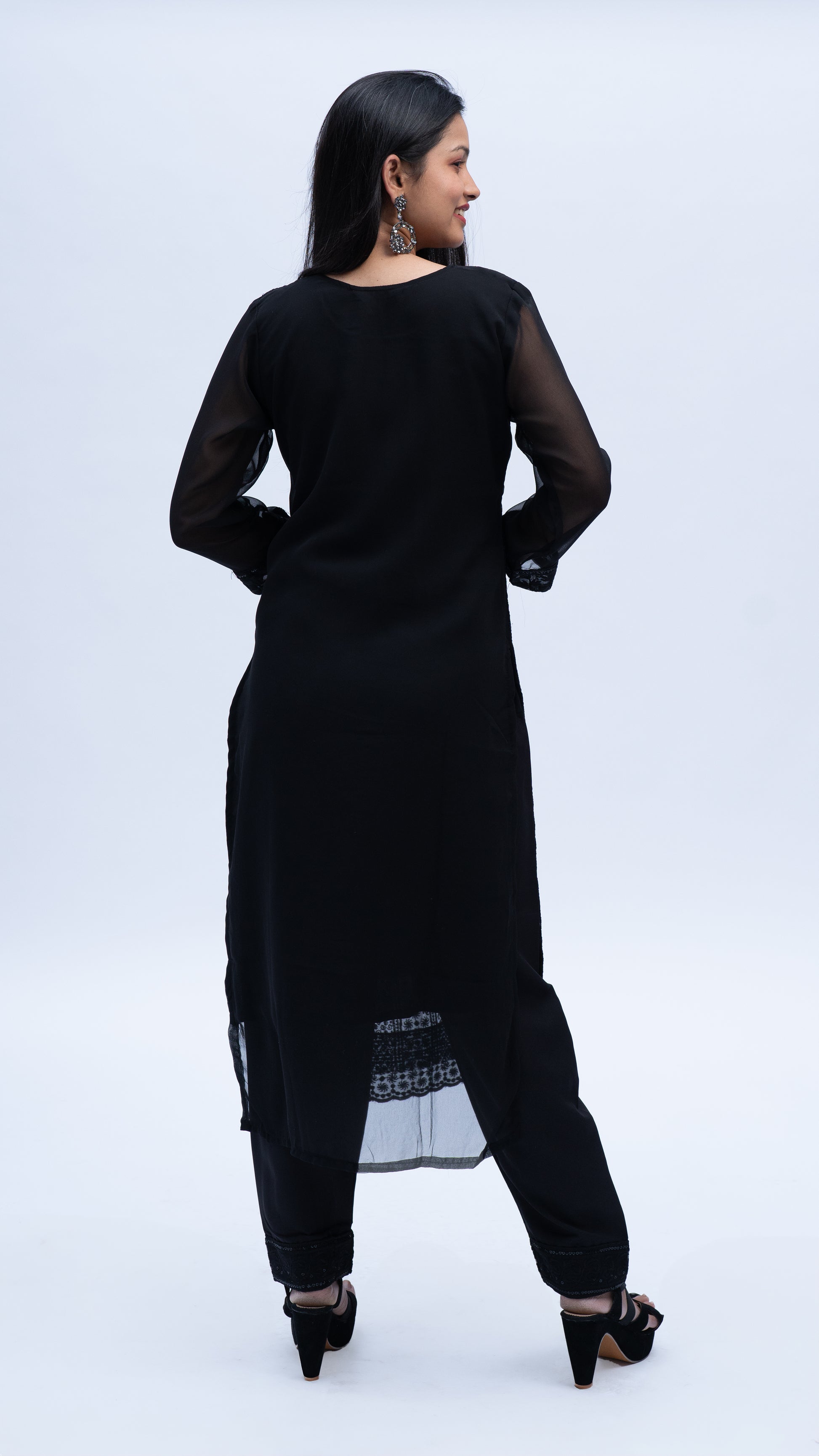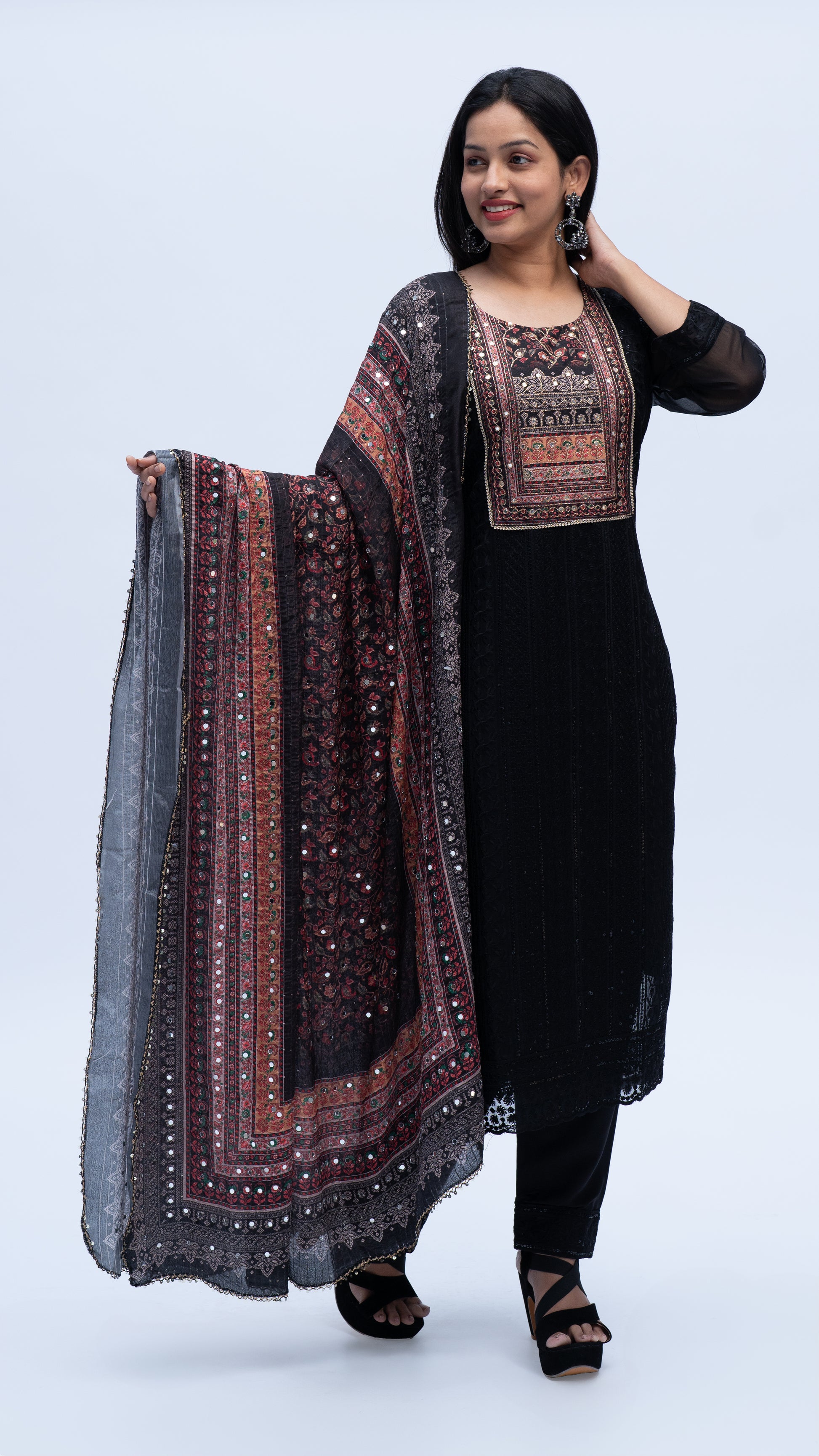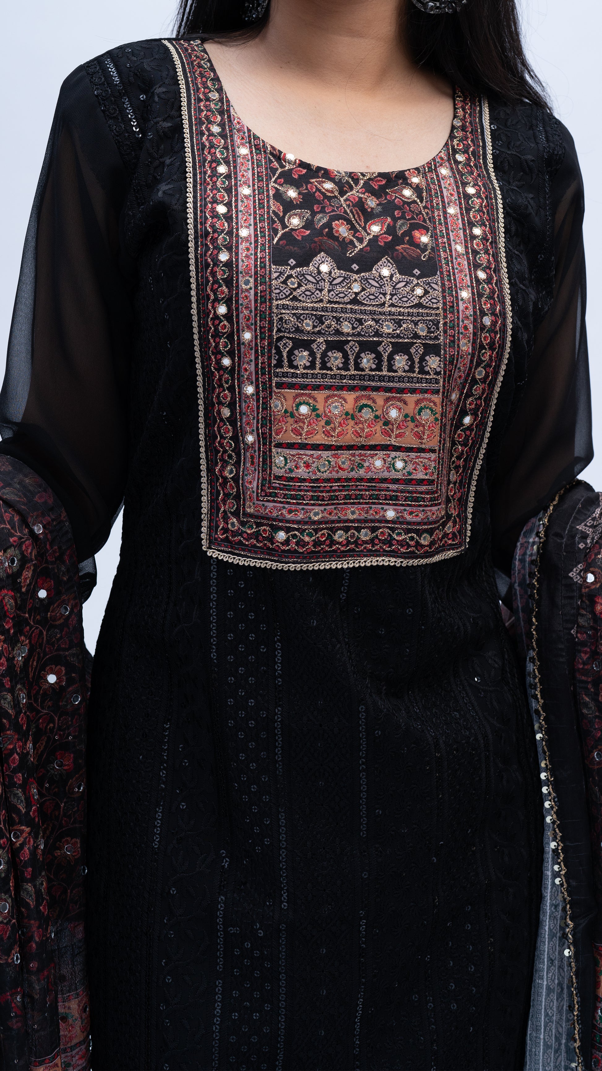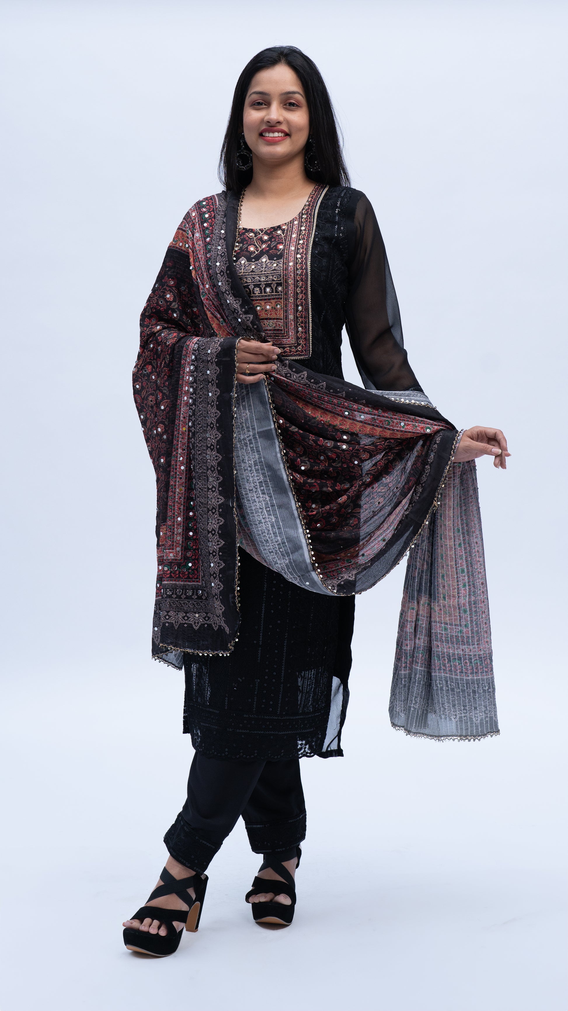 Elevate your style with this stunning Black Suit Set featuring intricate mirror work. Crafted from high-quality fabric, this set exudes elegance and charm, making it perfect for festive occasions or evening gatherings. The delicate mirror embellishments add a touch of sparkle, while the sleek black design offers timeless sophistication.