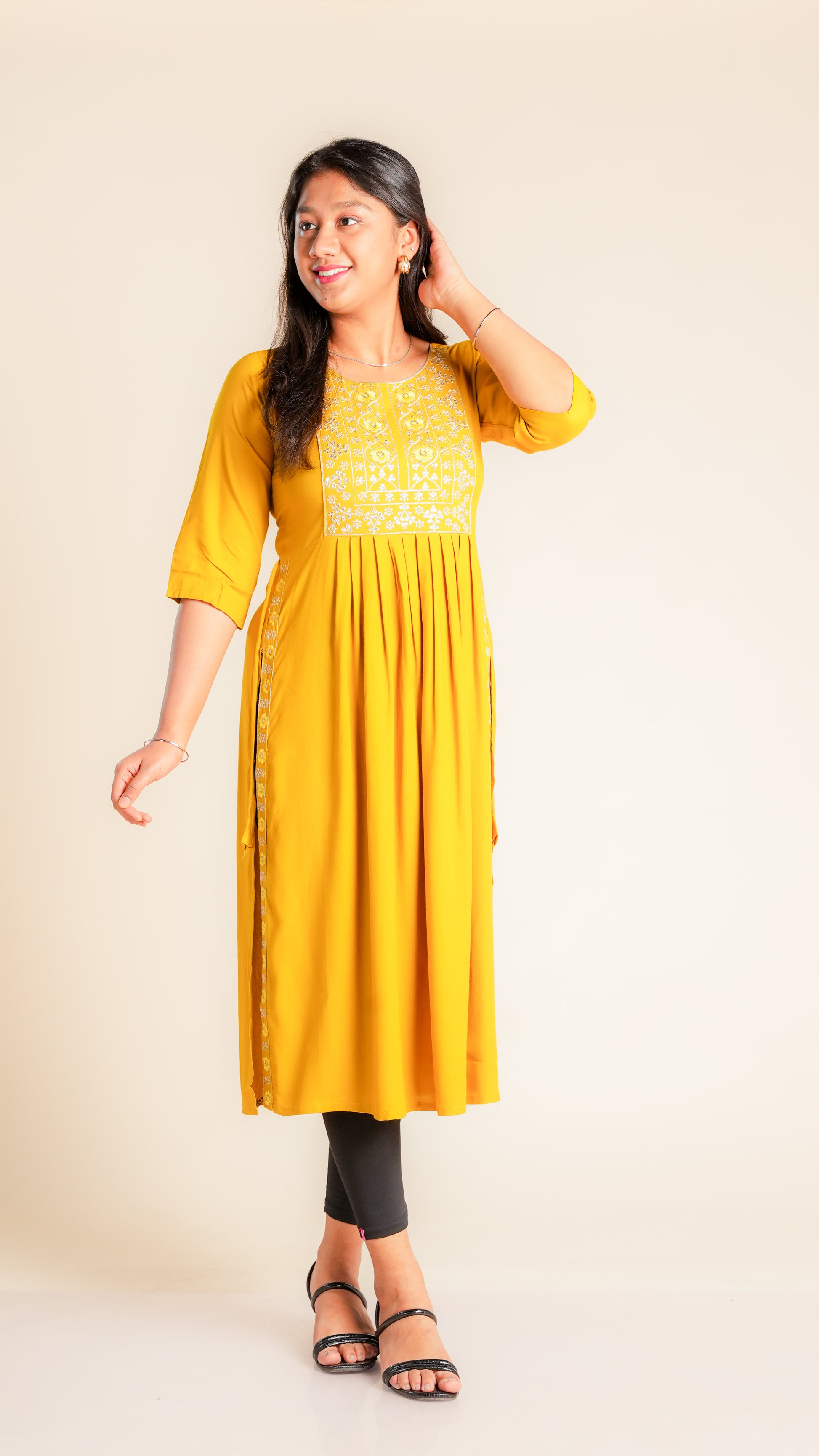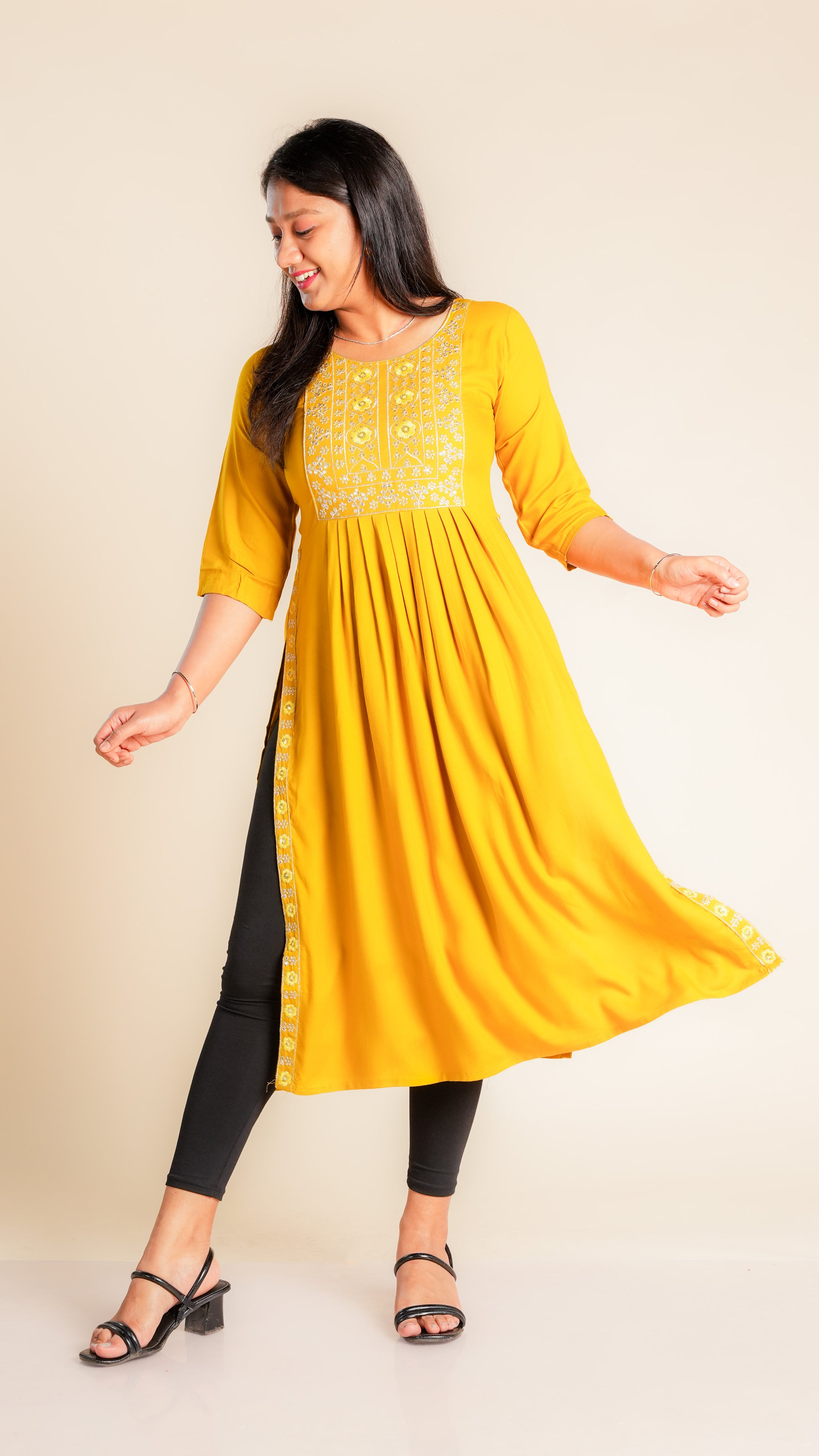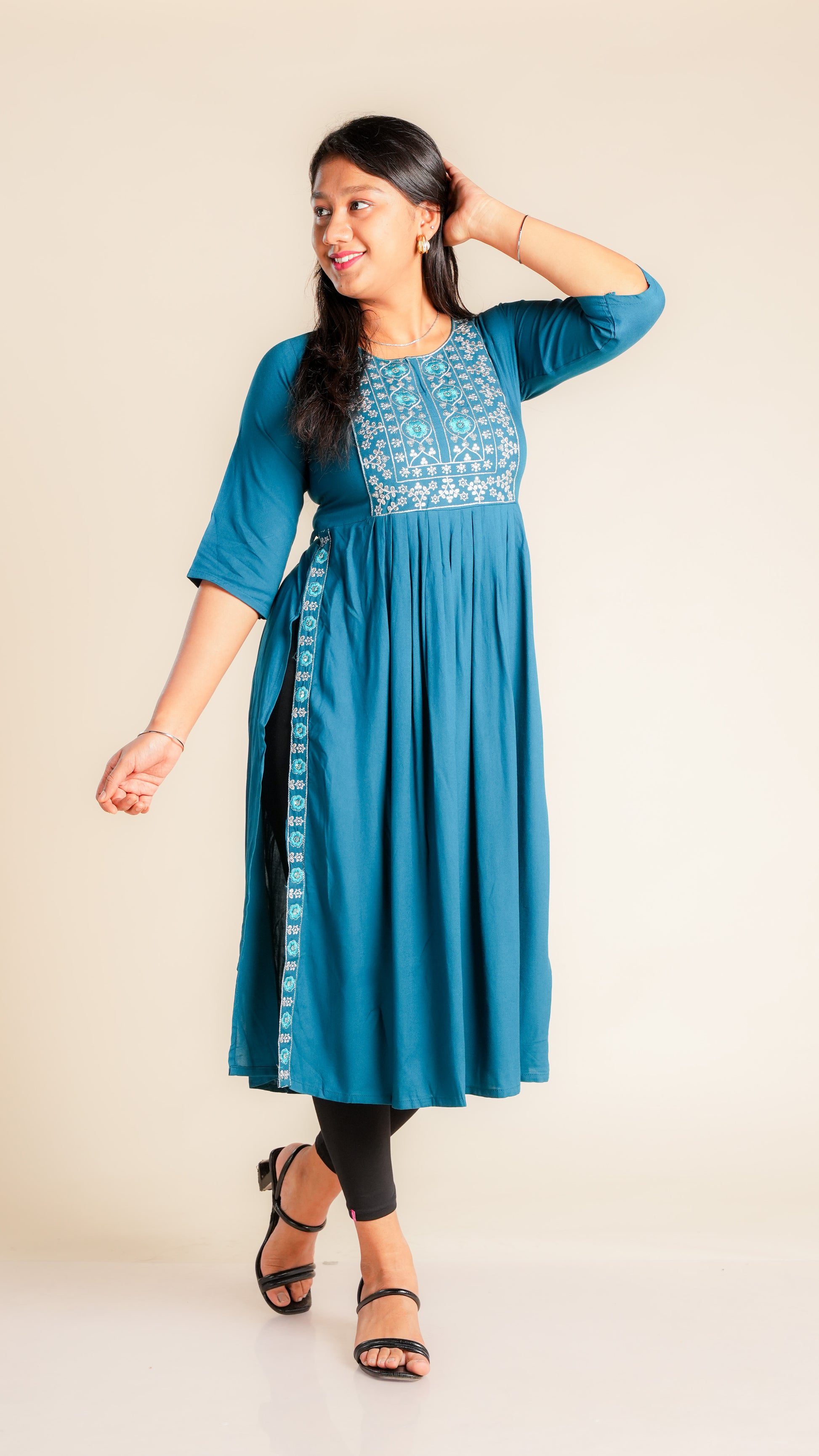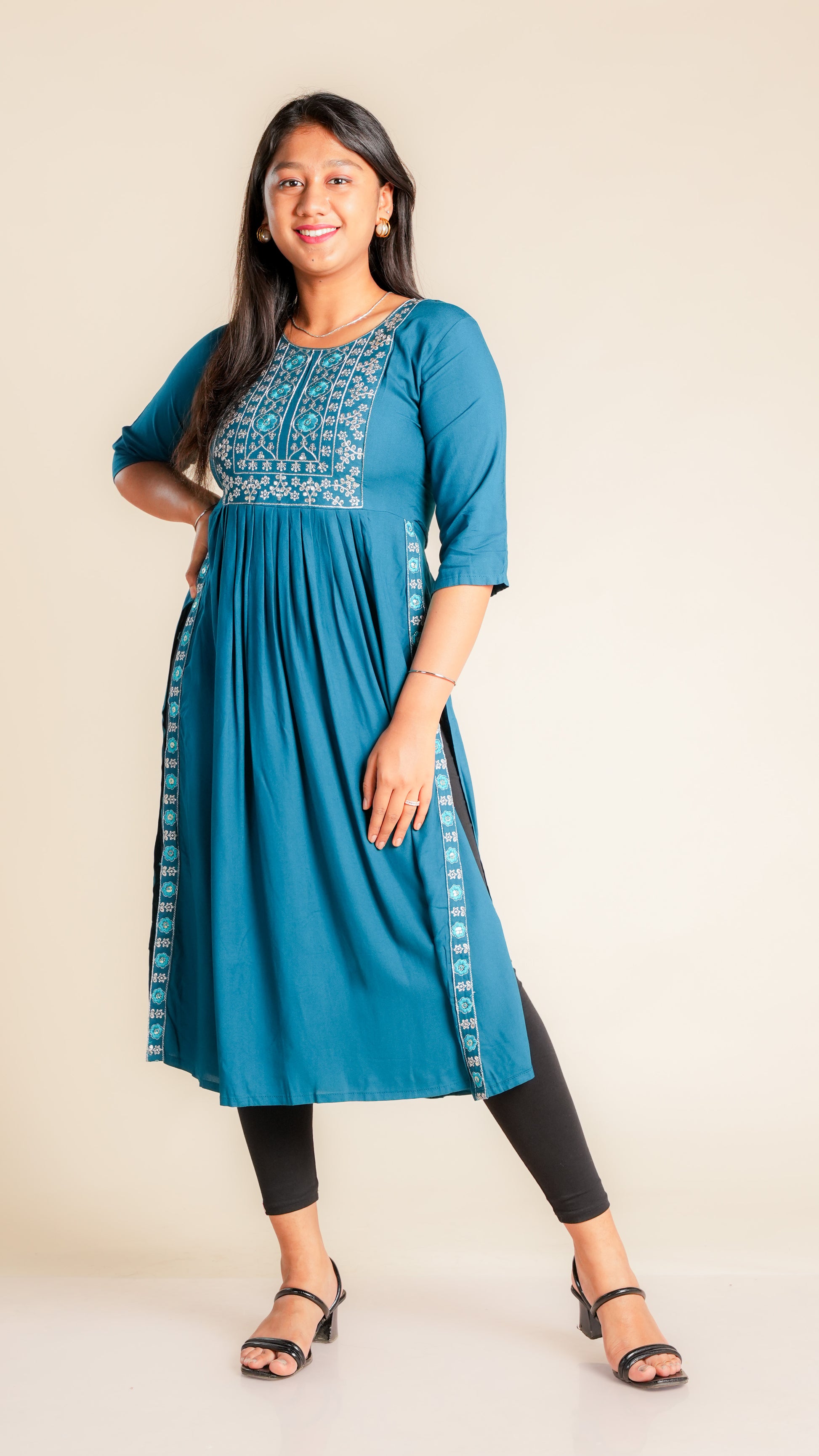 The Sunidhi Nyra Cut Kurti is a stylish and comfortable addition to any wardrobe. Made with high-quality reyon material and featuring a unique cut design, this kurti is perfect for any occasion. With its flared silhouette, it offers a flattering fit for all body types. Elevate your style with the Nyra Cut Reyon Flare Kurti.