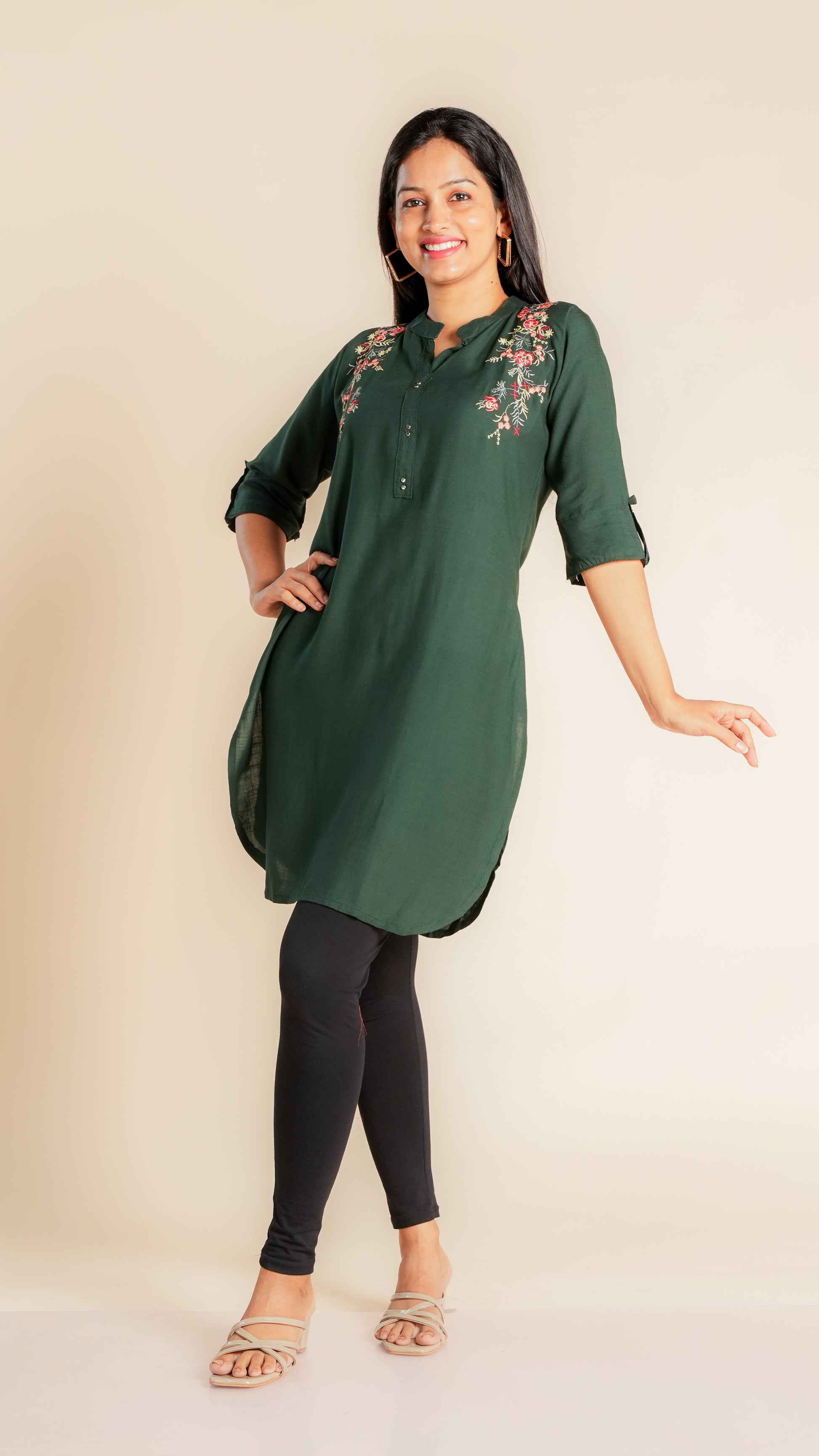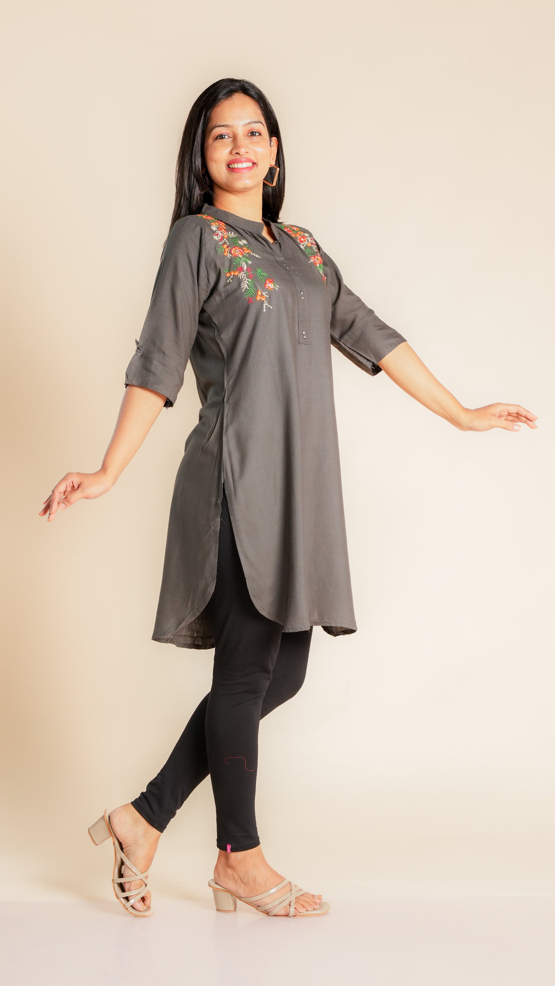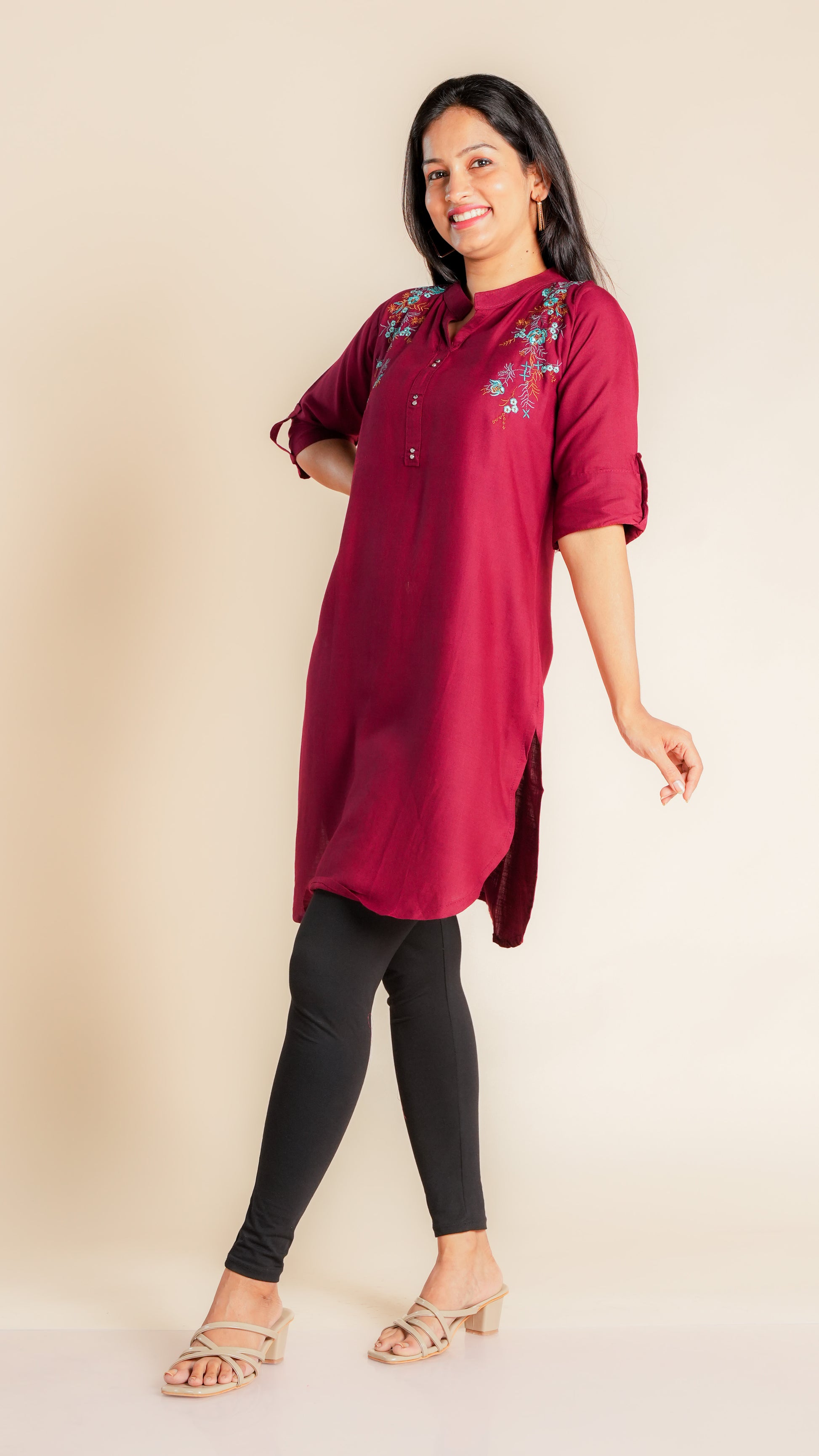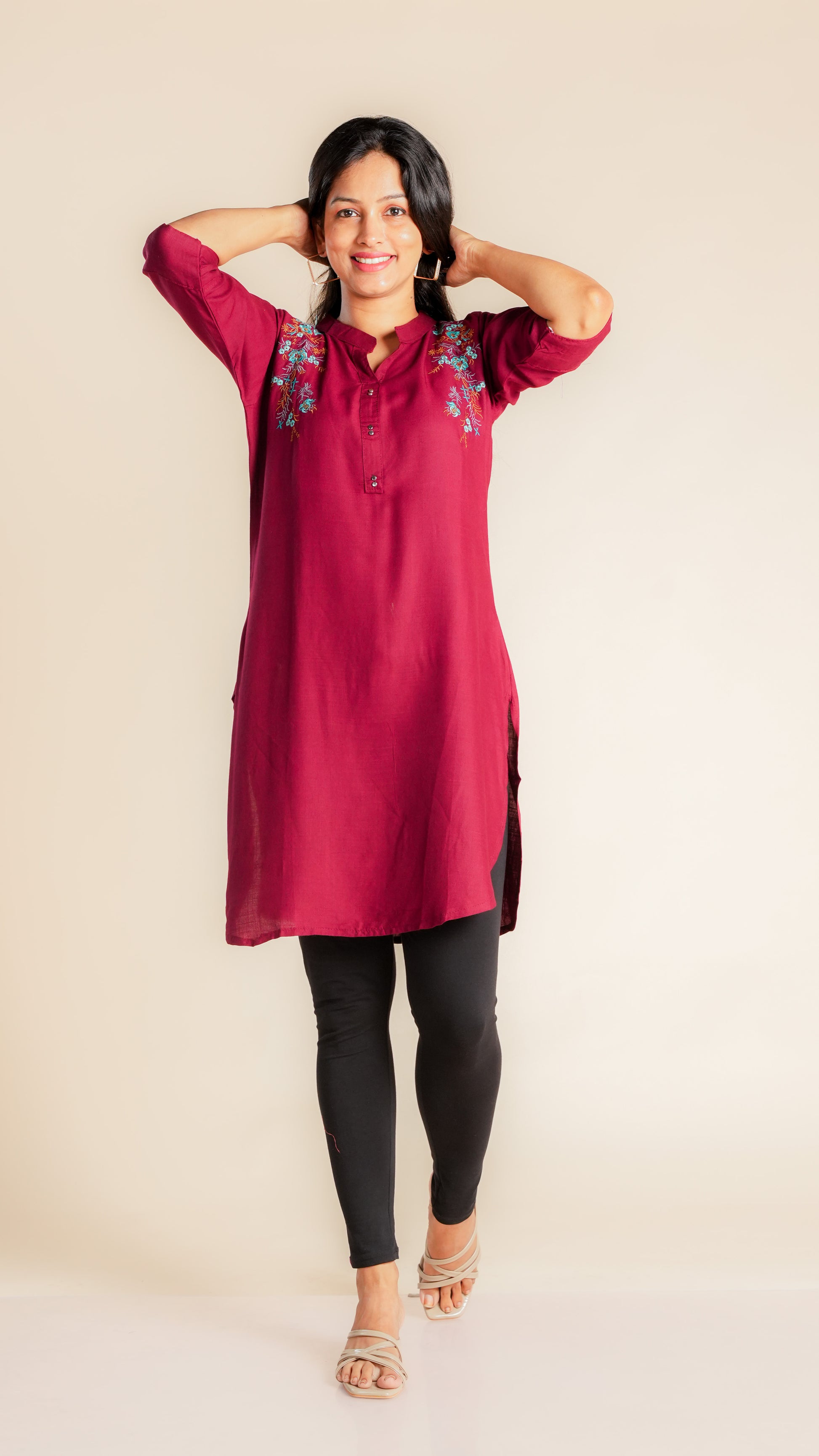 This Fieraa Kurti combines traditional design with modern style. Made with high-quality materials and intricate embroidery, this piece is perfect for adding a touch of elegance to any outfit. Its versatile design allows for easy pairing with any bottom, making it a must-have addition to your wardrobe. Embrace the beauty and sophistication of Pathani culture with this stunning kurti.