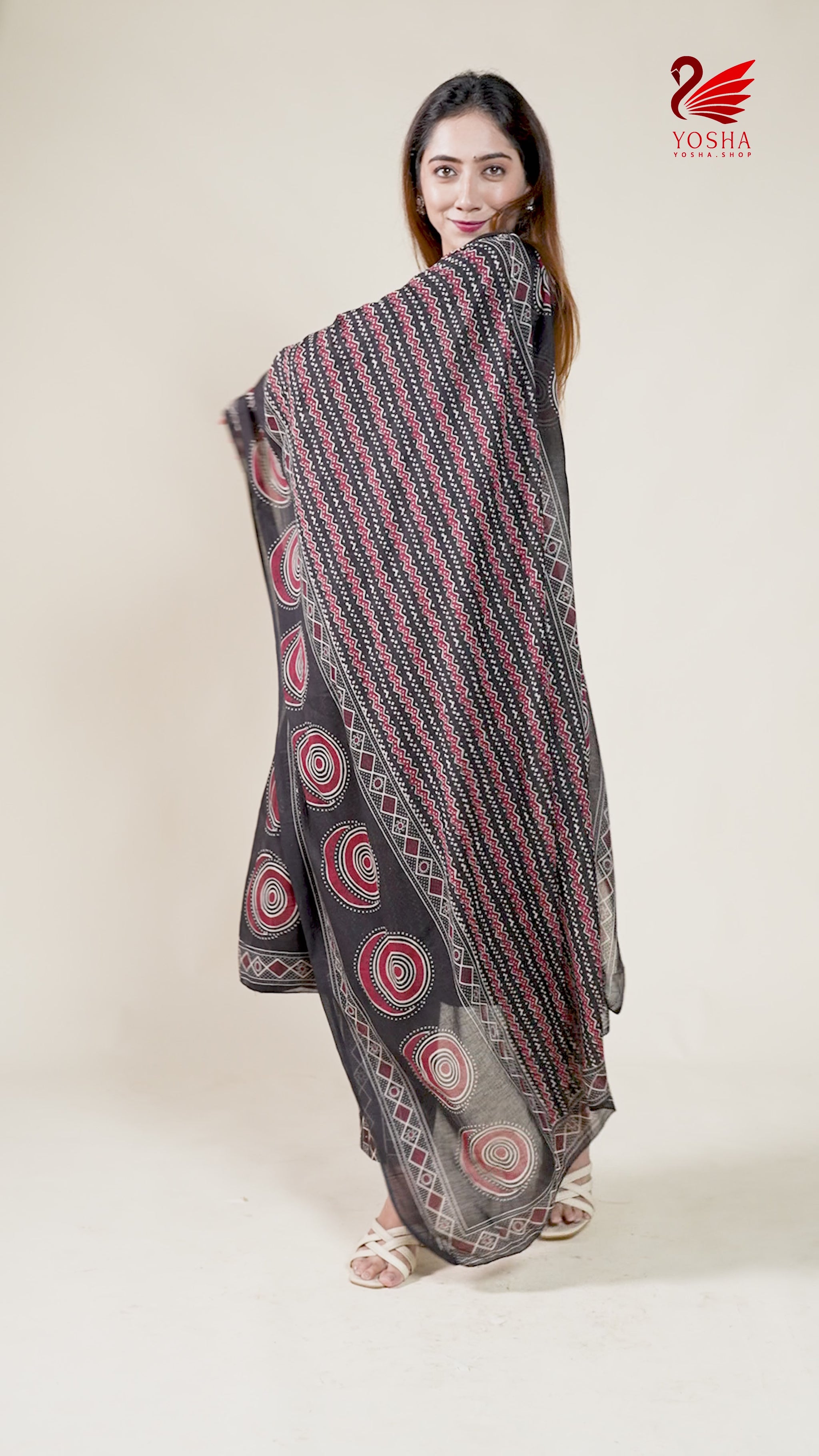 This Print Patakha Suit features a beautifully printed dupatta and pant set, complemented by an elegant neck design. Crafted to offer both style and comfort, it is perfect for festive occasions and casual gatherings alike. The intricate prints and refined neckline add a touch of sophistication, making it a versatile addition to your wardrobe.