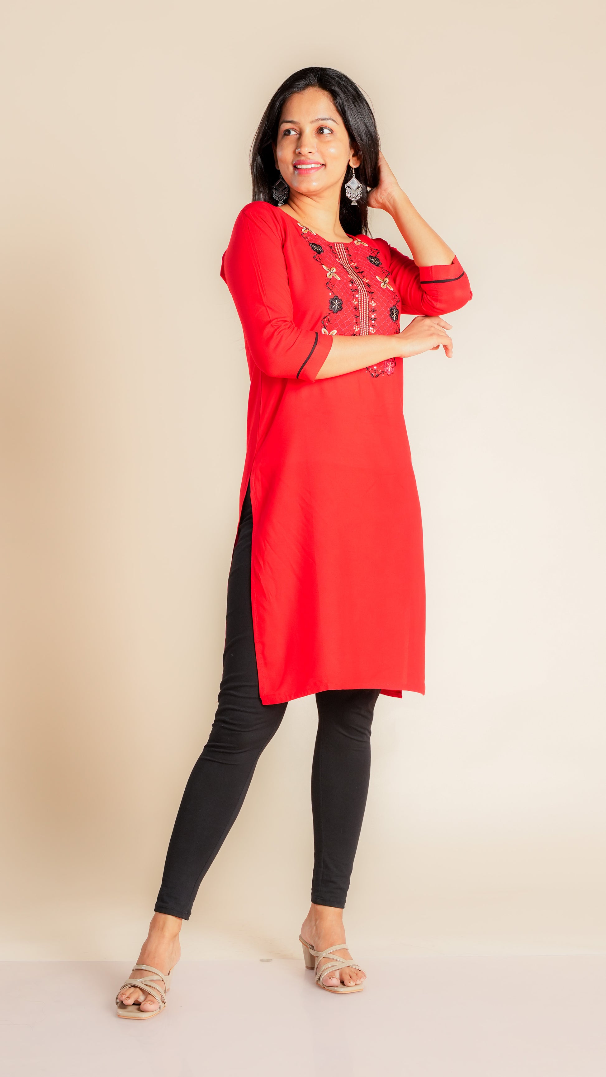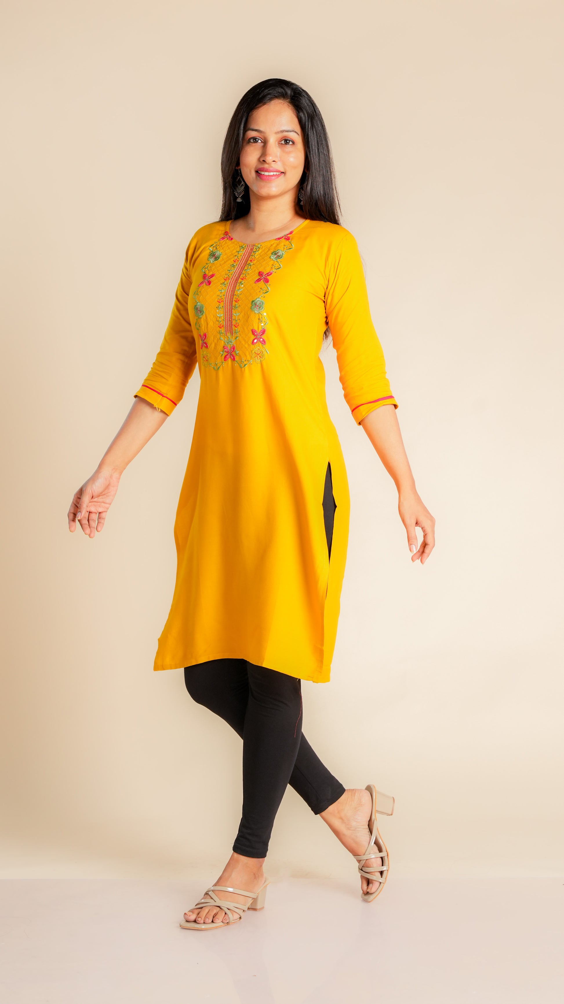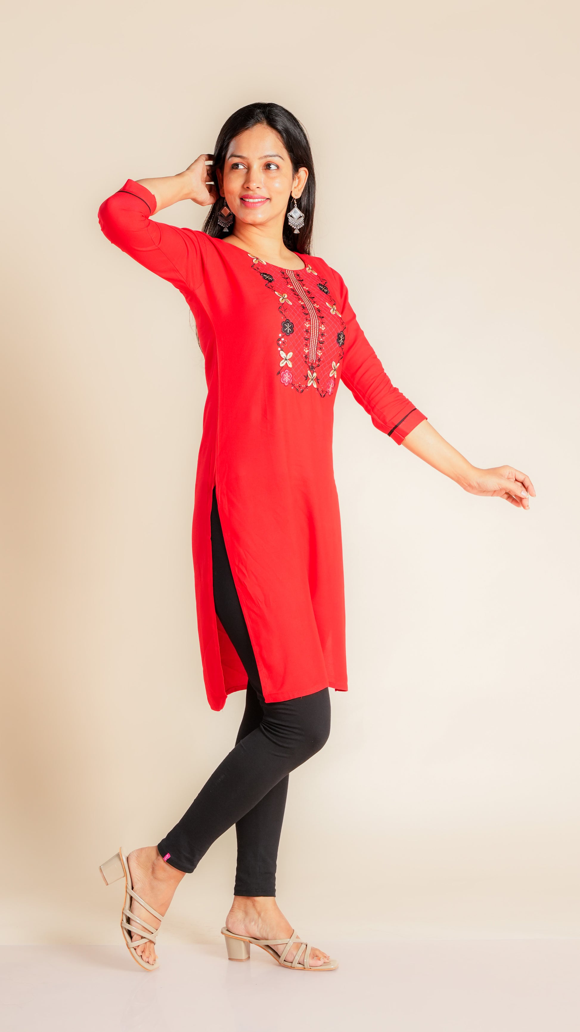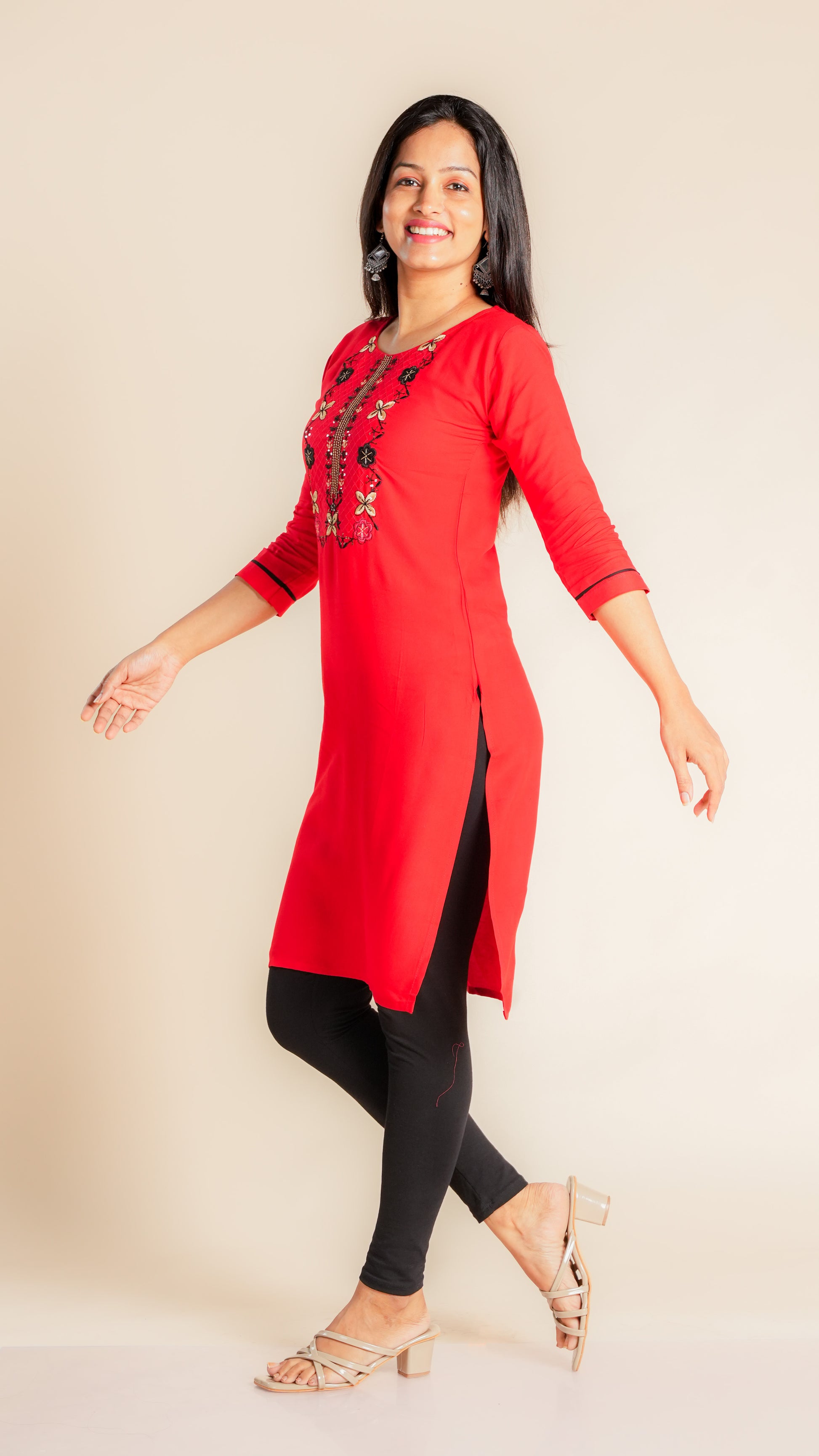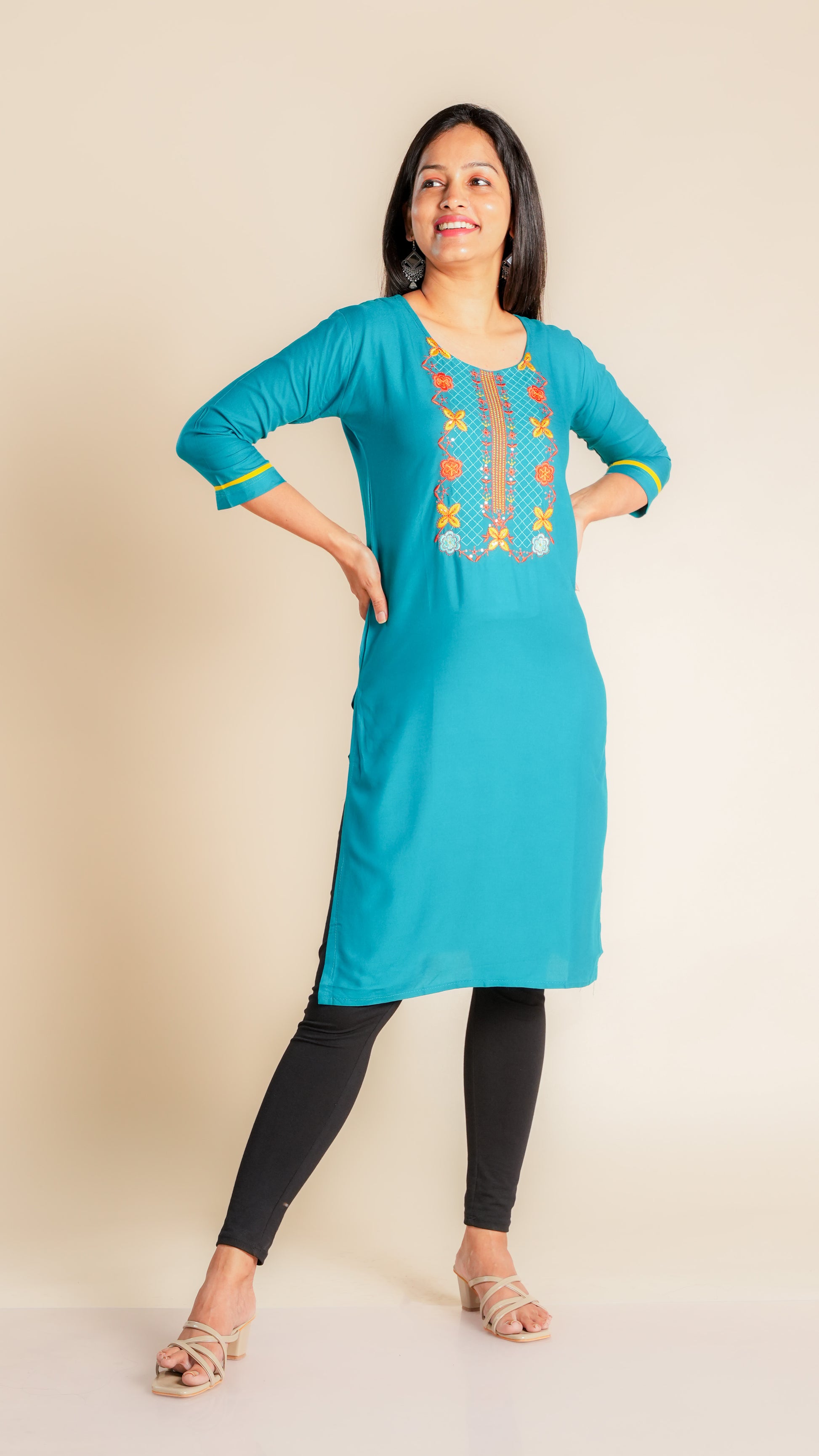 Expertly crafted from soft rayon, this kurti features elegant neck embroidery. Enjoy the comfort and luxury of rayon while making a stylish statement with the delicate detail at the neckline. Perfect for any occasion, it's a must-have in every wardrobe.