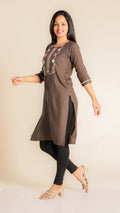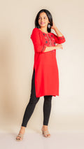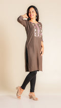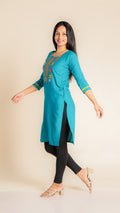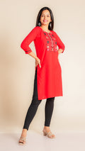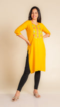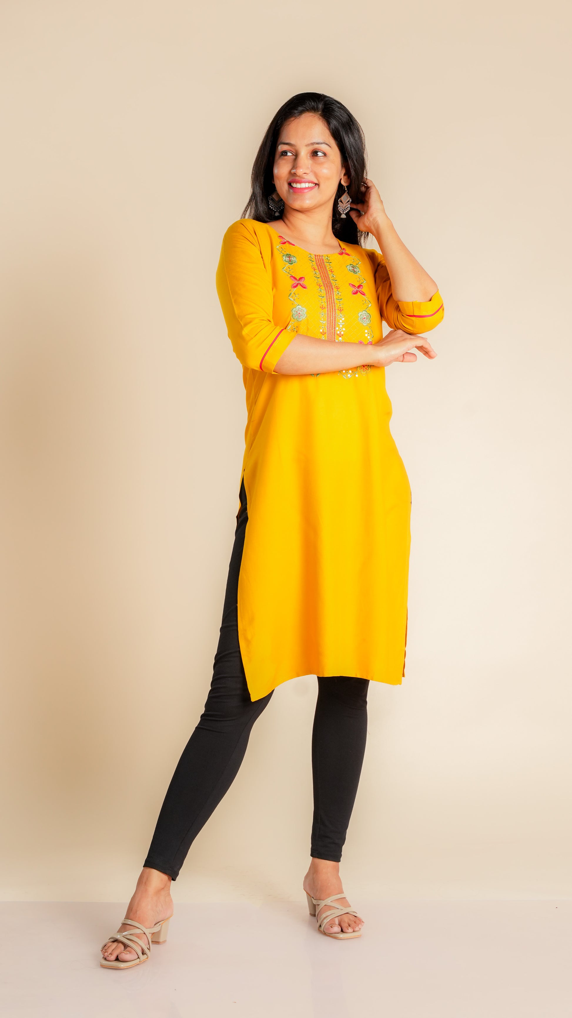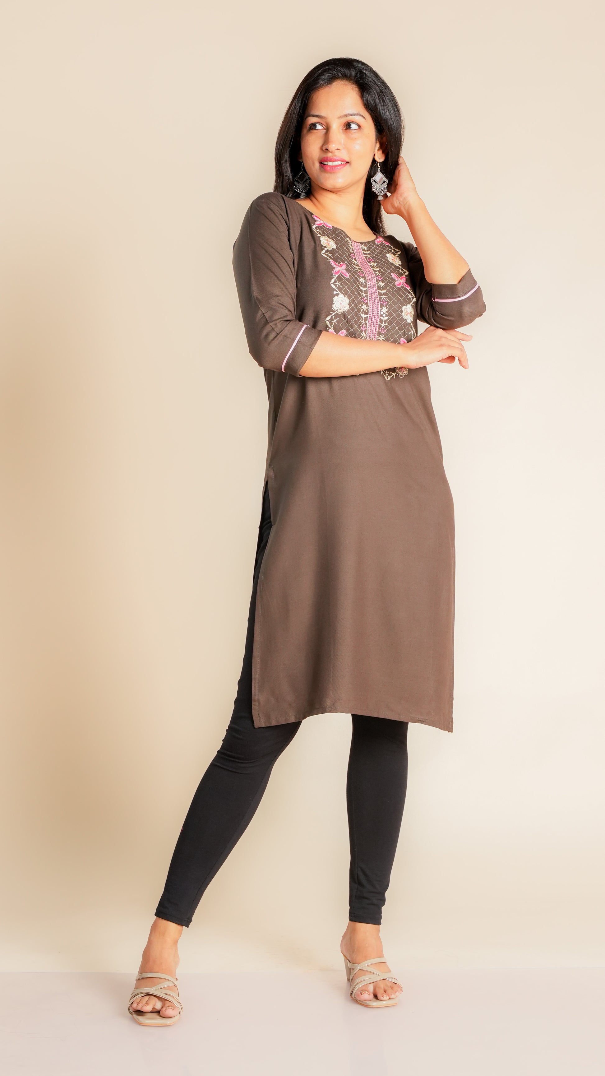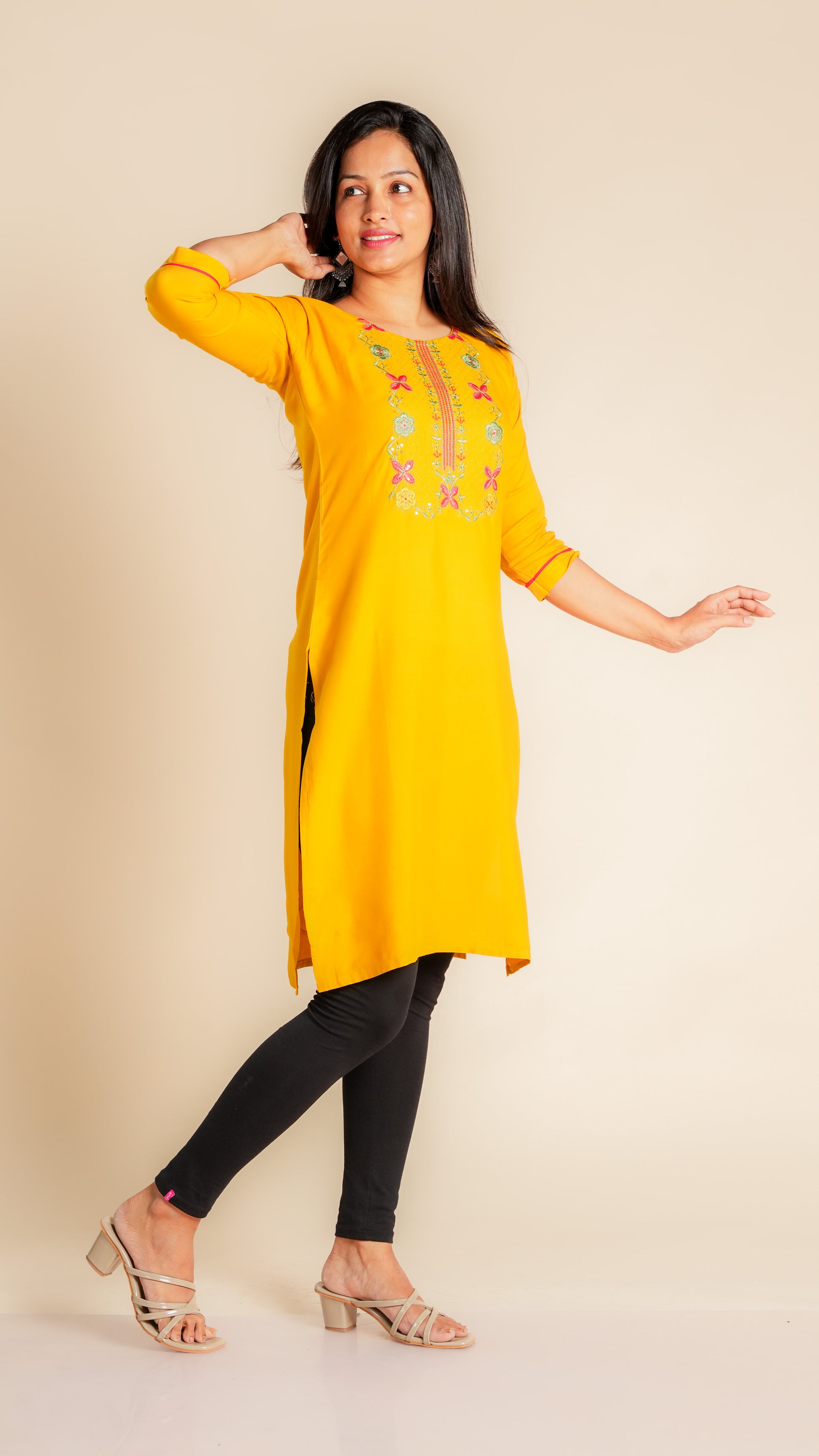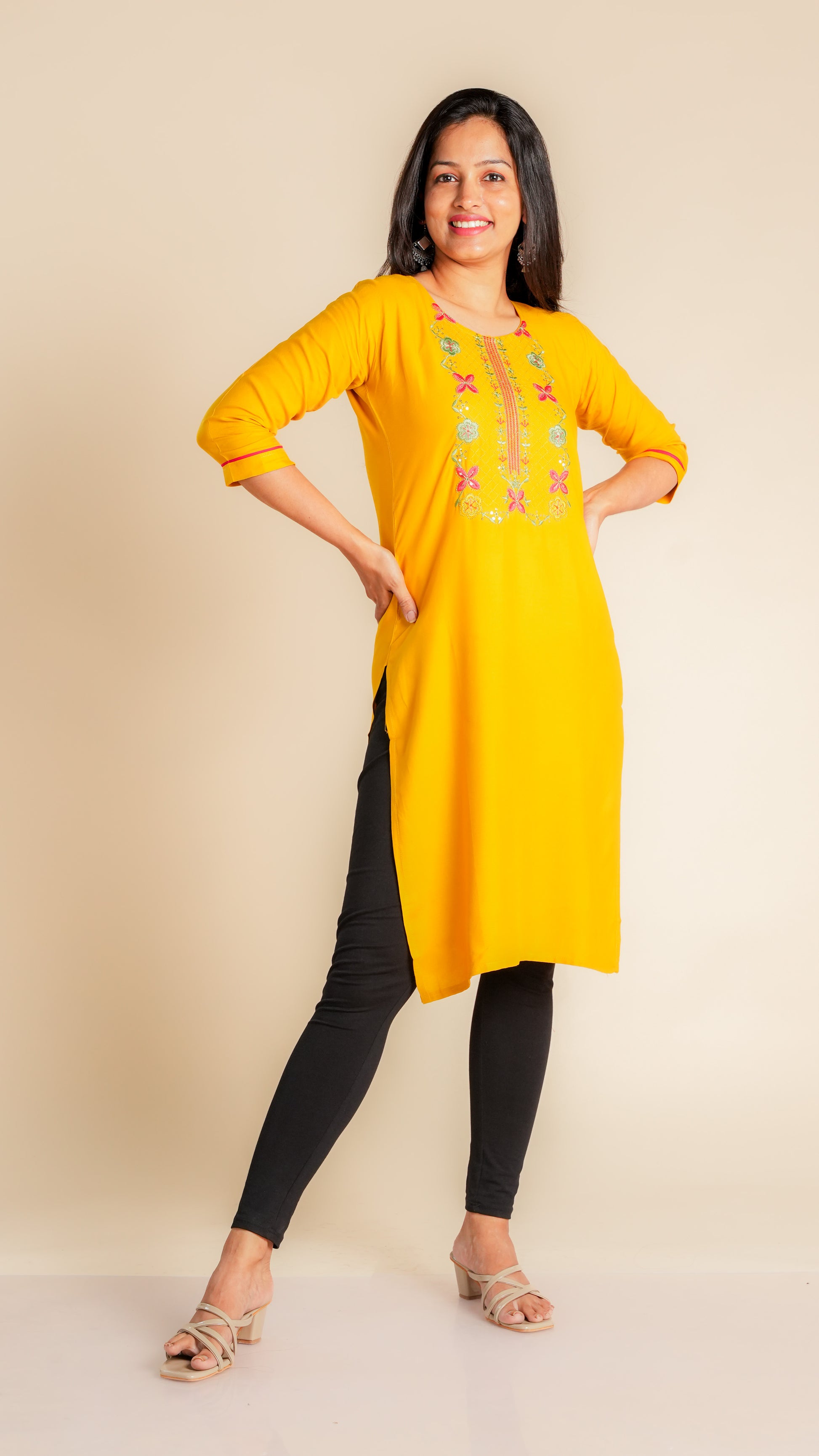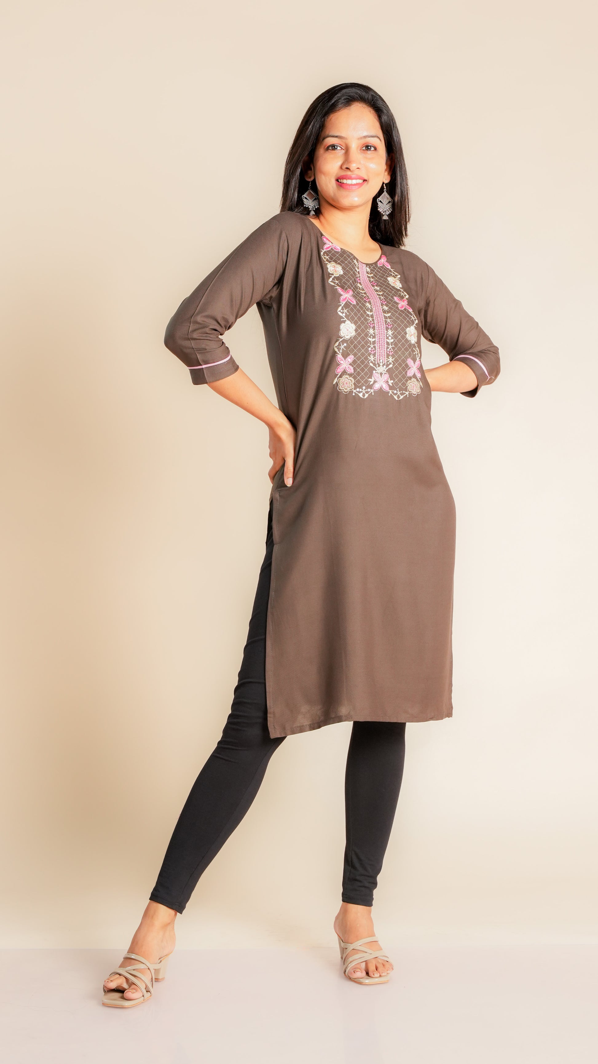 Expertly crafted from soft rayon, this kurti features elegant neck embroidery. Enjoy the comfort and luxury of rayon while making a stylish statement with the delicate detail at the neckline. Perfect for any occasion, it's a must-have in every wardrobe.