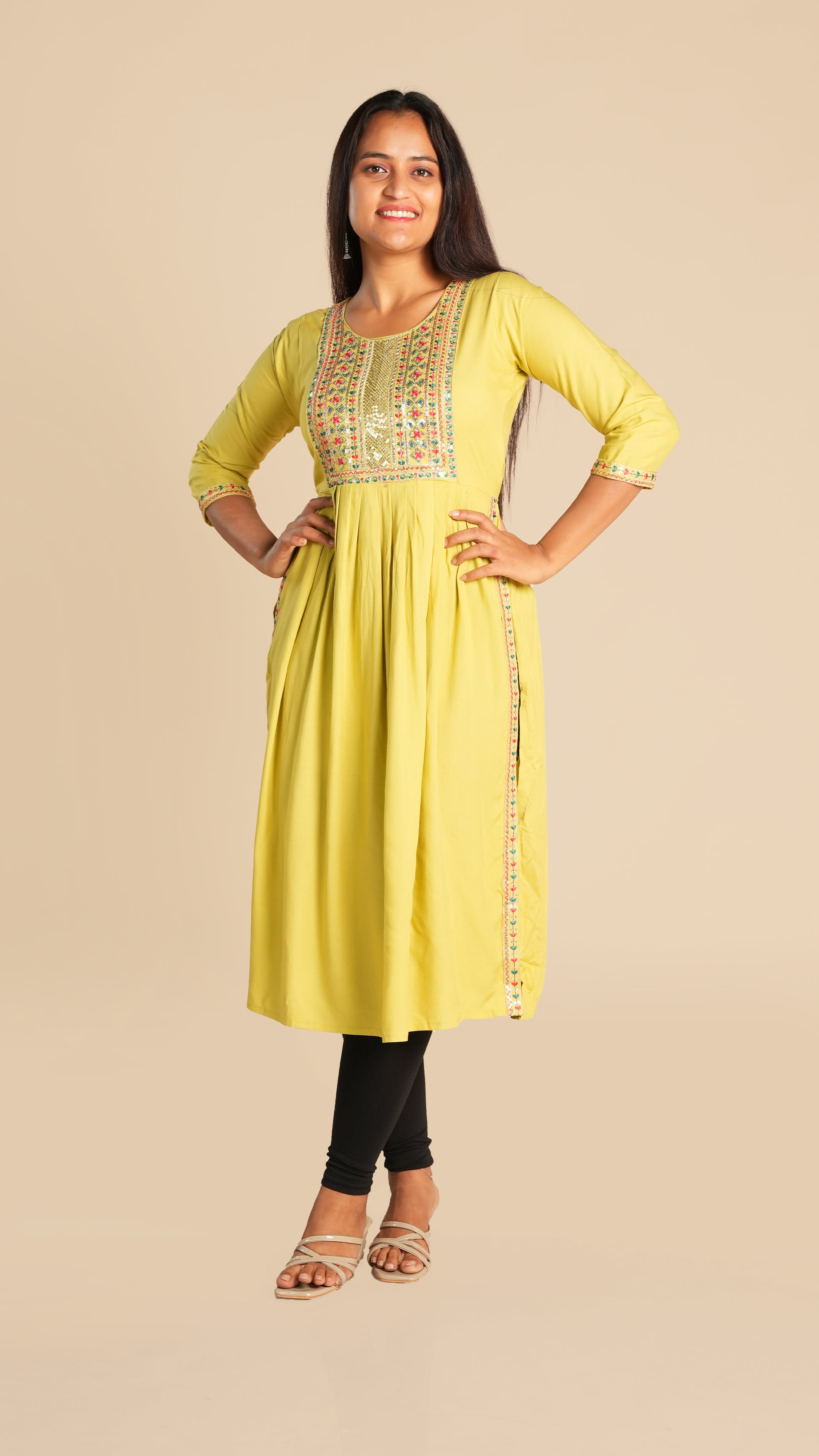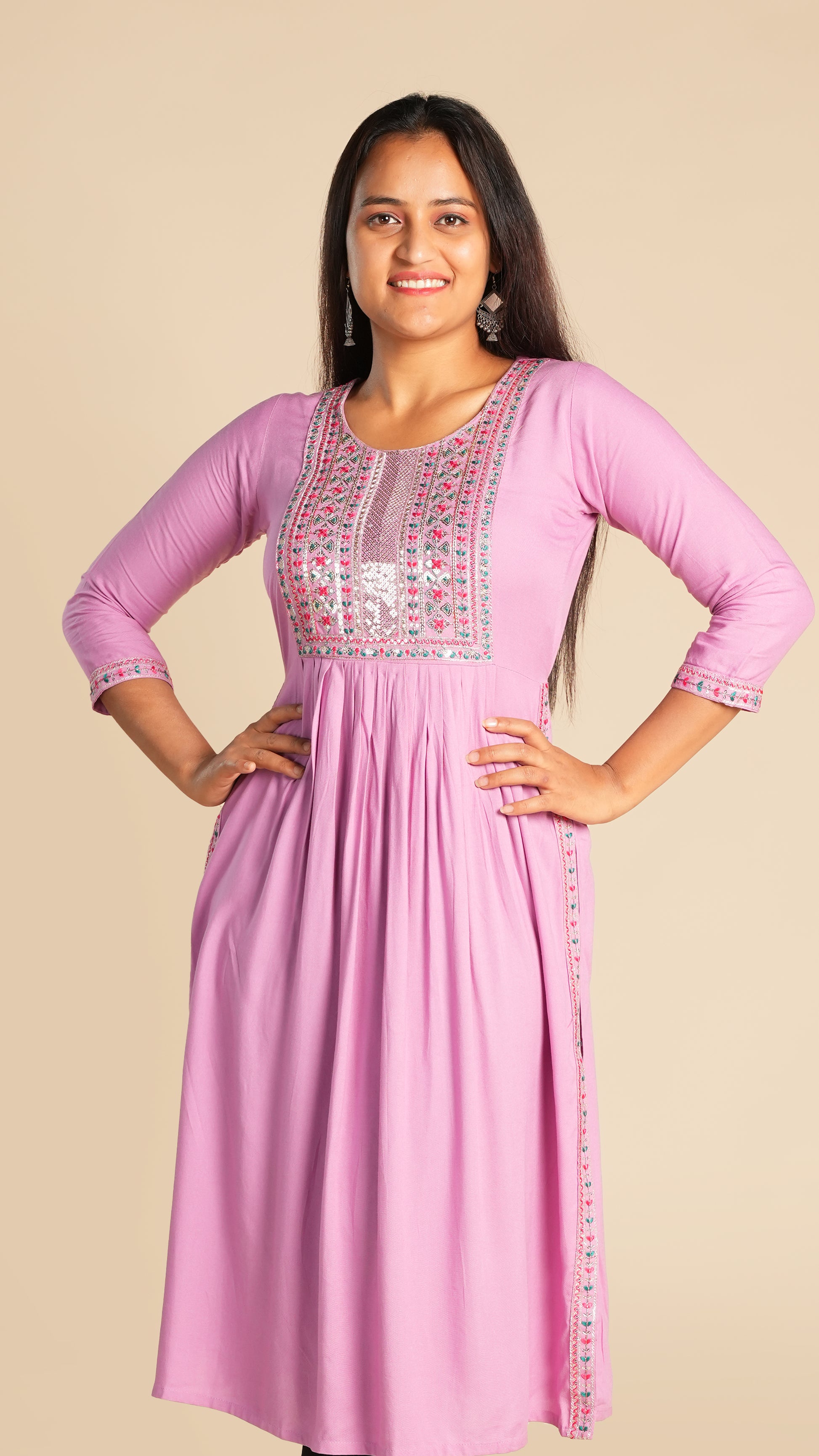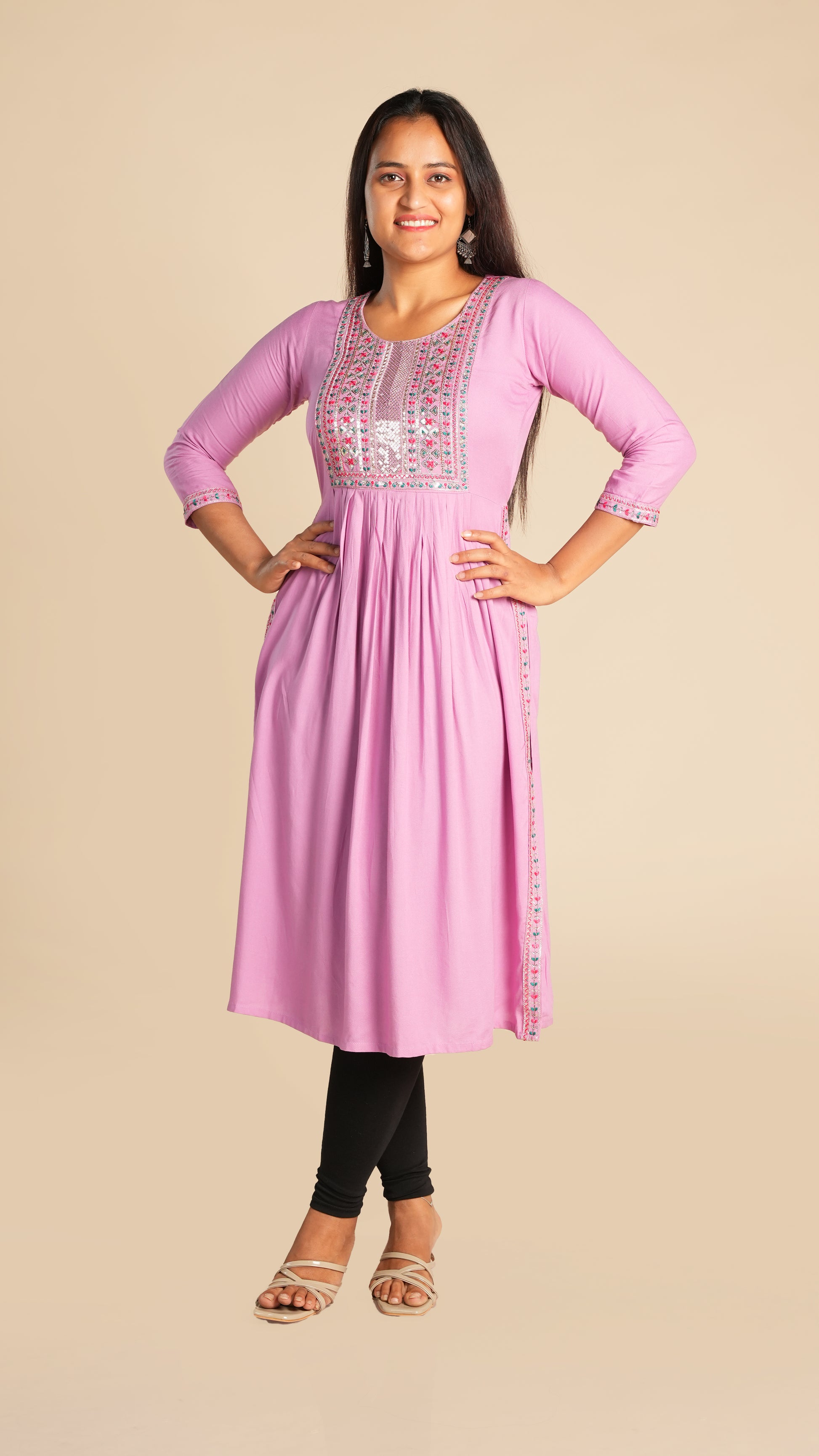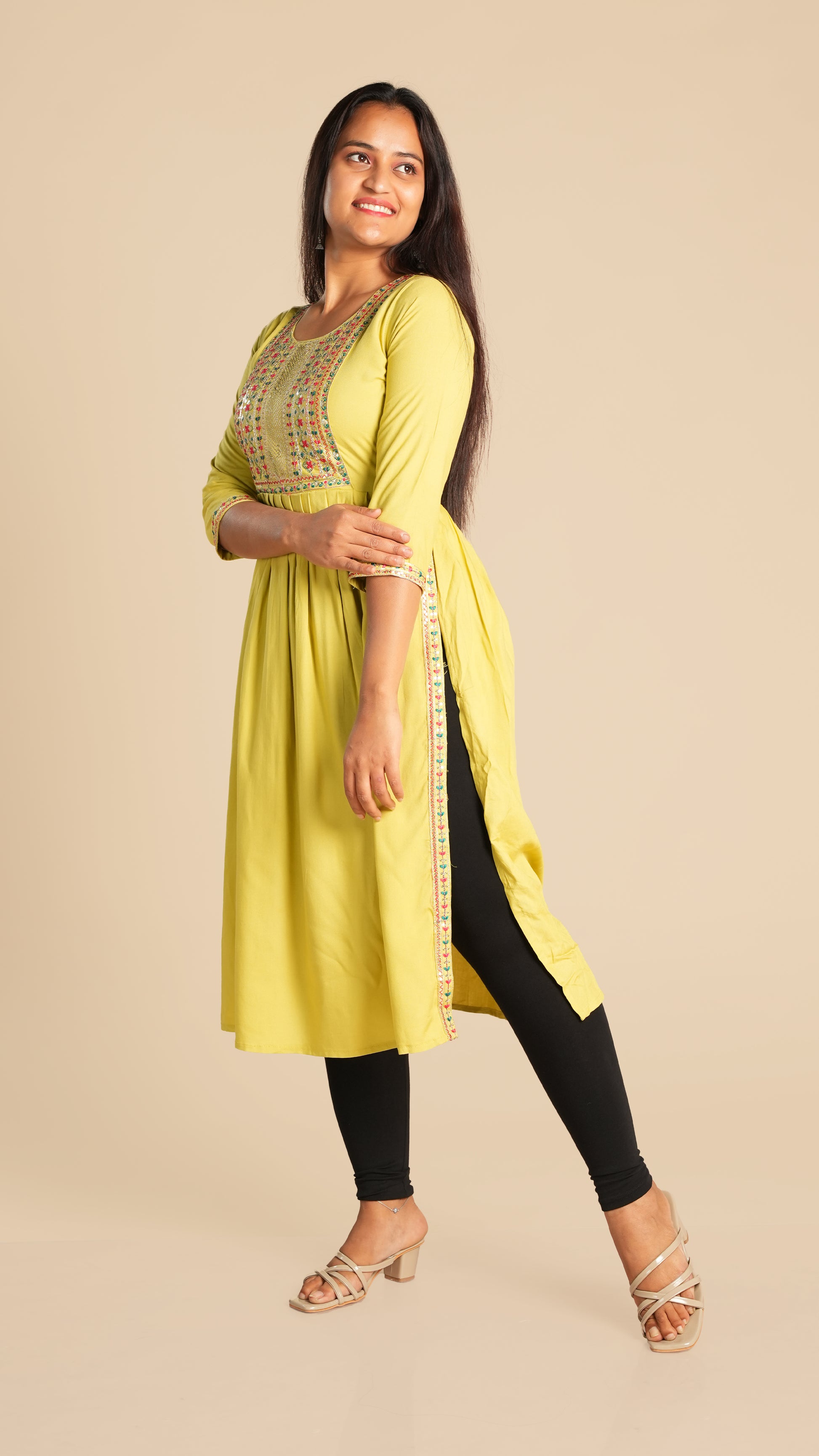 Rayon Nyra Cut Kurti with Sequins and Embroidery Neck Design