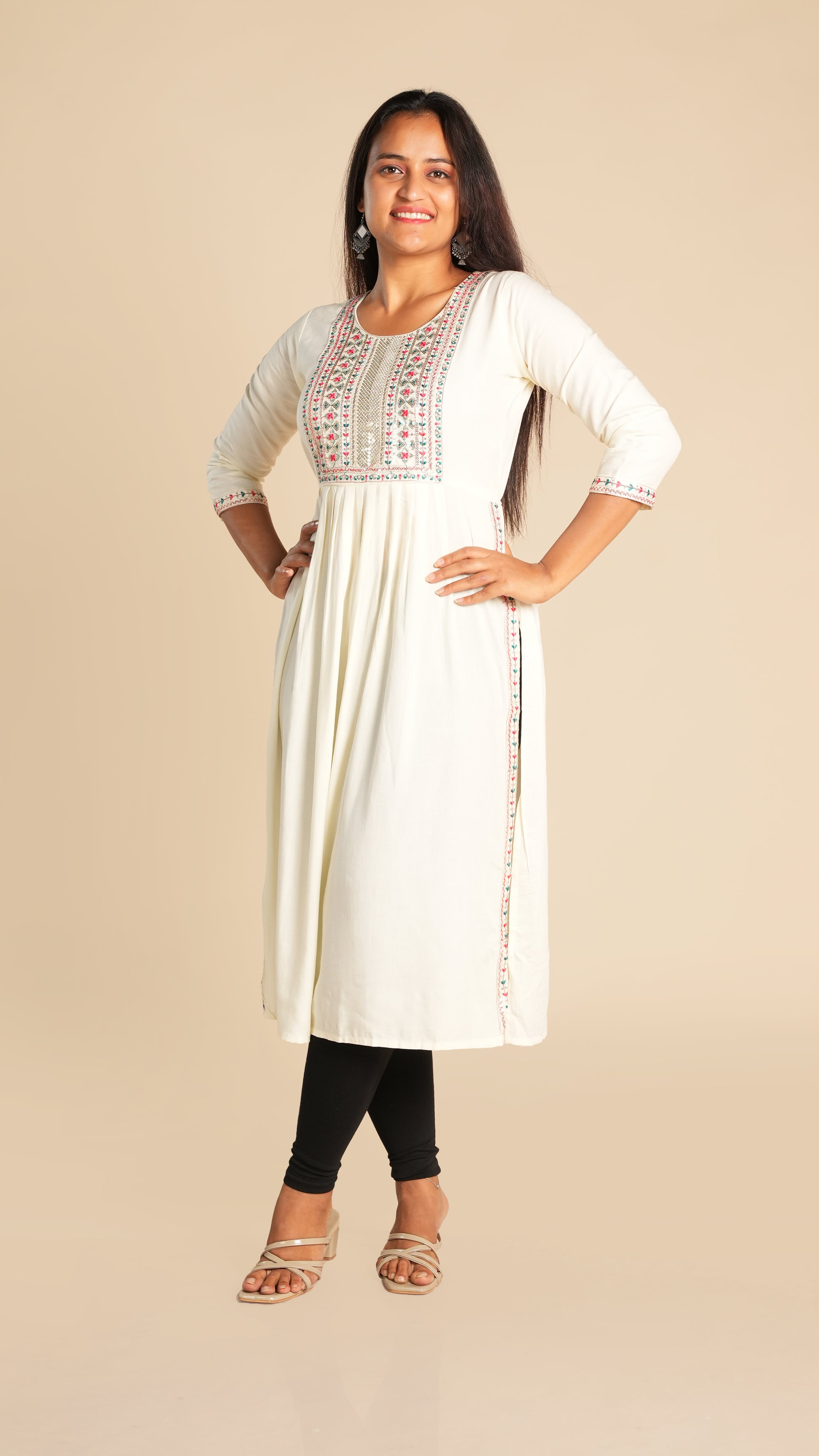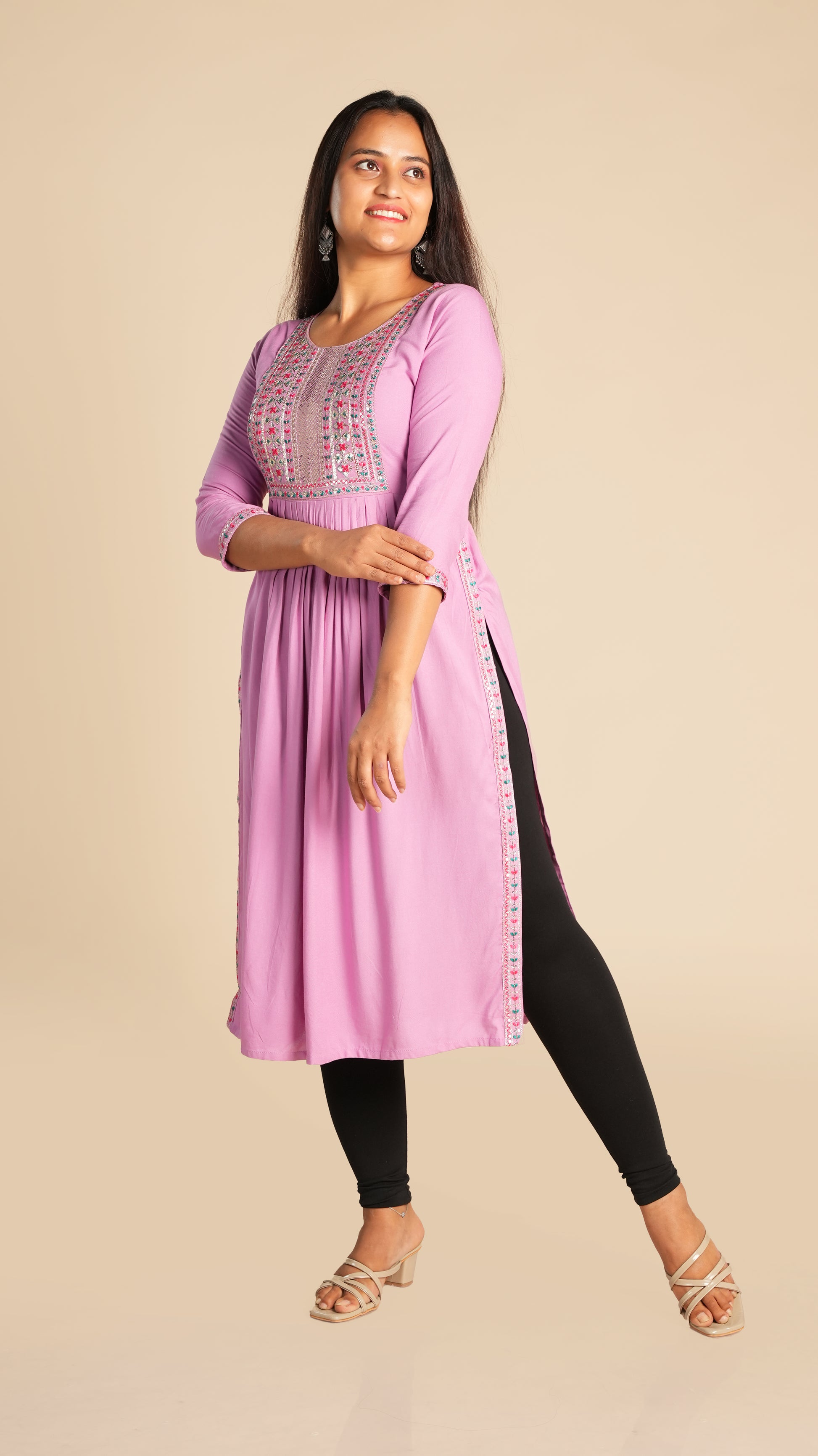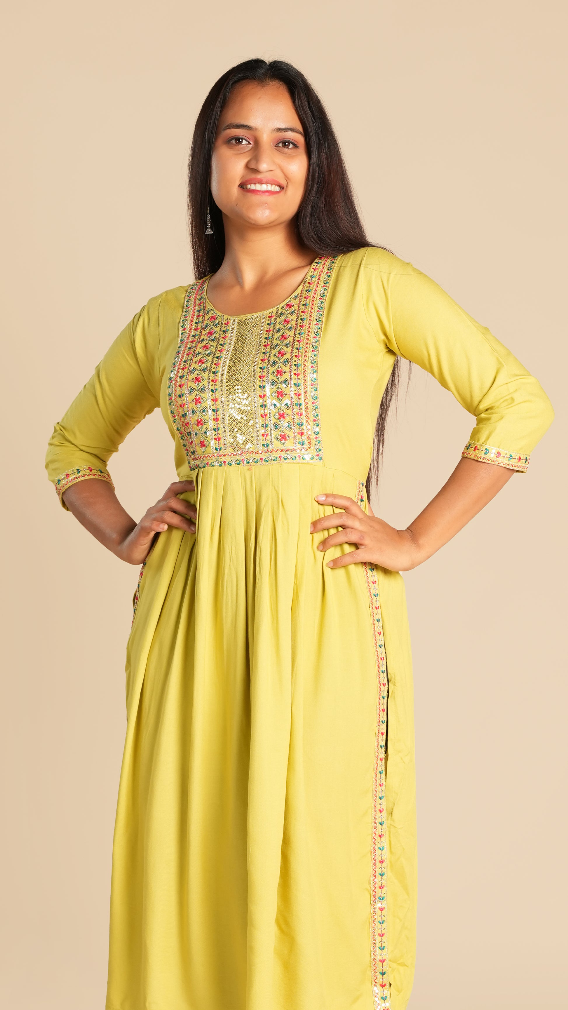 Rayon Nyra Cut Kurti with Sequins and Embroidery Neck Design