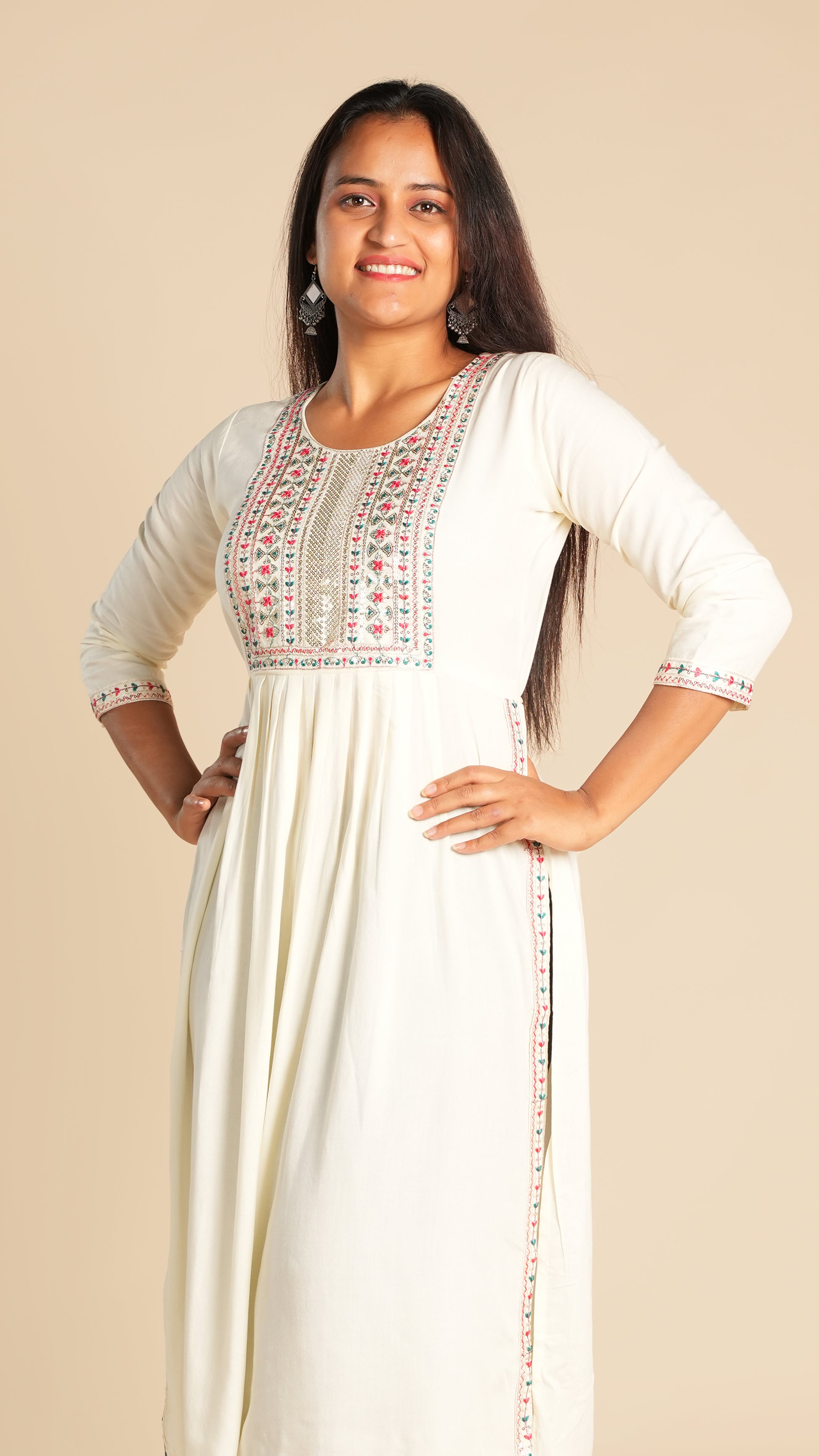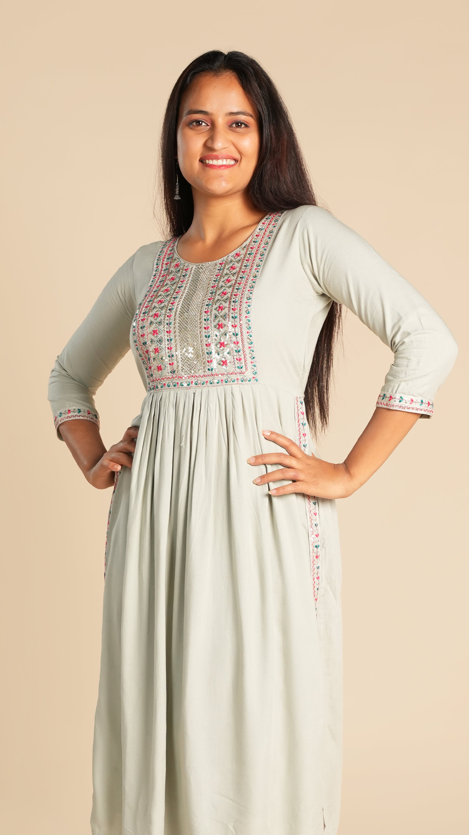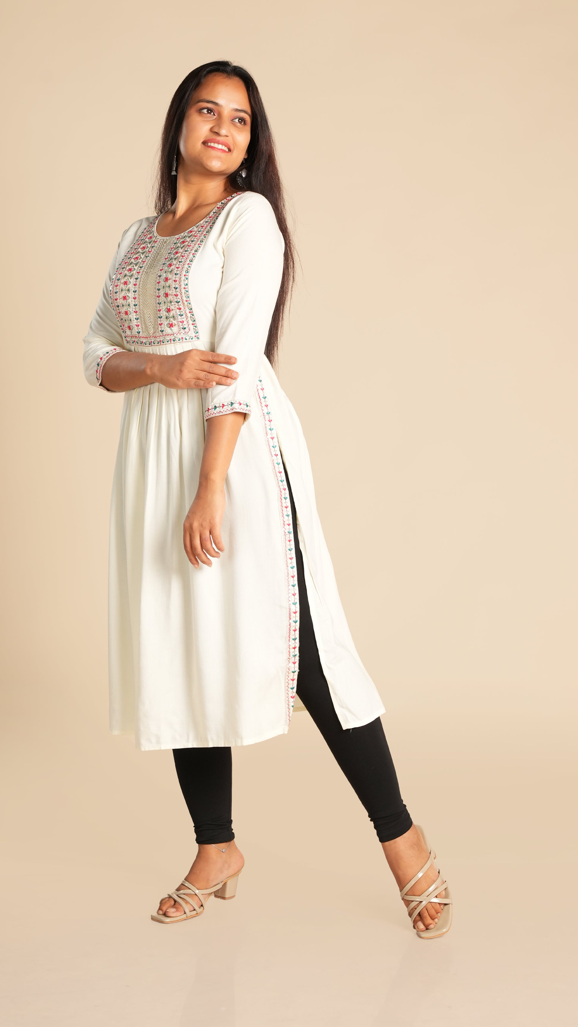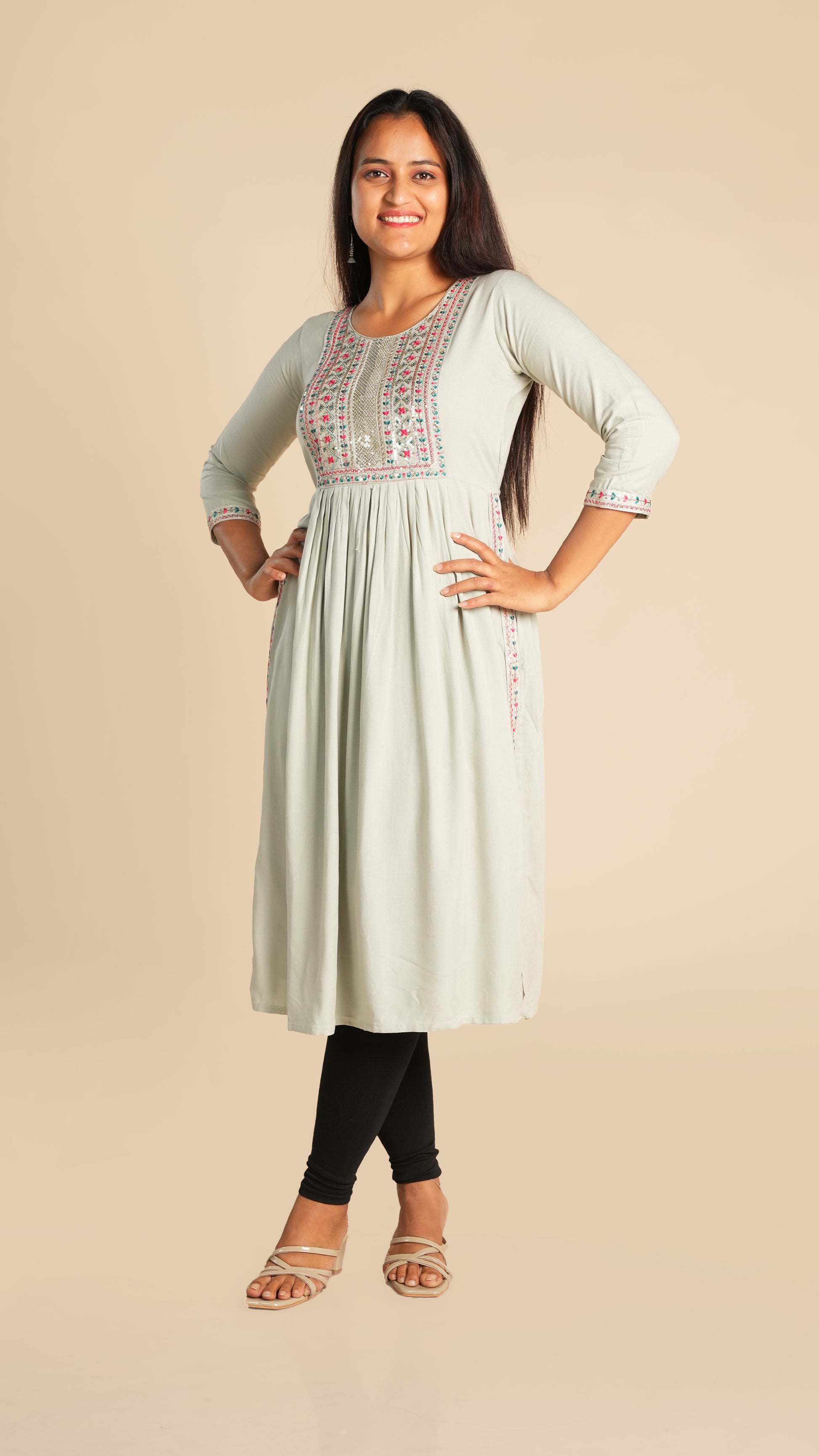 Rayon Nyra Cut Kurti with Sequins and Embroidery Neck Design