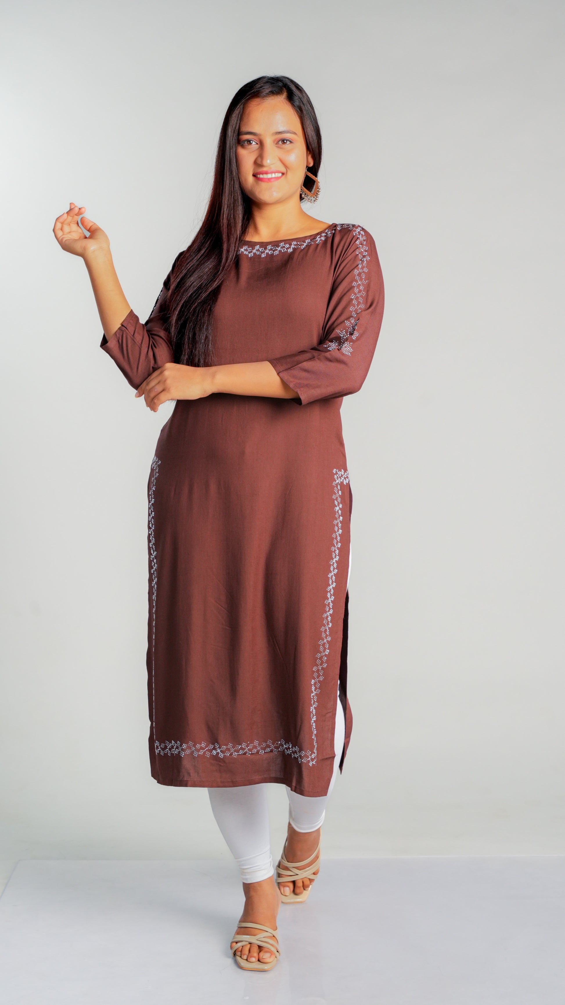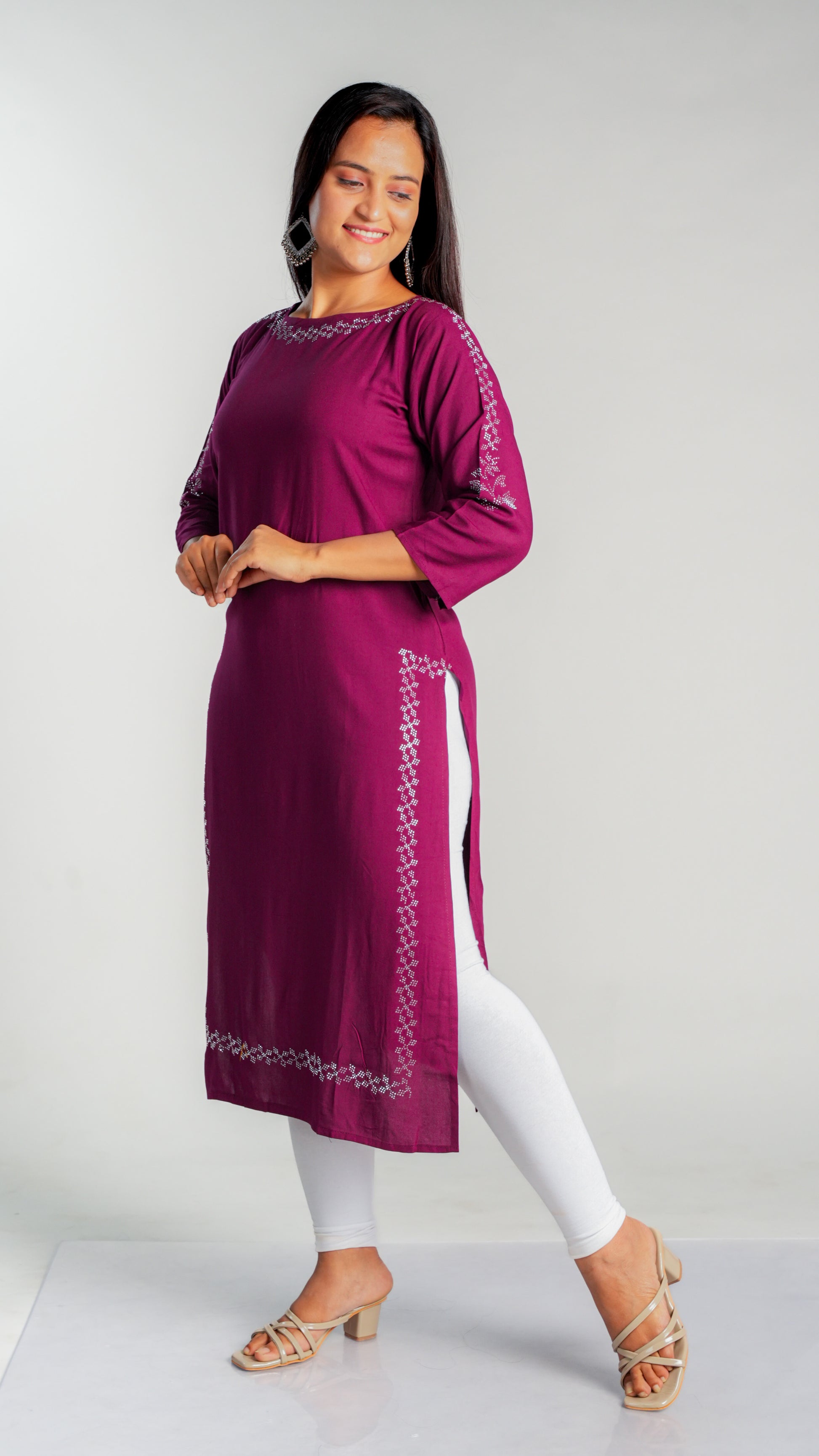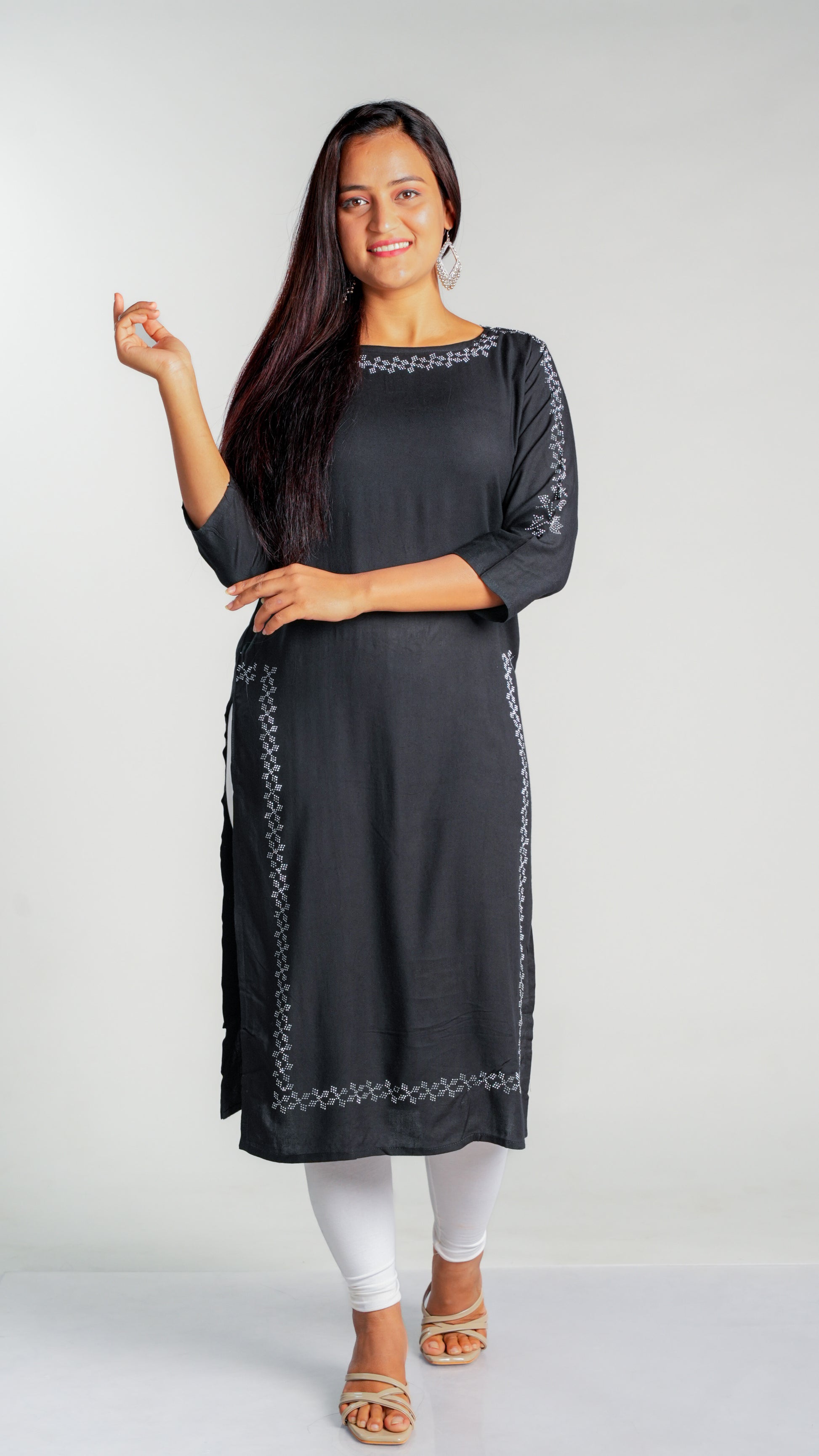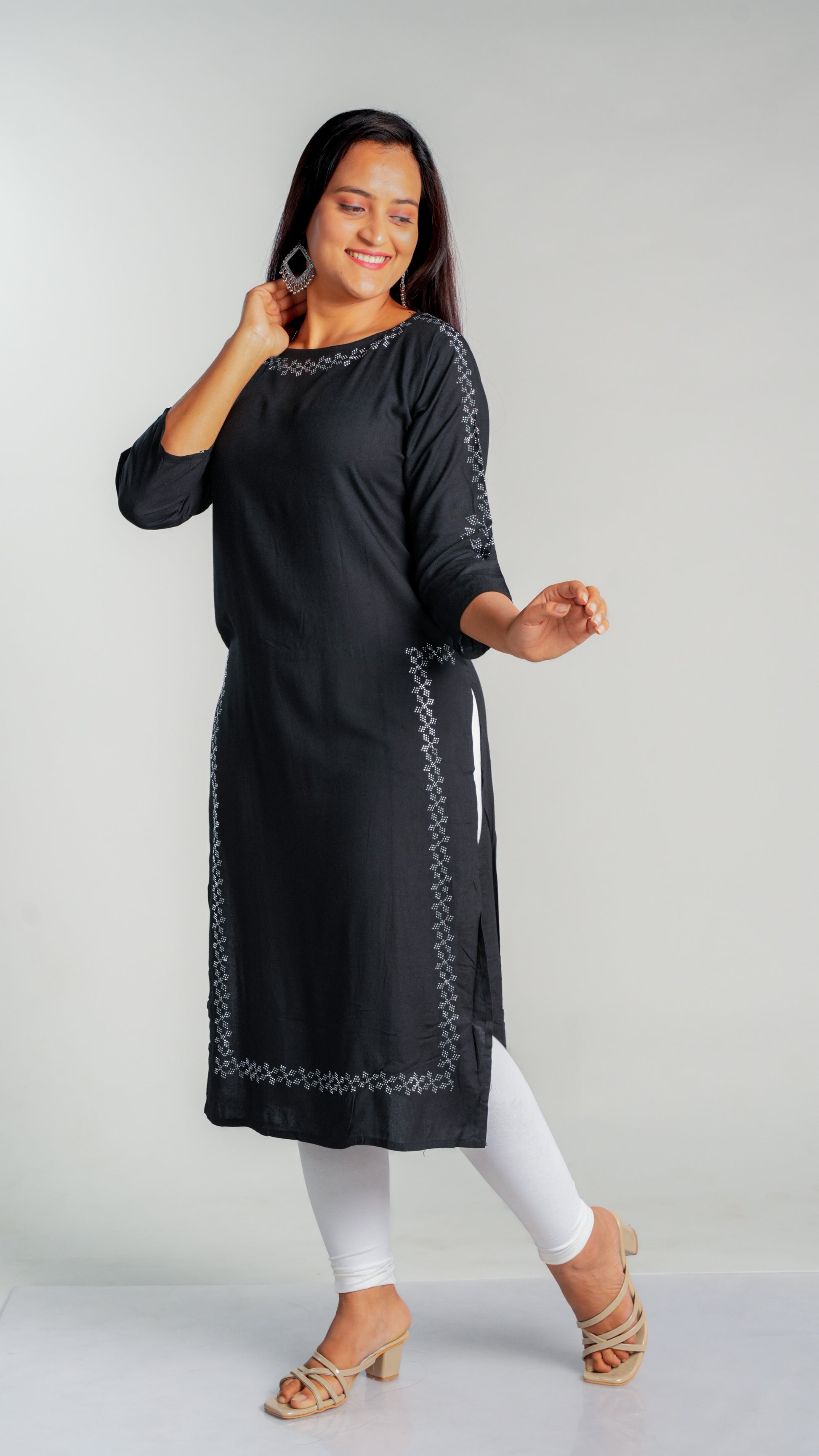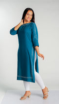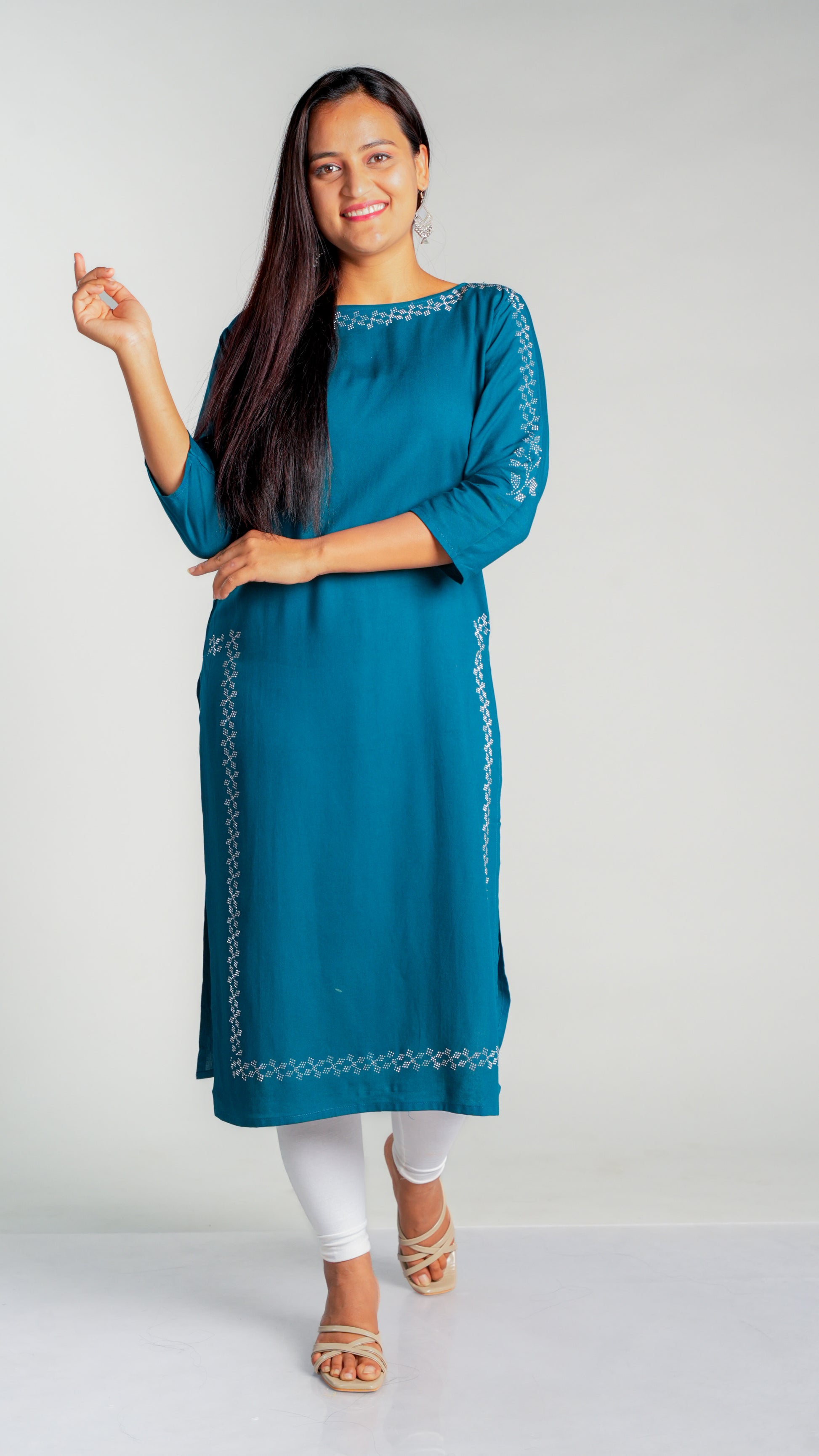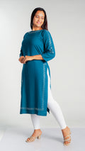 Made with high-quality rayon fabric, this kurti is designed with intricate siroski work that adds a touch of elegance to any wardrobe. The lightweight and breathable material ensures comfort throughout the day, making it perfect for work or special occasions. Upgrade your style with this stunning kurti.