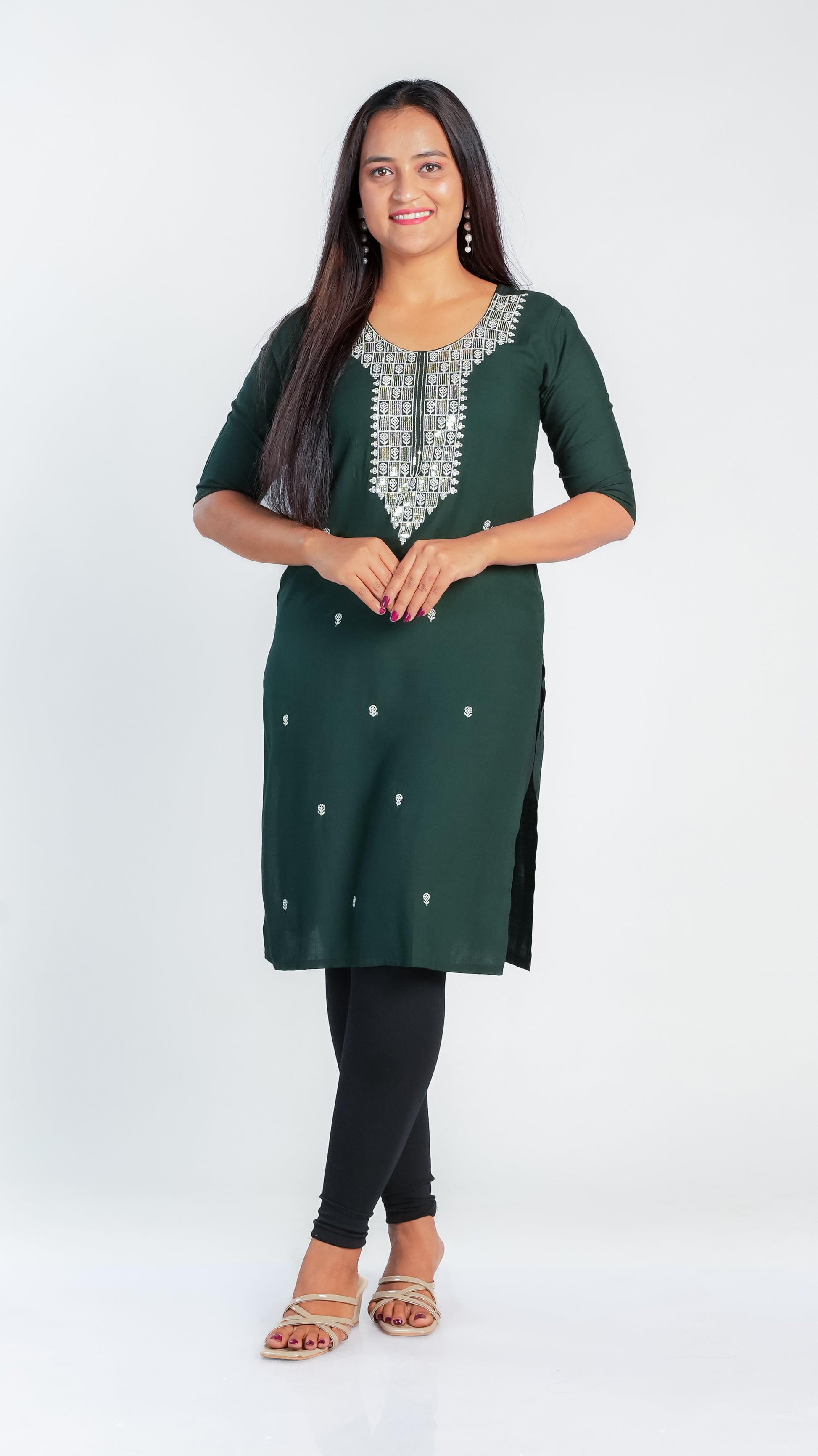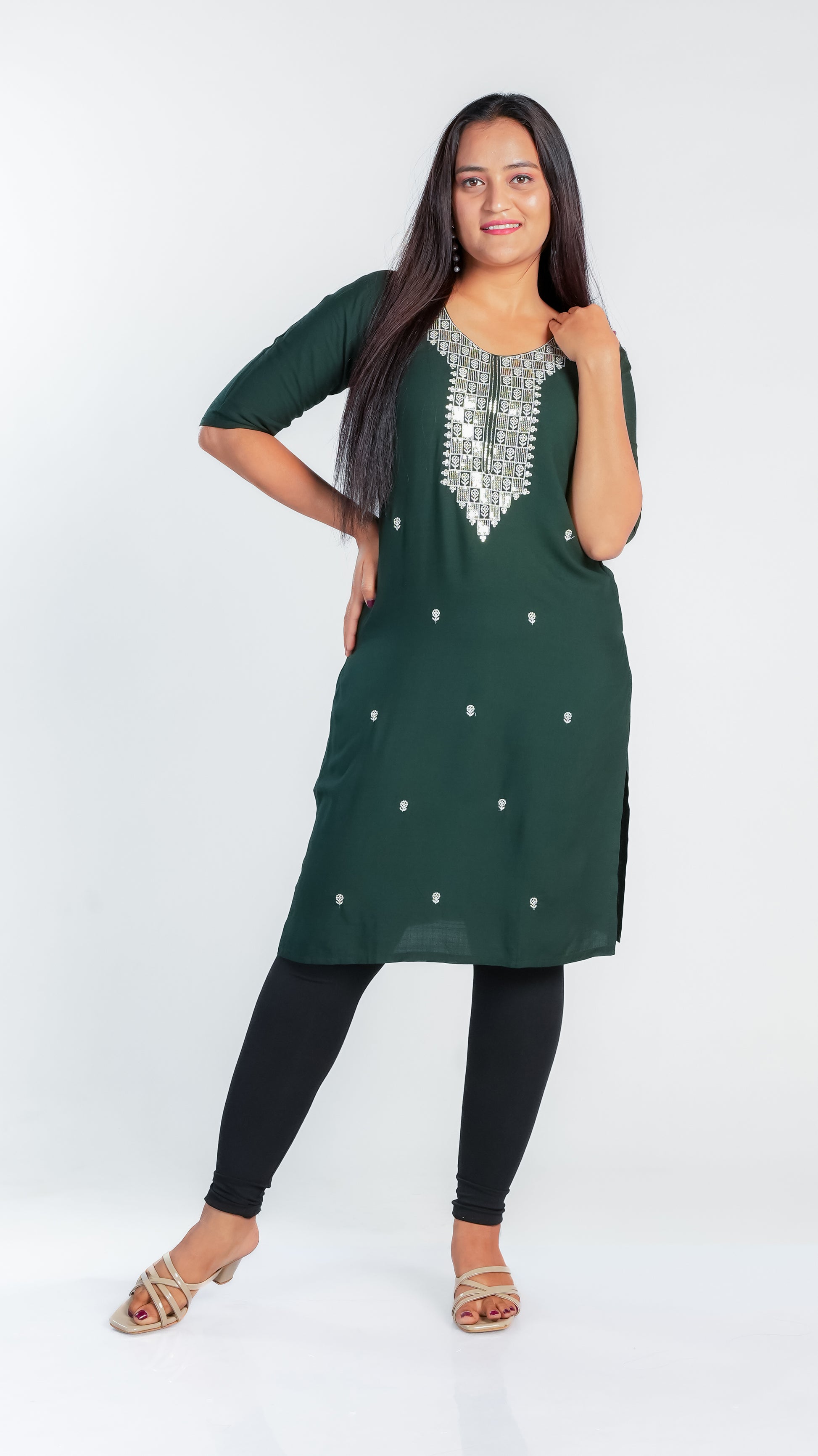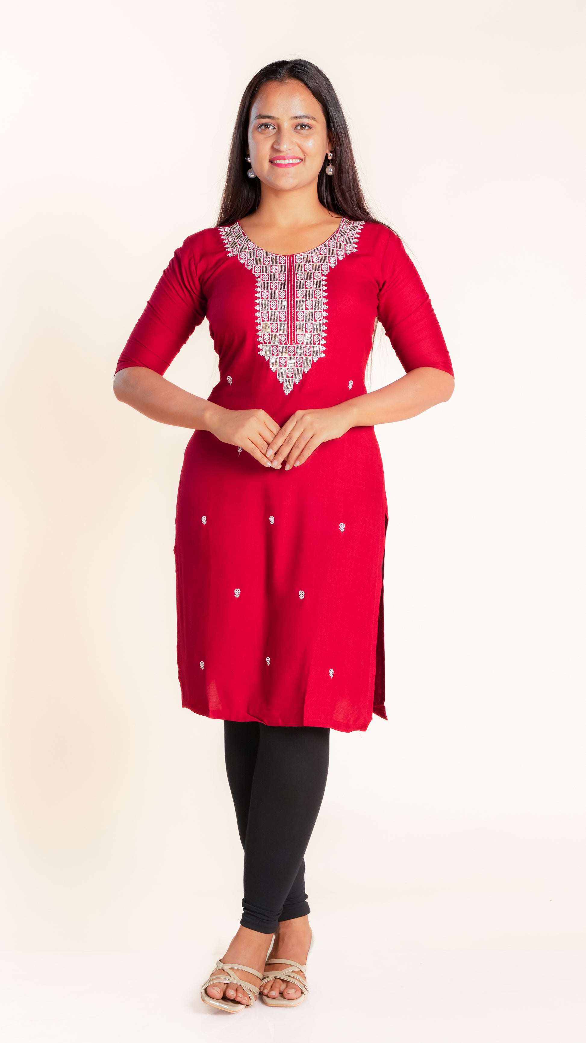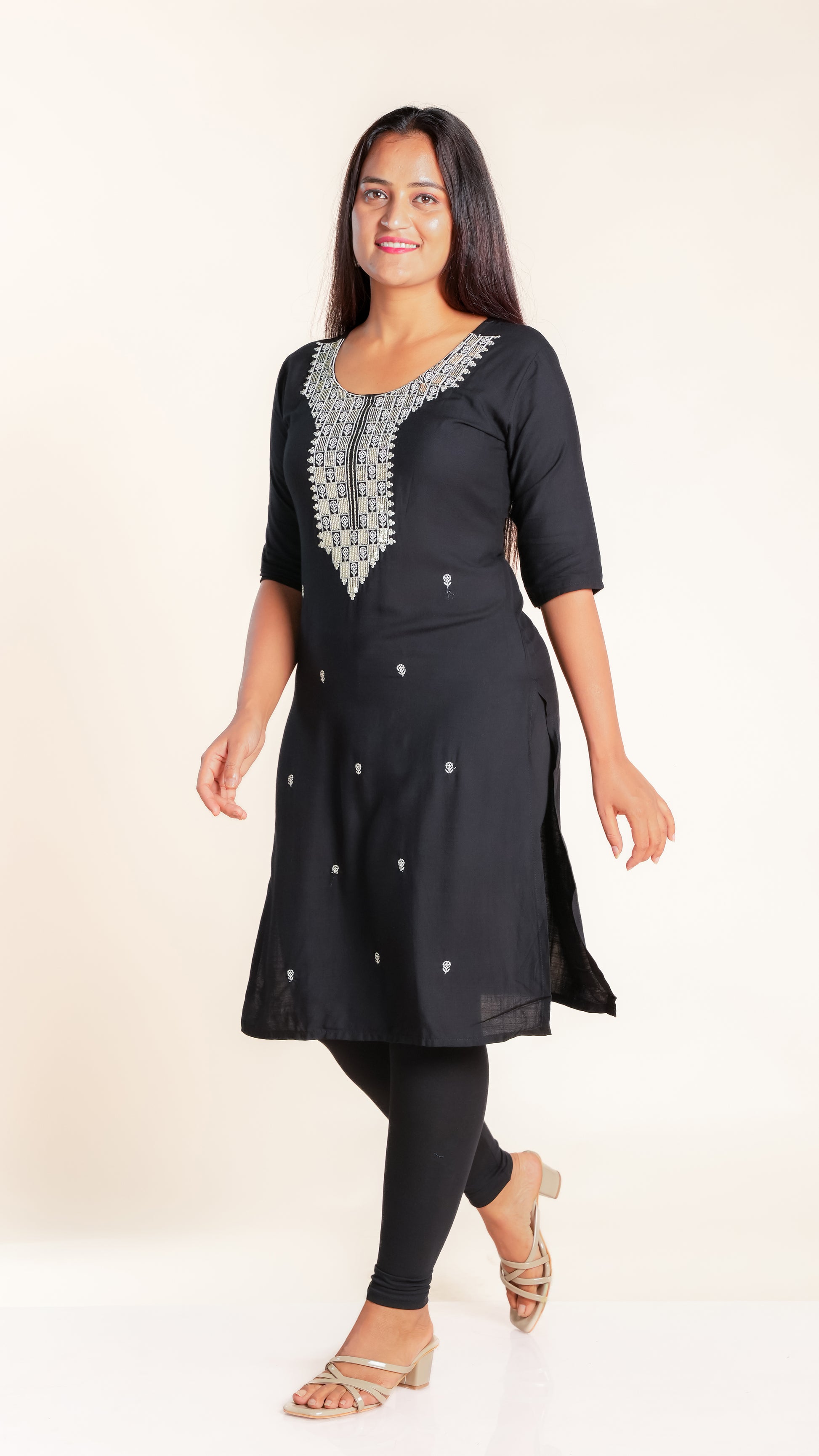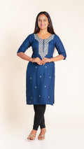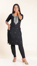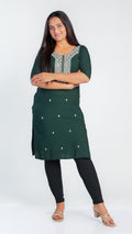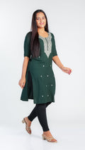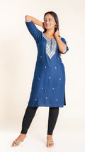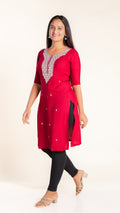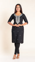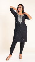 This elegant kurti features a beautifully crafted design on the neckline, adding a subtle yet sophisticated touch to your outfit. Its slightly shorter length offers a modern silhouette that pairs easily with leggings or palazzos, making it ideal for both casual and semi-formal occasions. Crafted for comfort and style, it is a versatile addition to your wardrobe.