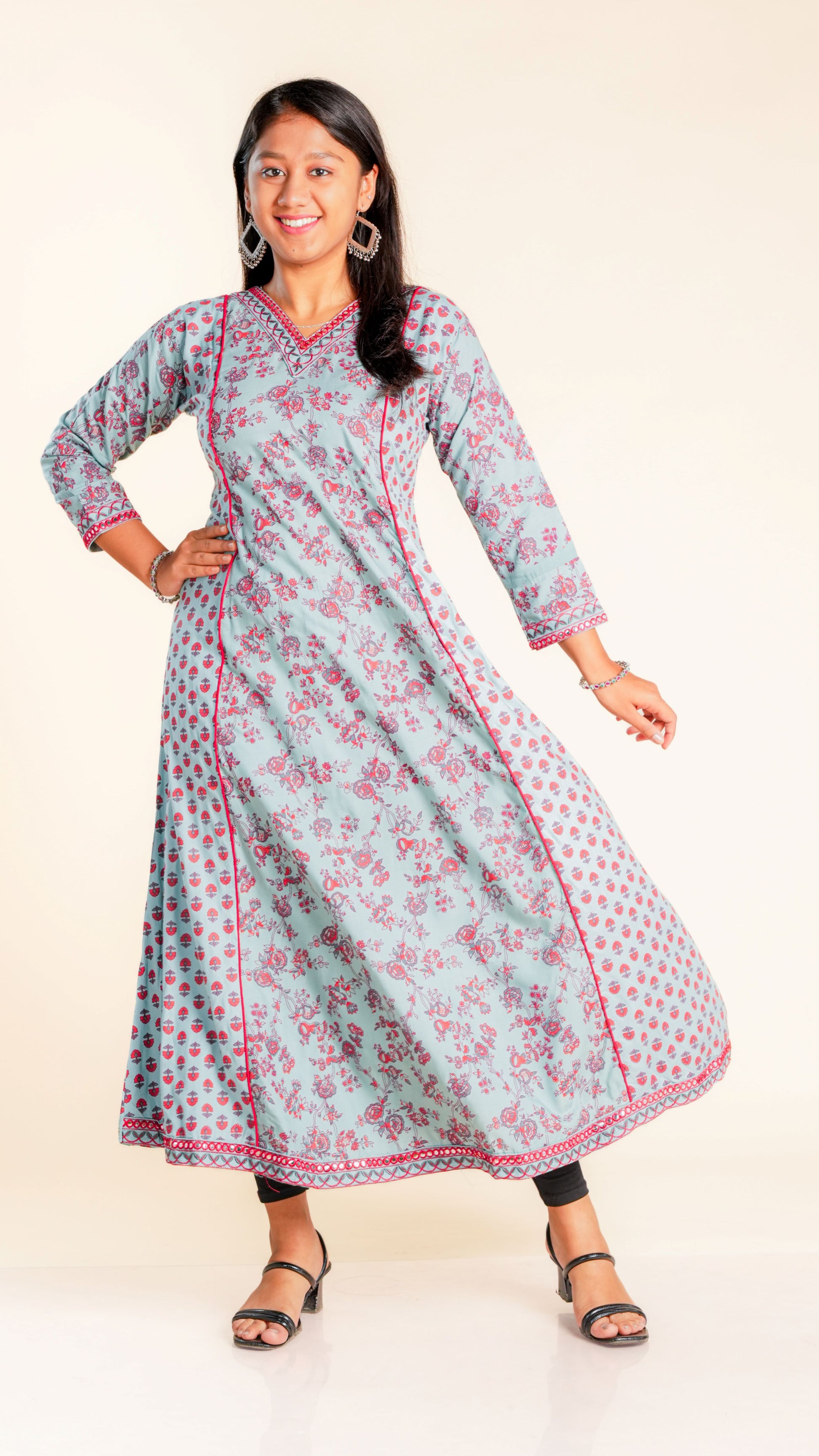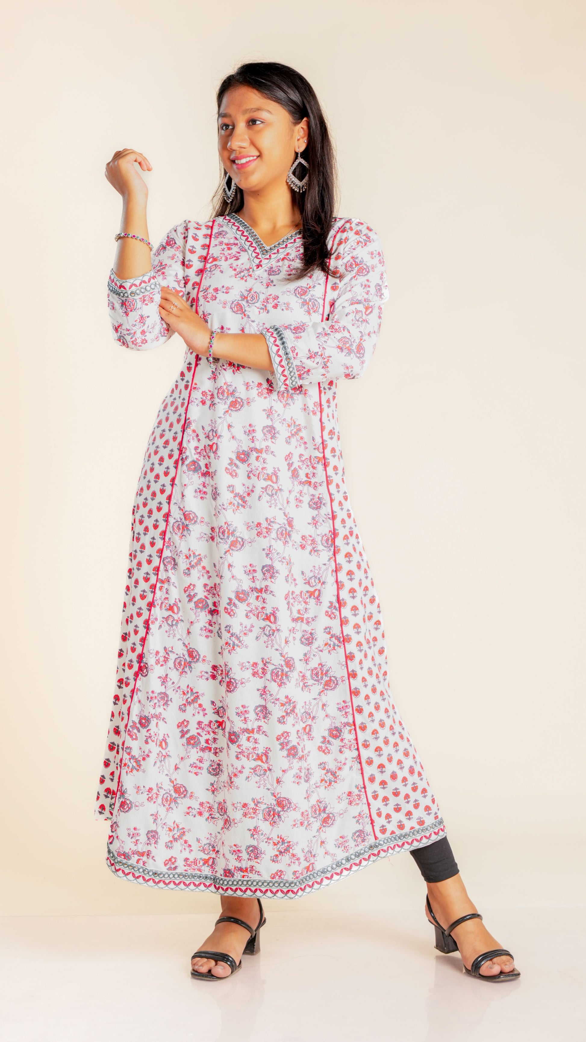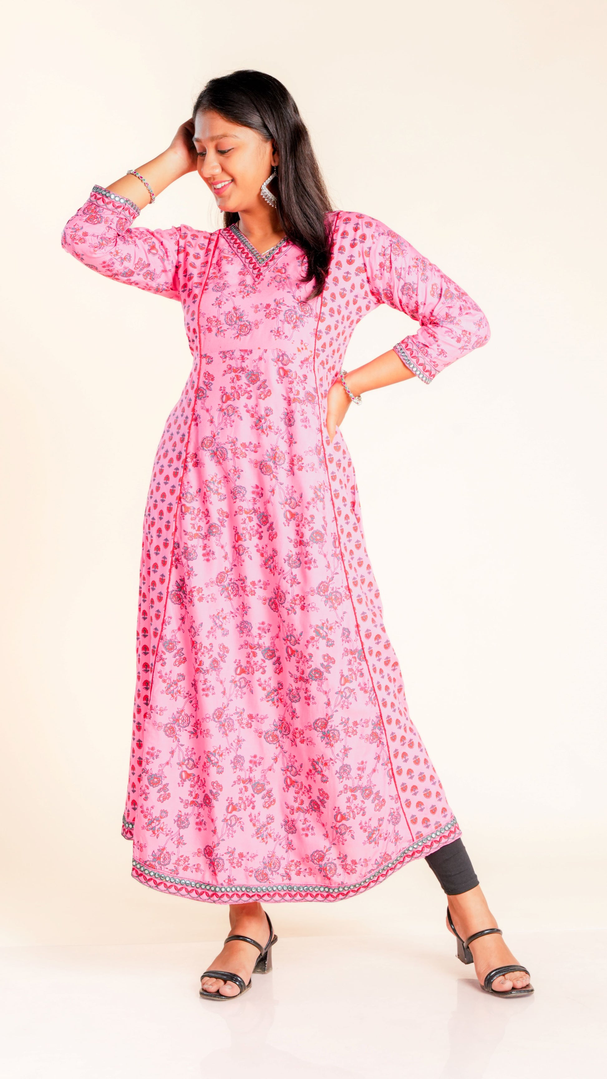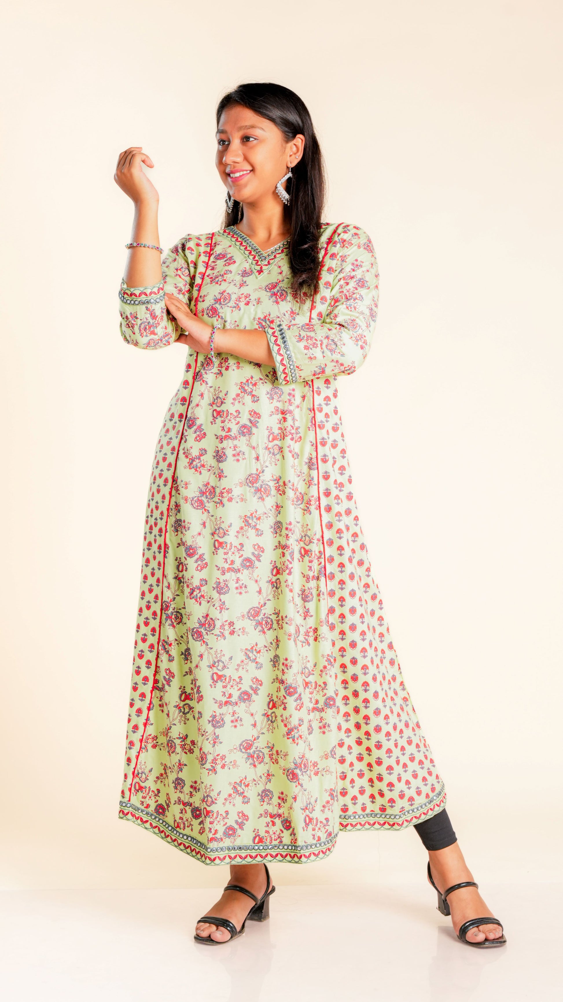 Elevate your style with our Bhoomika Sequined Ghera. The intricate sequined work and vibrant floral print add a touch of elegance to this traditional garment. Ideal for any occasion, this Ghera is sure to make you stand out in the crowd.