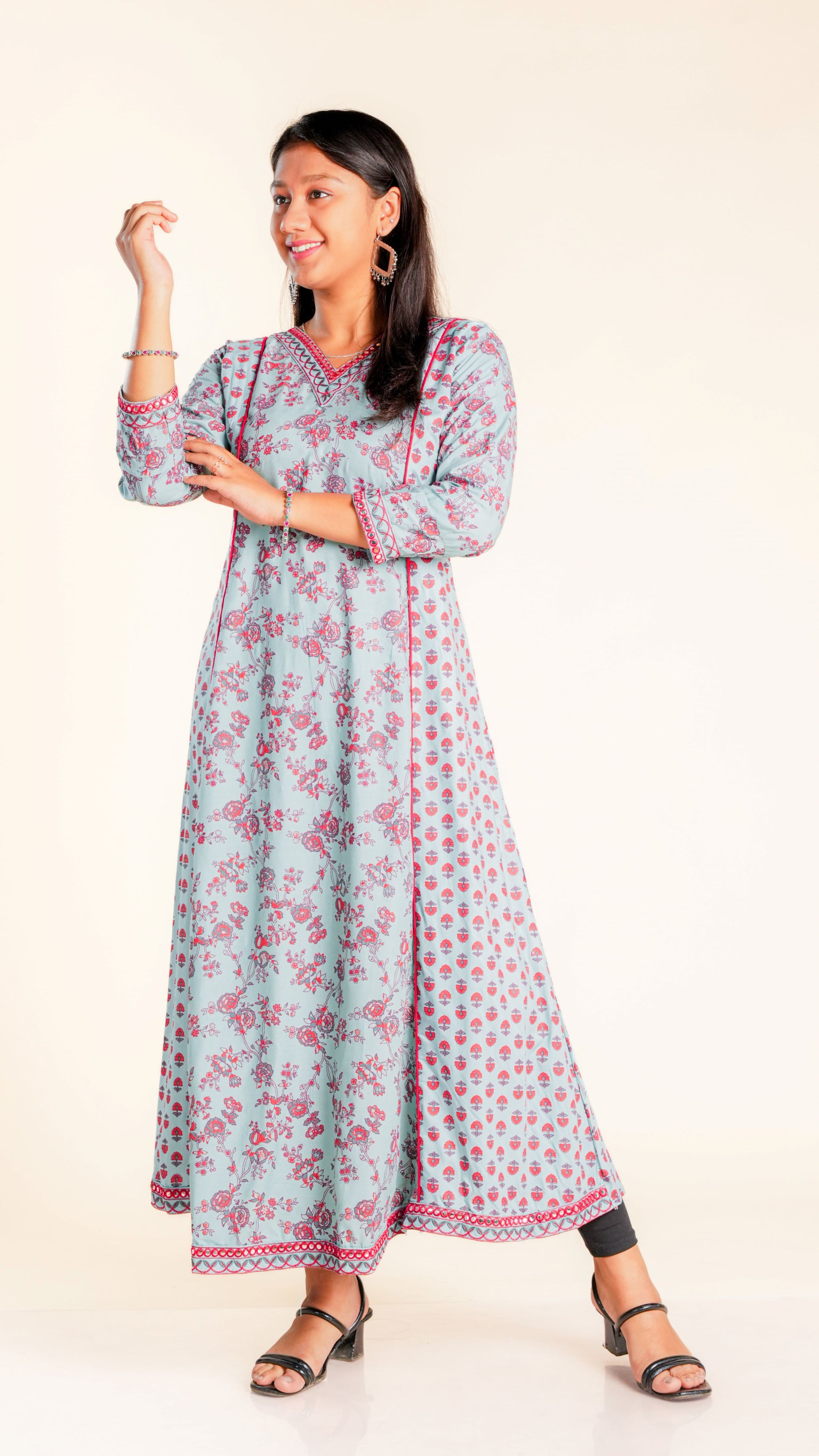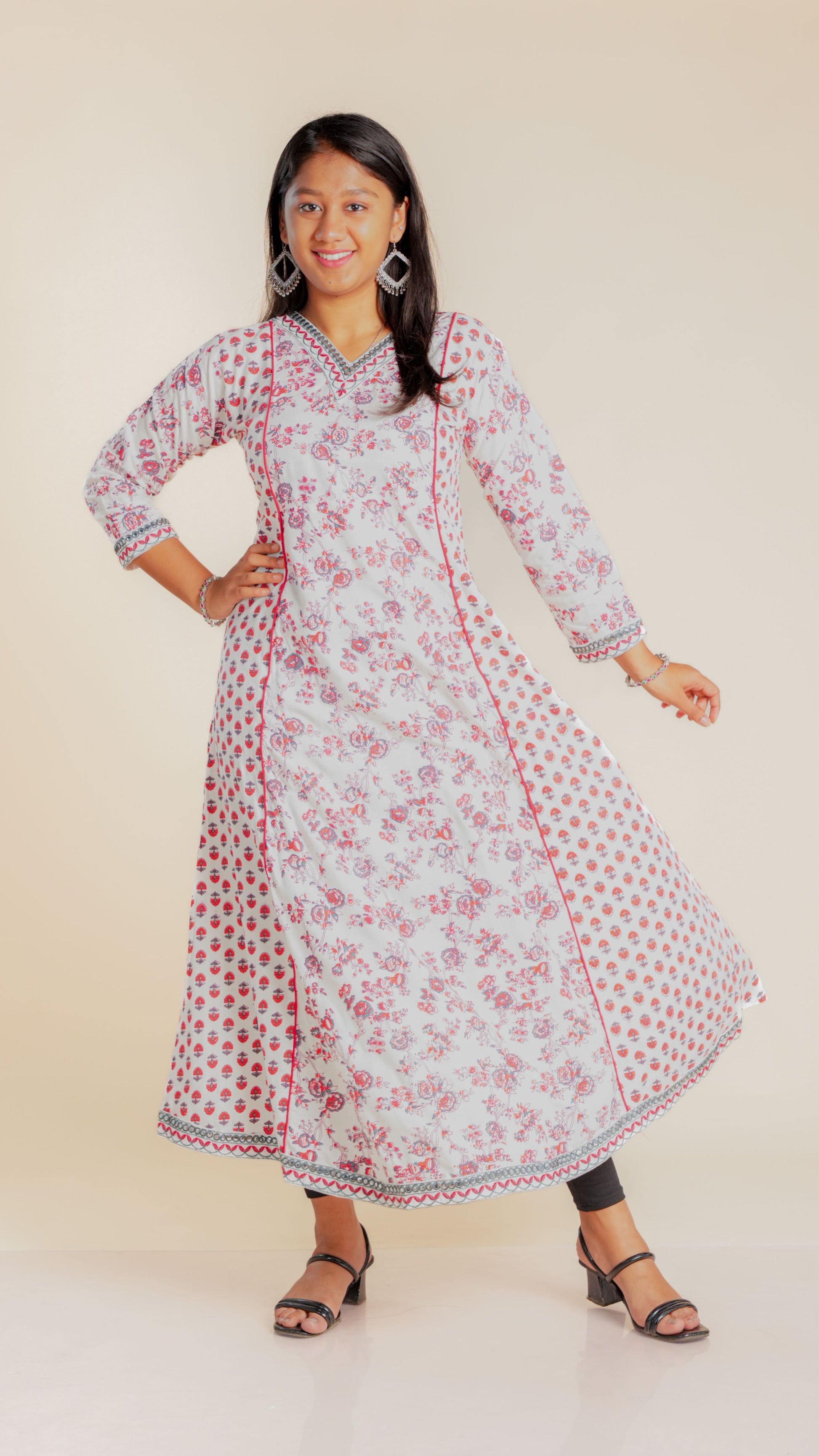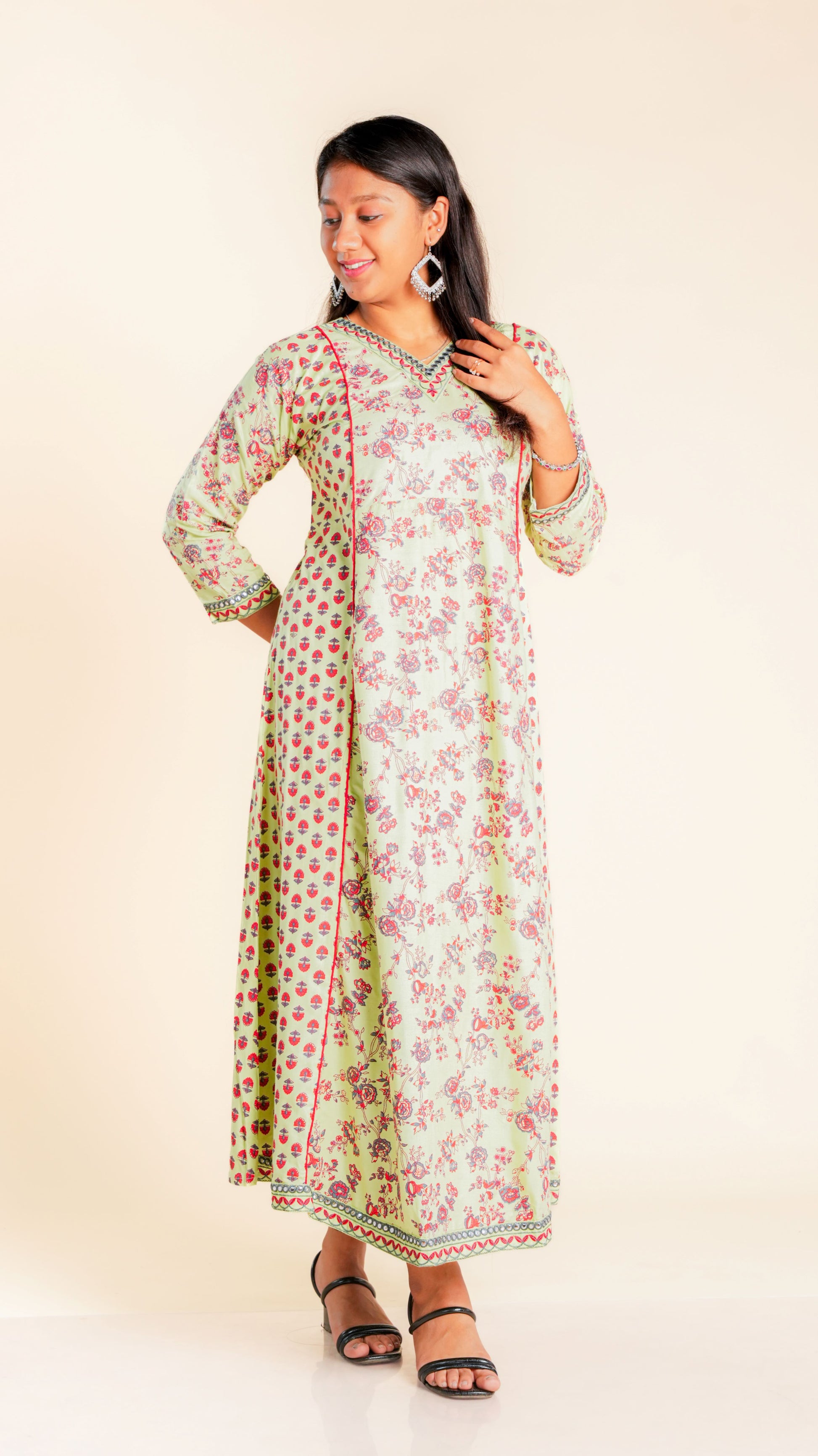 Elevate your style with our Bhoomika Sequined Ghera. The intricate sequined work and vibrant floral print add a touch of elegance to this traditional garment. Ideal for any occasion, this Ghera is sure to make you stand out in the crowd.