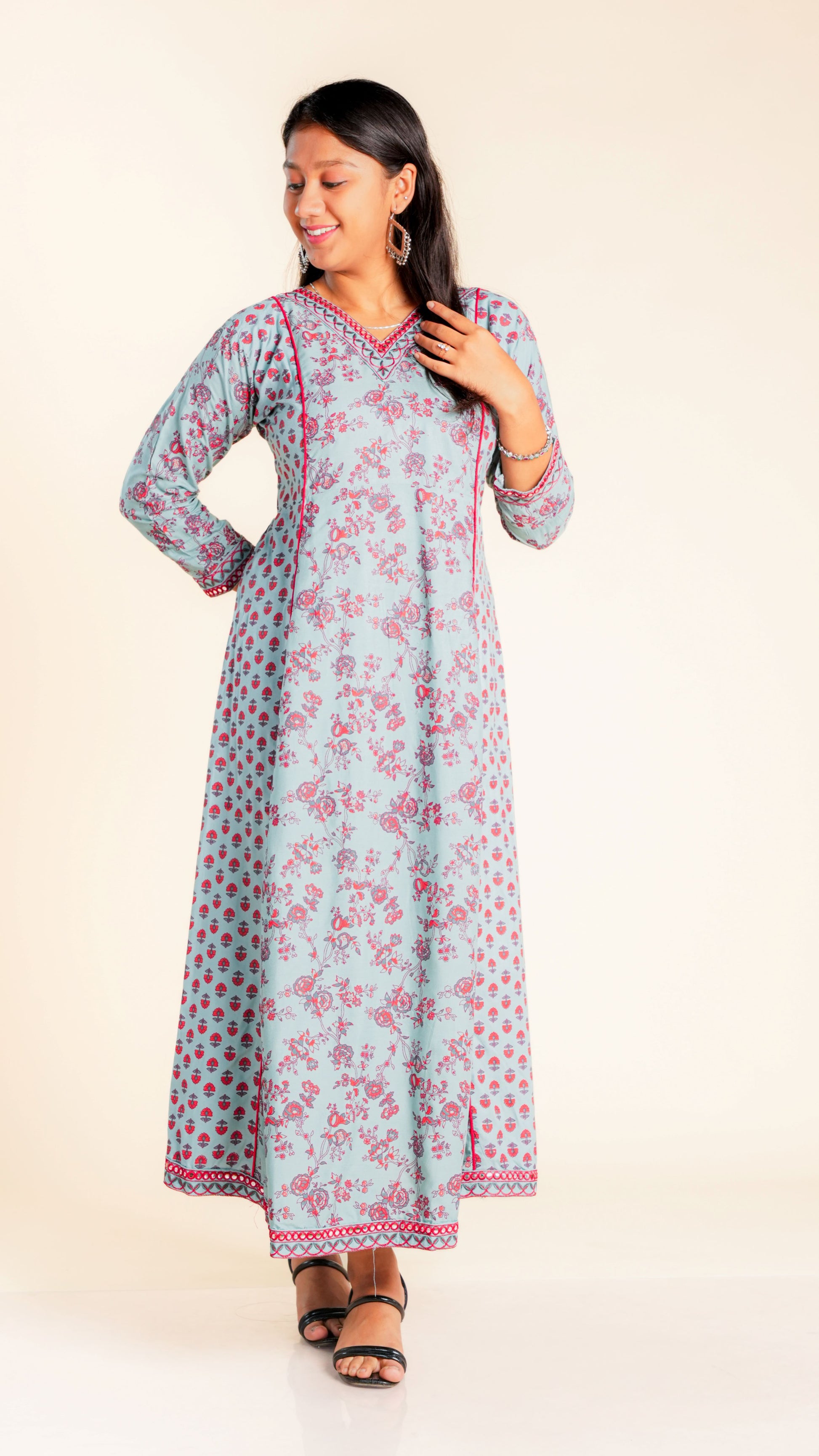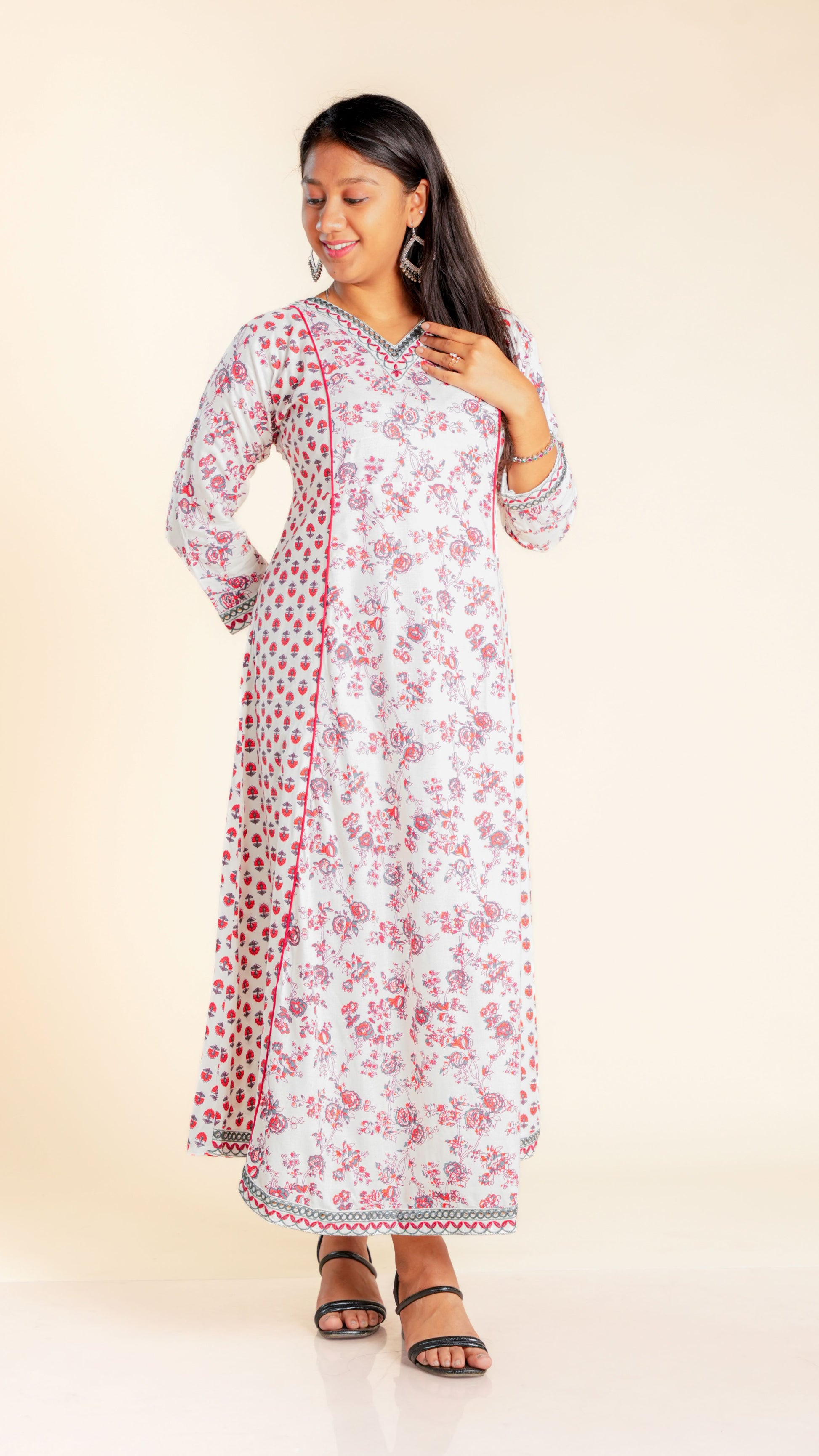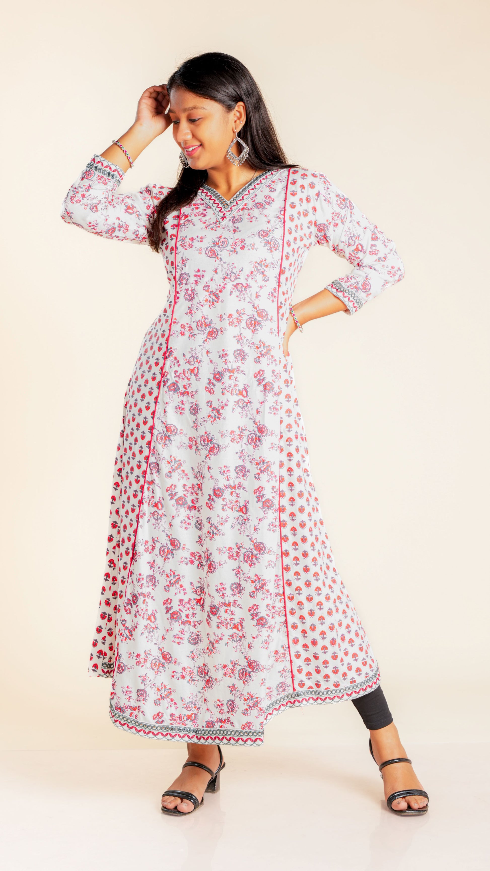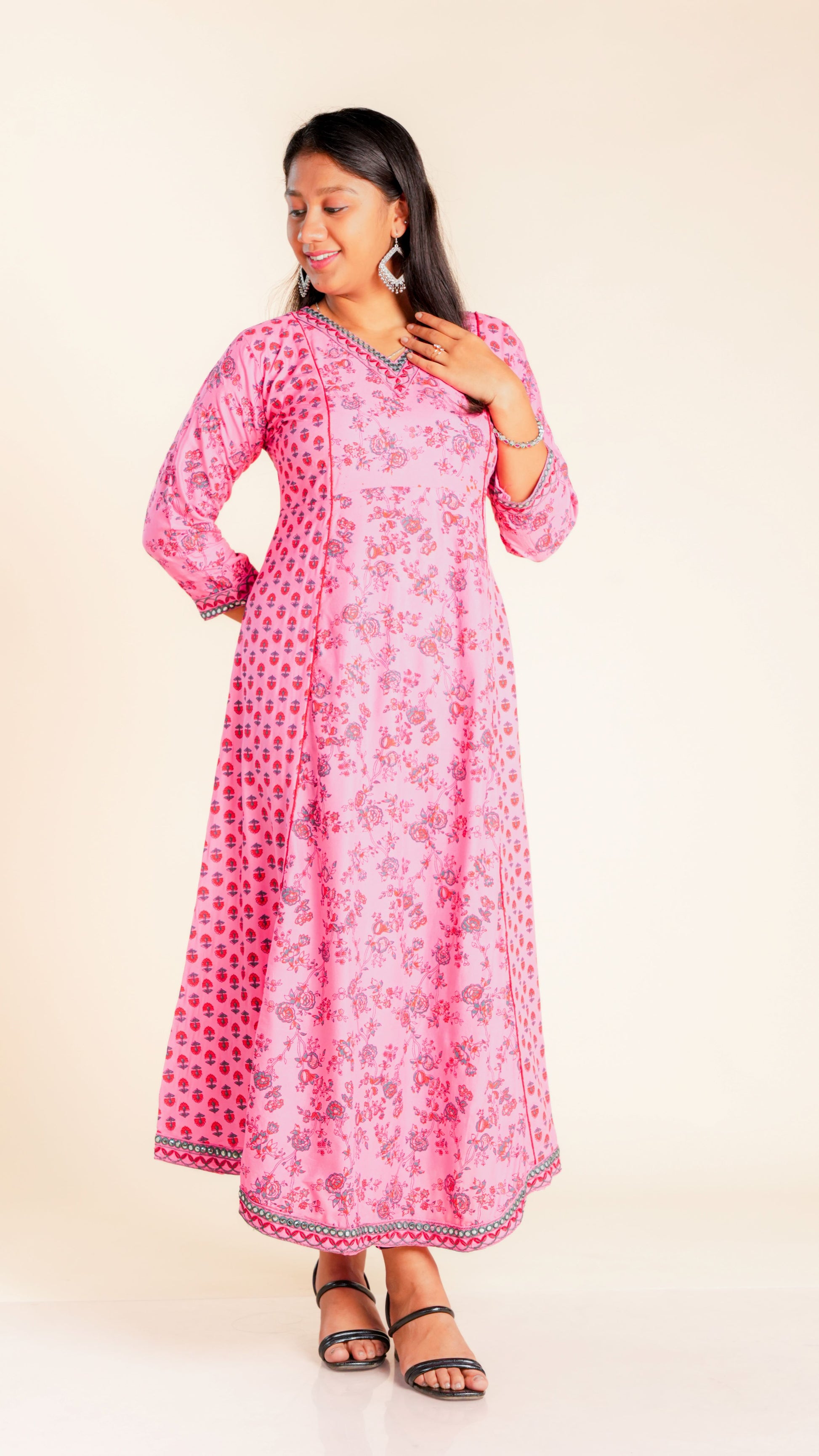 Elevate your style with our Bhoomika Sequined Ghera. The intricate sequined work and vibrant floral print add a touch of elegance to this traditional garment. Ideal for any occasion, this Ghera is sure to make you stand out in the crowd.