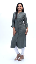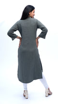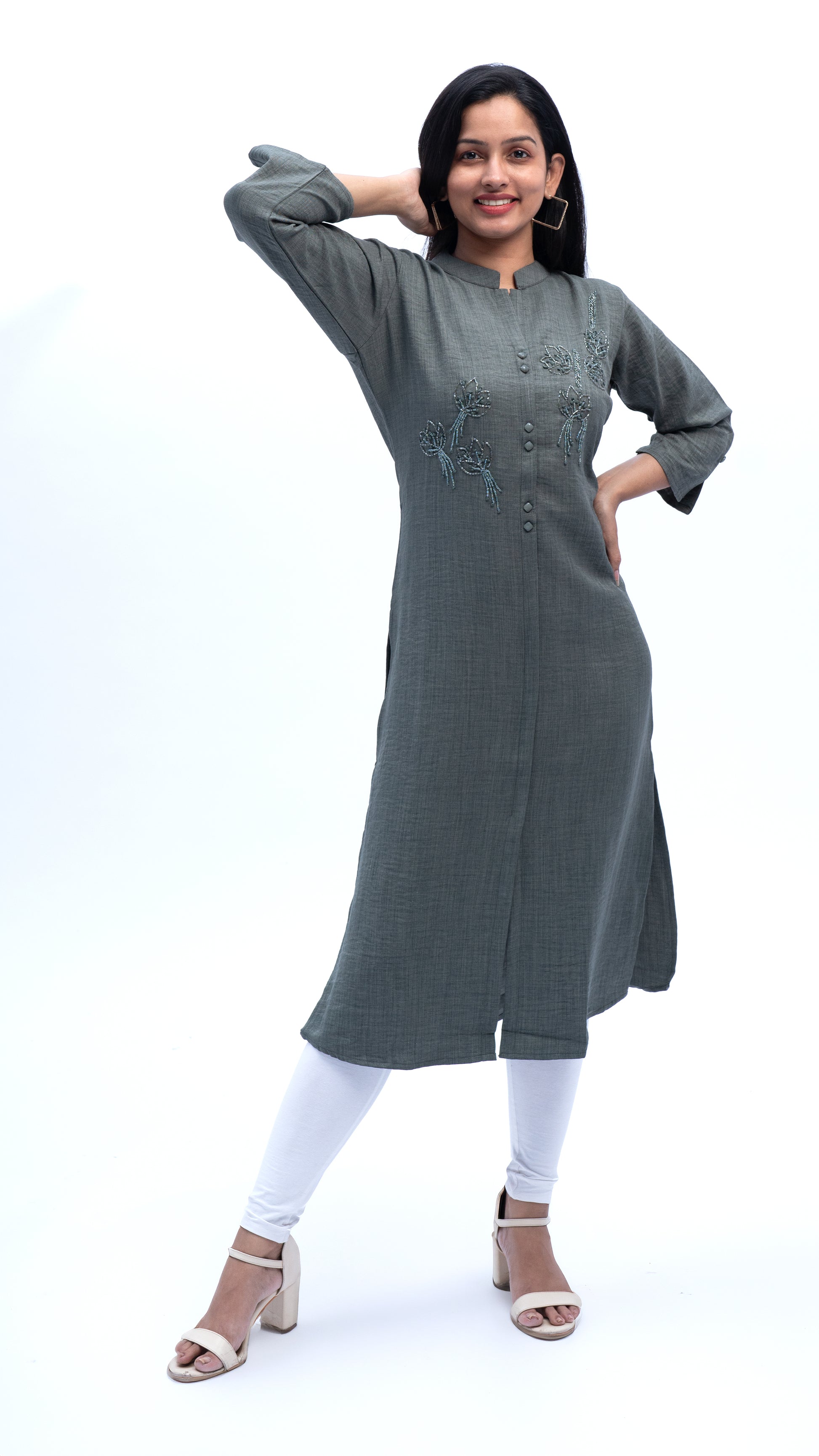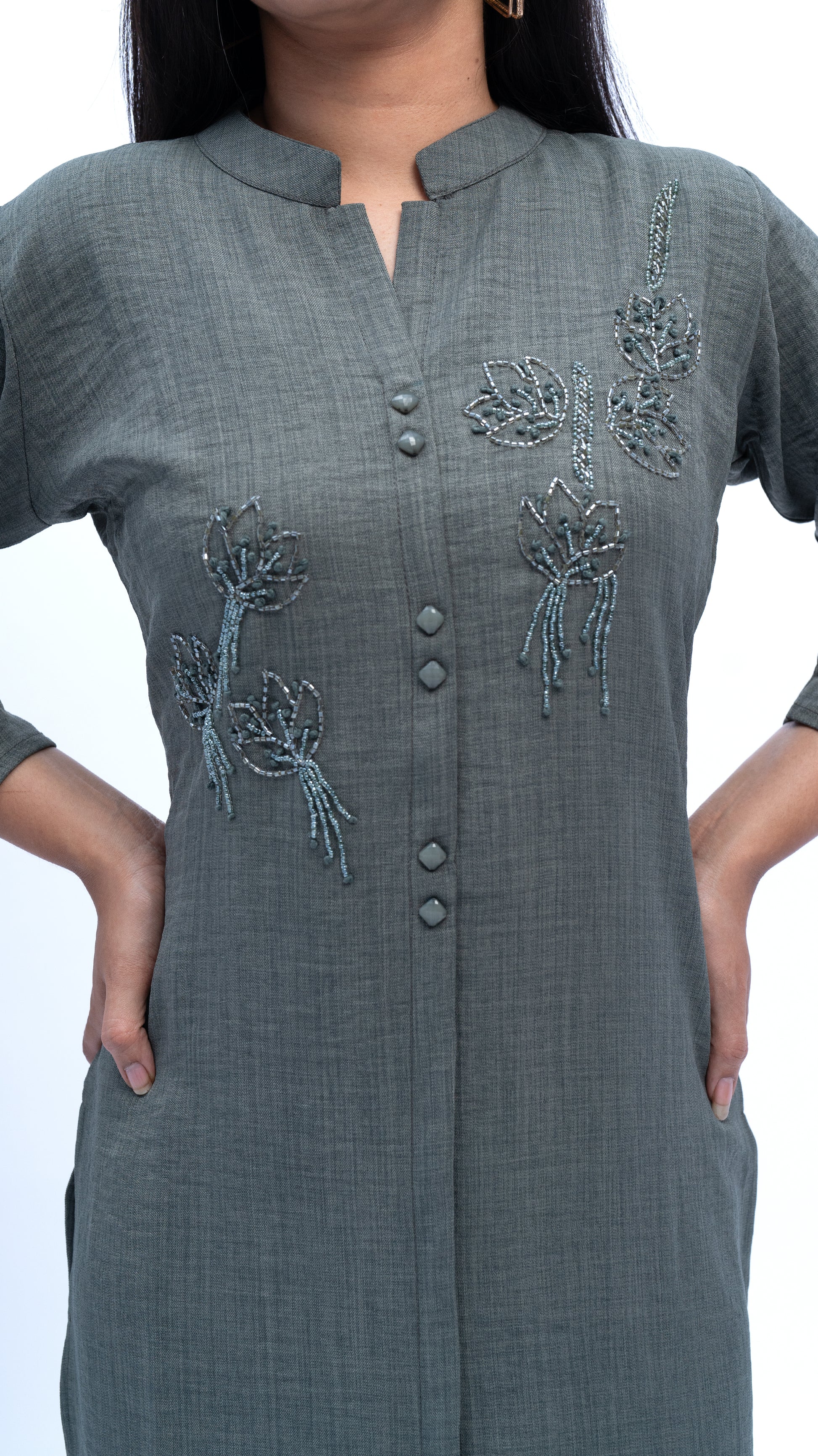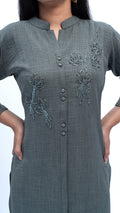 Add a touch of refined style with the Smokey Bloom Grey Kurti, designed in a soft, smoky grey hue that radiates subtle elegance. The delicate beadwork woven into the fabric enhances its beauty, offering just the right amount of detail without being too bold or flashy. Perfect for both casual and semi-formal occasions, this kurti combines comfort with grace, ensuring you feel confident and stylish. Step into timeless sophistication with the Smokey Bloom Grey Kurti—a modern classic with a hint of charm.
