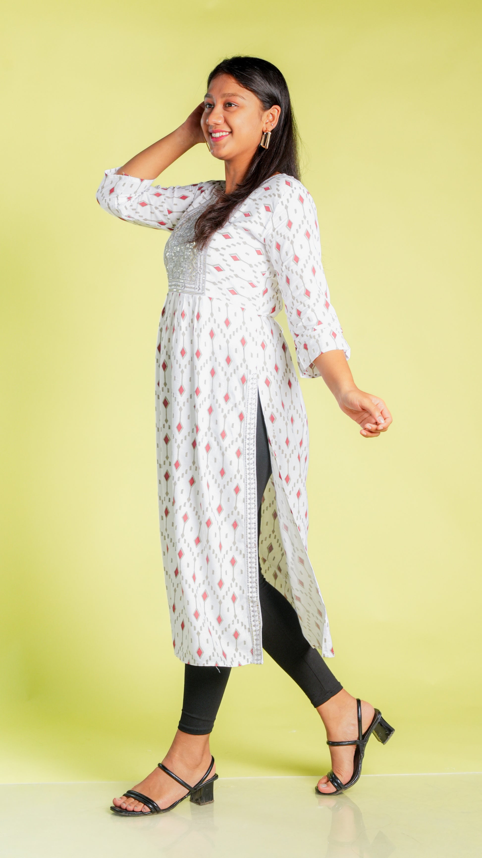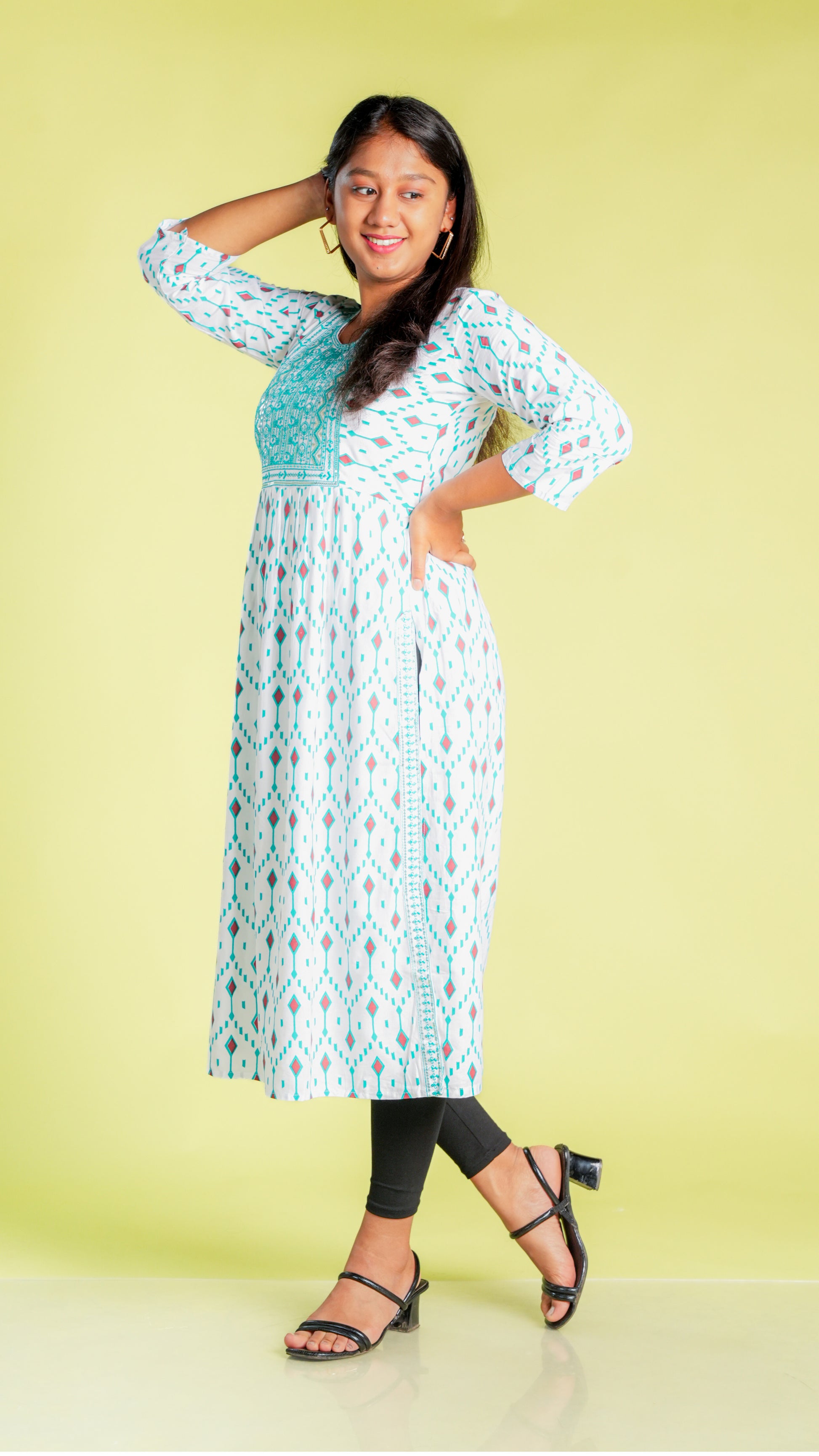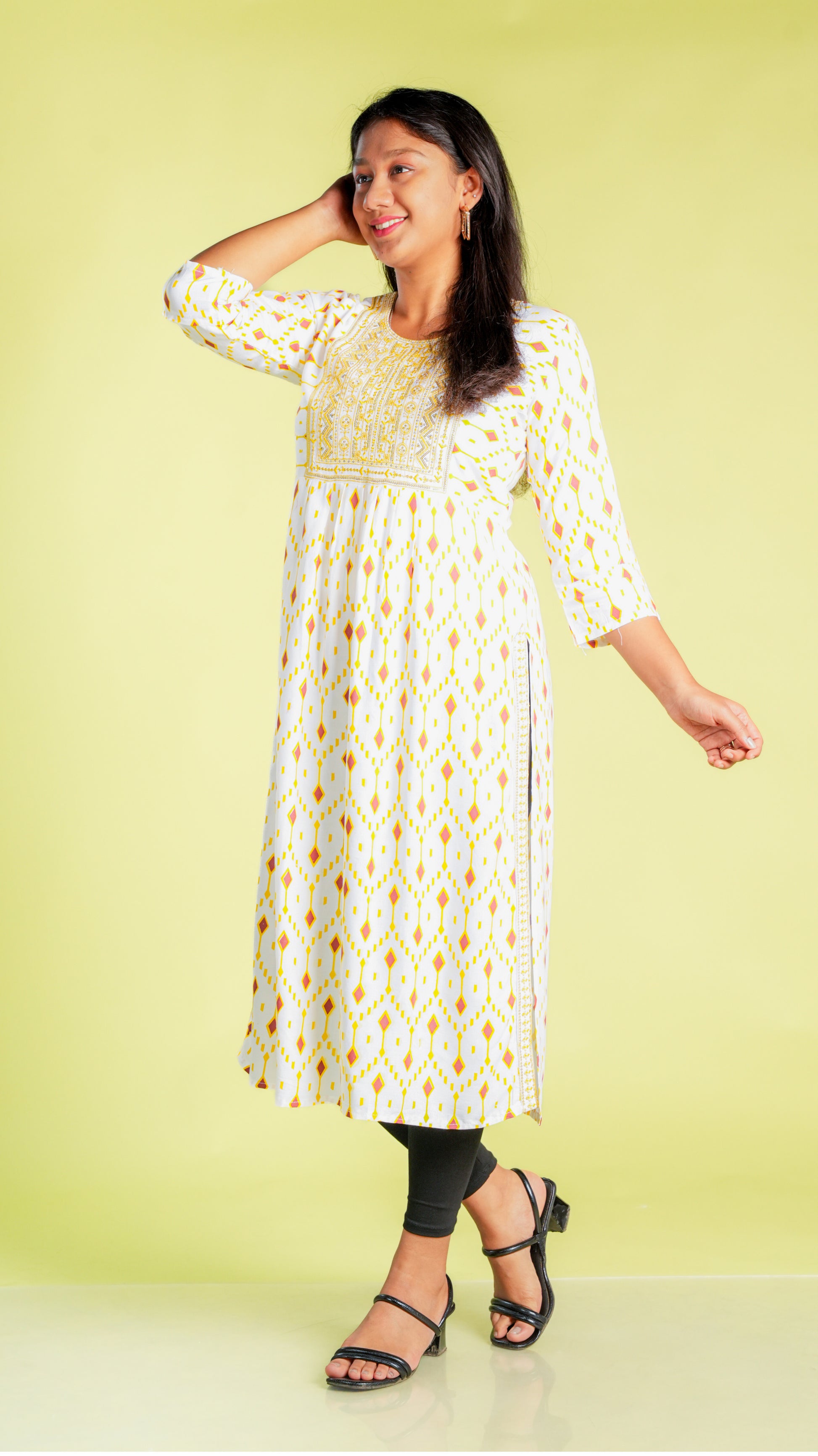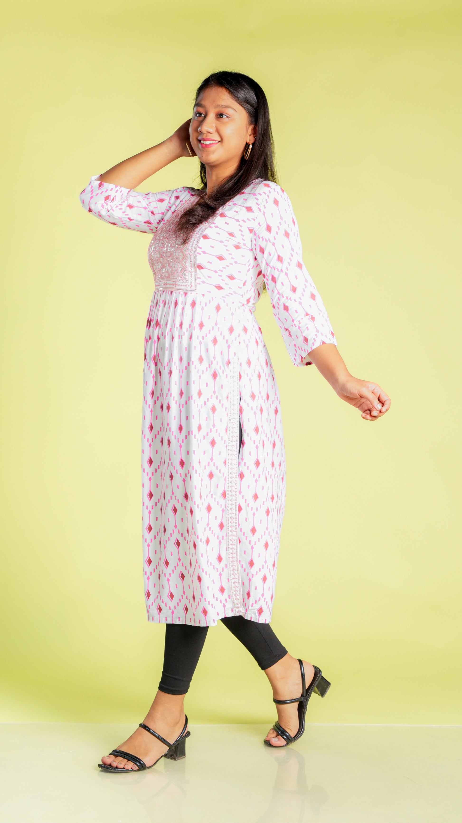 The Suhana Nyra Cut Kurti features genuine nyra cuts on both sides, enhancing comfort and style. Designed with a charming knot at the back, it ensures a perfect fit tailored to your shape. Available in four soft, elegant shades, this kurti seamlessly transitions from office wear to casual outings, offering versatility without compromising on sophistication.