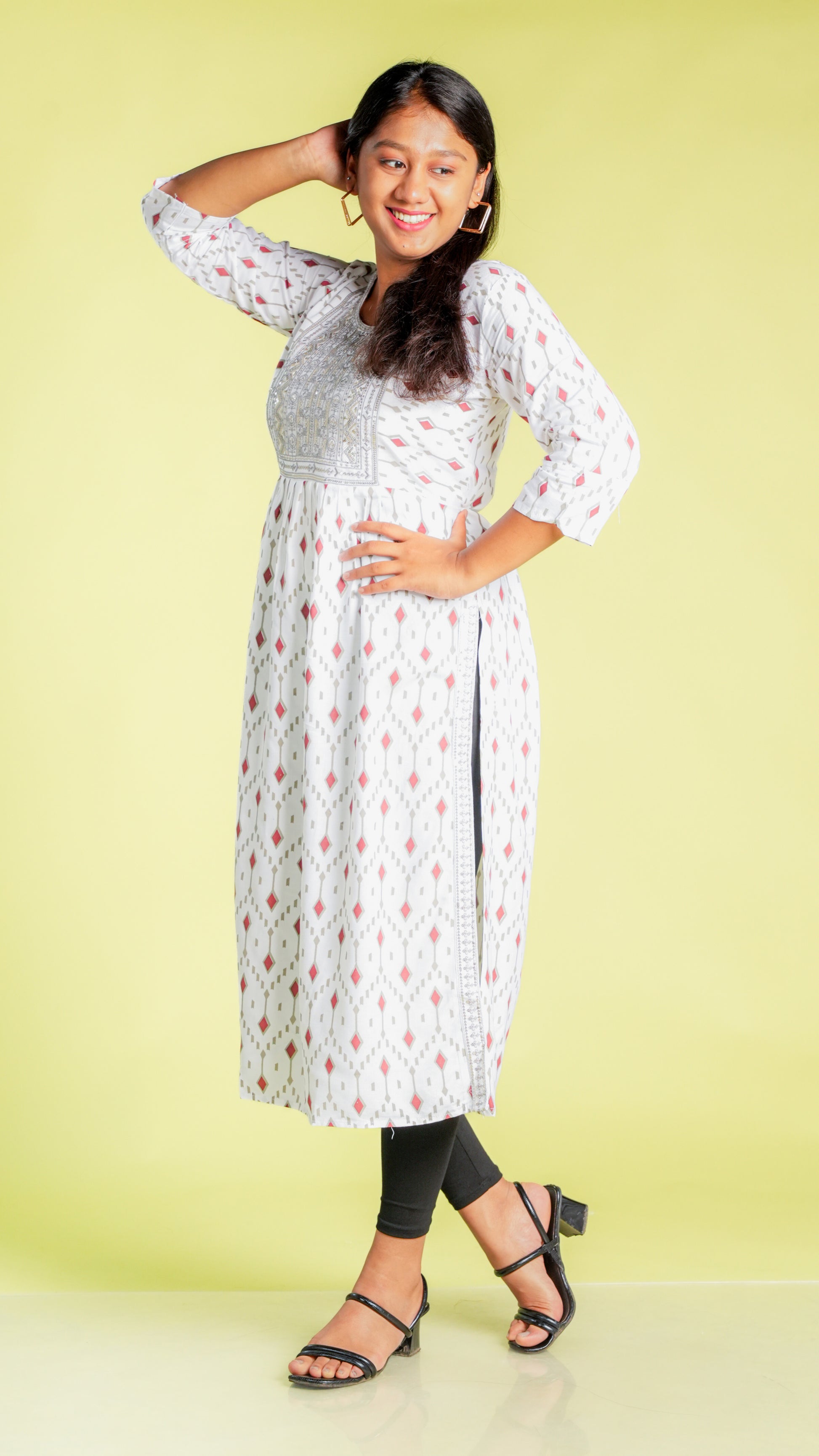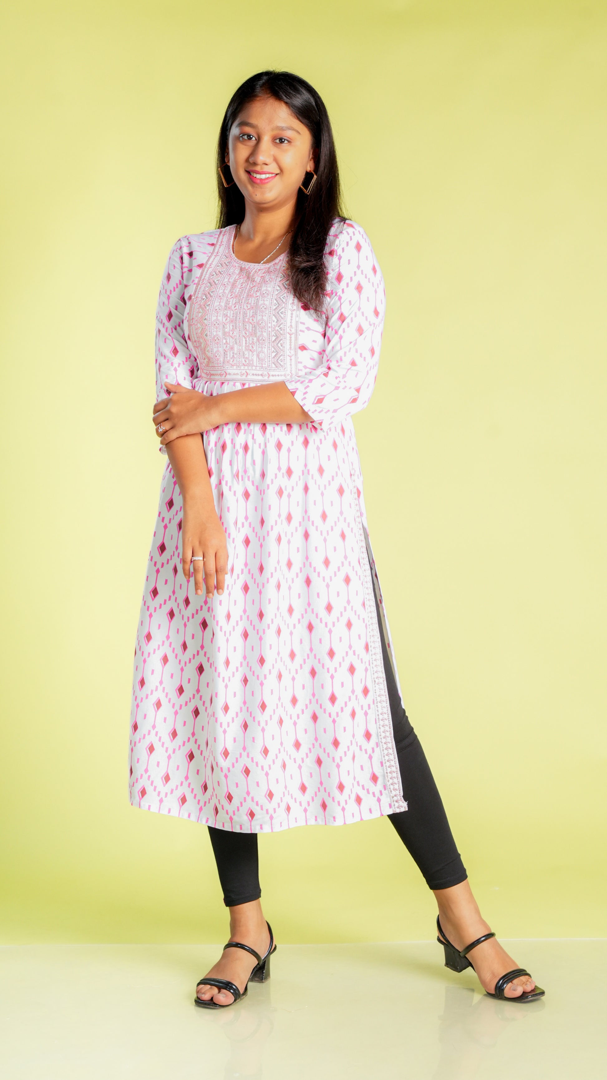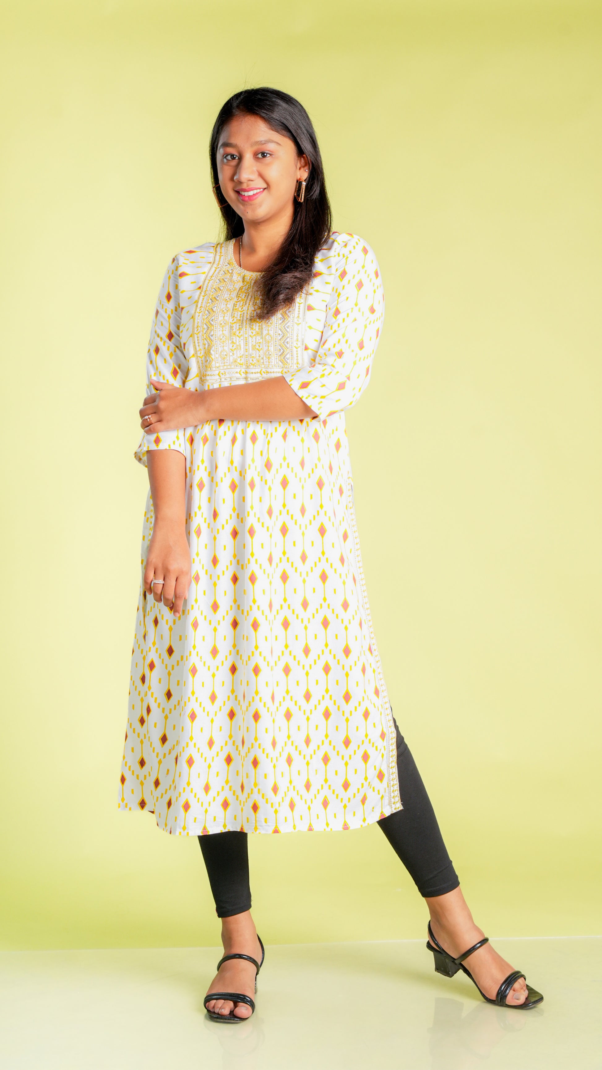 The Suhana Nyra Cut Kurti features genuine nyra cuts on both sides, enhancing comfort and style. Designed with a charming knot at the back, it ensures a perfect fit tailored to your shape. Available in four soft, elegant shades, this kurti seamlessly transitions from office wear to casual outings, offering versatility without compromising on sophistication.