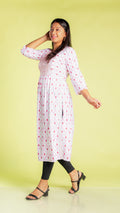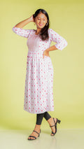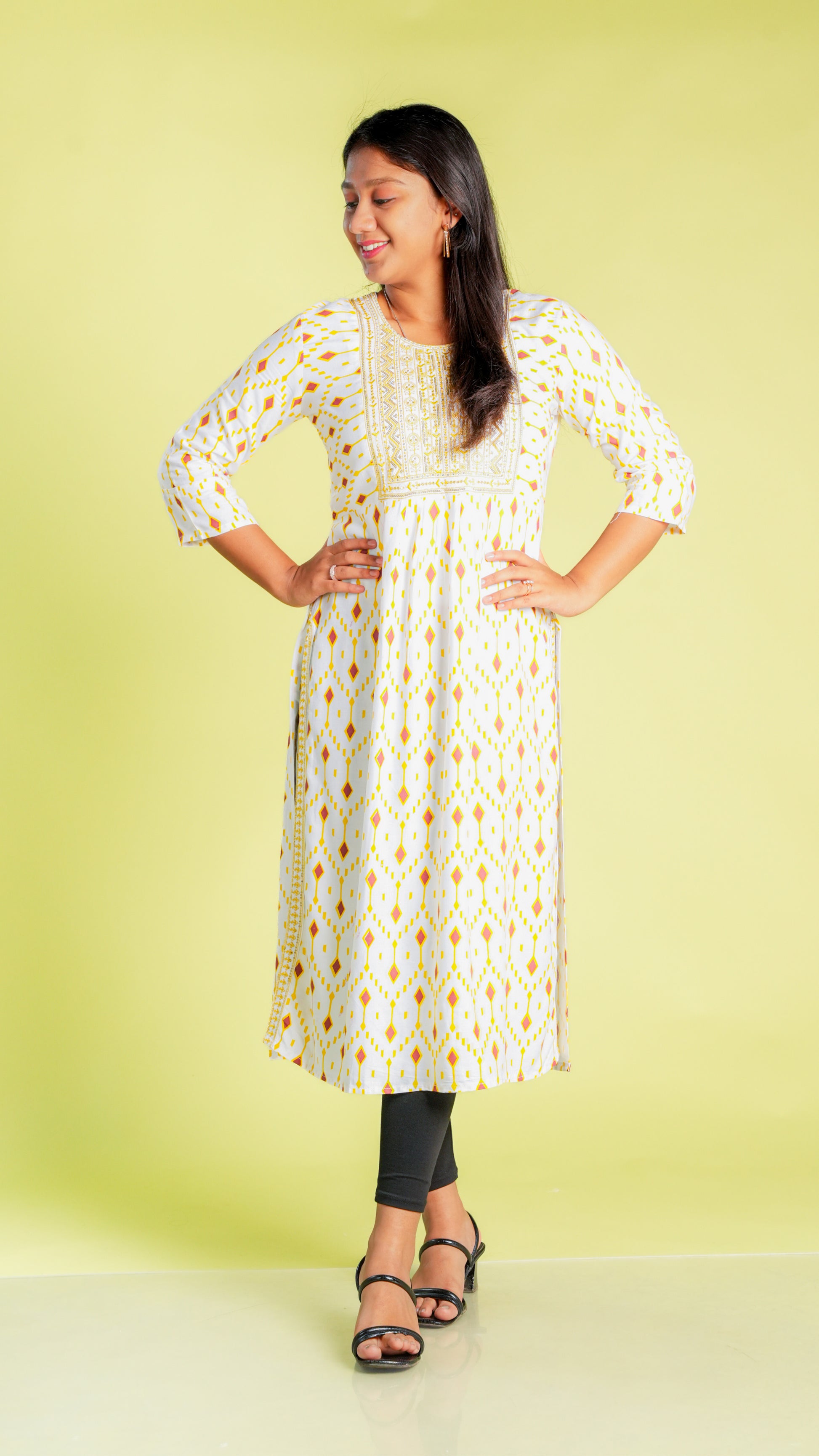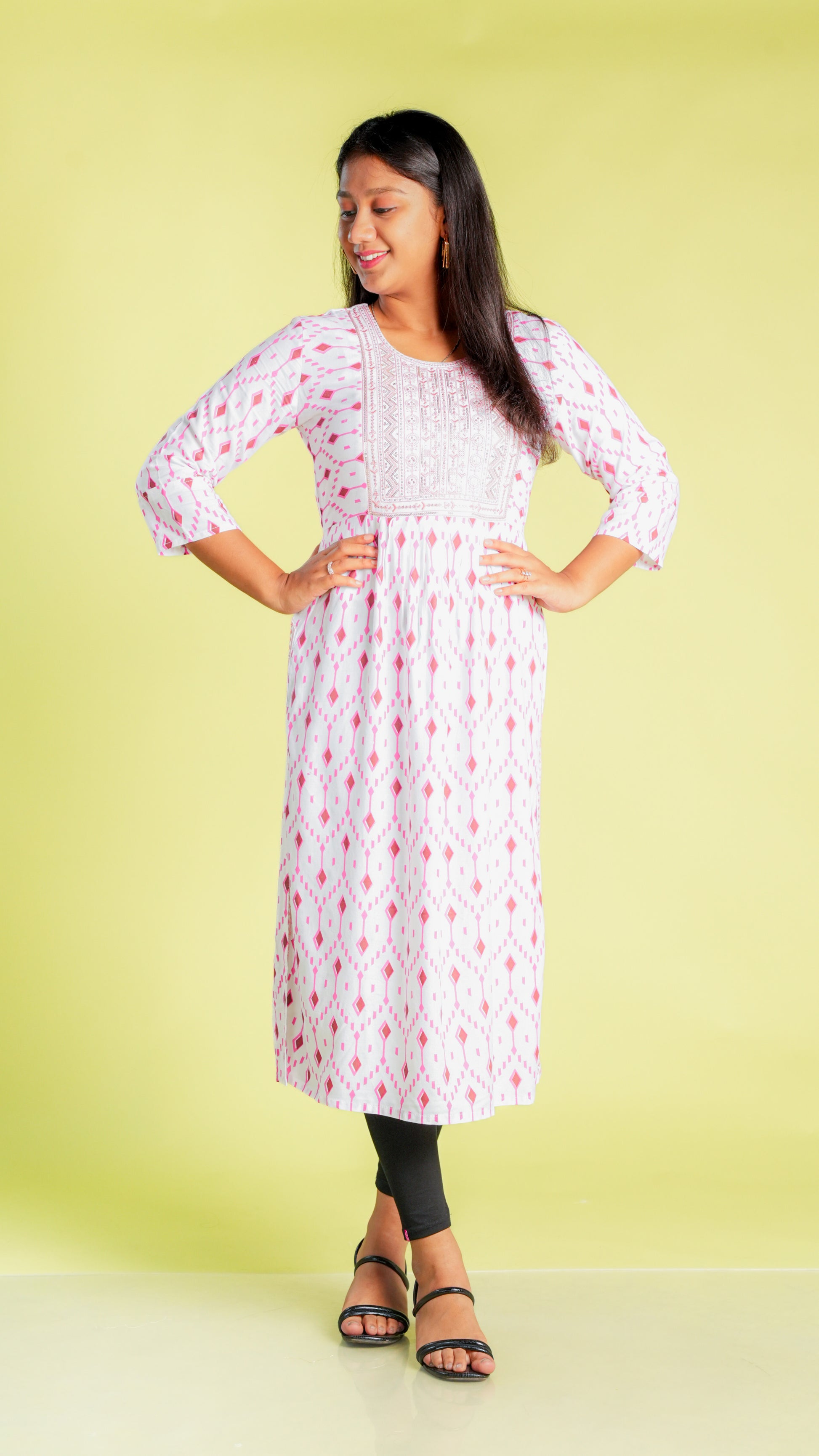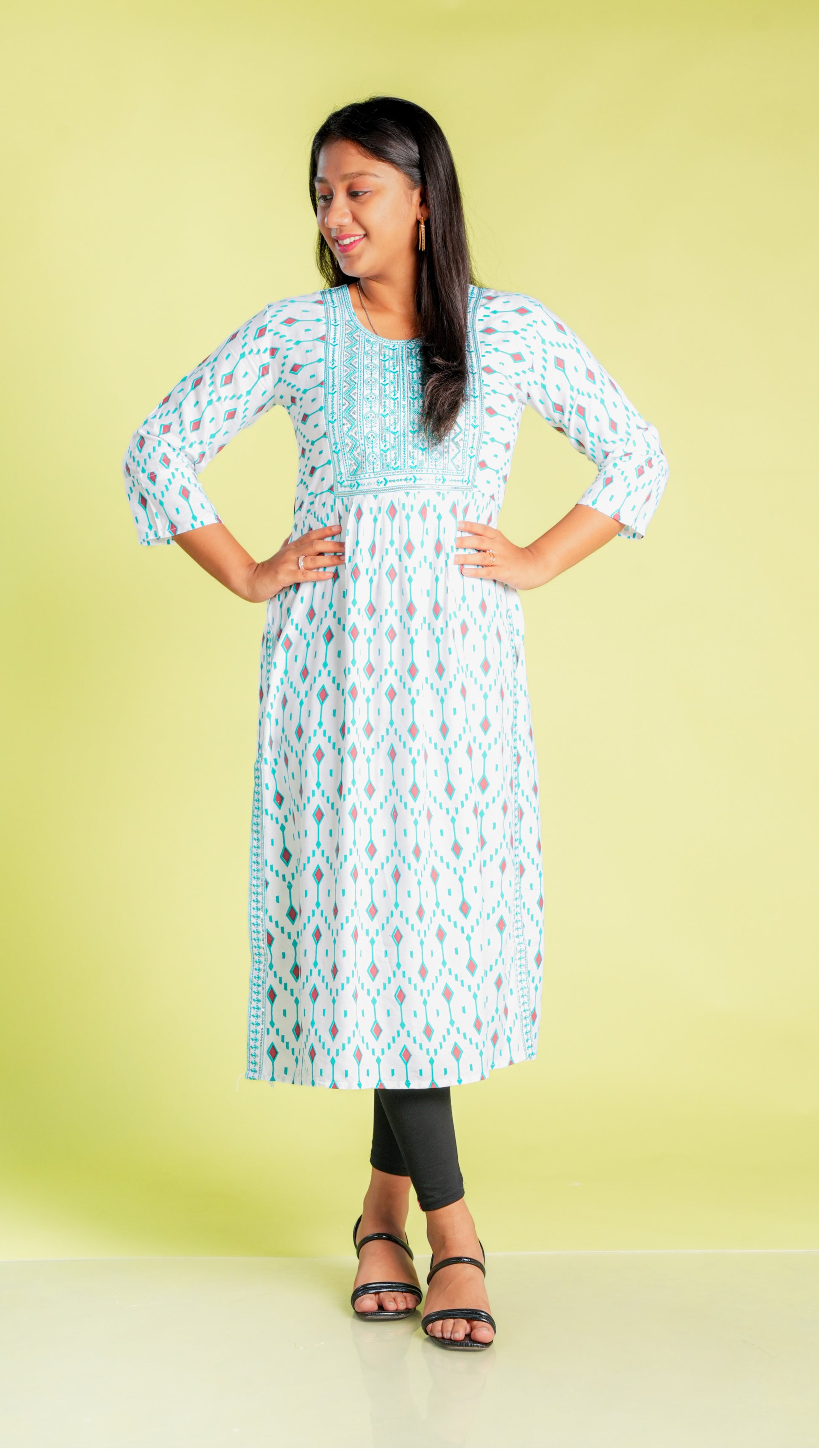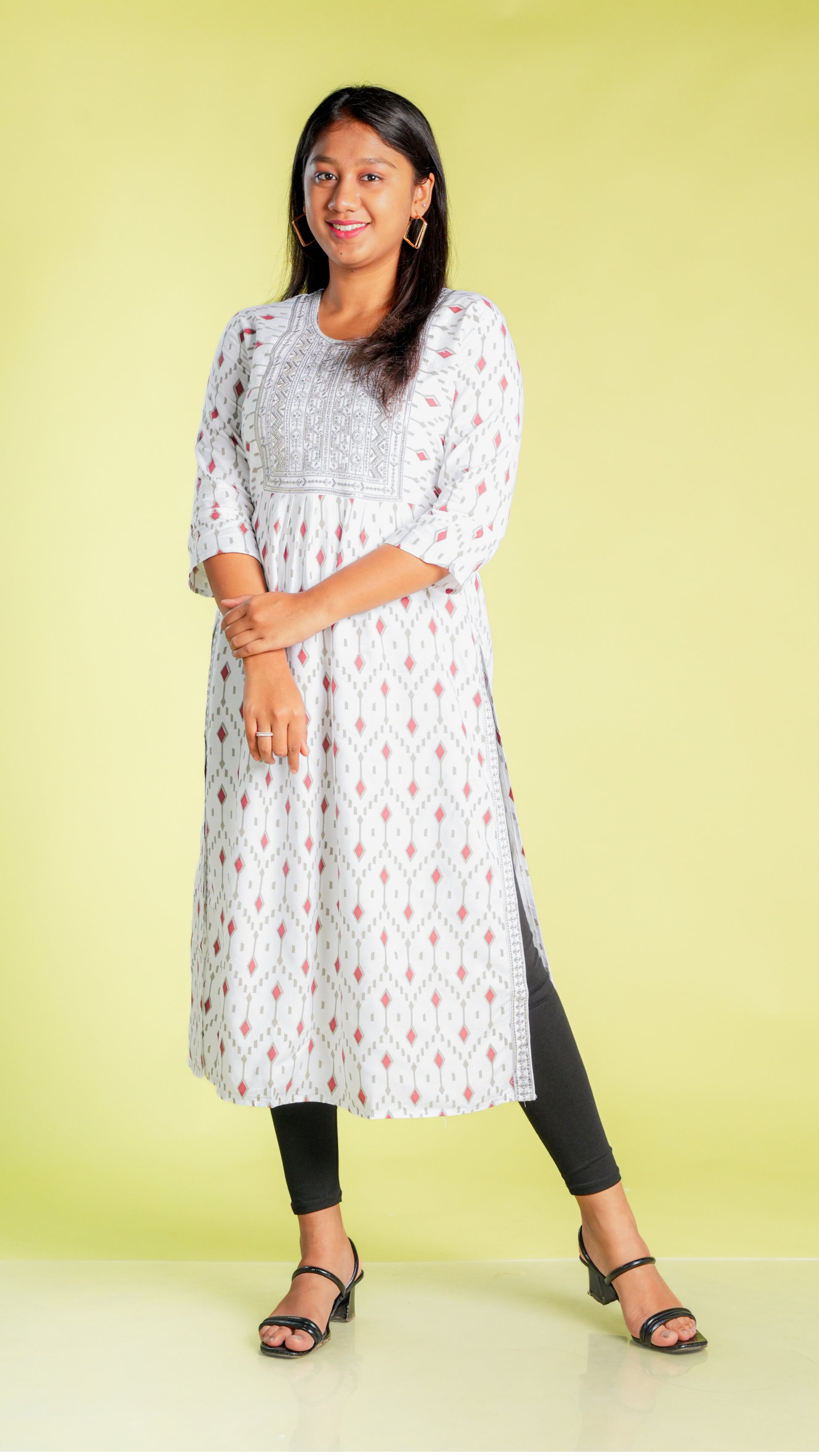 The Suhana Nyra Cut Kurti features genuine nyra cuts on both sides, enhancing comfort and style. Designed with a charming knot at the back, it ensures a perfect fit tailored to your shape. Available in four soft, elegant shades, this kurti seamlessly transitions from office wear to casual outings, offering versatility without compromising on sophistication.