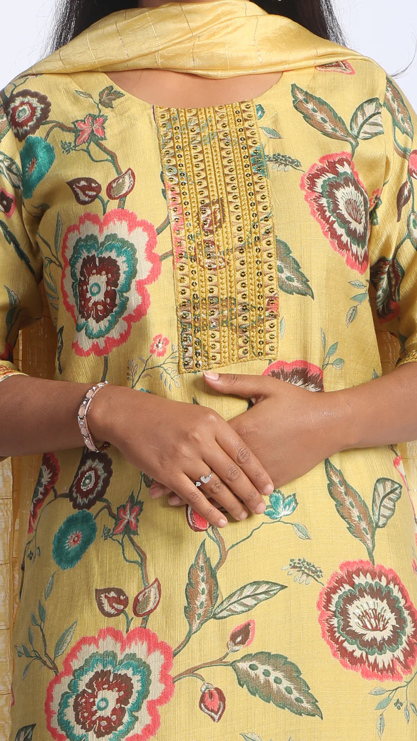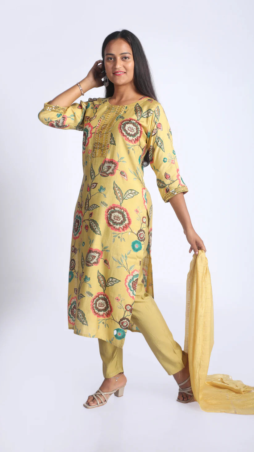 Introducing our Floral Suit Set, perfect for adding a touch of modernity to your traditional wardrobe. The digital print adds a unique and eye-catching element to the kurti, making it a must-have for any fashion-forward individual. Add a contemporary flair to your style with this suit set.