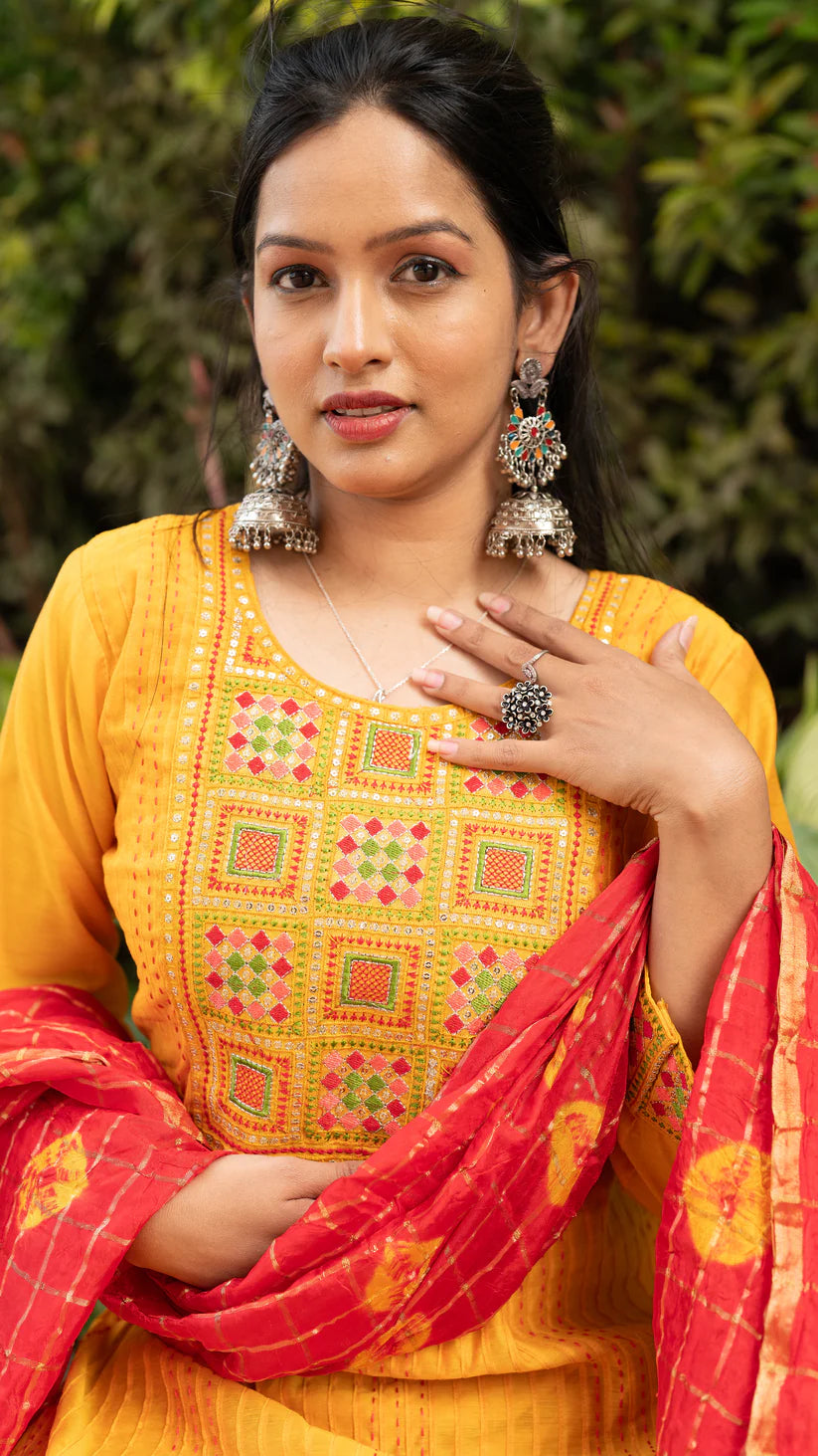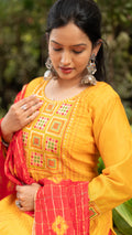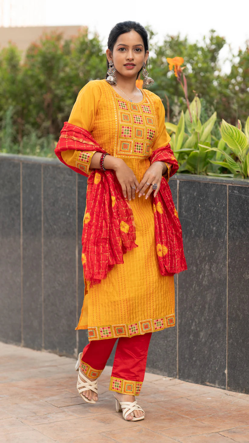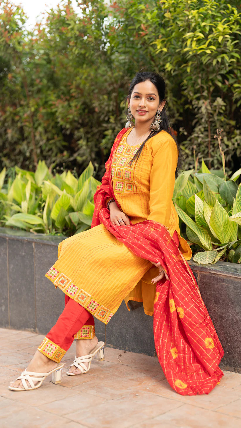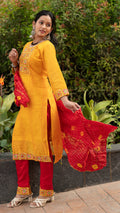 Expertly crafted with delicate thread work, this suit set is an elegant addition to your wardrobe. The traditional Bandhej dupatta adds a touch of timeless charm. Made with precision to ensure quality and comfort, this set is perfect for any special occasion.