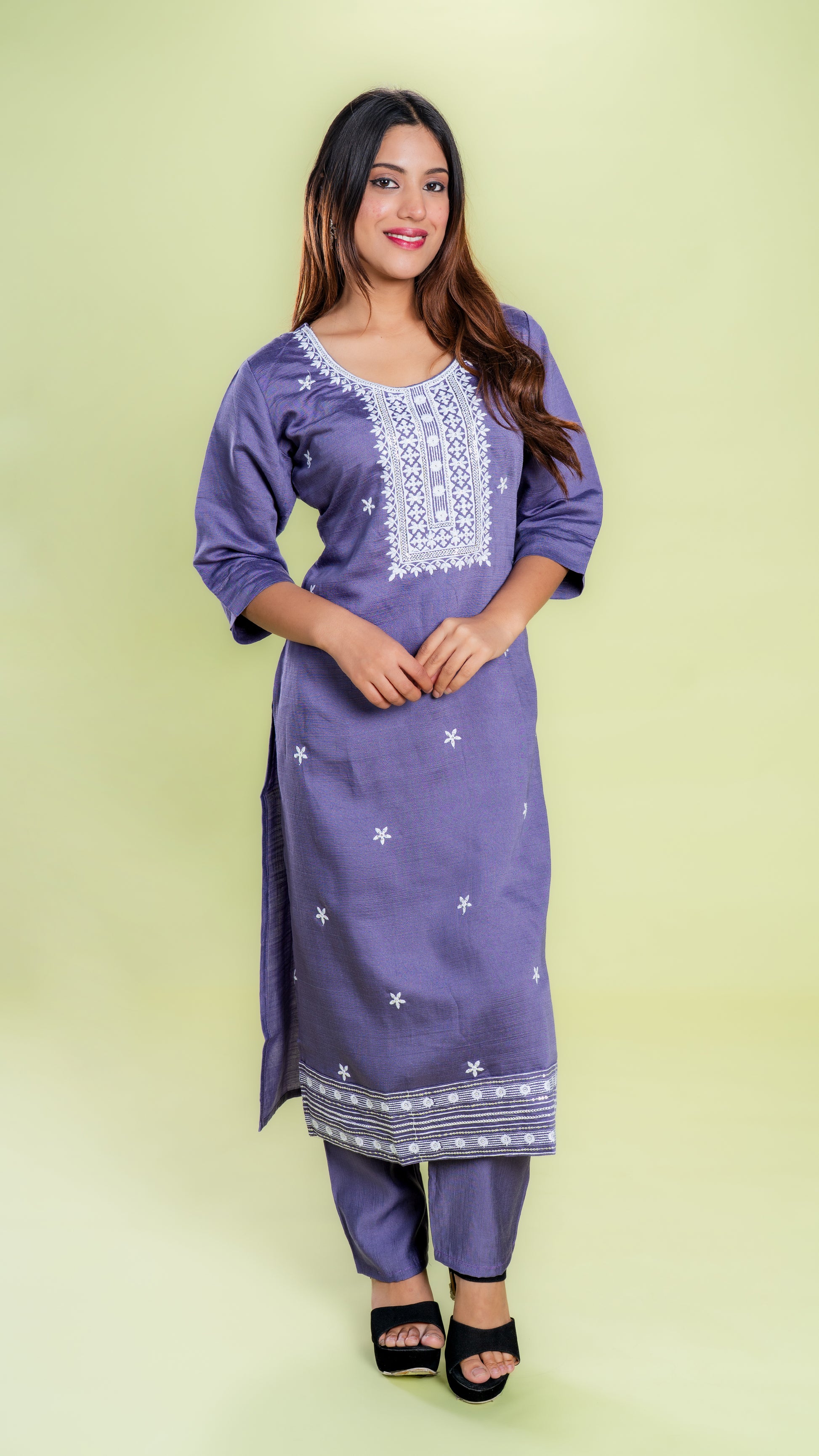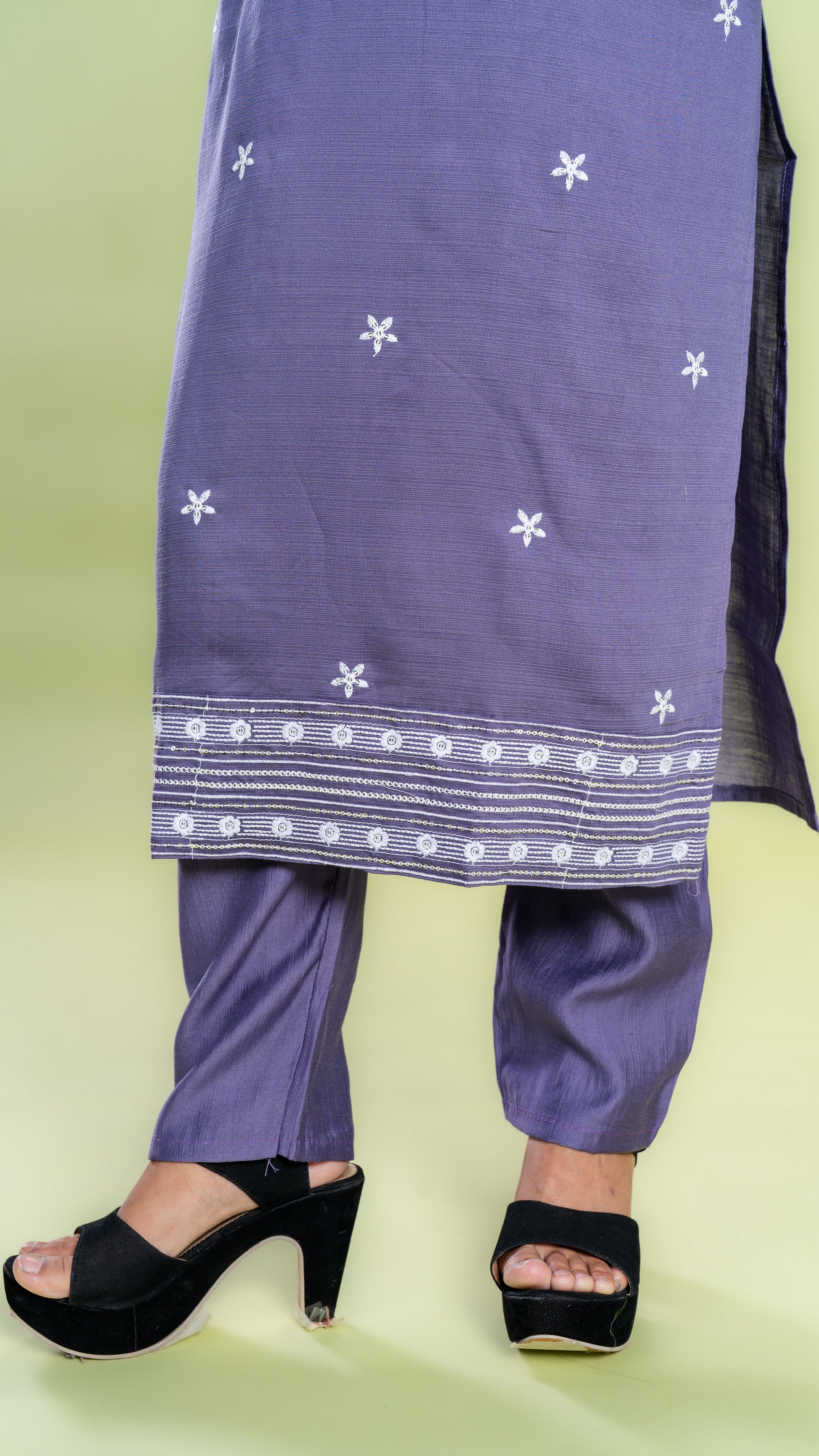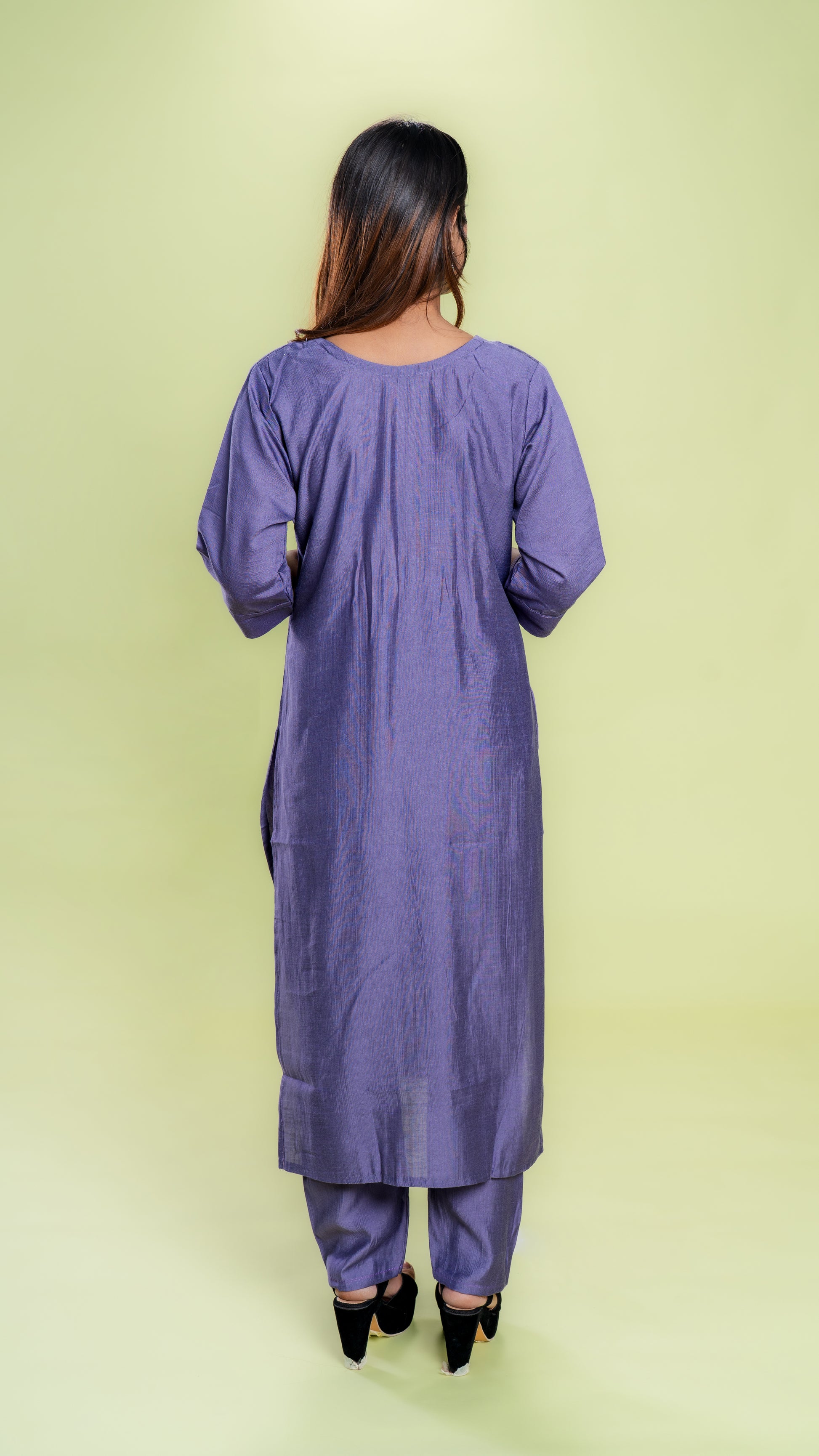 Elevate your wardrobe with the Threaded Twilight suit set, featuring intricate purple threadwork that blends traditional craftsmanship with contemporary style. This expertly designed ensemble offers a refined silhouette and rich detailing, perfect for formal occasions or cultural celebrations. Crafted to provide both comfort and elegance, it ensures you stand out with subtle sophistication. Ideal for those who appreciate meticulous artistry in their attire.