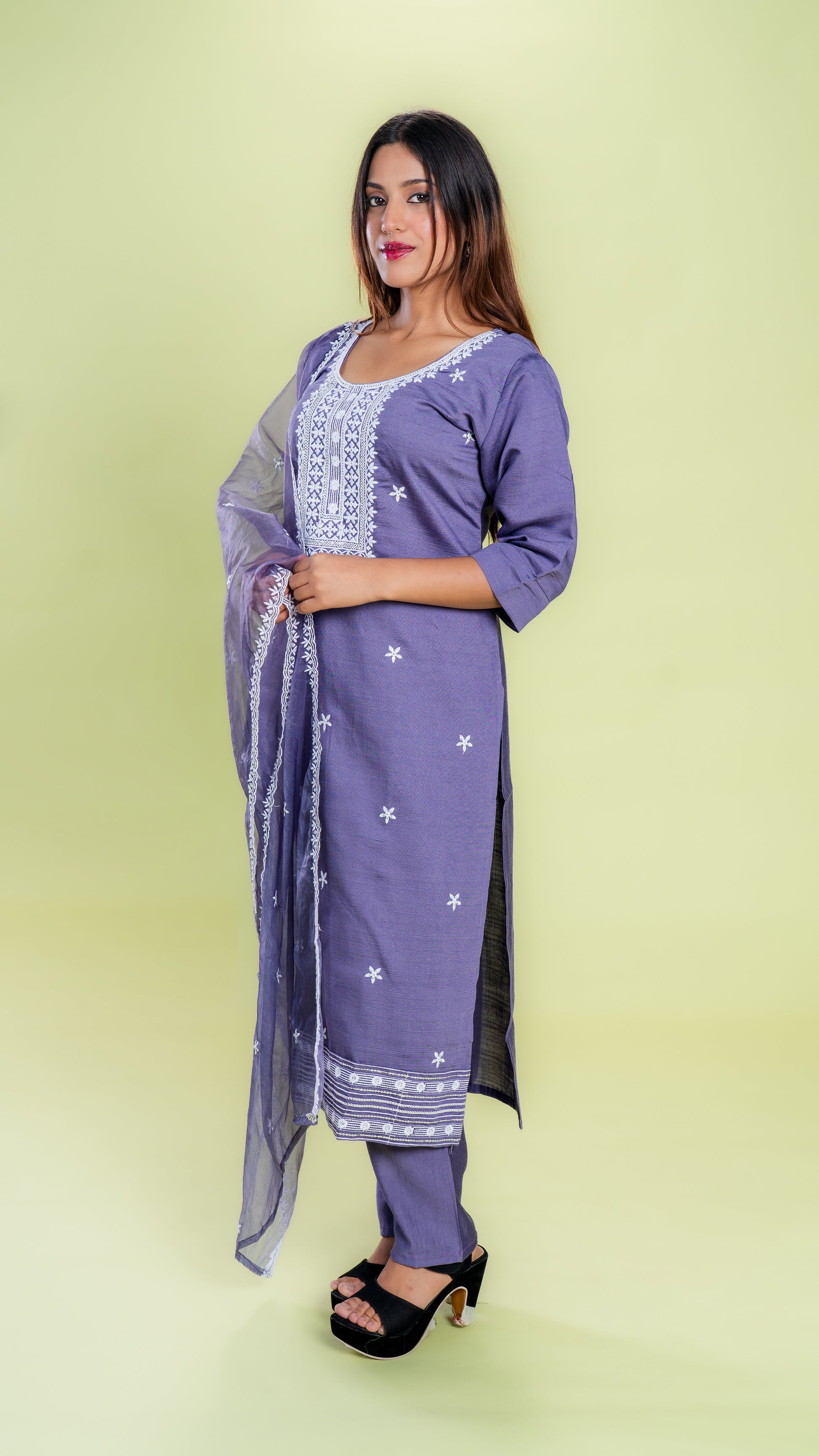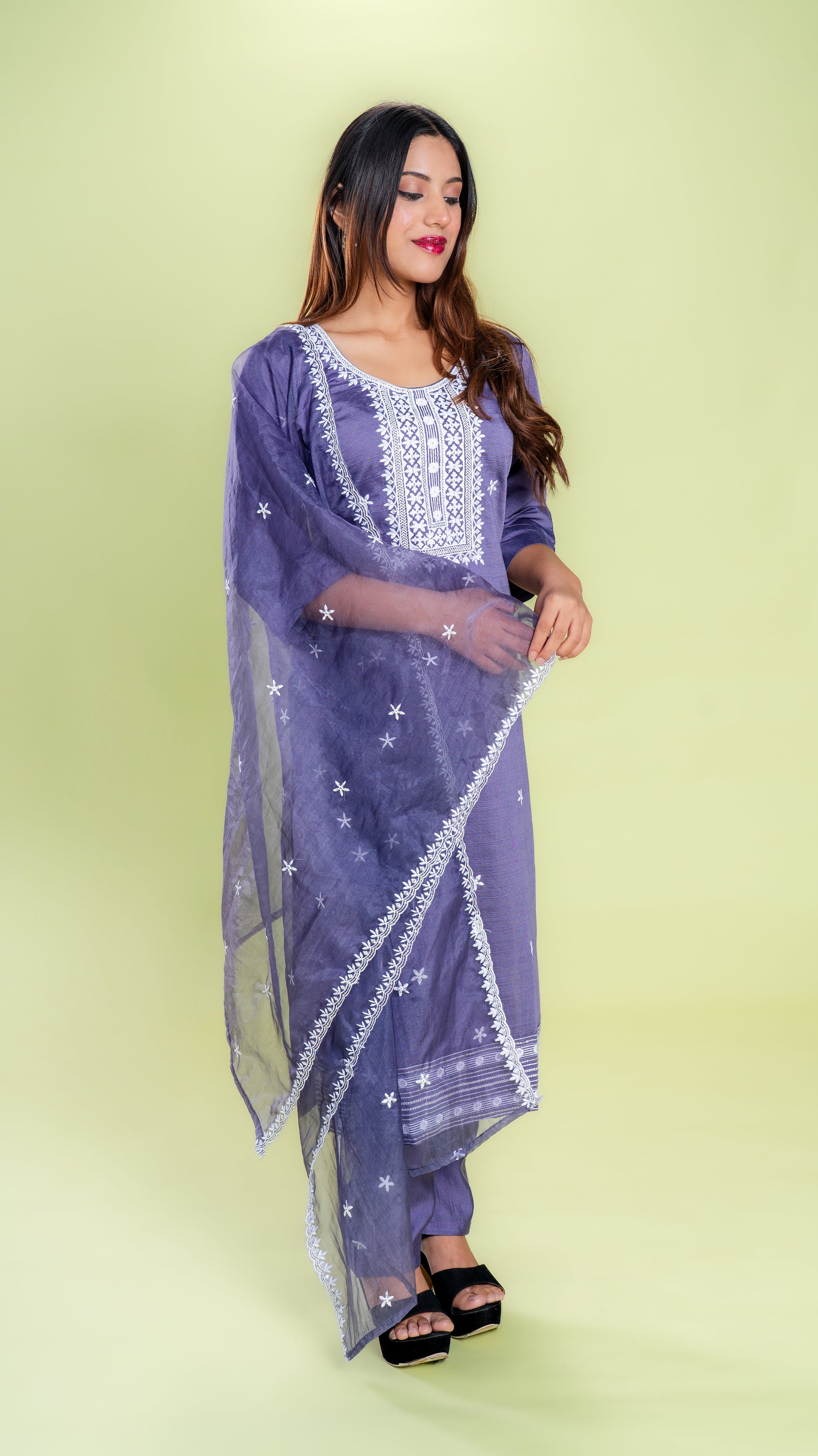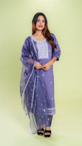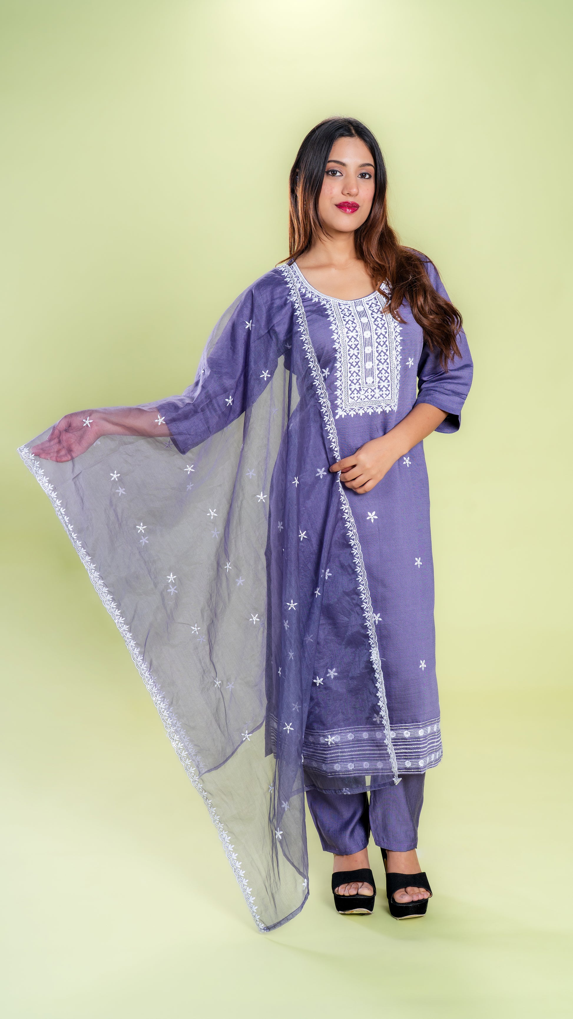 Elevate your wardrobe with the Threaded Twilight suit set, featuring intricate purple threadwork that blends traditional craftsmanship with contemporary style. This expertly designed ensemble offers a refined silhouette and rich detailing, perfect for formal occasions or cultural celebrations. Crafted to provide both comfort and elegance, it ensures you stand out with subtle sophistication. Ideal for those who appreciate meticulous artistry in their attire.