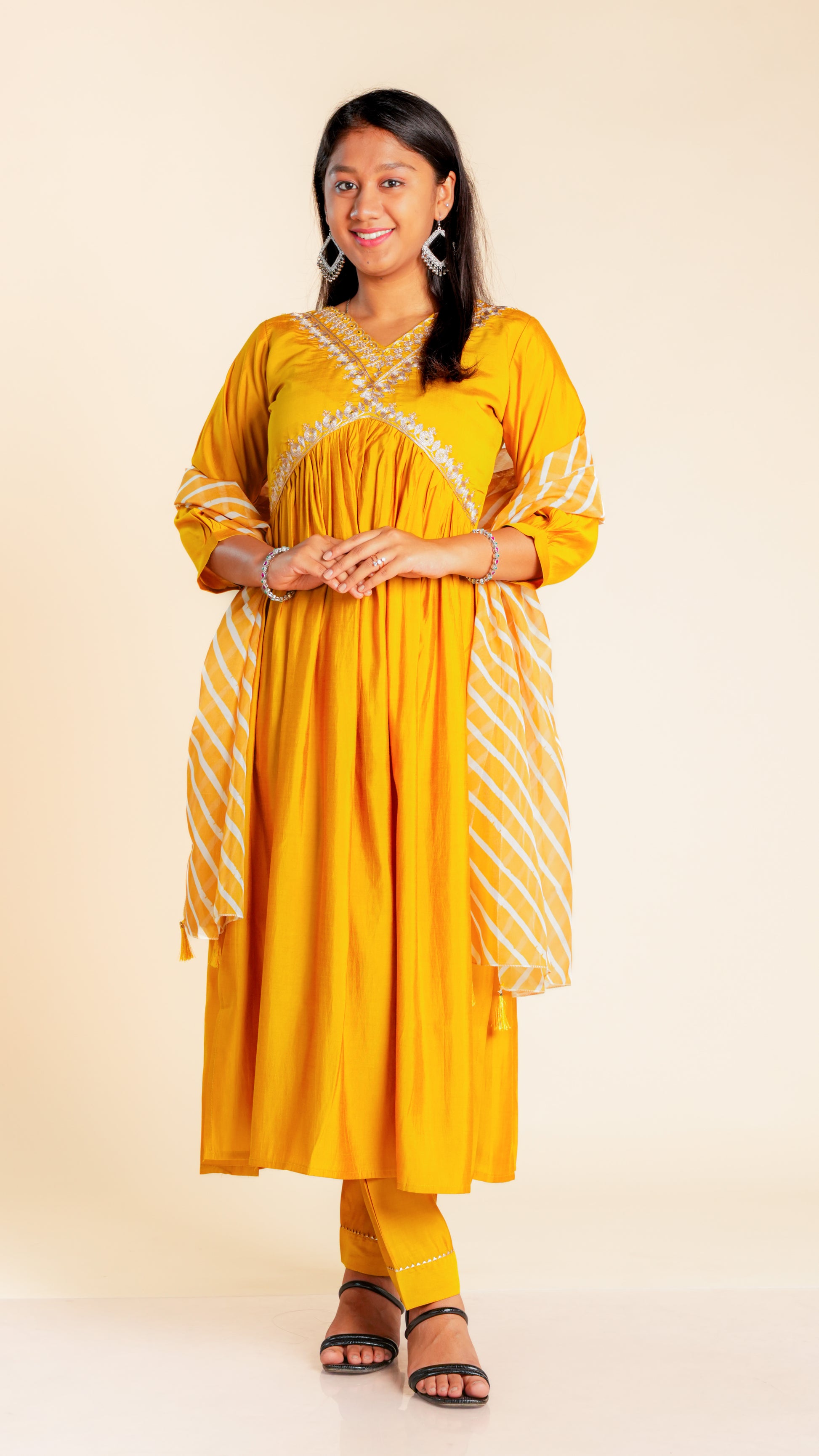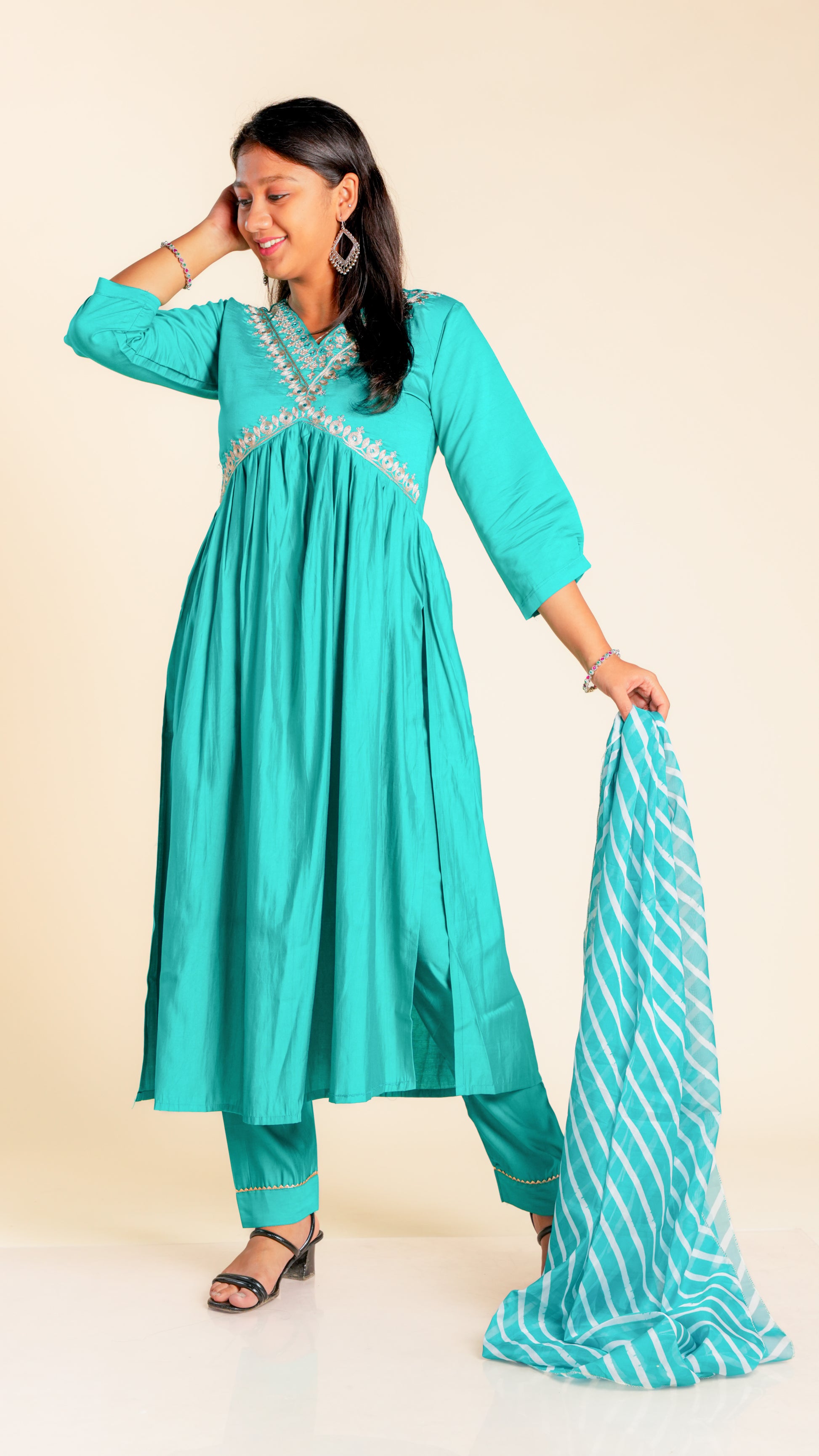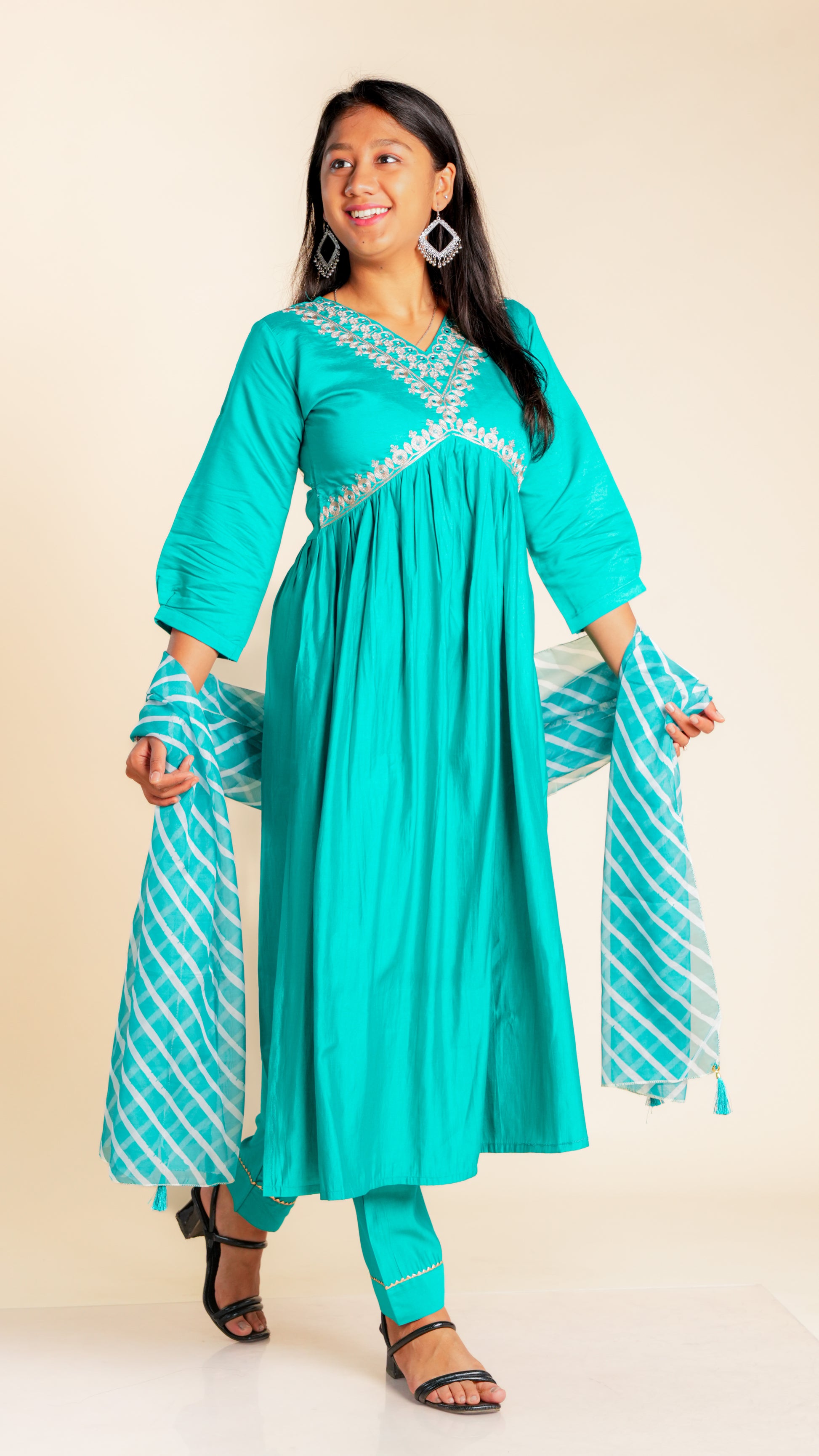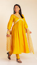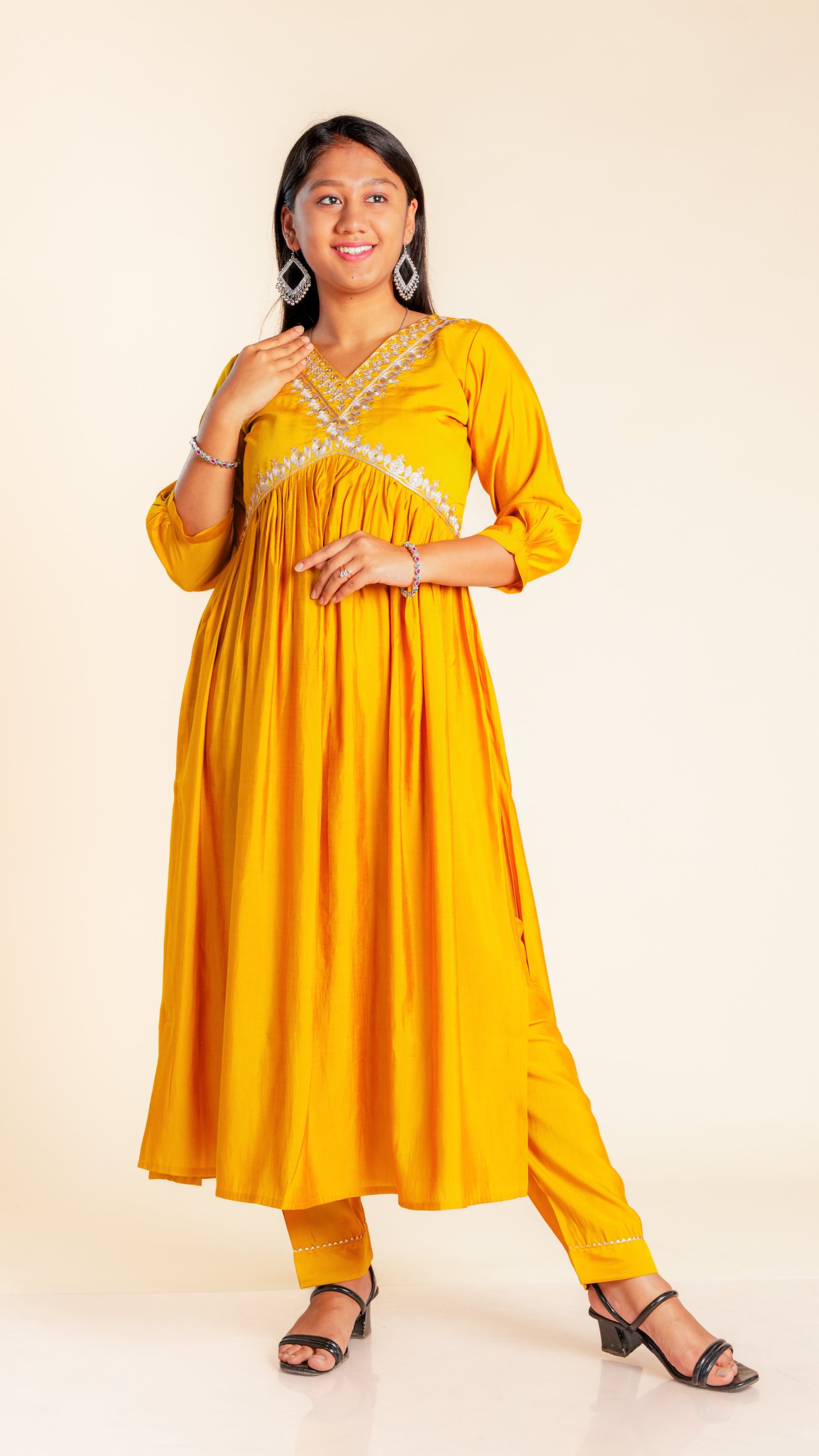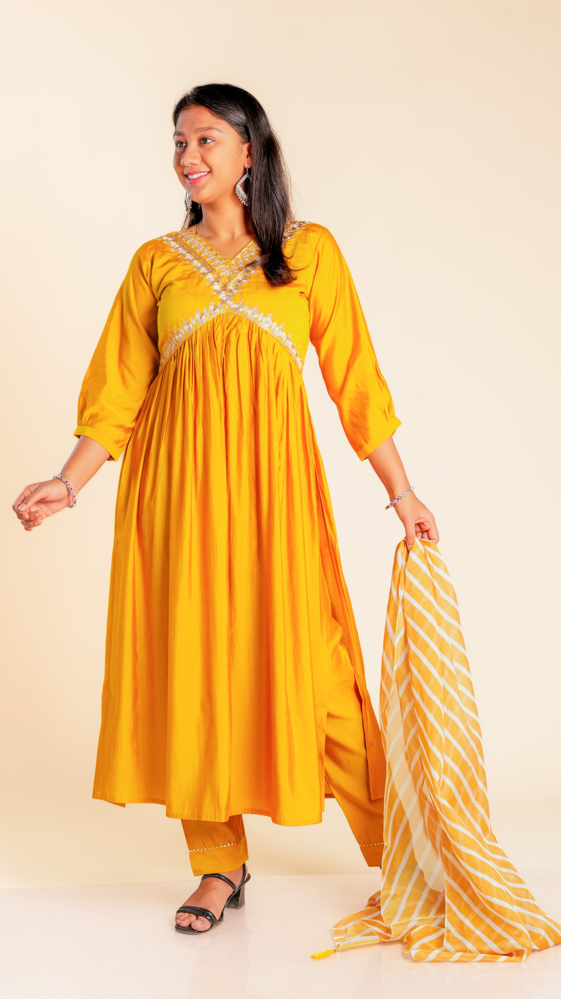 Experience the classic elegance of our Roopika Suit Set, crafted from luxurious tissue silk. This set features a unique Nyra cut kurta that adds a modern twist to a traditional design. Perfect for any special occasion, this suit set is sure to make you stand out with its timeless style.