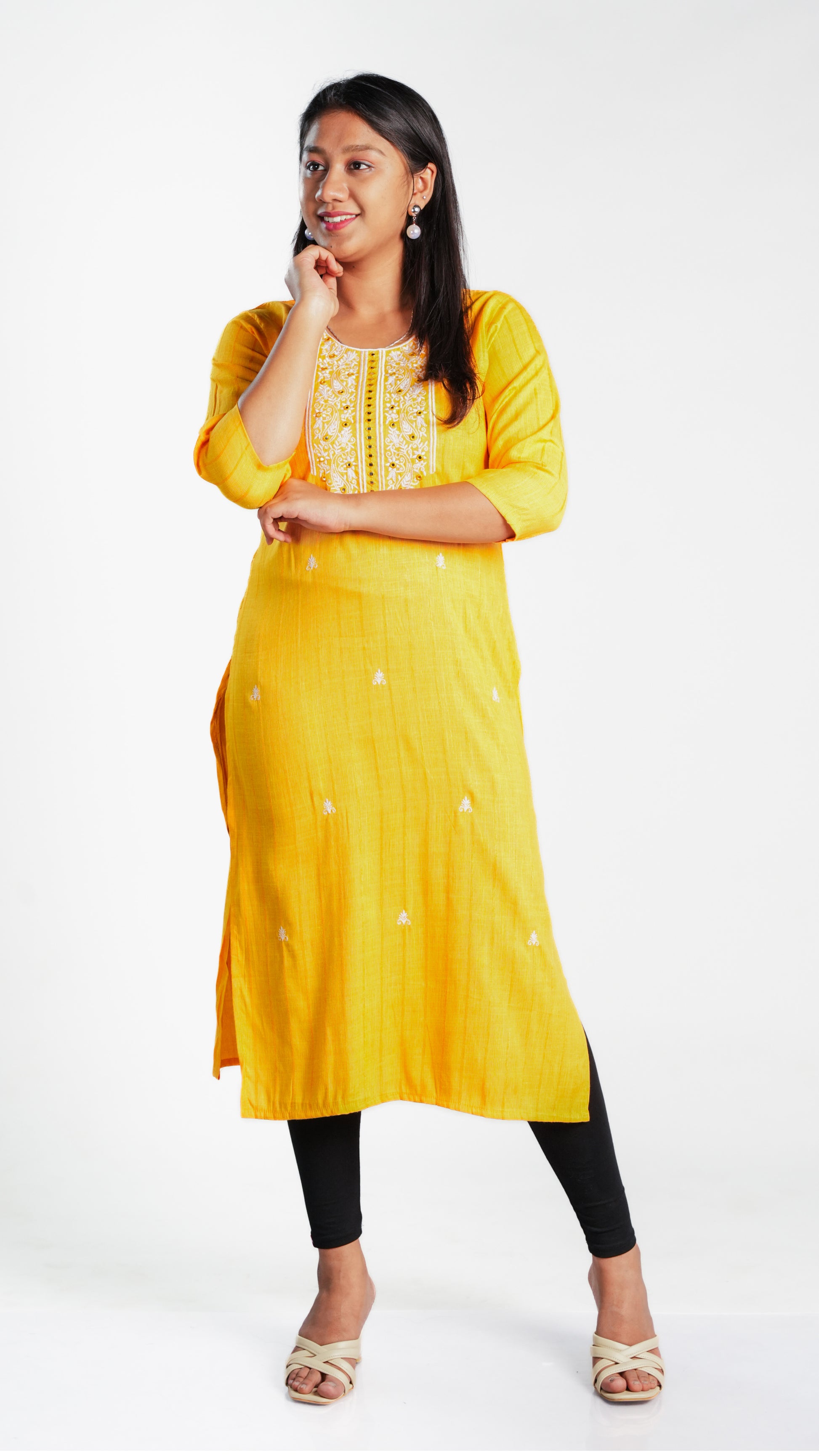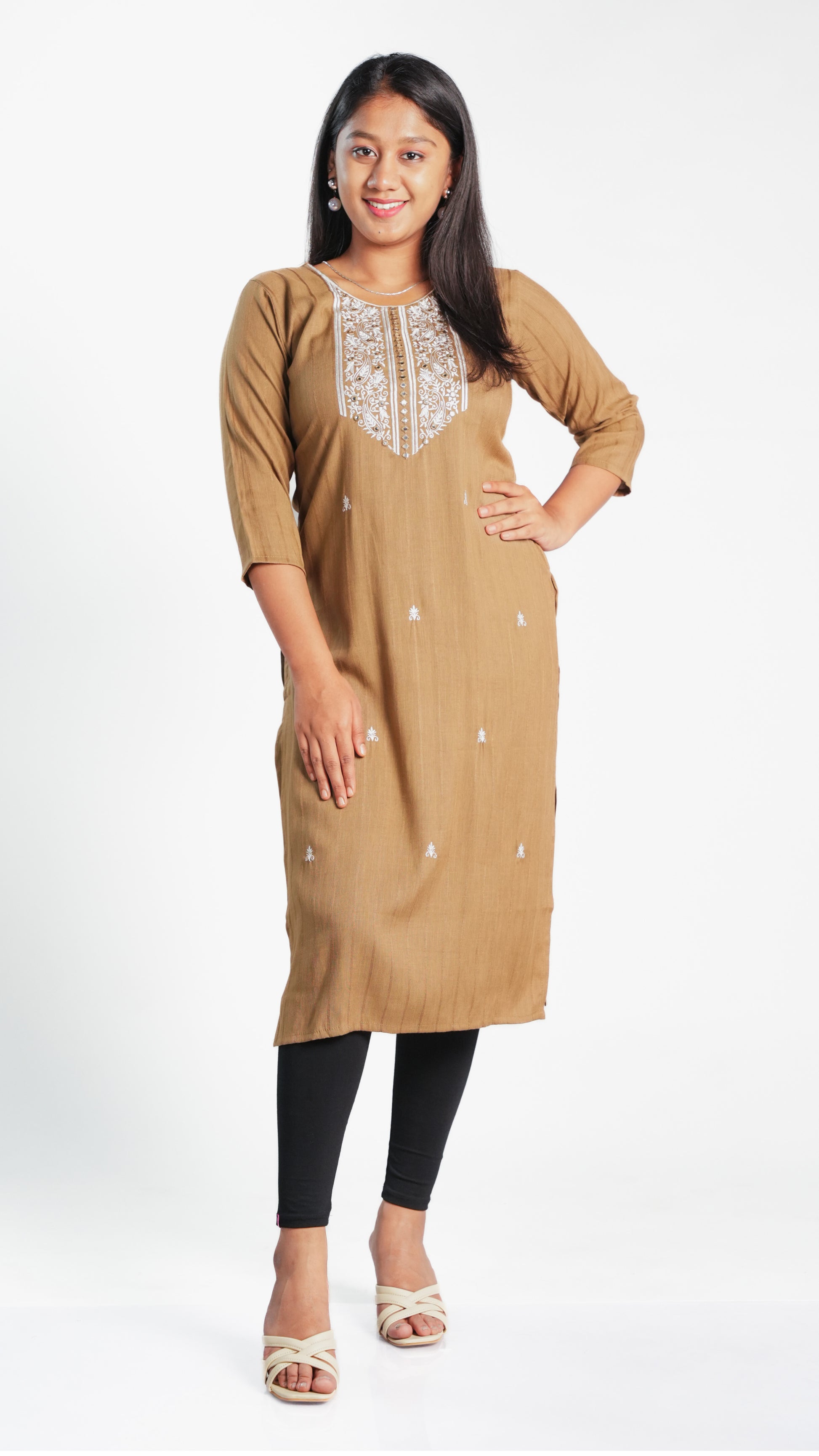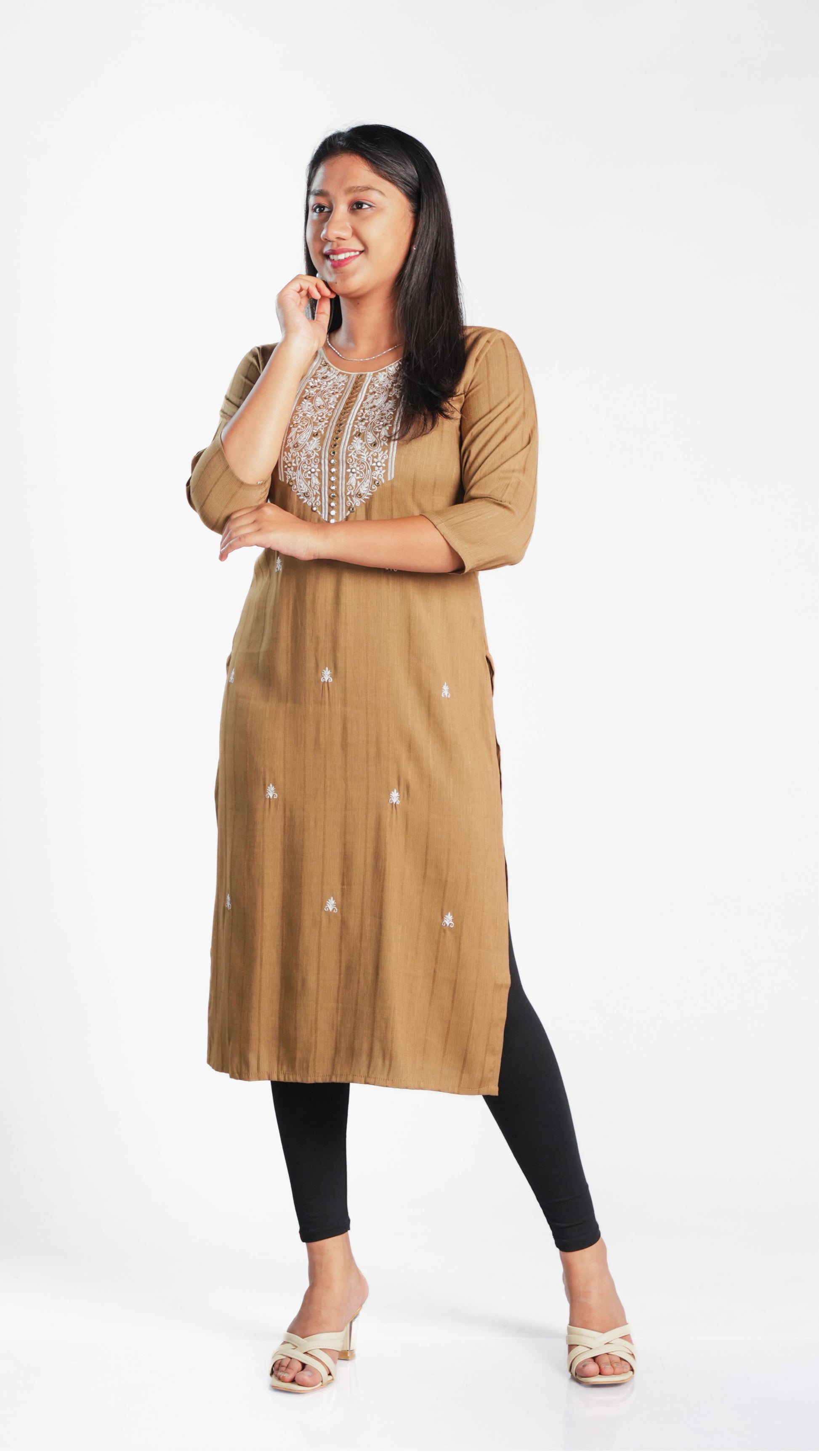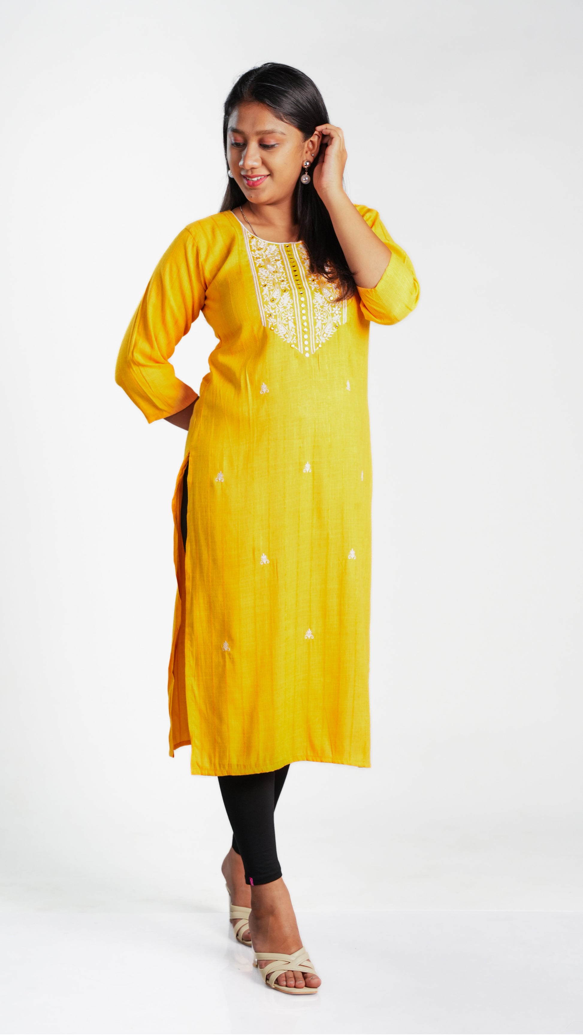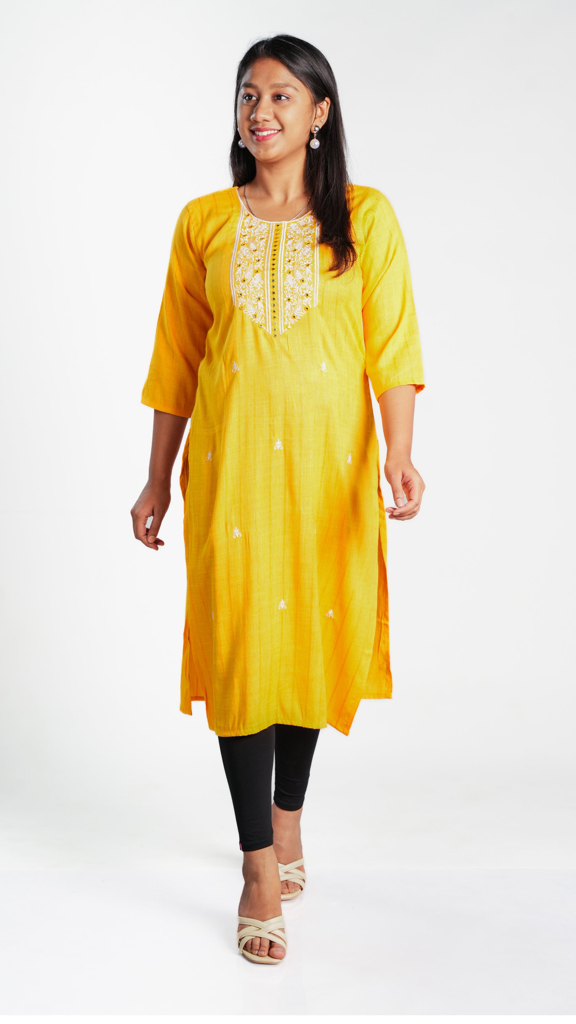 Velora Kurti features intricate embroidery detailing at the neckline, adding an elegant focal point to this versatile piece. Available in four stunning colour options, this kurti offers variety to suit different preferences and occasions. The thoughtful embroidery work elevates the design while maintaining the comfort and ease of traditional wear. Perfect for everyday styling or special gatherings.