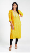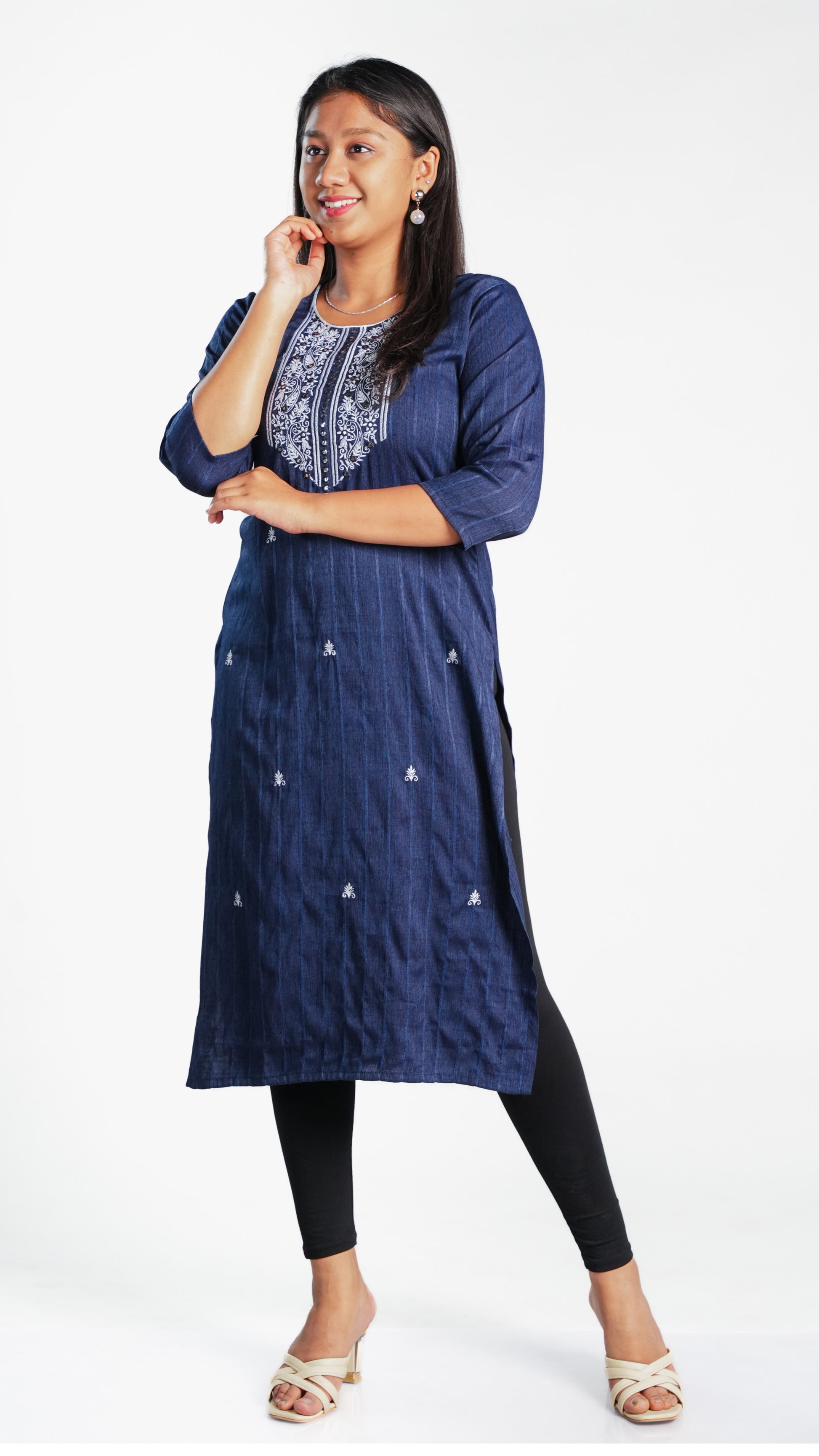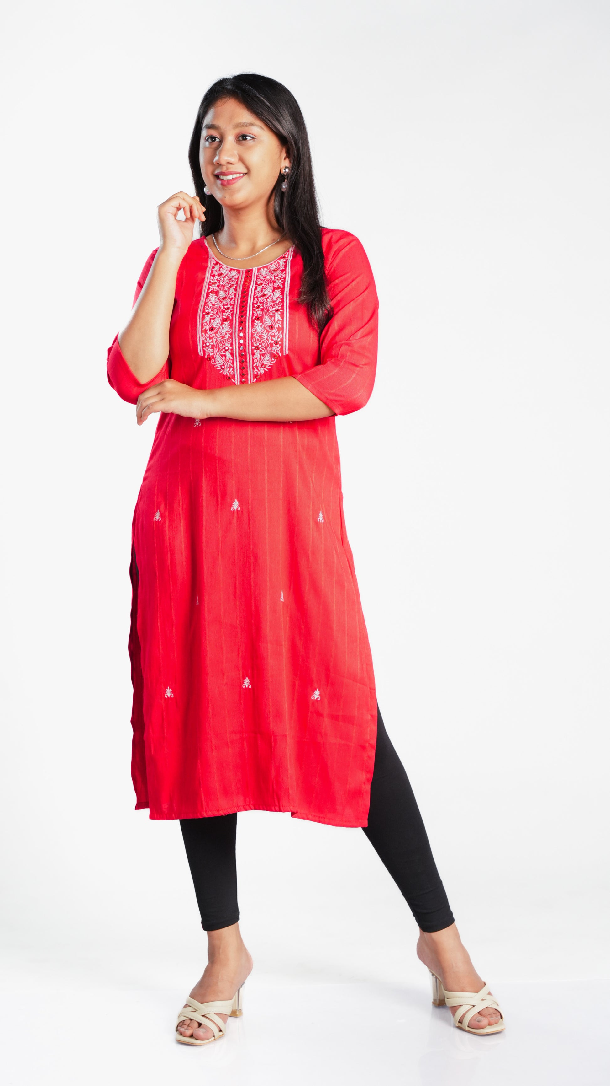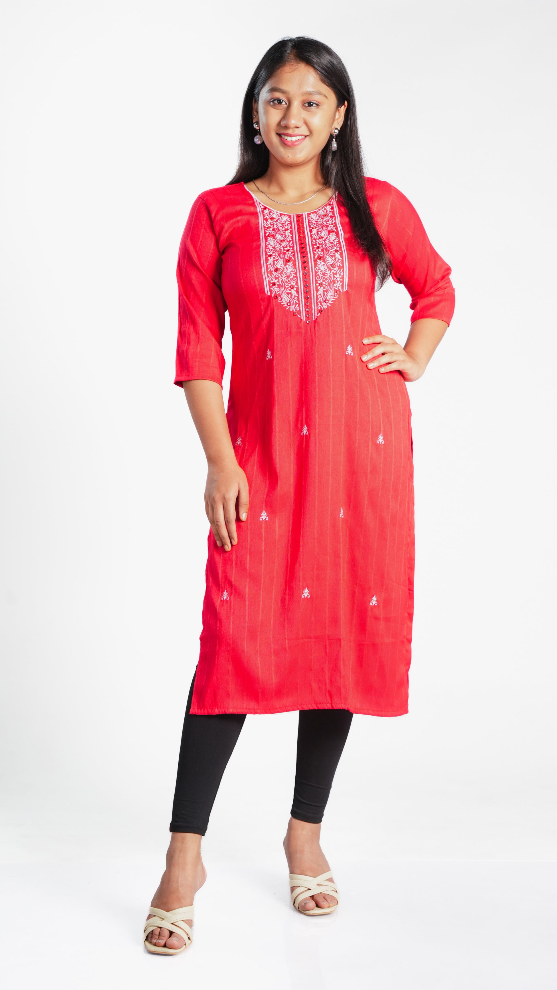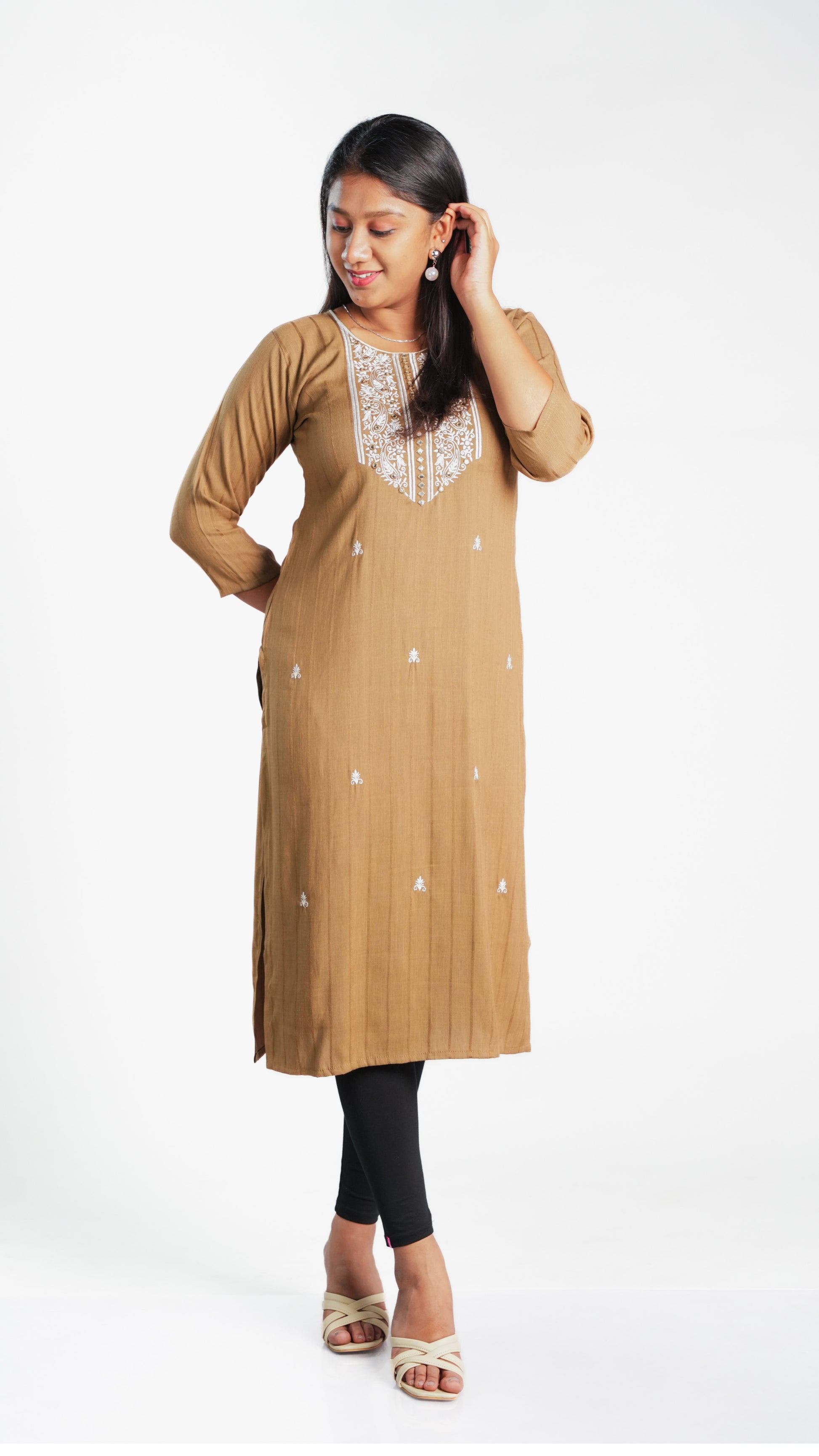 Velora Kurti features intricate embroidery detailing at the neckline, adding an elegant focal point to this versatile piece. Available in four stunning colour options, this kurti offers variety to suit different preferences and occasions. The thoughtful embroidery work elevates the design while maintaining the comfort and ease of traditional wear. Perfect for everyday styling or special gatherings.