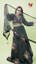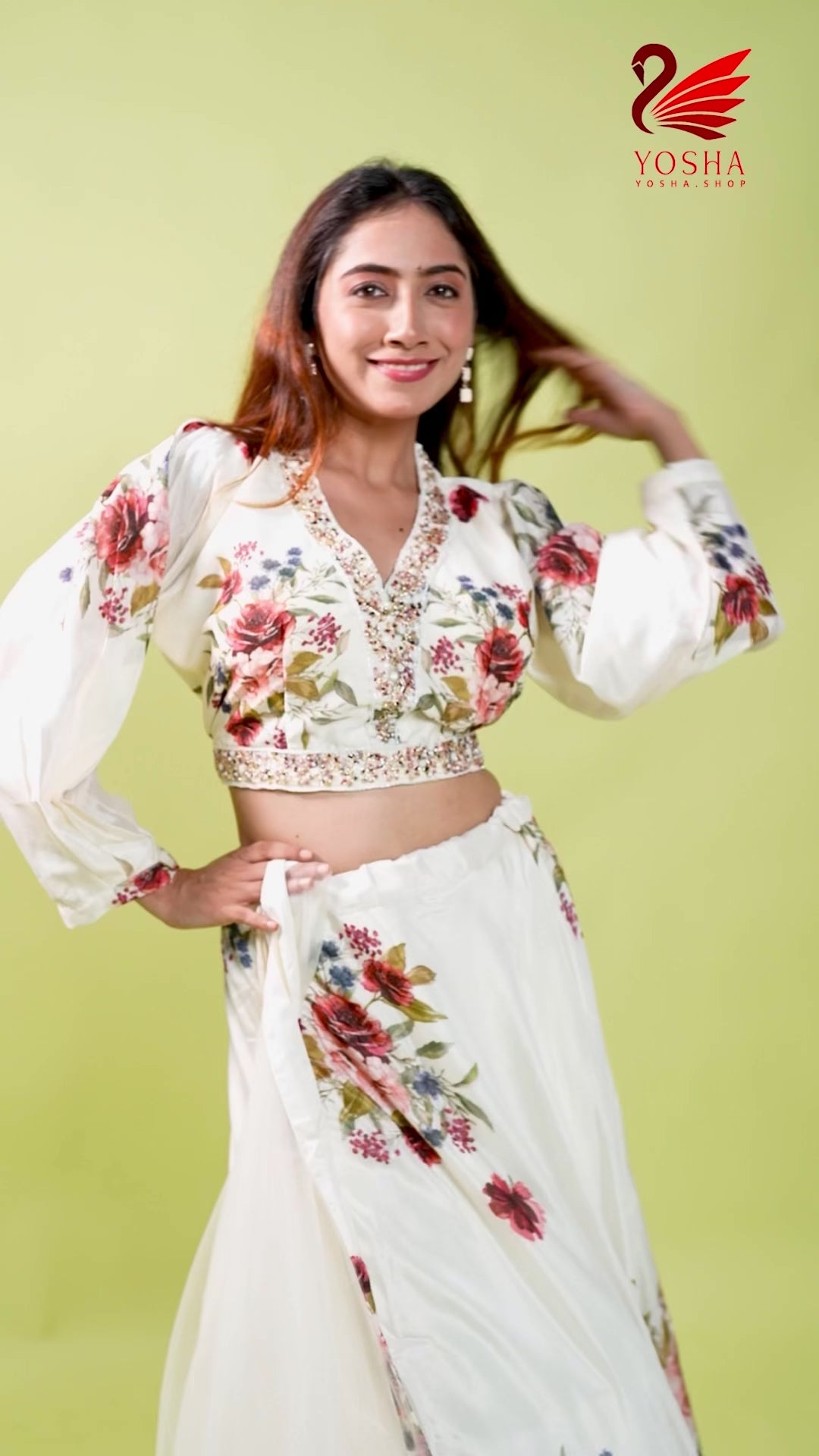 Elevate your style with this Bold Aura Lehenga. The intricate print adds a touch of sophistication, while the crop top accentuates your curves. Perfect for special occasions, this set is a must-have in every fashionista's wardrobe. Expertly crafted with high-quality fabric for a comfortable and stylish look.