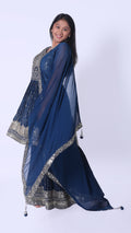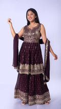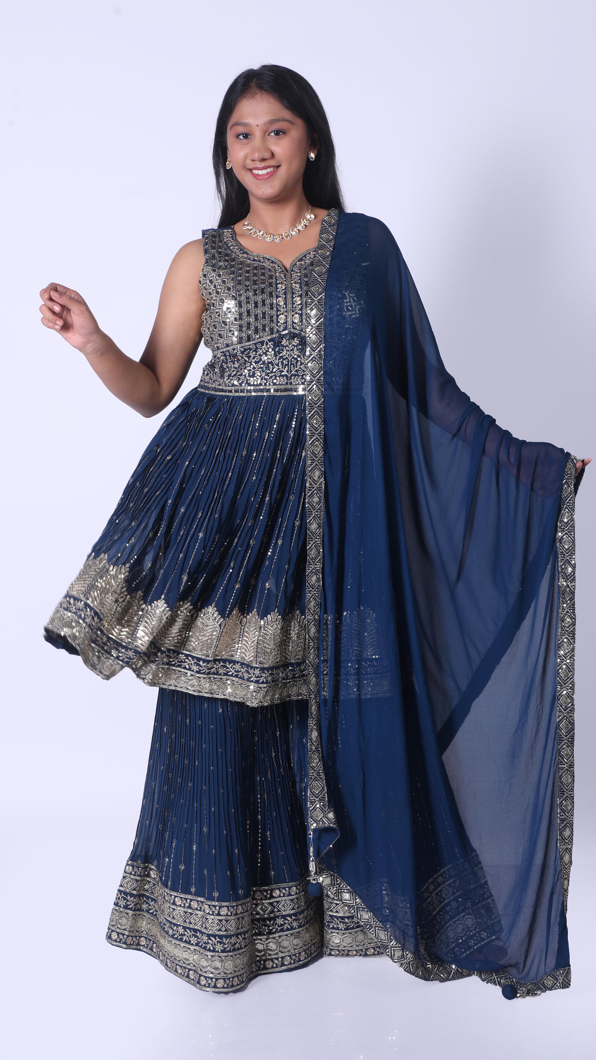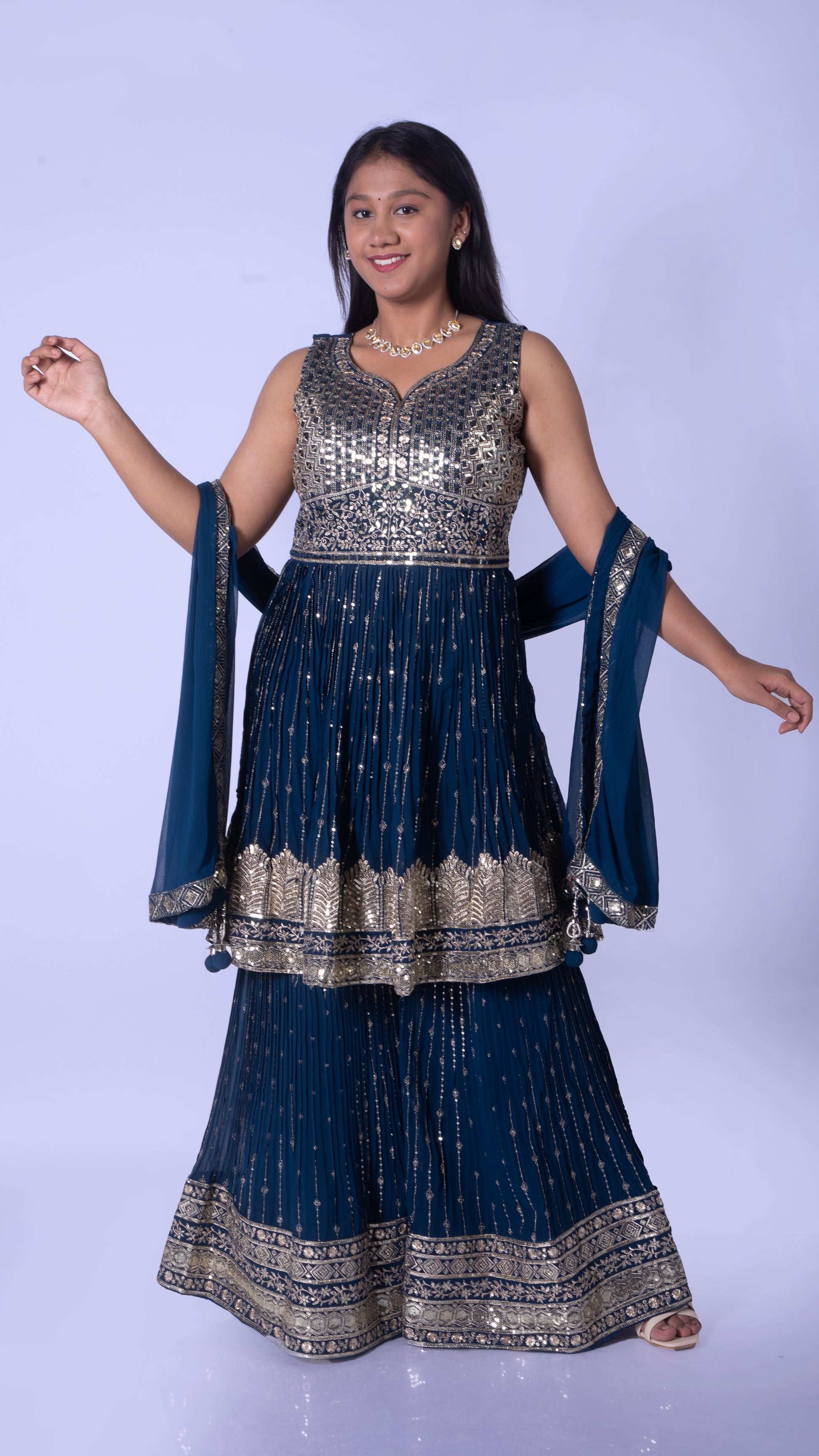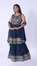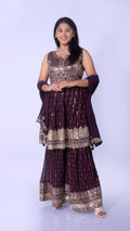 Expertly crafted with heavy Jari work, this Sharara set with a Peplum top is designed to elevate your style. The intricate details and high-quality fabric provide a luxurious feel, while the flowy silhouette and flattering fit make it perfect for any occasion. Embrace elegance and sophistication with this stunning ensemble.