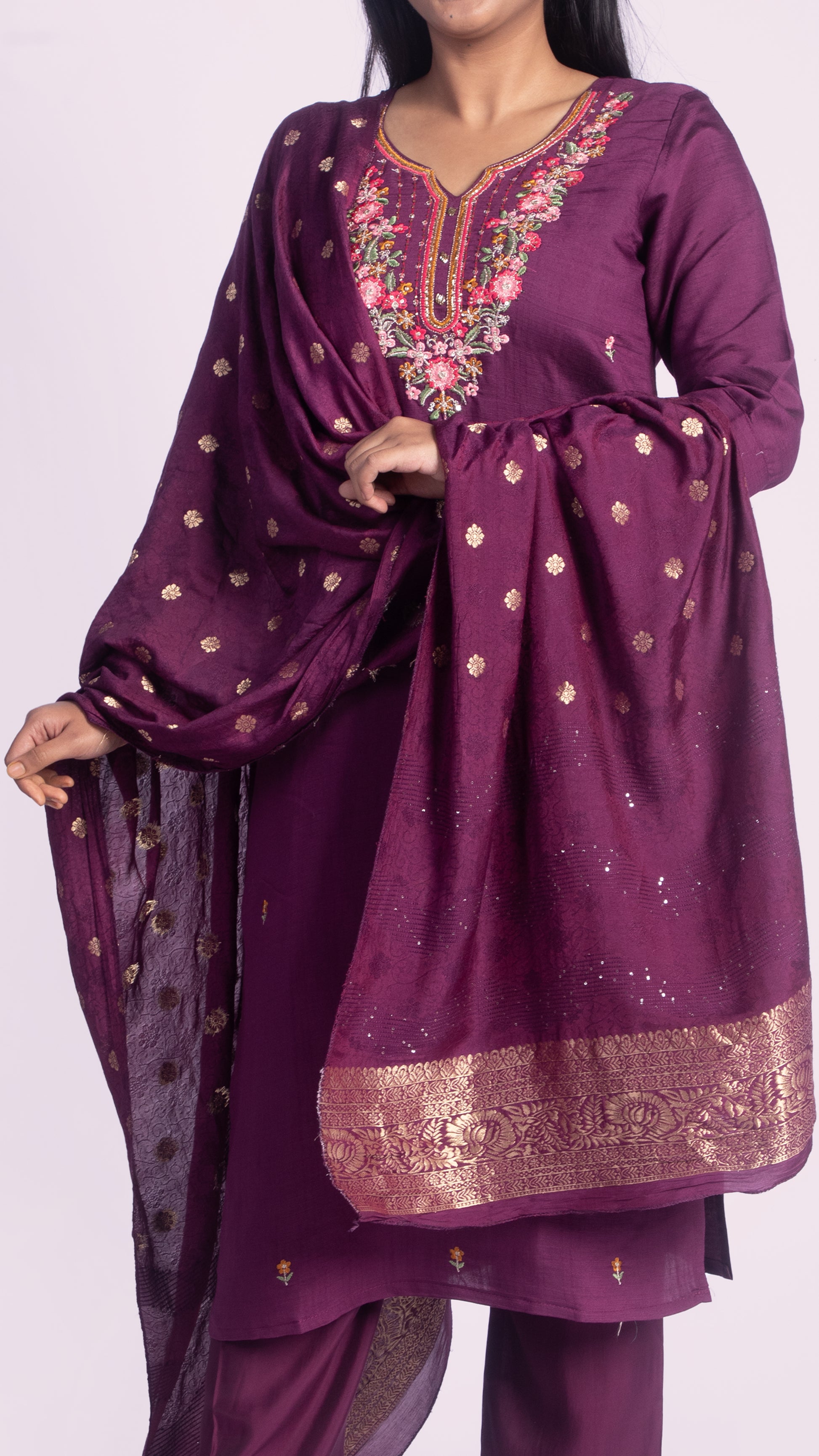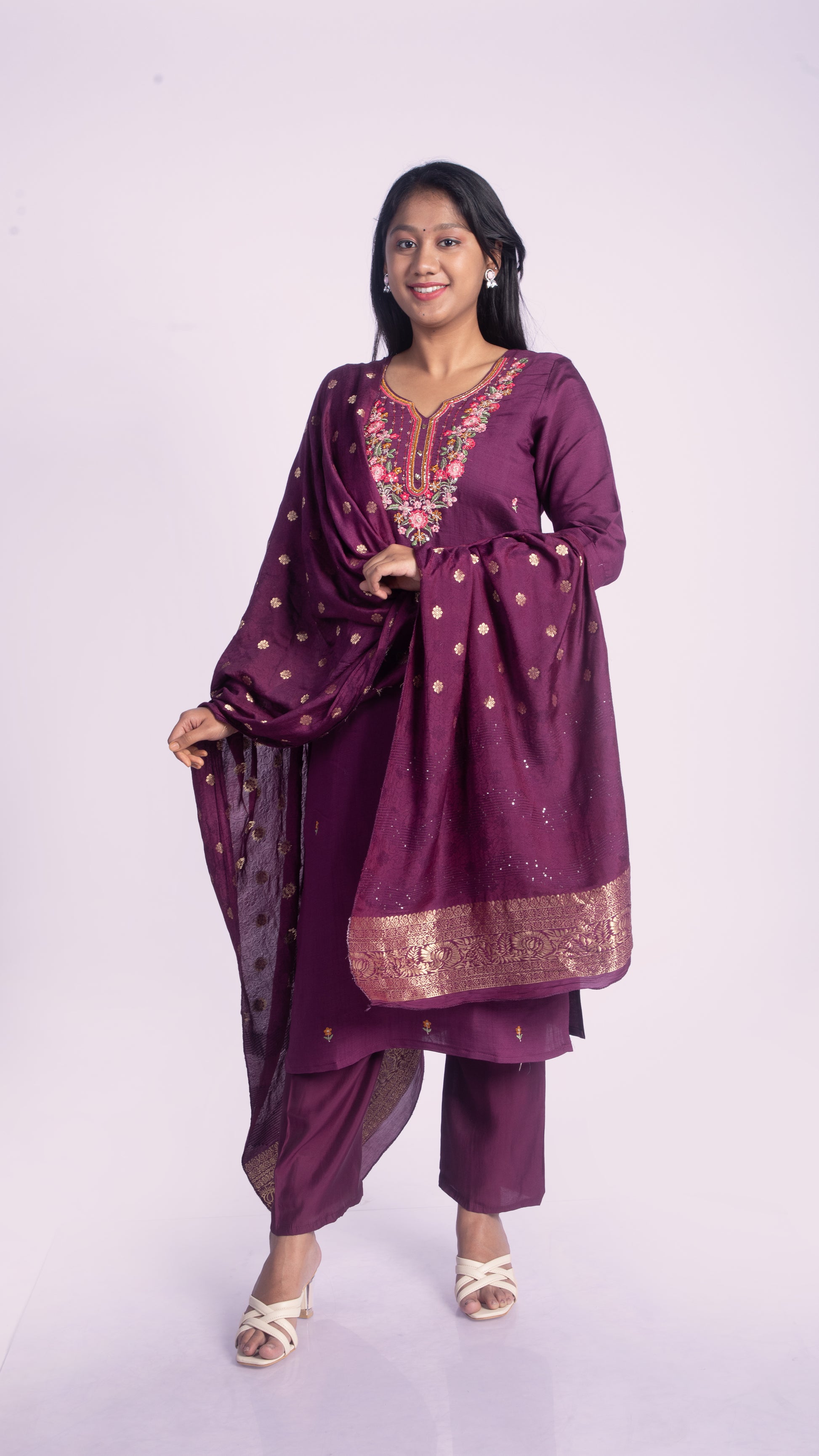 Enhance your ethnic wardrobe with our elegant Zari Work Suit. Expertly crafted with intricate Zari work, this set includes a beautiful Dupatta for an effortless traditional look. Achieve a flawless fit with our range of sizes. Elevate your style and make a statement with this stunning combination.