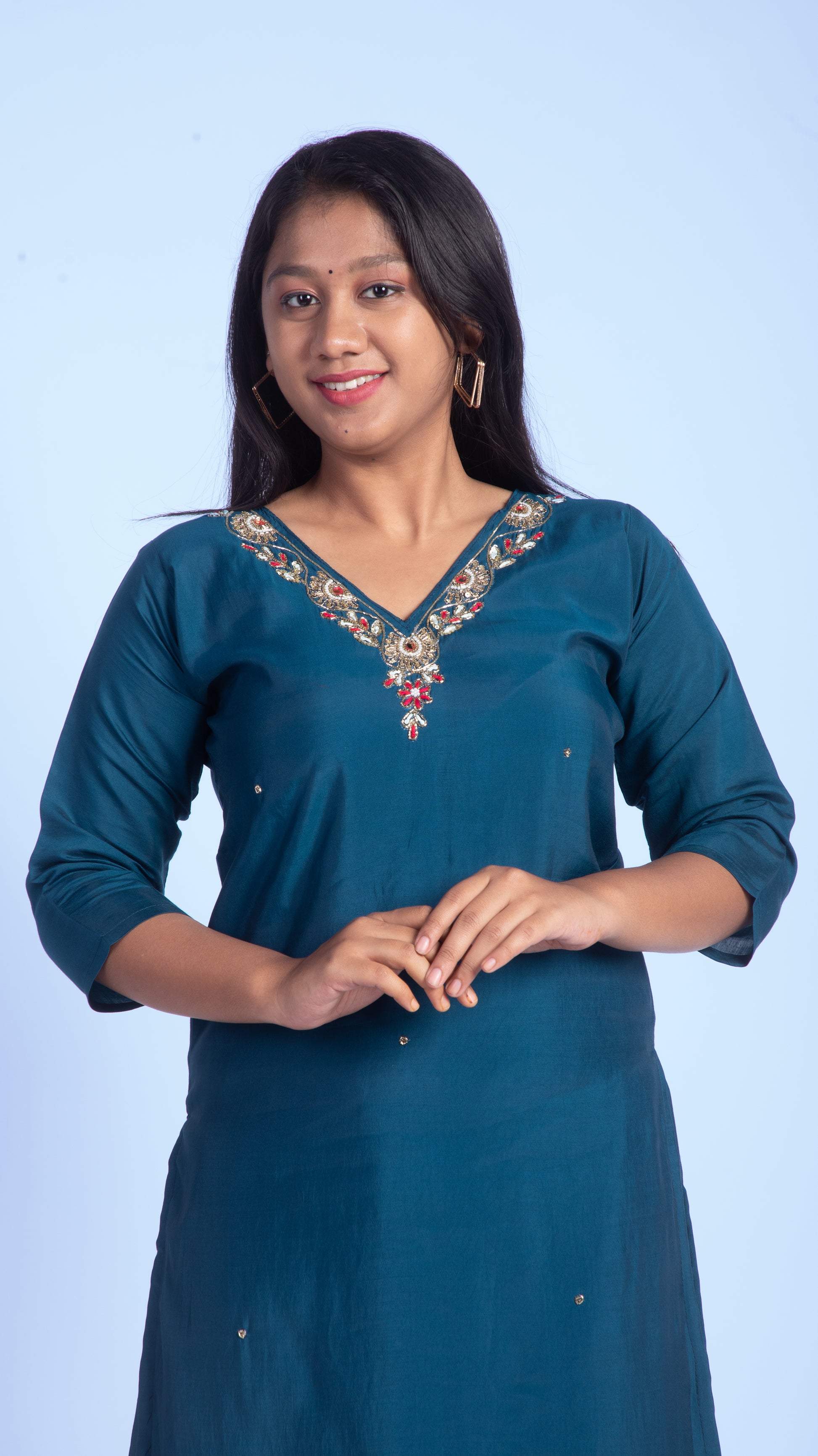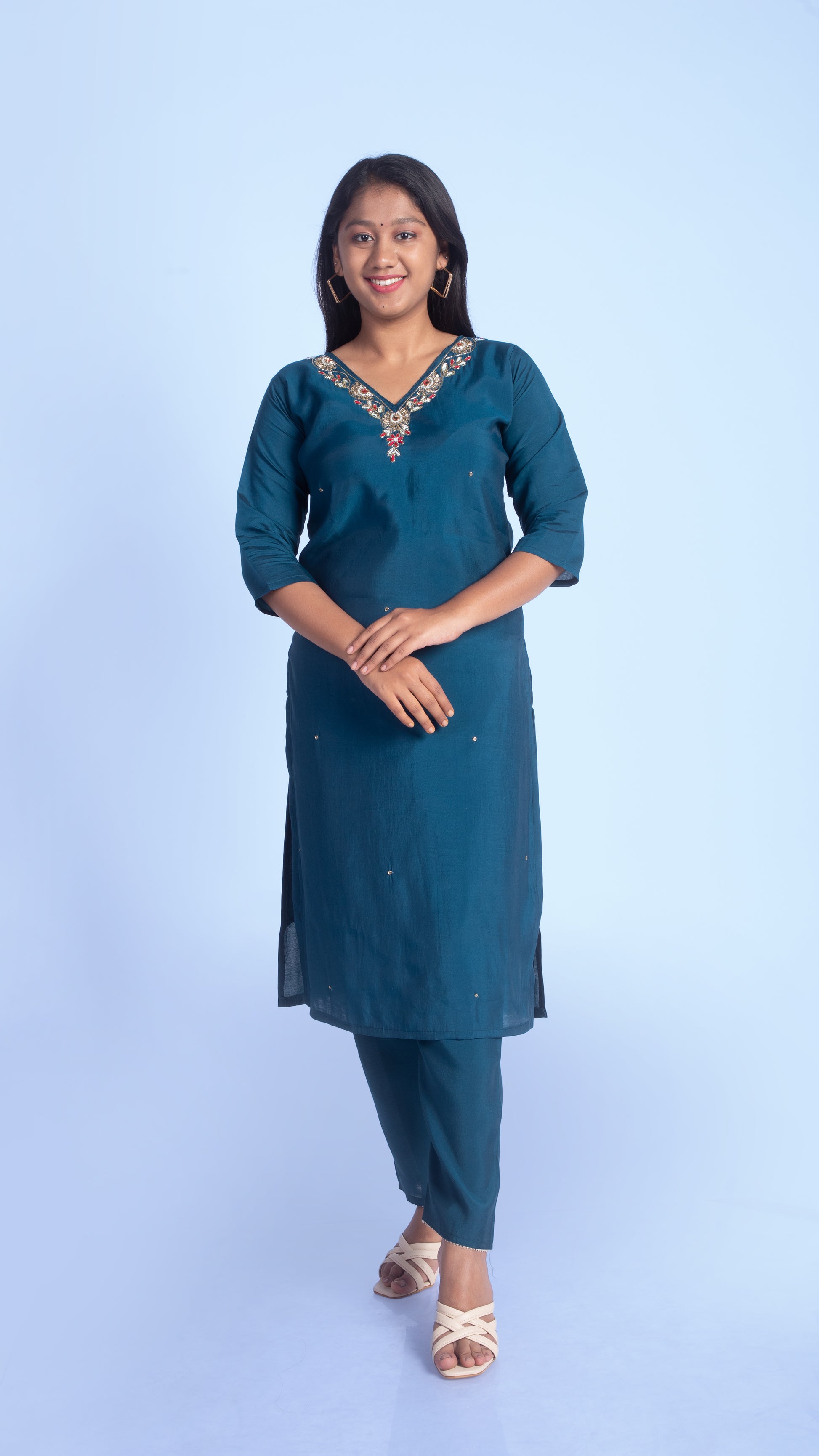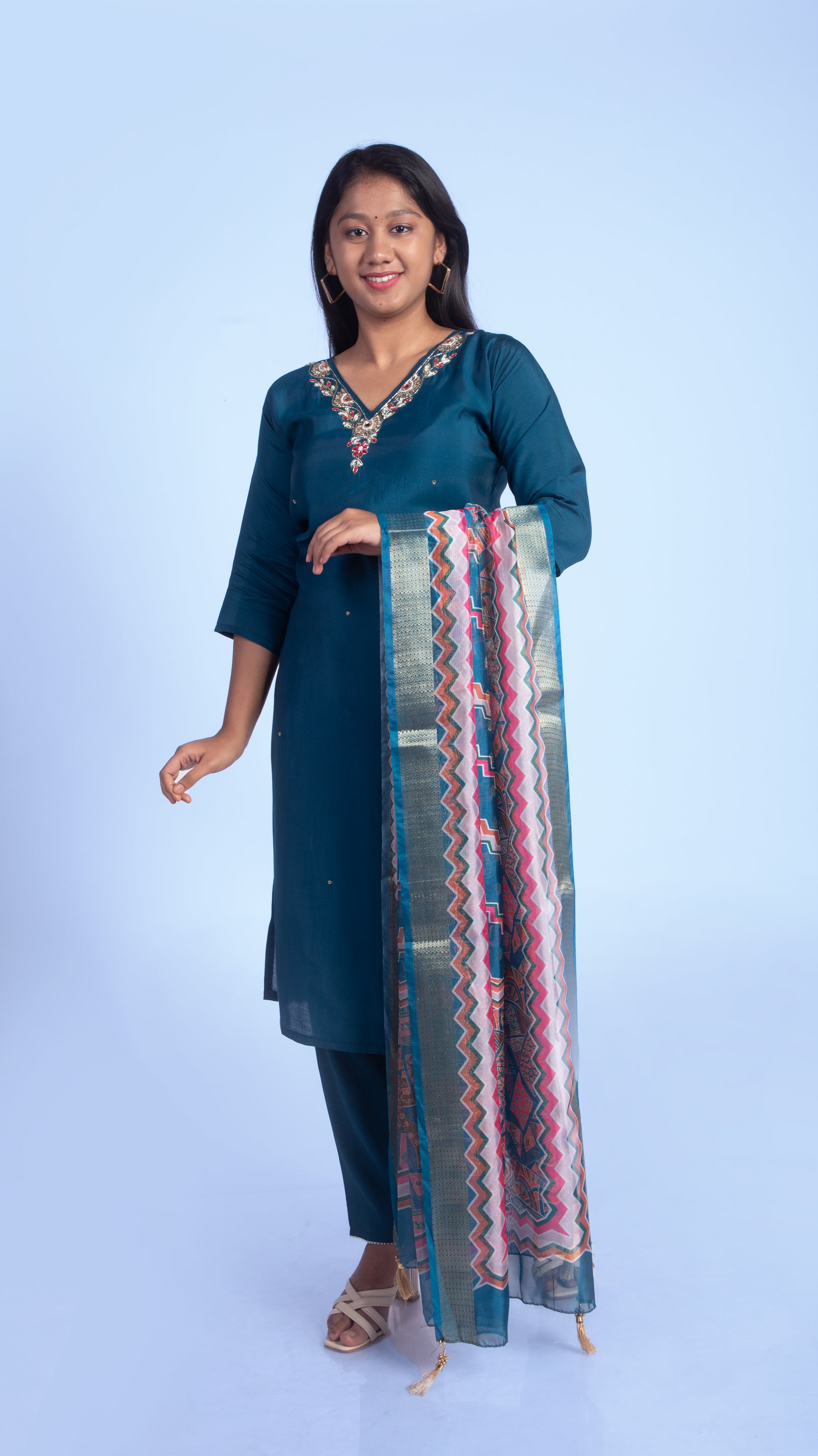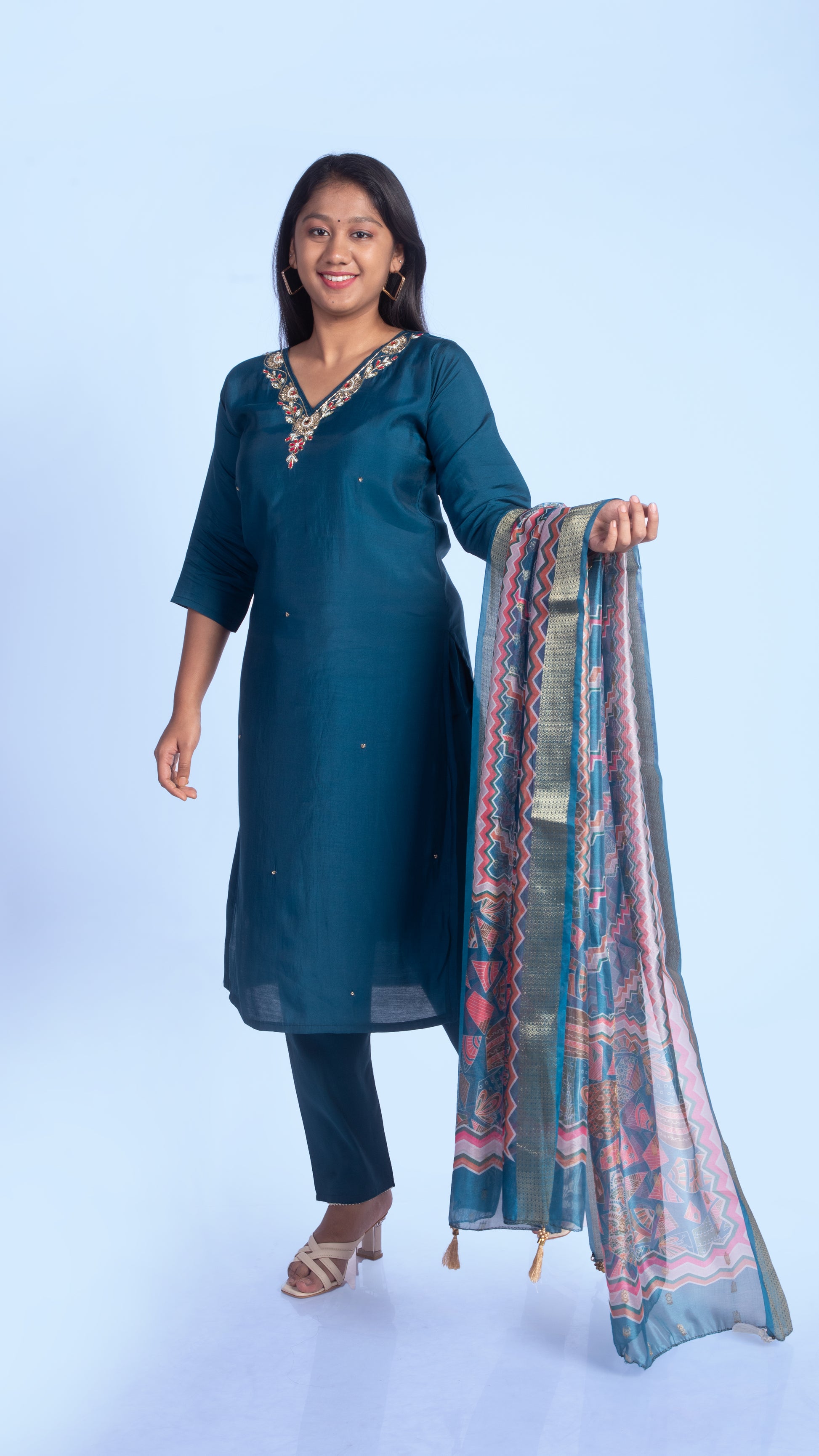 Expertly crafted from a luxurious silk blend, this suit set is the epitome of elegance. The digital print dupatta adds a unique touch to the traditional design. With its soft and comfortable fabric, this suit set effortlessly combines style and comfort for a sophisticated look.