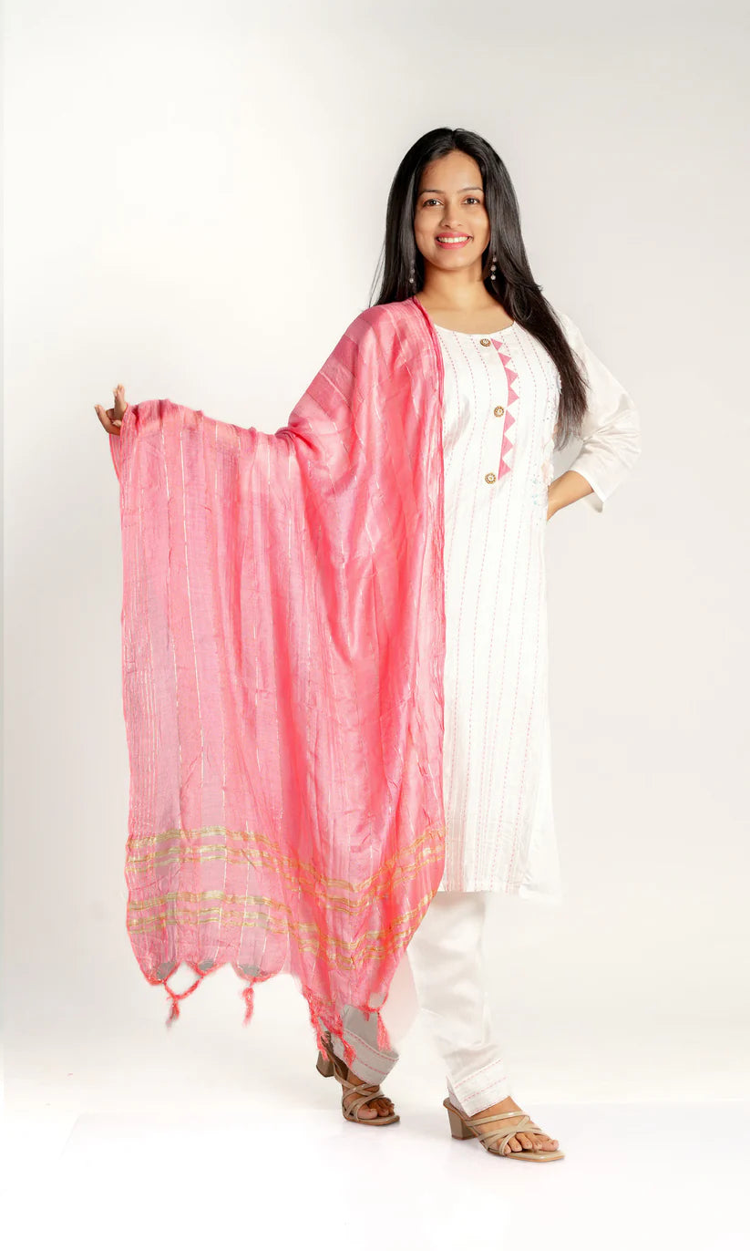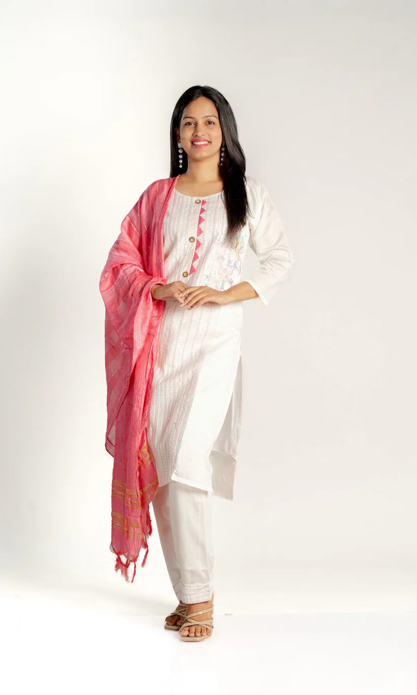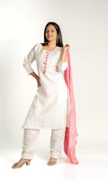 Expertly crafted from high-quality cotton, this white suit set is a must-have for any wardrobe. The intricate thread work on the kurta adds a touch of elegance, while the breathable fabric ensures comfort and style. Perfect for formal occasions or everyday wear, this versatile set is a must-have for any fashion-forward individual.