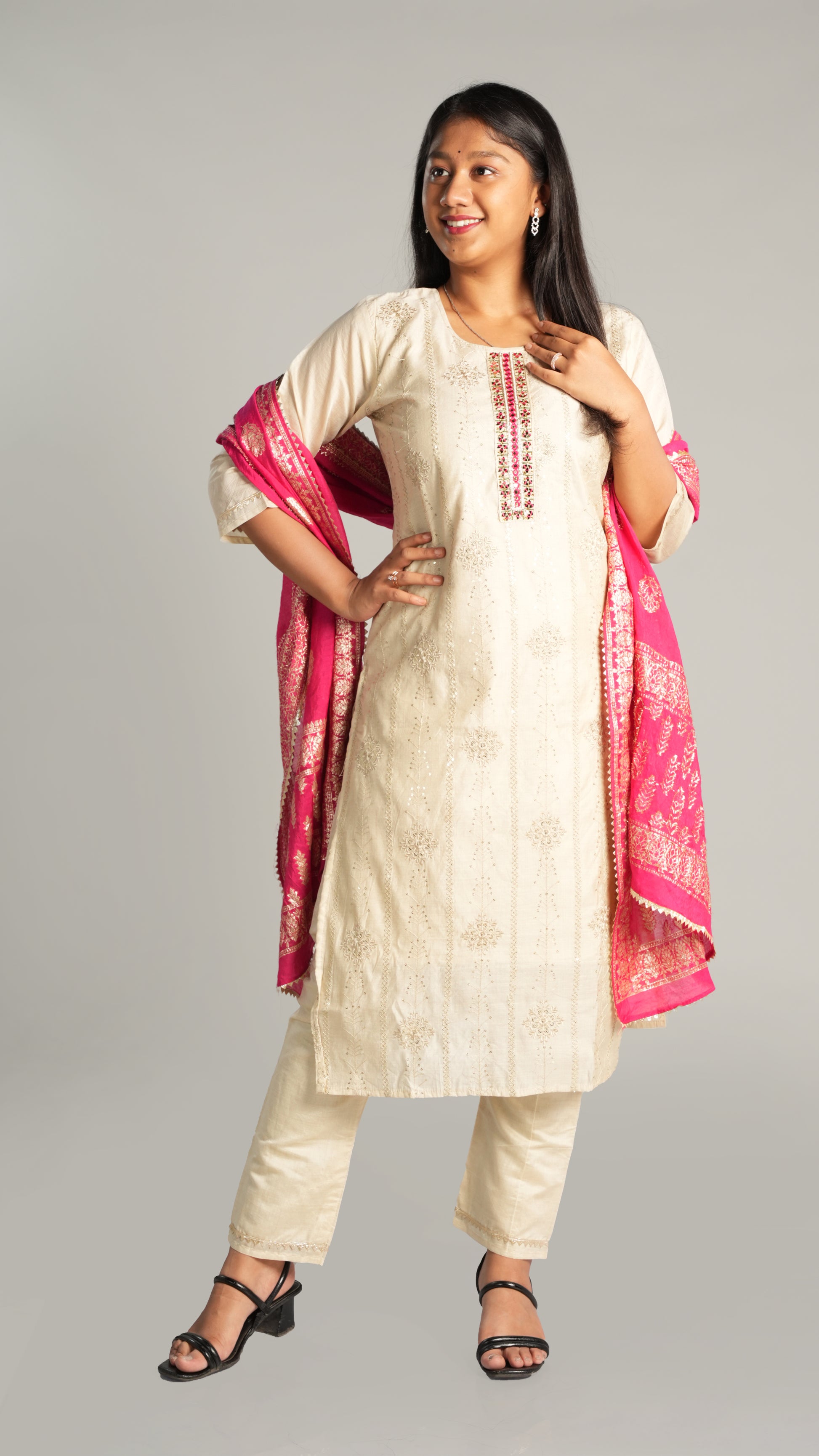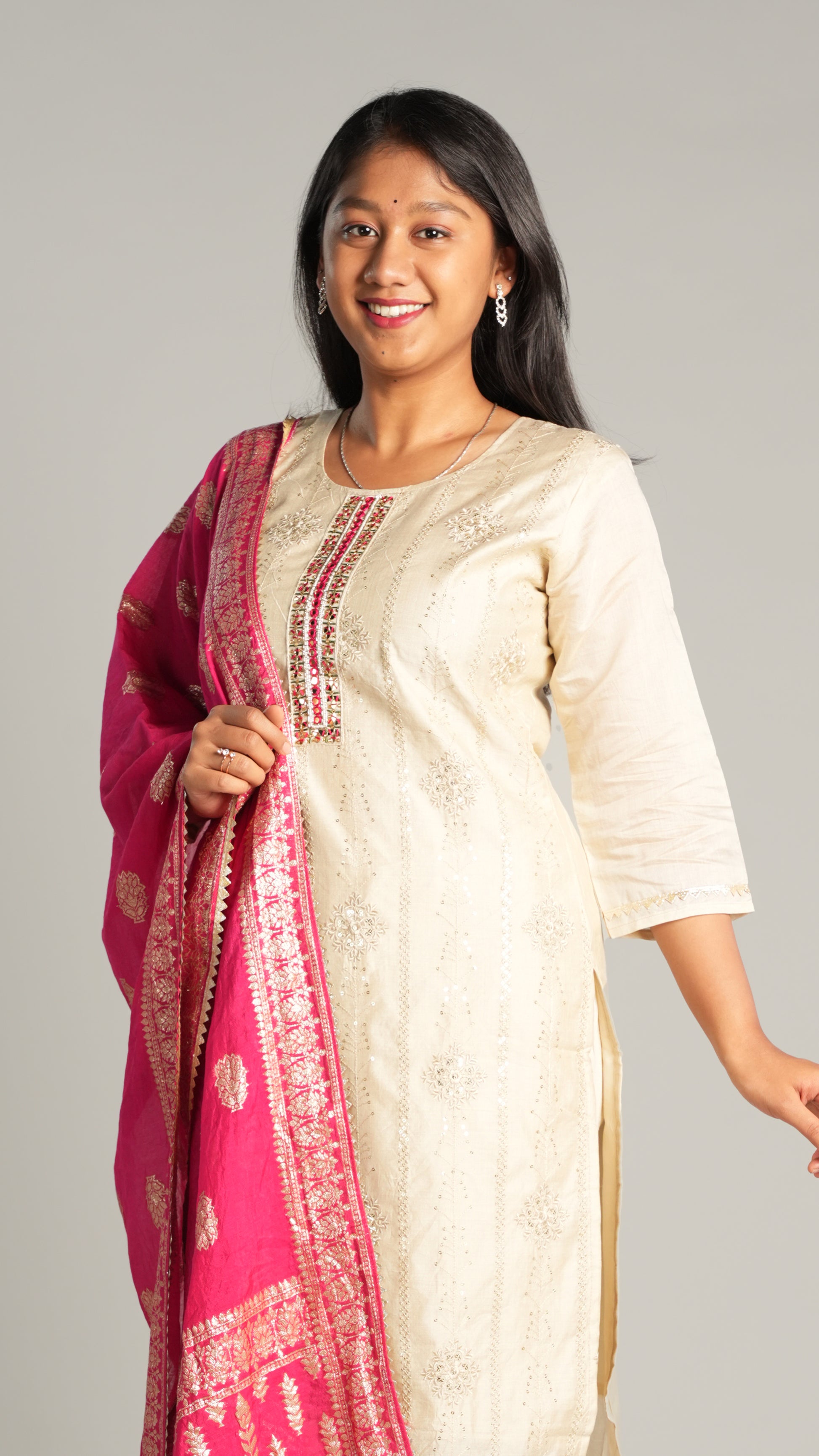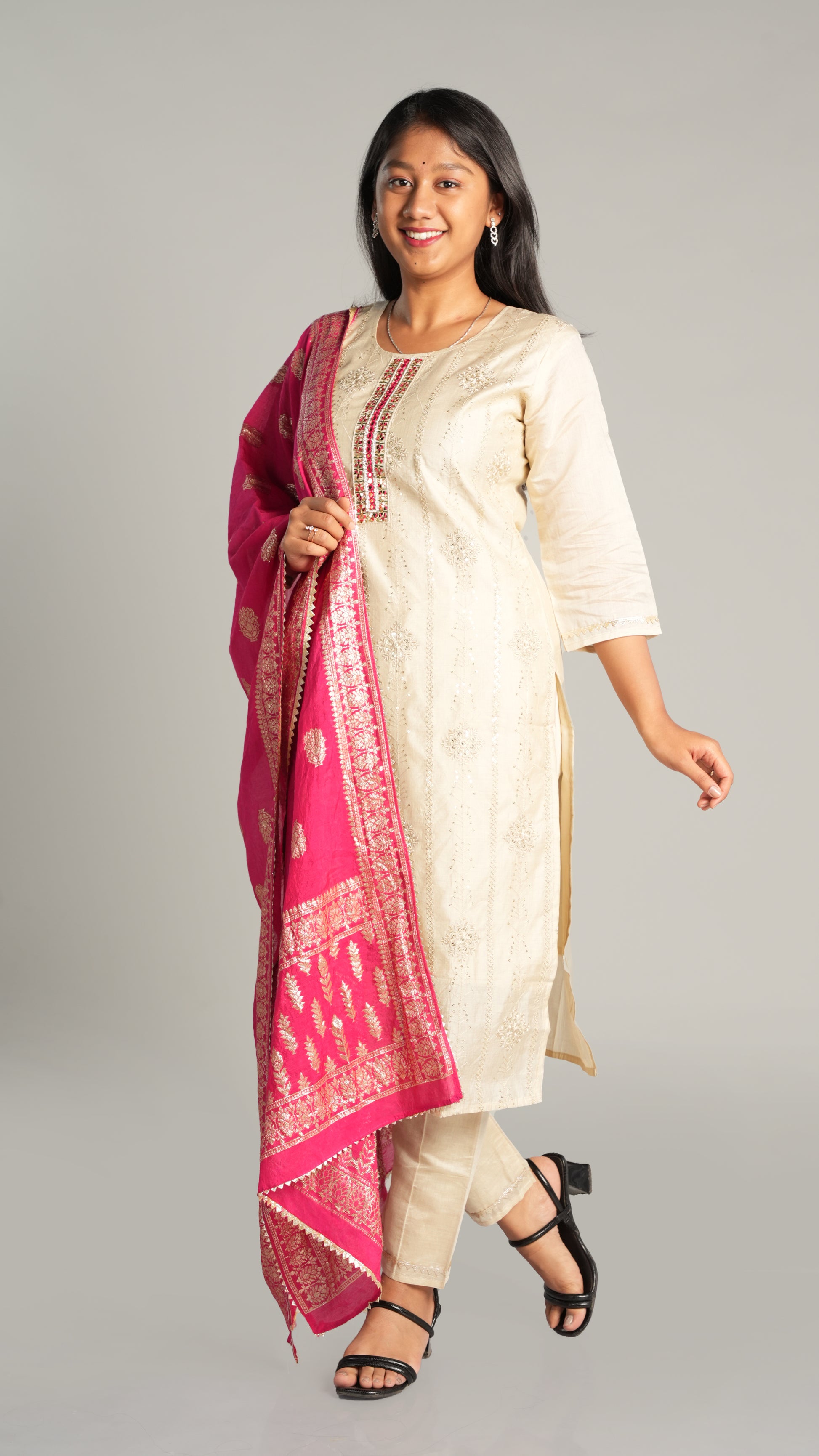Introducing our stunning Sequined Work Suit Set with Banarasi Dupatta. Made with high-quality materials, this set features intricate sequined work that adds a touch of glamour to your look. The included Banarasi Dupatta completes the ensemble, providing a traditional yet fashionable touch. Elevate your style with this must-have set.