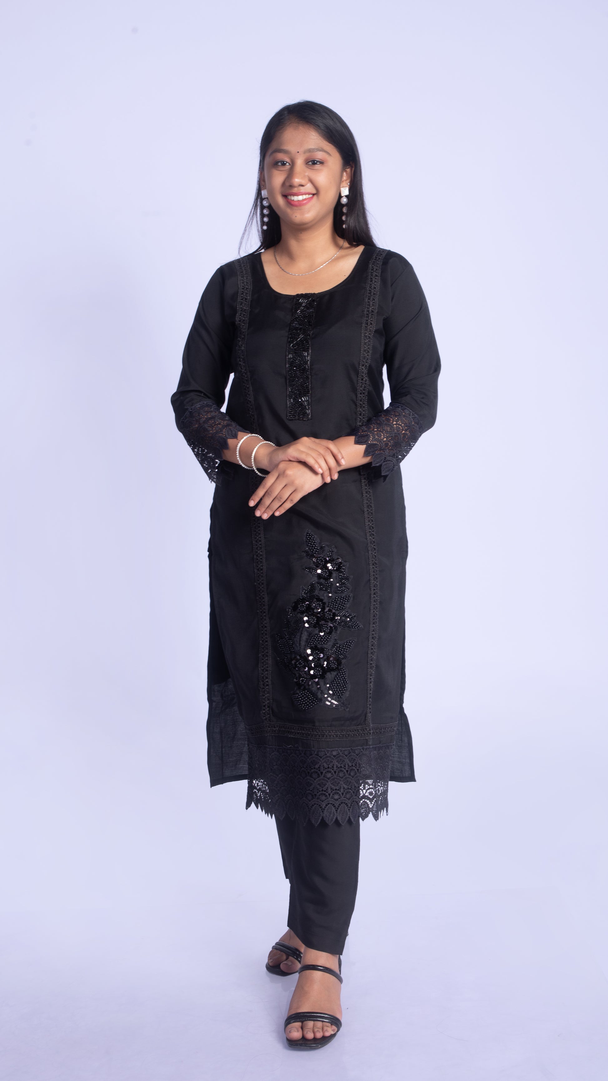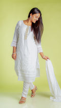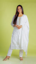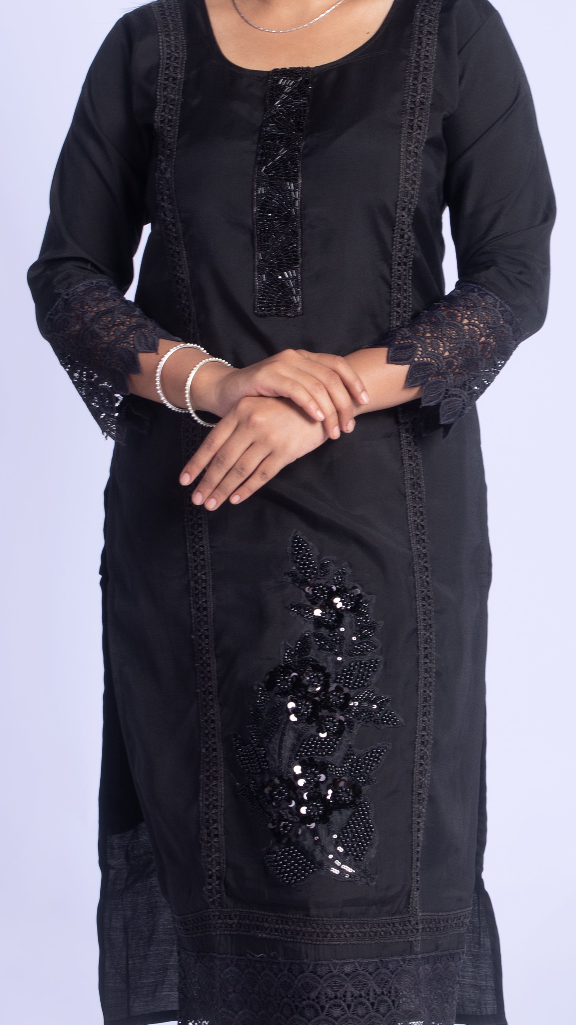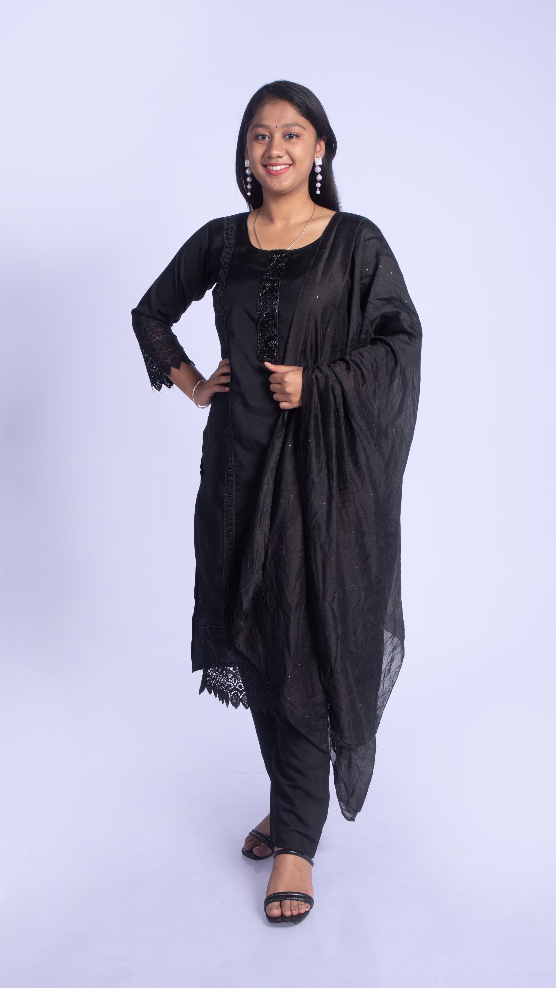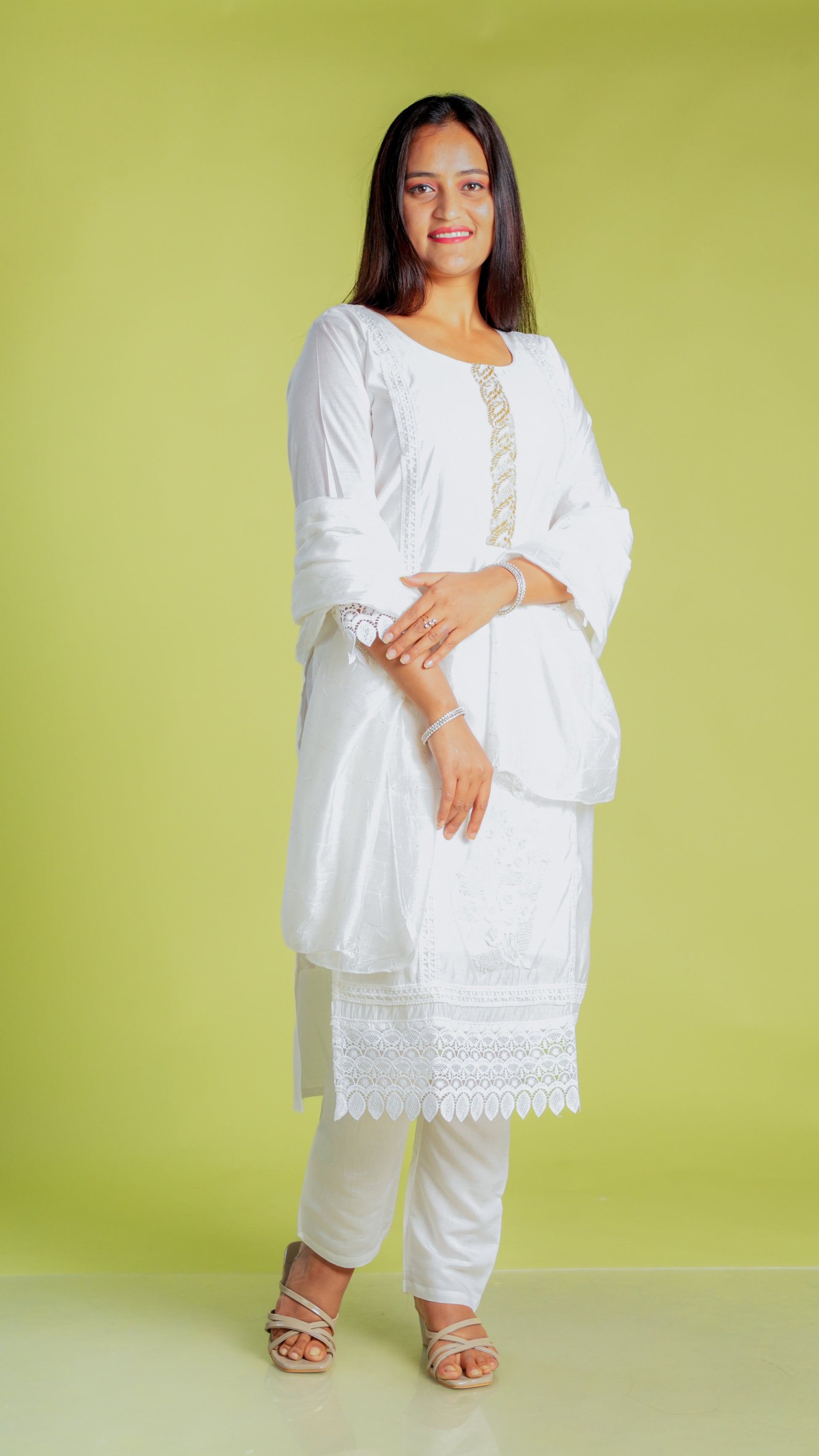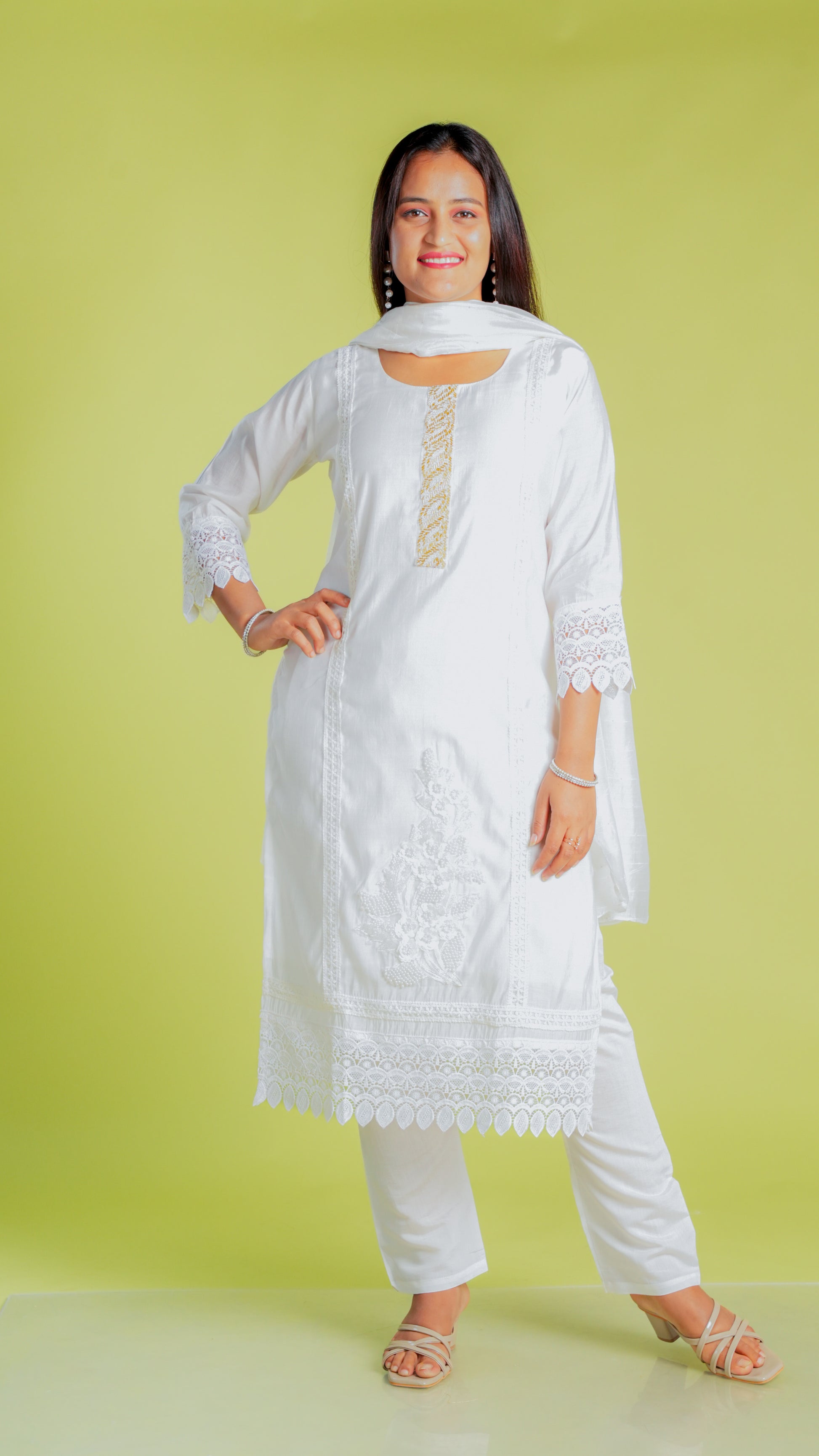 The Taraangi Suit Set features delicate lace work on both the kurti and pant, blending traditional aesthetics with modern style. This ensemble is perfect for occasions that call for a refined yet comfortable look, making it an ideal choice for both traditional events and casual wear. Its thoughtful design ensures you stand out with subtle elegance.