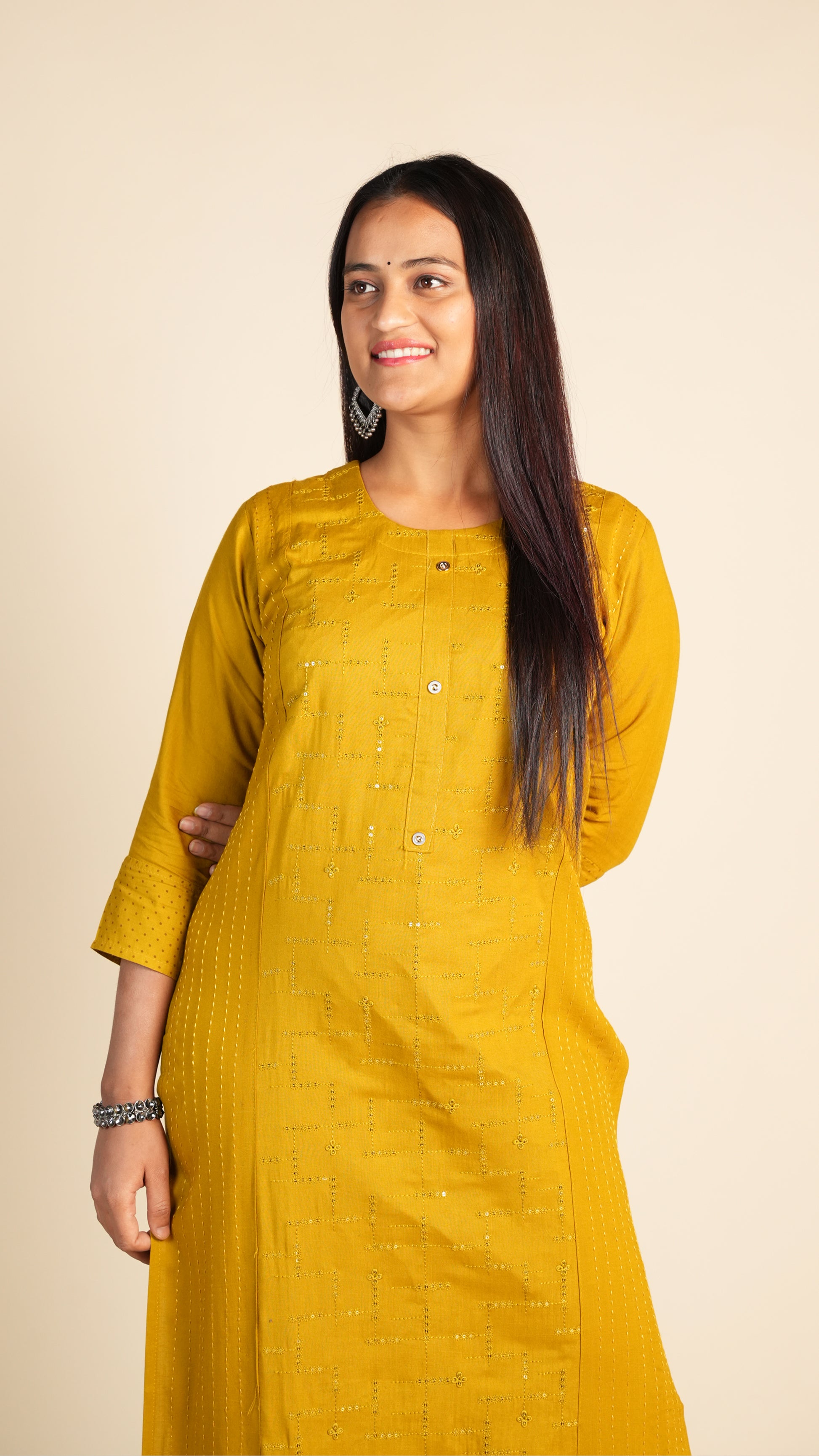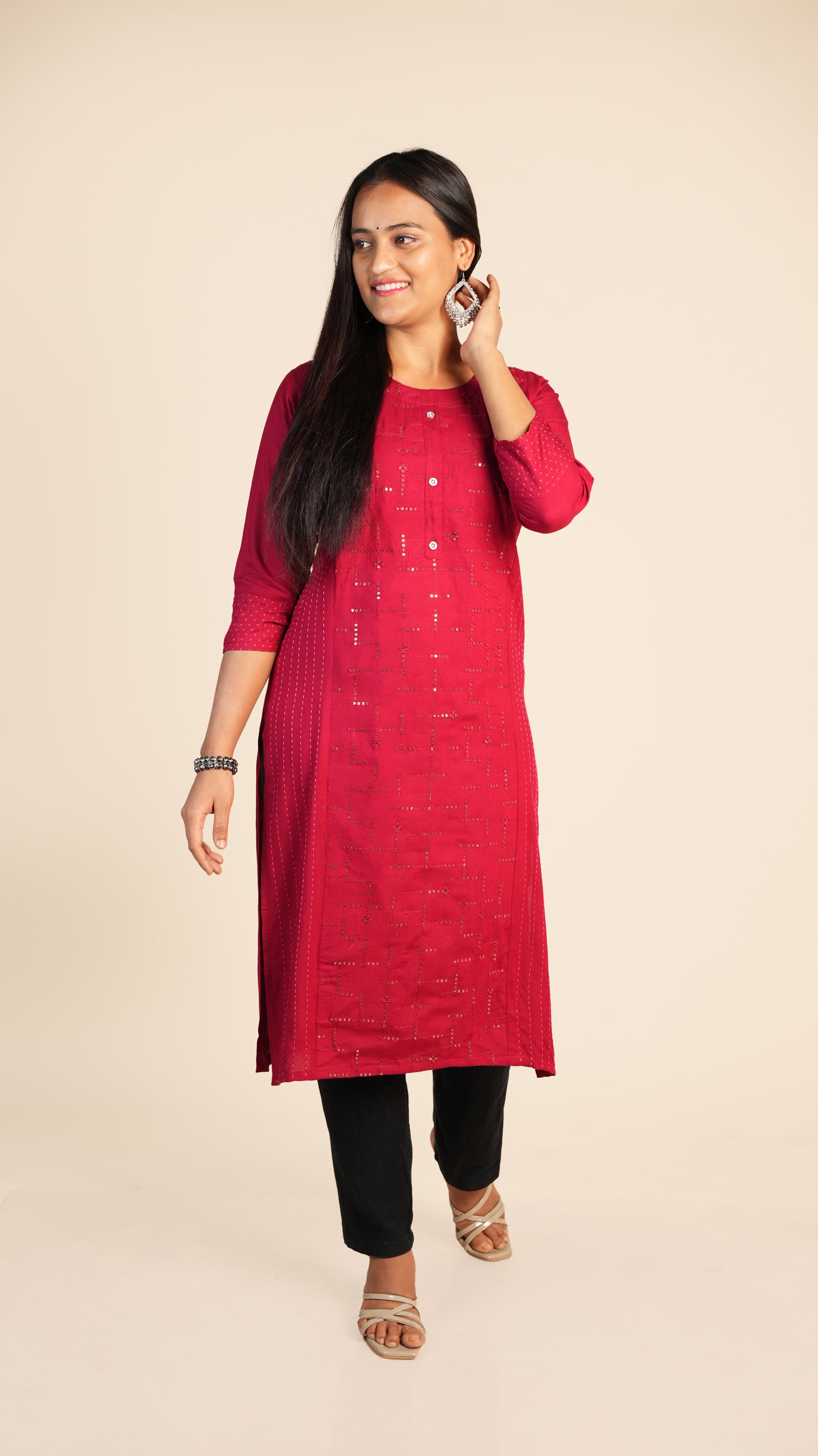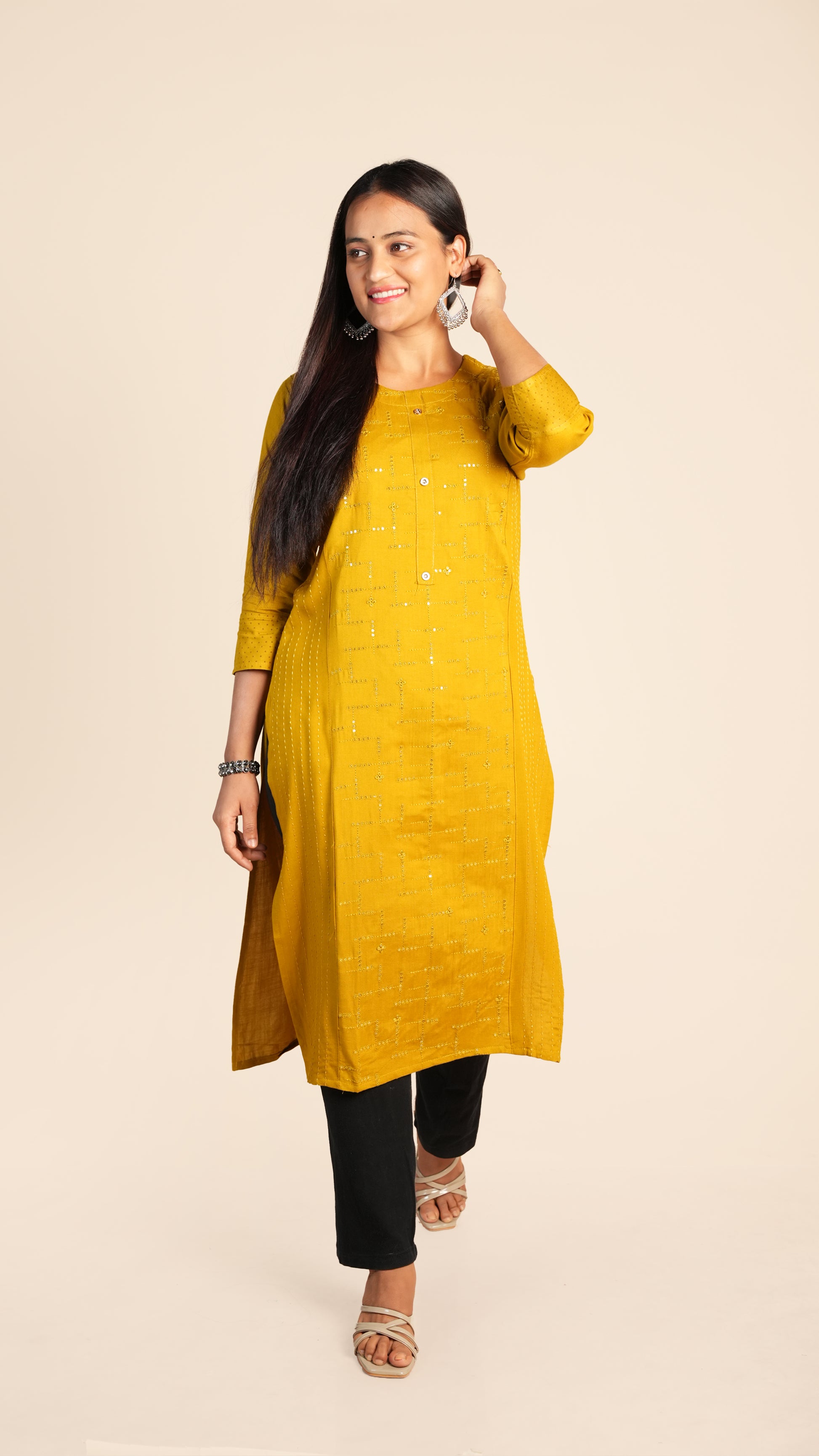 This Rangana Kurti features a full sequin work, adding an elegant touch to the traditional design. The delicate sequins are expertly crafted to enhance the overall look, making it perfect for any occasion. Elevate your style with this timeless piece.