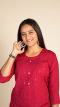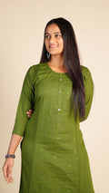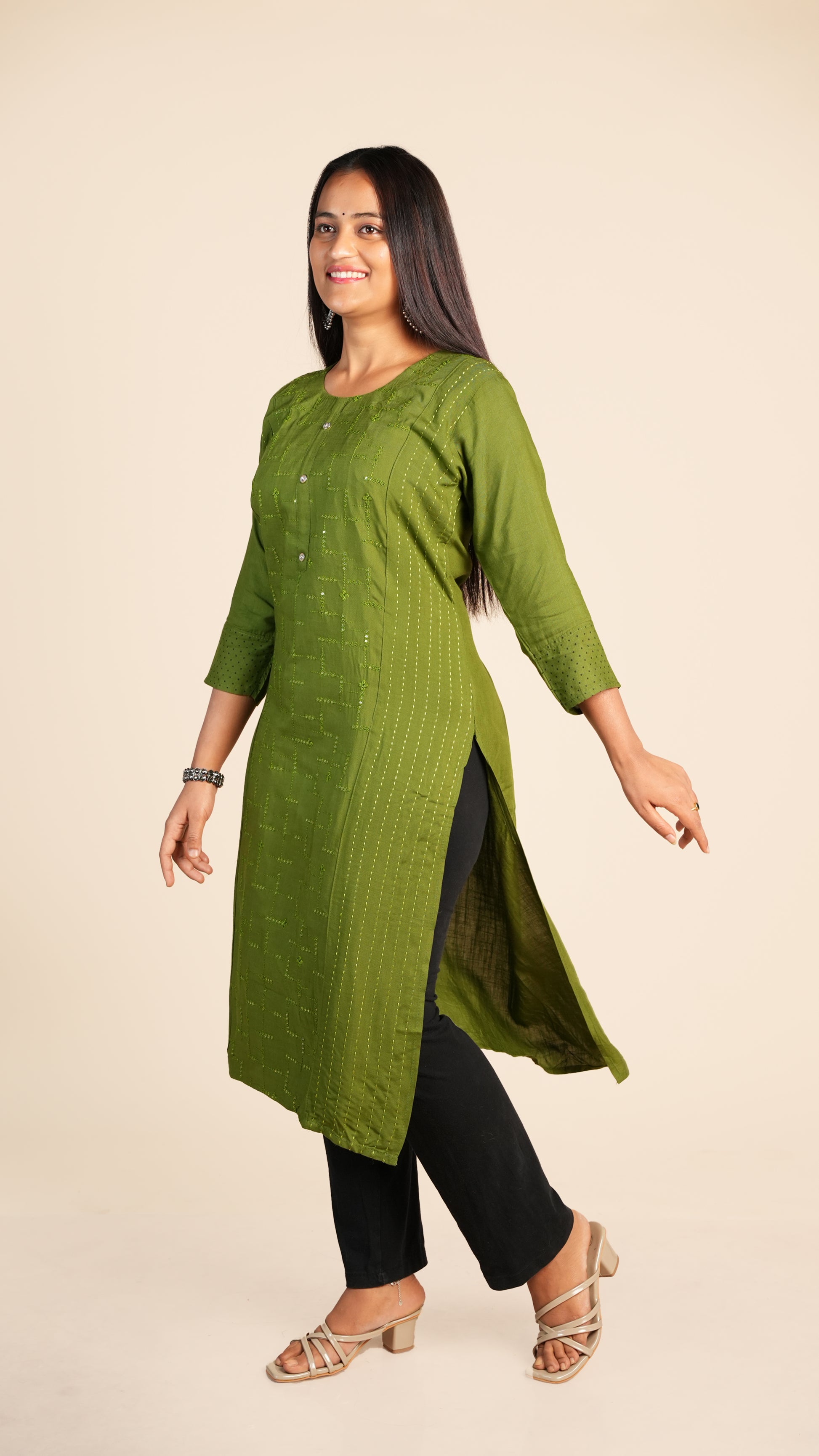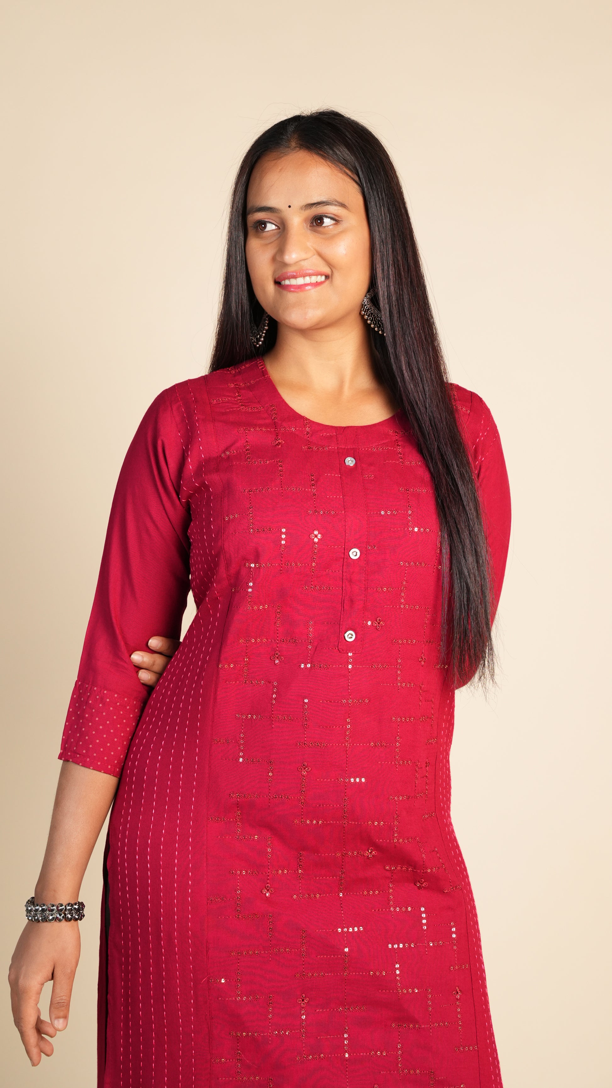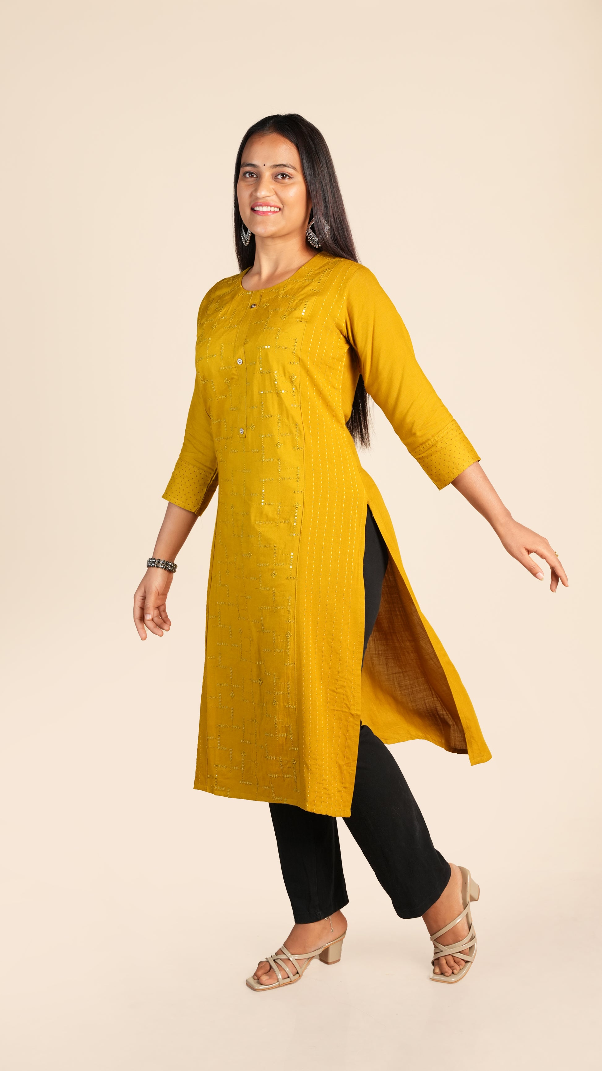 This Rangana Kurti features a full sequin work, adding an elegant touch to the traditional design. The delicate sequins are expertly crafted to enhance the overall look, making it perfect for any occasion. Elevate your style with this timeless piece.